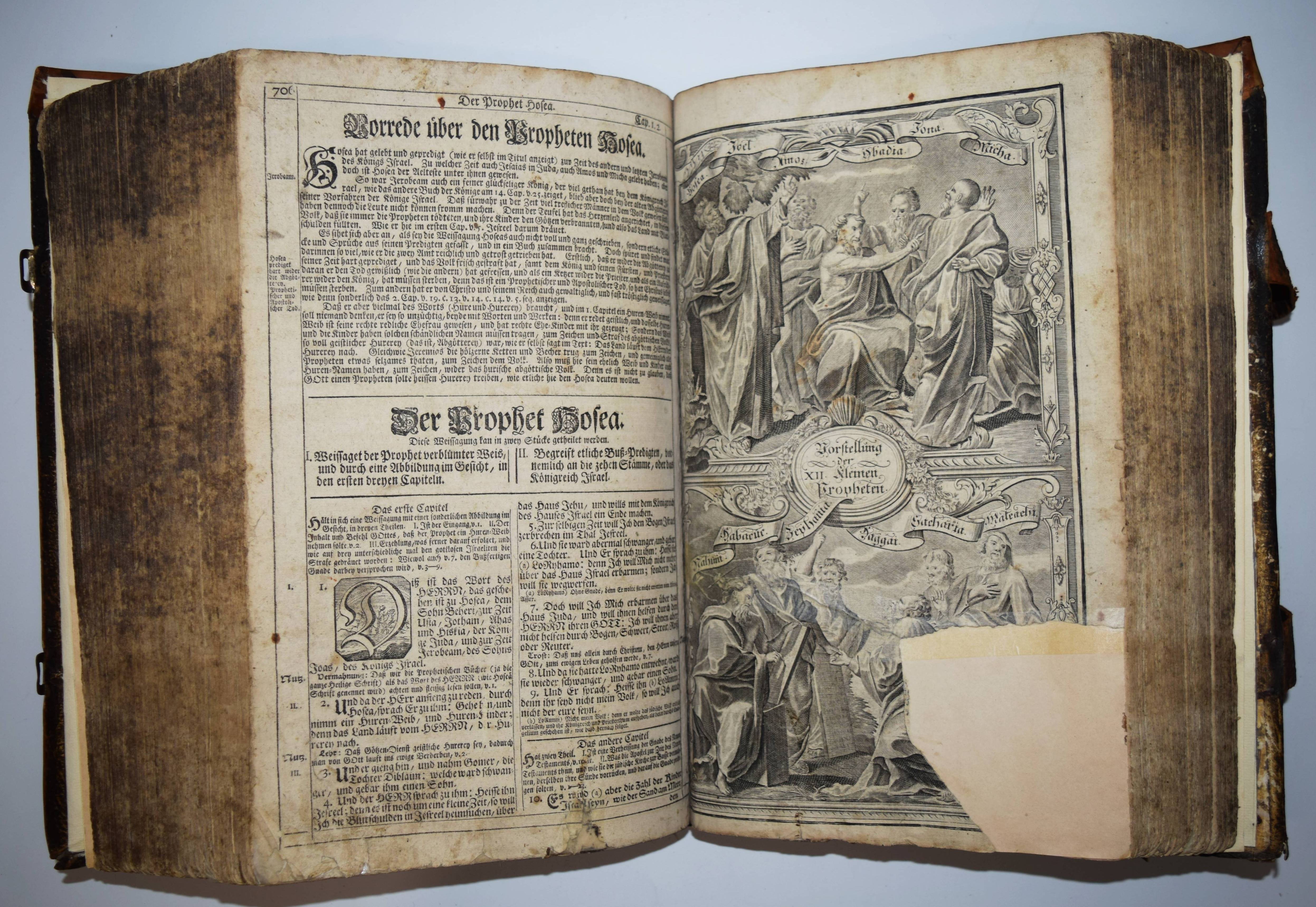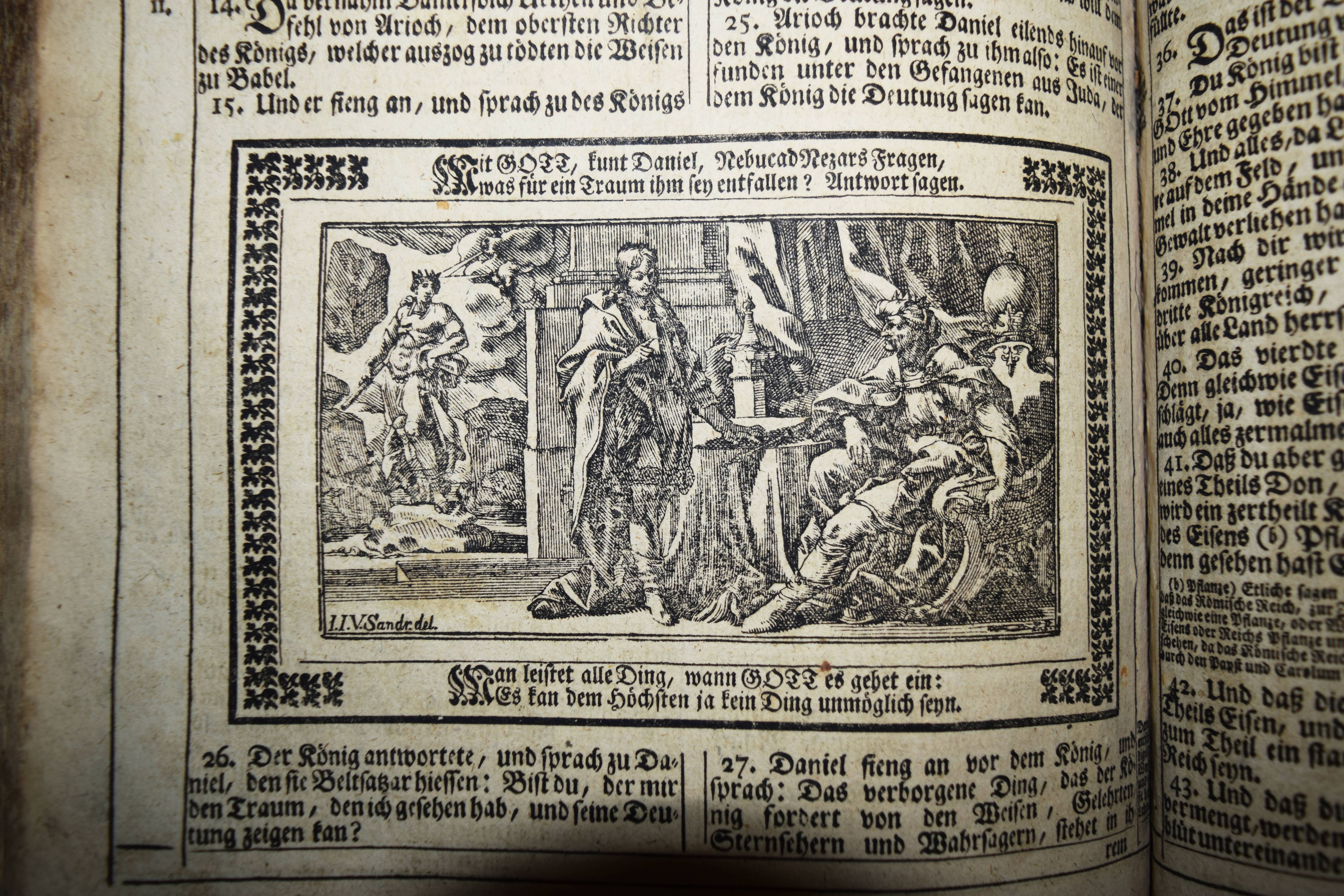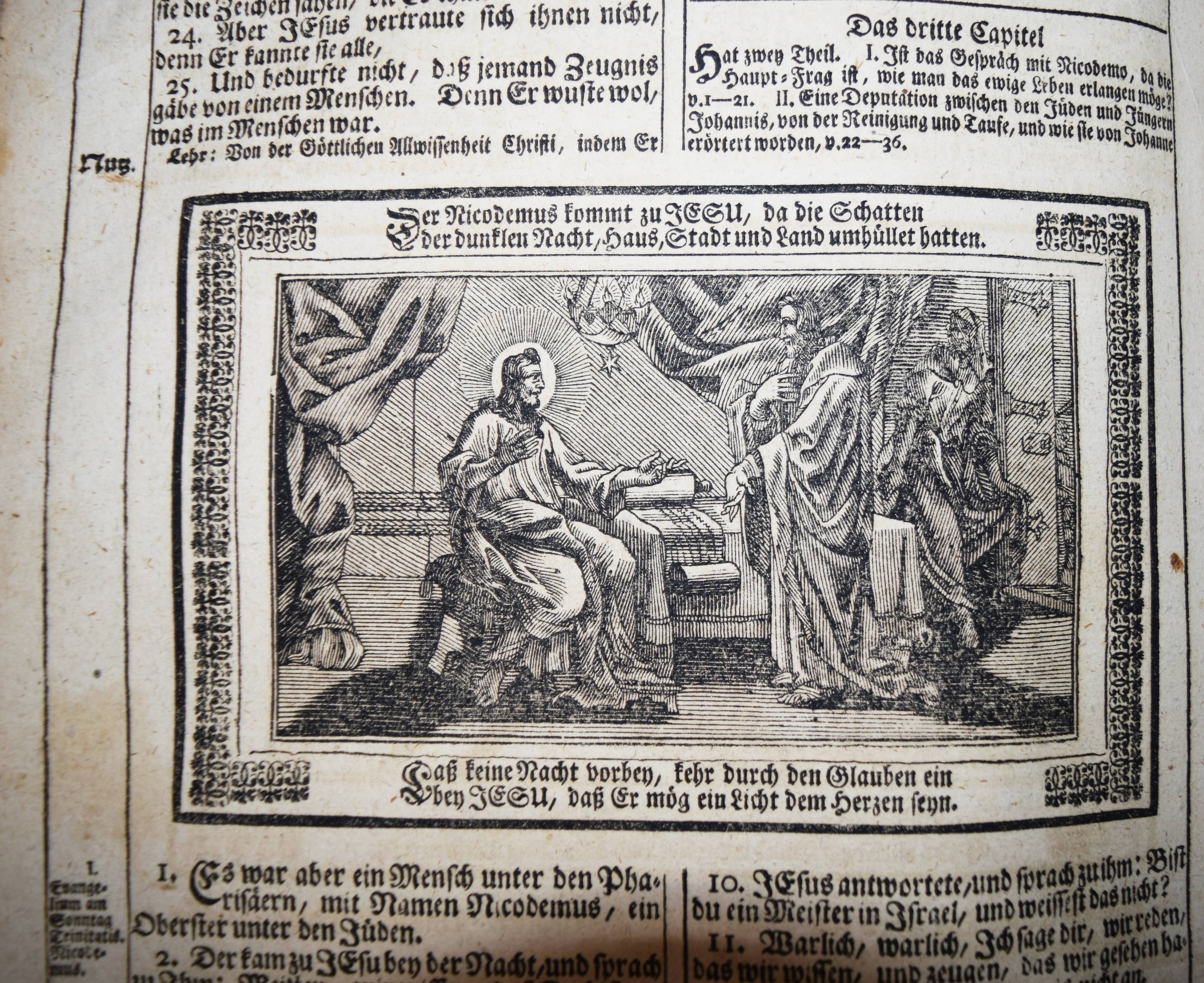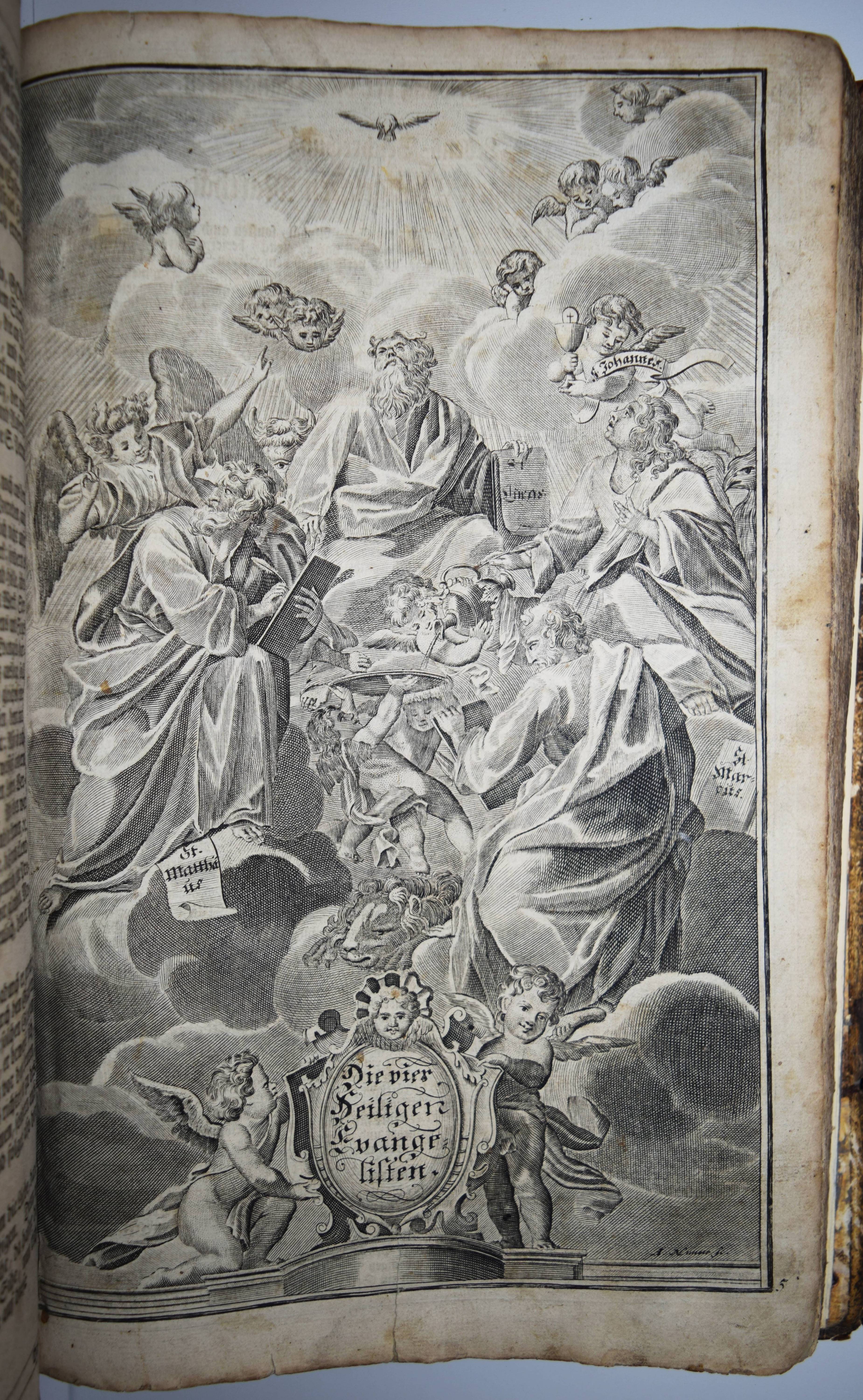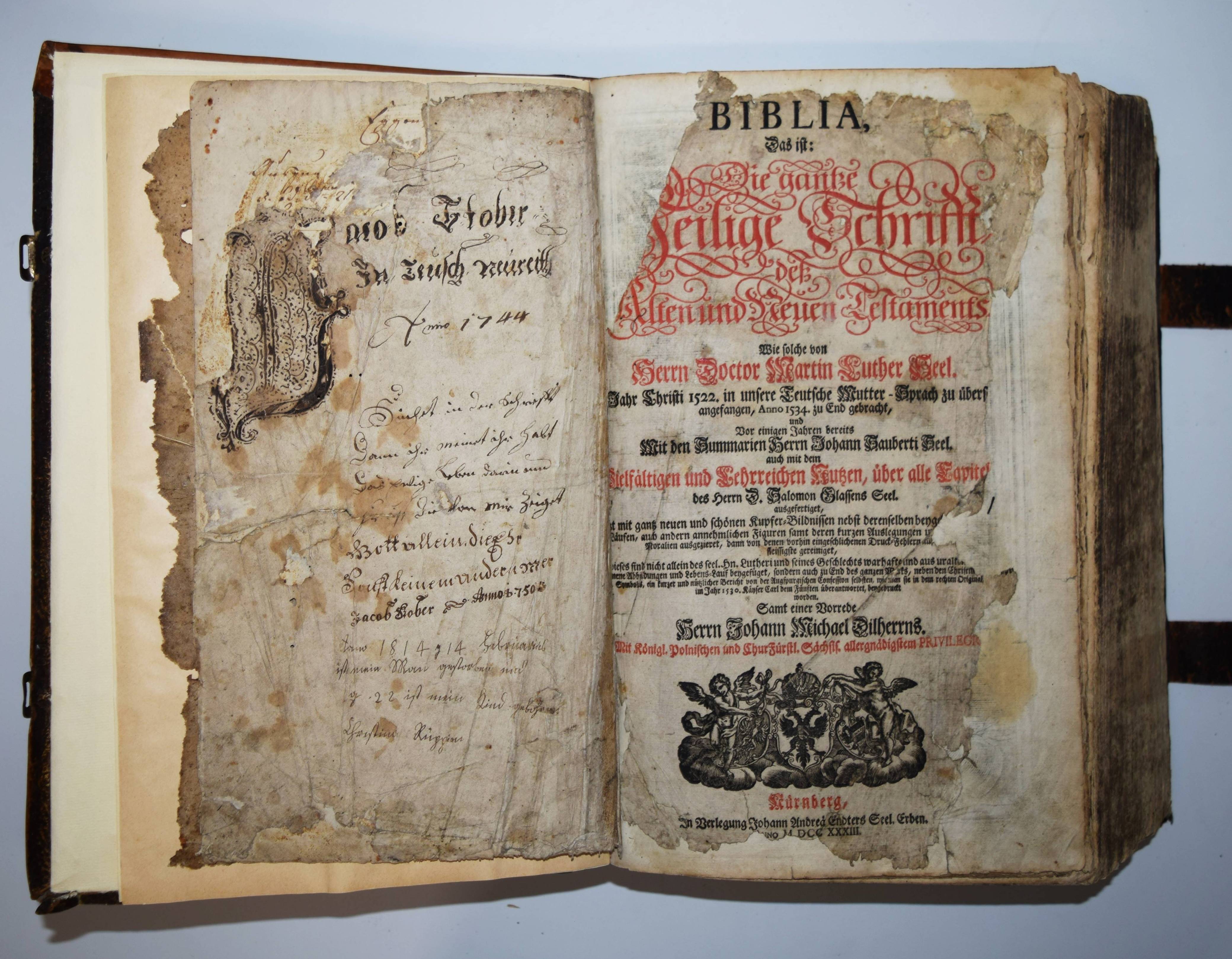 Biblia germanica – Luther, Martin (Übers.). Biblia, Das ist: die gantze Heilige Schrifft, Altes und Neues Testaments, Teutsch, Herrn Doctor Martin Luther … Mit den Summarien Herrn Johann Sauberti … Samt einer Vorrede Herrn Johann Michael Dilherrns. 2 Teile in 1 Band. Nürnberg, Johann Andreä Endters Seel. Söhne 1733. Folio (39 x 26 cm.). [32] Bl, 706 S., [2] Bl., S. 707-912,; gestoch. Frontispiz, Titel, S. 913-1034, [2] Bl., S. 1035-1181, (9) S. mit Titel in Rot und Schwarz, 2 gestoch. Frontispizen, gestoch. Portrait Luthers, 4 gestoch. illustr. Zwischentiteln und 226 Text-Holzschnitten von Paul Creutzberger. Zeitgenöss. blindgepr. Schweinsledereinband über Holzdeckeln auf 5 Bünden mit 2 Messingschließen. Bibelslg. der Württ. Landesbibliothek E 1322. Darlow/Moule 4234. Jahn 117 f. Schmidt 372 ff. – 21. Auflage der berühmten Dilherr-Bibel des Endter-Verlages. – „Wegen des sehr hohen Aufwandes, den die Weimarer Bibel erfordert hatte, gab Wolfgang Endter der Ältere 1656 eine kleinere Variante heraus, die unter der Verantwortung des eben genannten Nürnberger Pfarrers und Rhetorikers Johann Michael Dilherr (1604-1669) stand. Die Dilherr-Bibel garantierte den Endters die größten Erfolge. Von 1656 bis 1788 erschienen mindestens 29 Auflagen. Sie bieten den reinen Text der Luther-Bibel fortlaufend, eignen sich demnach auch zum Vorlesen in Kirche und Familie und sind durch ihre in den Text eingestreuten zweispaltigen Holzschnitte Bilderbuch zugleich“ (E. Zwink, Württ. Landes-Bibliothek, Stuttgart). – Einband berieben und an der oberen Kante restauriert, das Verschlußteil der oberen Schließe fehlt, Vorsätze erneuert, Titelblatt mit Fehlstellen im Rand (minimaler Textverlust) und verso auf das Frontispiz aufgezogen, 1 Kupfertafel mit hinterlegter Fehlstelle, durchgehend gebräunt und im Blattrand fingerfleckig, insgesamt noch ordentliches und vollständiges Exemplar in einem zeitgenössischen Einband.