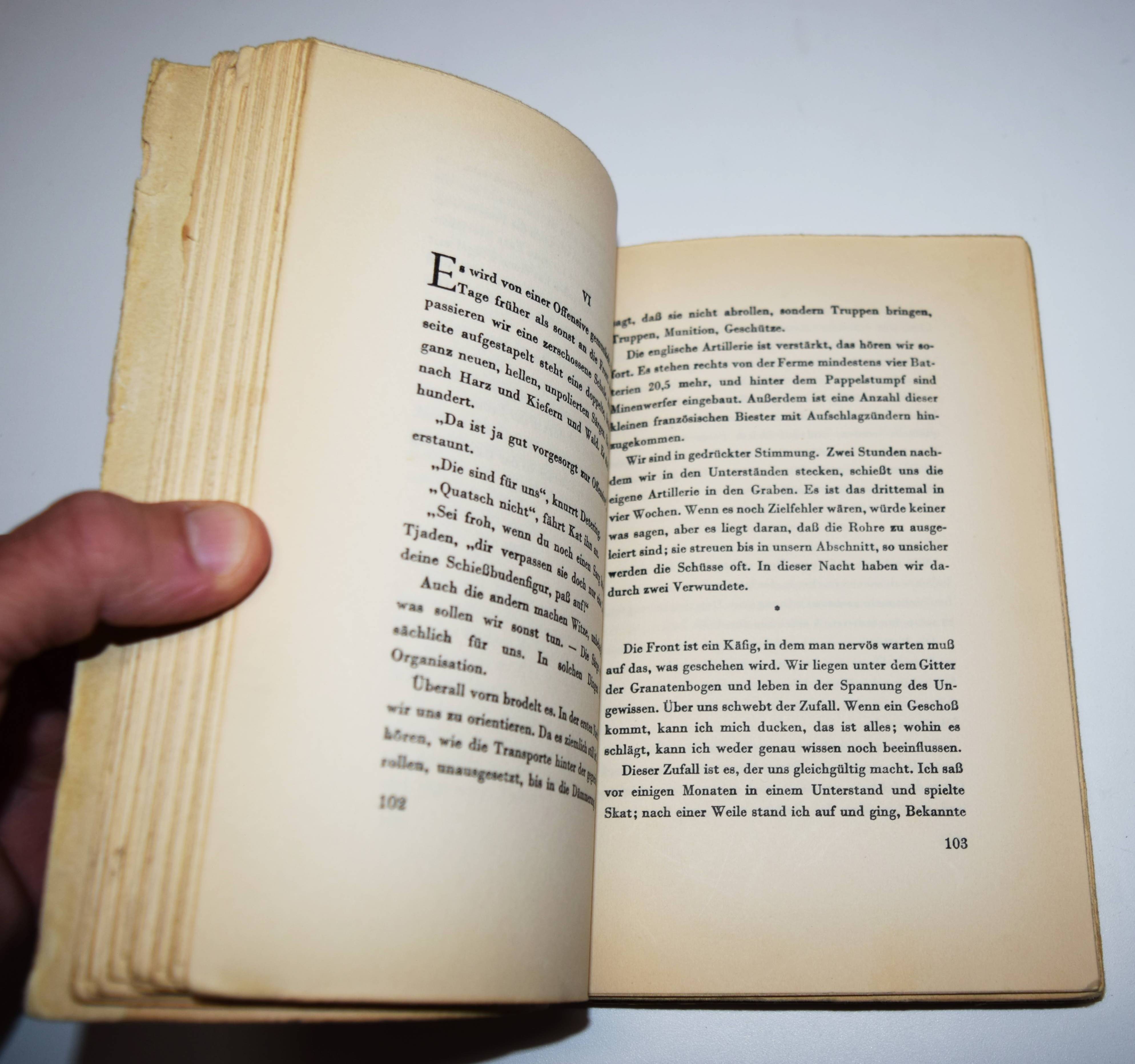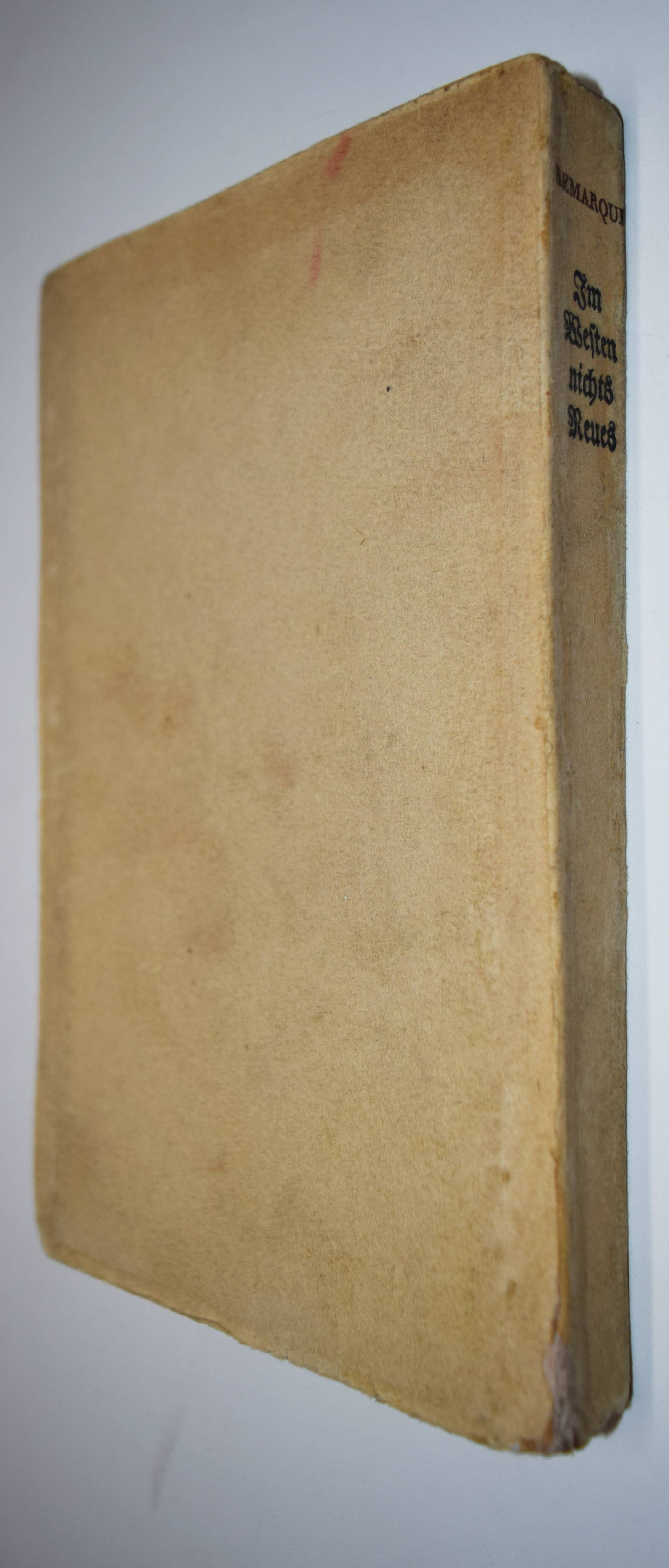 Remarque, Erich Maria. Im Westen nichts Neues. 101.– 125. Tausend. Berlin, Propyläen-Verlag 1929. 8°. 287, (1) S. Typogr. Orig.-Kartonumschlag. Frühe Auflage der seltenen kartonierten Ausgabe des berühmten Anti-Kriegsromans. – „Remarques Buch ist das Denkmal unseres unbekannten Soldaten. Von alllen Toten geschrieben“ (Walter von Molo, Umschlagtext). – Sehr gutes sauberes Exemplar.