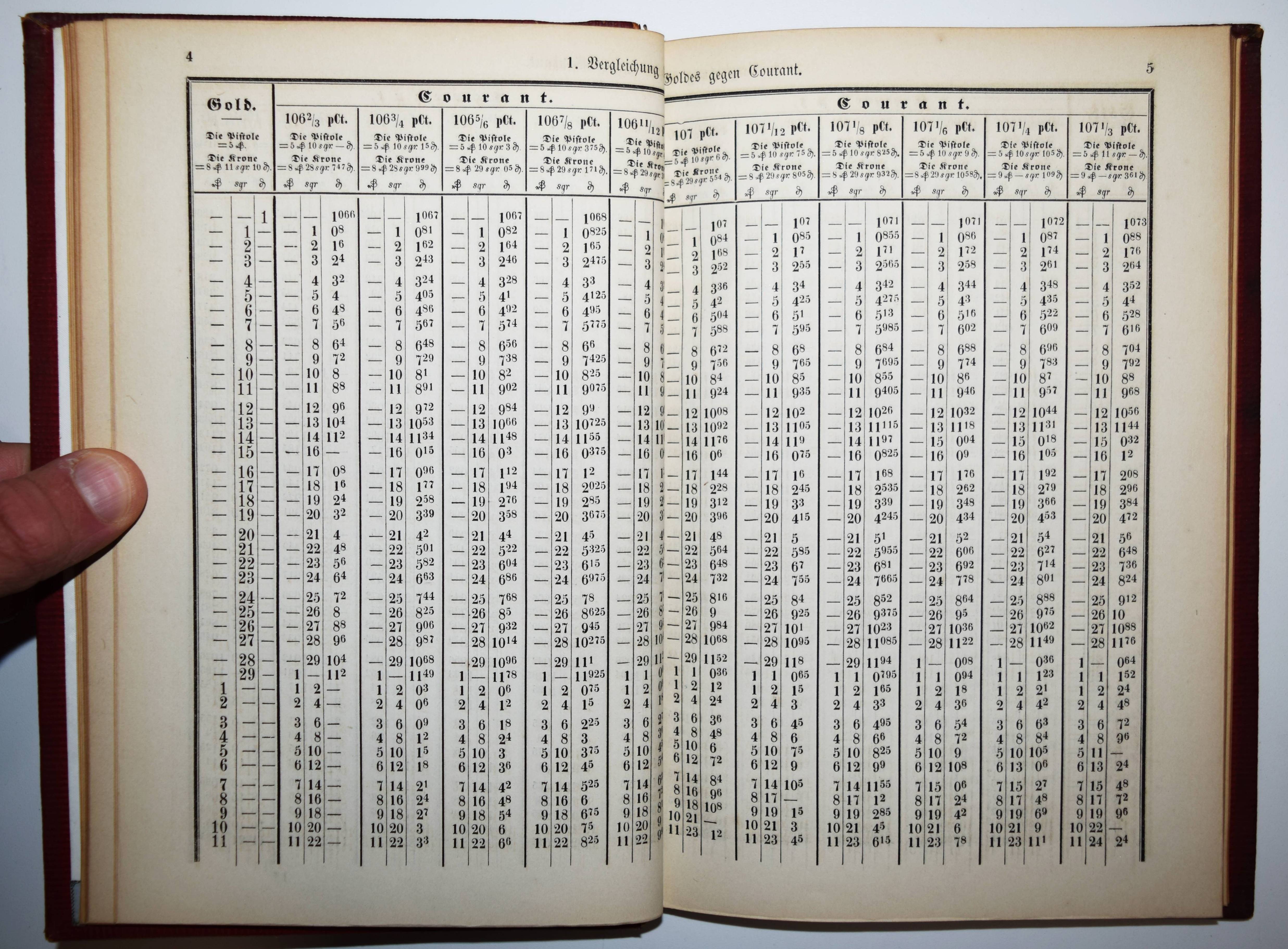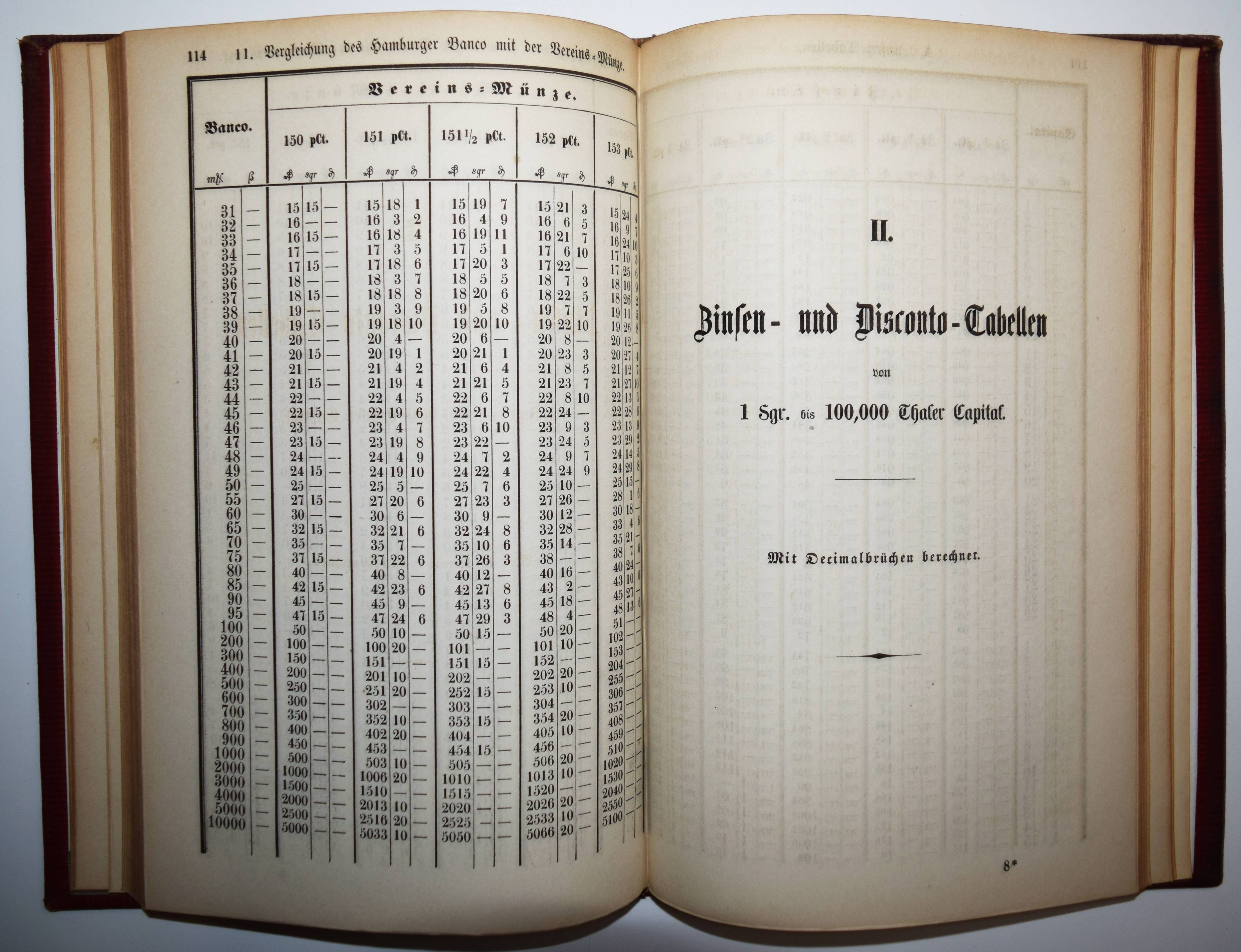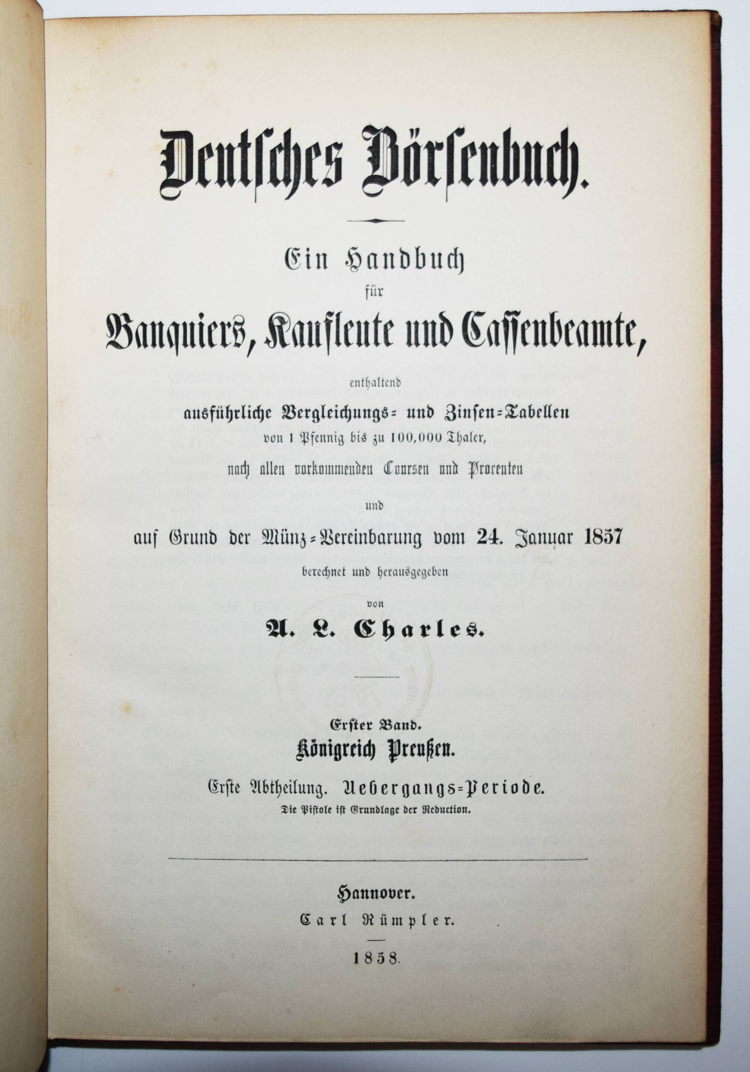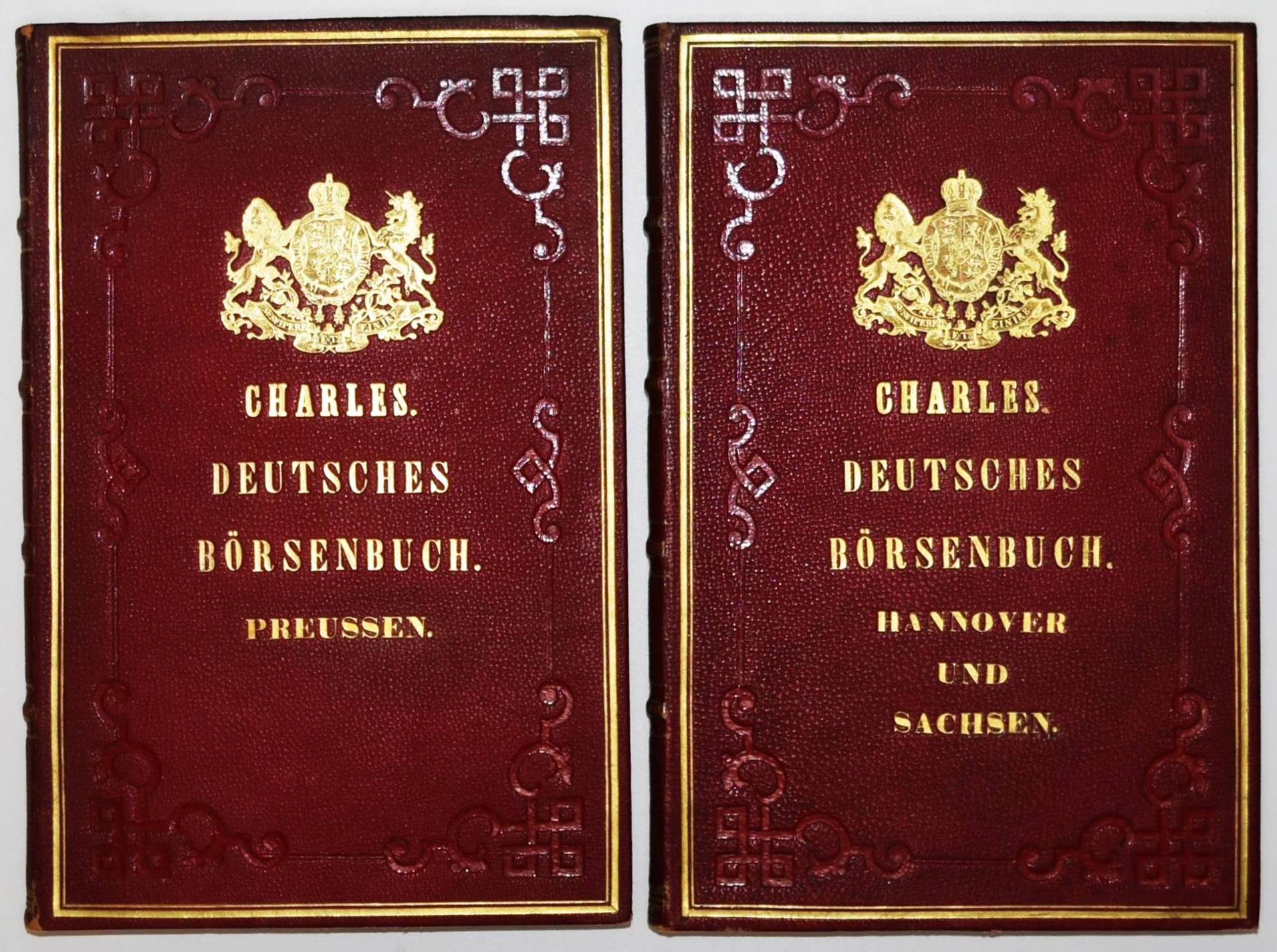 Charles, A. L. (Hrsg.). Deutsches Börsenbuch. Ein Handbuch für Banquiers, Kaufleute und Cassenbeamte enthaltend ausführliche Vergleichungs- und Zinsen-Tabellen… Auf Grund der Münz-Vereinbarung vom 24. Januar 1857 berechnet und herausgegeben. Erster Band. Königreich Preußen. (Und) Zweiter Band. Königreich Hannover und Sachsen. (Jeweils) Erste Abtheilung (mehr nicht erschienen). Uebergangs-Periode. 2 Bände. Hannover, Carl Rümpler 1858. Gr.-8°. XV, (1), 168 S.; XV, (1), 168 S. Weinrote Maroquin-Lederbände der Zeit mit Rückenvergoldung, goldgepr. Deckel-Wappen und Deckeltiteln, Deckel-Filetten und Goldschnitt (signiert: C(arl) Bergmüller, Königl. Bibliothekbuchbinder, Hannover). Sehr seltenes Tabellenwerk für Bankiers und Kaufleute. – Prachtvoll gebundenes Exemplar aus der Bibliothek von Ernst August, König von Hannover (1771-1851) mit Wappen-Stempel verso Titel.