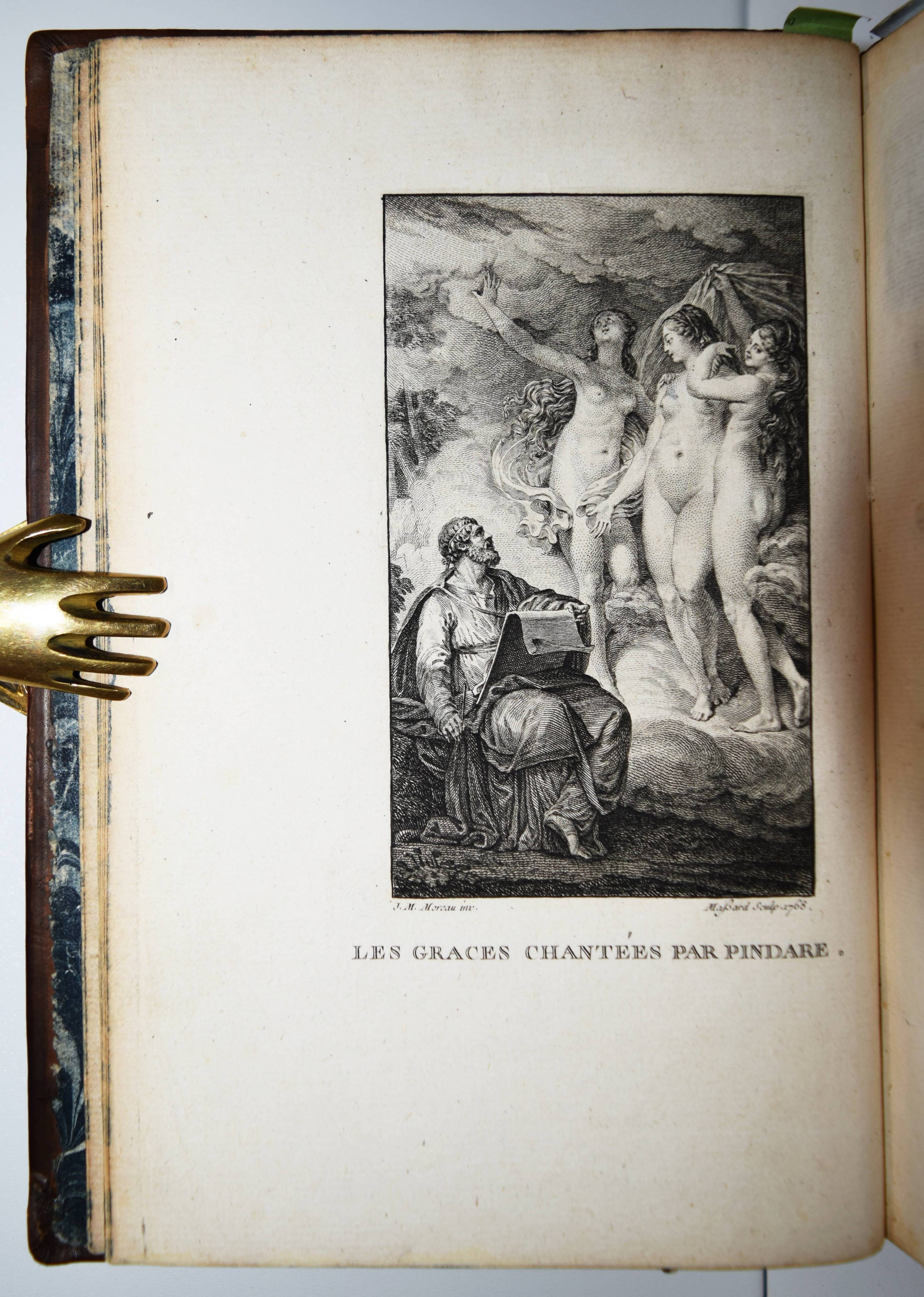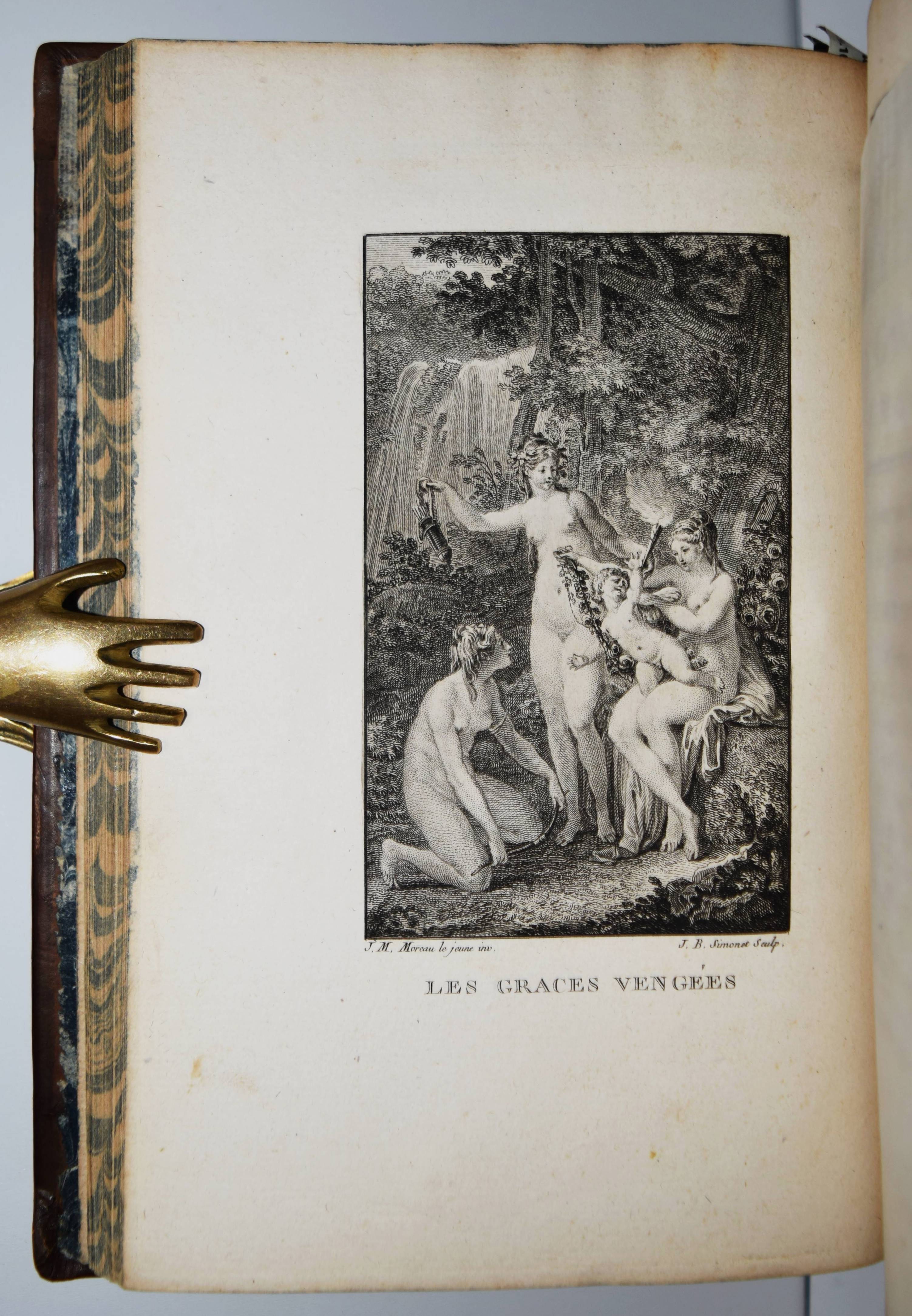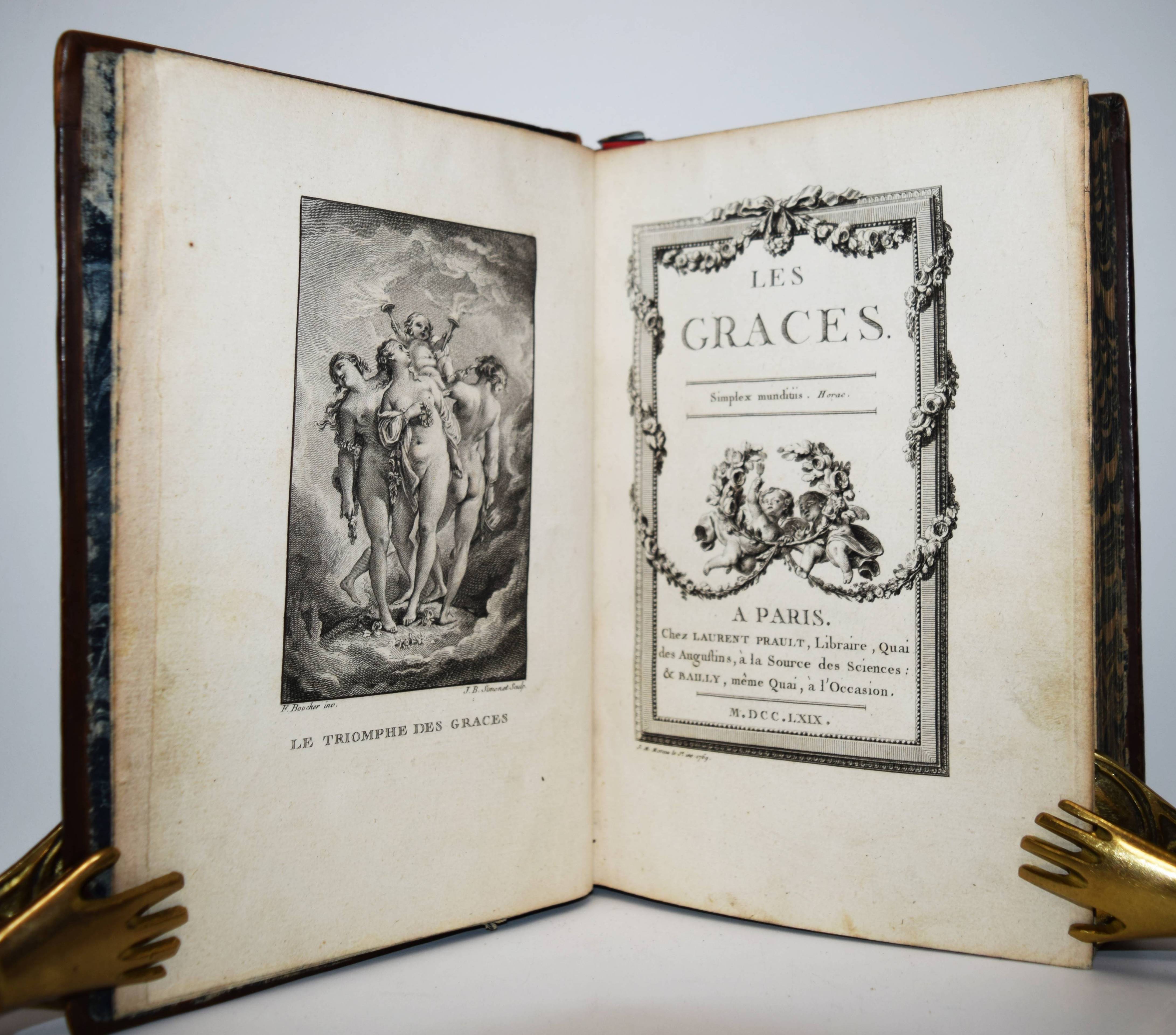 (Querlon, Anne Gabriel Meusnier de). Les Graces. Paris, Laurent Prault & Bailly 1769. 8° (21,5 x 14,5 cm.). VIII, 330 S., [3] Bl. mit gestoch. Titel von J. M. Moreau le jeune, gestoch. Frontispiz von J. B. Simonet nach F. Boucher und 5 Kupfertafeln von de Launey, de Longueil, Massard und Simonet nach Moreau. Marmorierter Kalbslederband der Zeit mit floraler Rückenvergoldung, Deckel-Filetten und marmoriertem Schnitt. Bocher 468. Cohen-Ricci II, 847. Slg. Fürstenberg 66 (mit Abb.). Gay-Lem. II, 417. Lewine S. 436. Sander 1623. – Erste Ausgabe dieser Sammlung mit Texten von Pindar, Ovid, Metastasio, Winckelmann u.a., beispielhaft für die galante Literatur des 18. Jahrhunderts. – Exemplar auf „grand papier d’Auvergne“. – „Charmant ouvrage galamment illustré…“ (Cohen-Ricci). – „(T)he illustrations are few, but their beauty and quality make up for their scanty number“ (Lewine). – Sehr schöne Illustrationsfolge von Moreau le jeune; mit zwei Kupfern in Découvertes-Zustand (S. 1 u. 86). „Im nächsten Jahre liefert der Meister die gesamte Illustration (mit Ausnahme von Bouchers Titelkupfer) zu Querlons „Les Graces“, 1769, darunter ein selbstgestochenes Titelblatt. Den eigenhändigen Kupferstichen Moreaus verlohnt es sich, in allen Fällen nachzuspüren, denn sie pflegen zum Reizvollsten in seinem Oeuvre zu gehören. Kein anderer hat es so gut verstanden wie er selbst, den Charme seiner Entwürfe auf die Kupferplatte zu bannen. Leider sind derartige Arbeiten nicht allzu zahlreich“ (Fürstenberg S. 108). – Gelenke fachgerecht restauriert, Kanten u. Ecken geringf. berieben, gutes nahezu fleckenfreies und breitrandiges Exemplar, in einem dekorativem zeitgenöss. Einband.