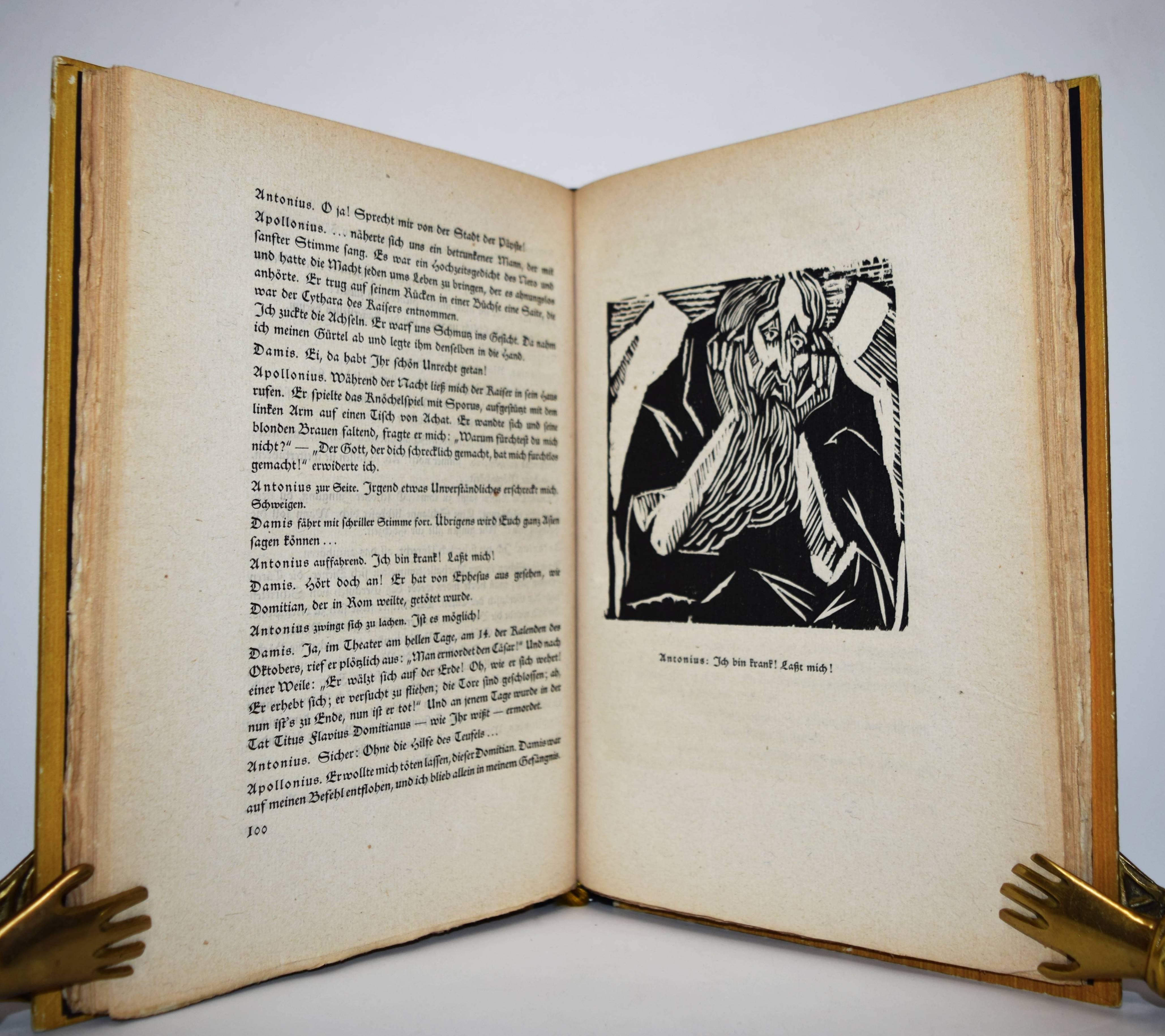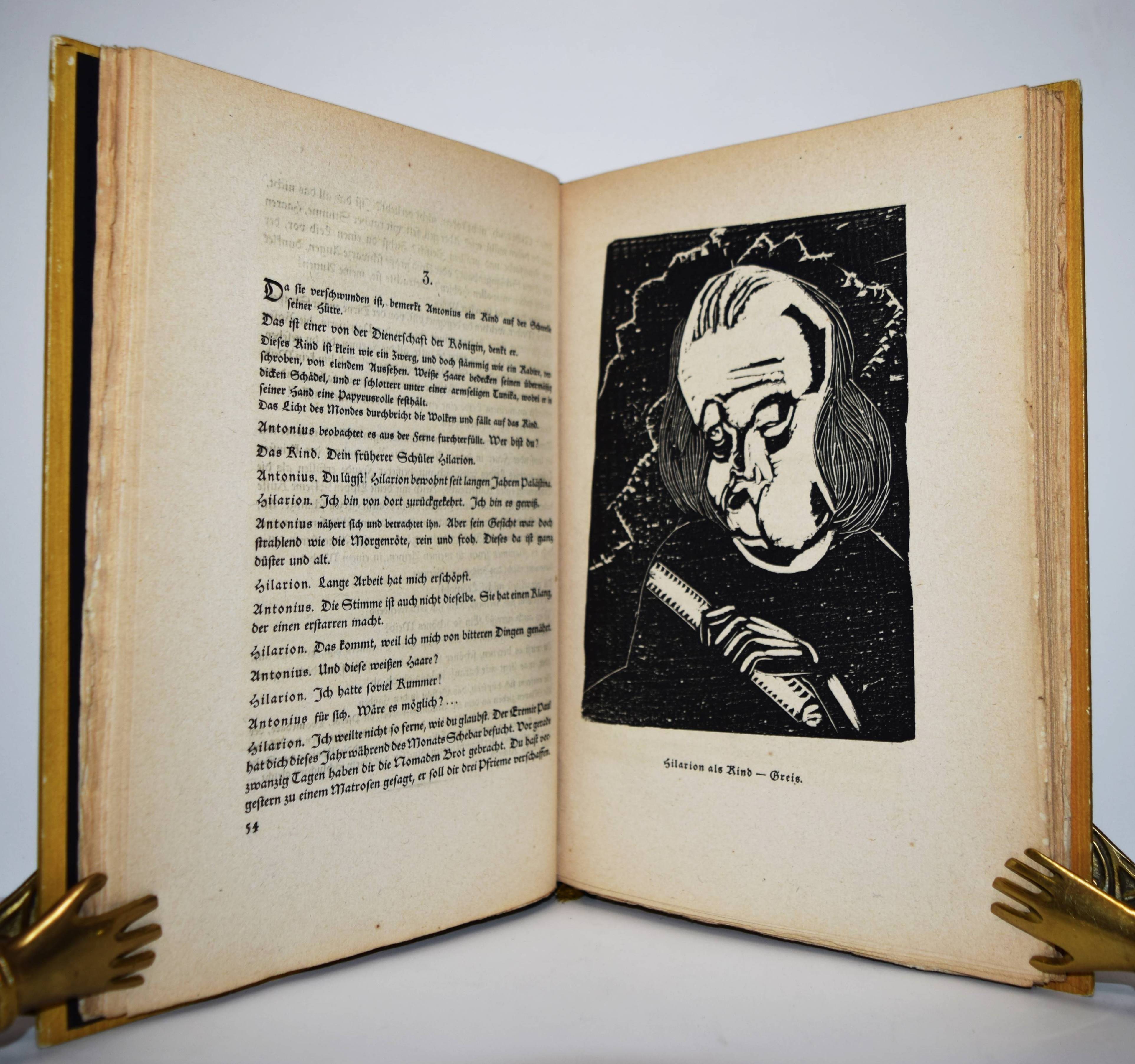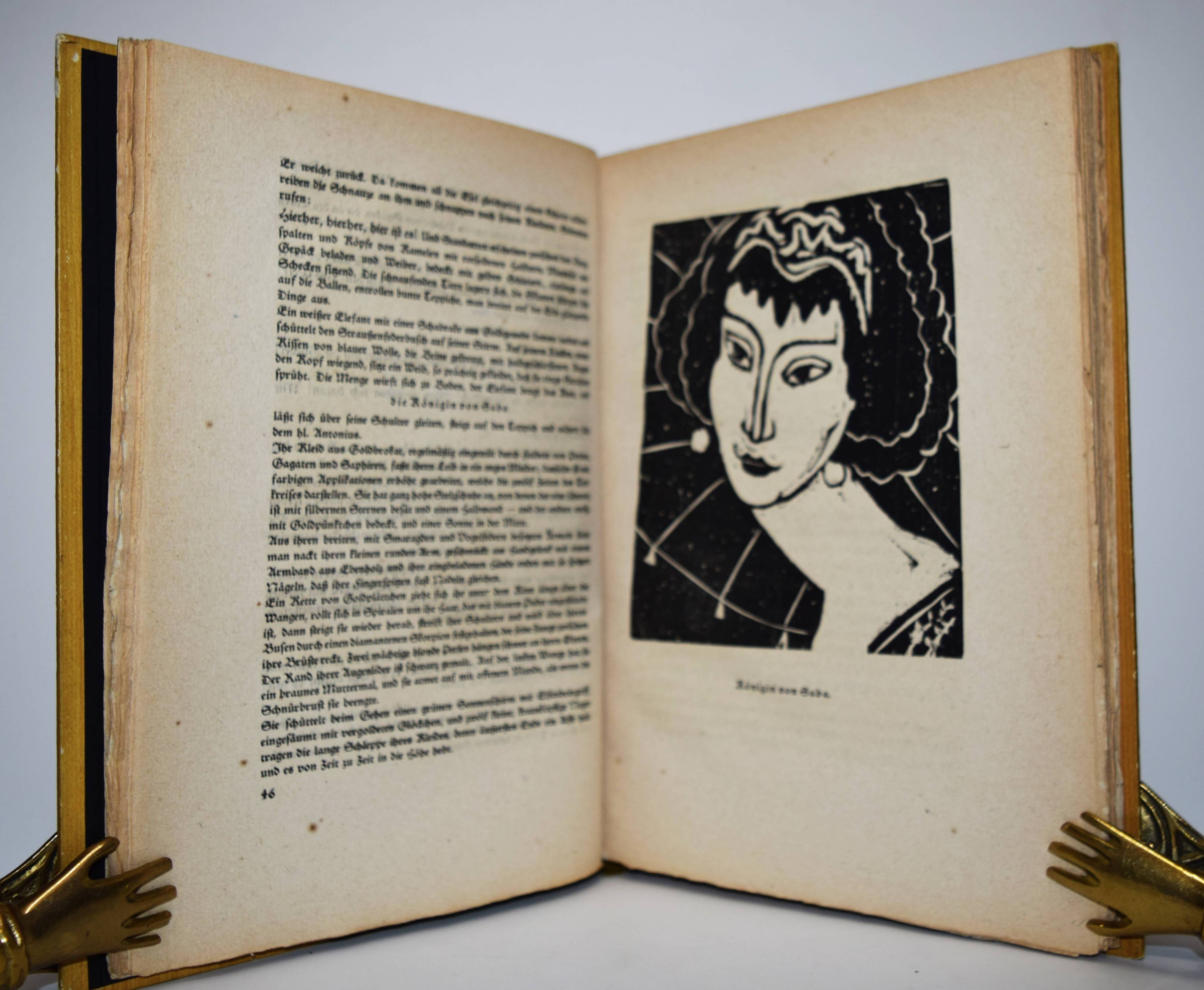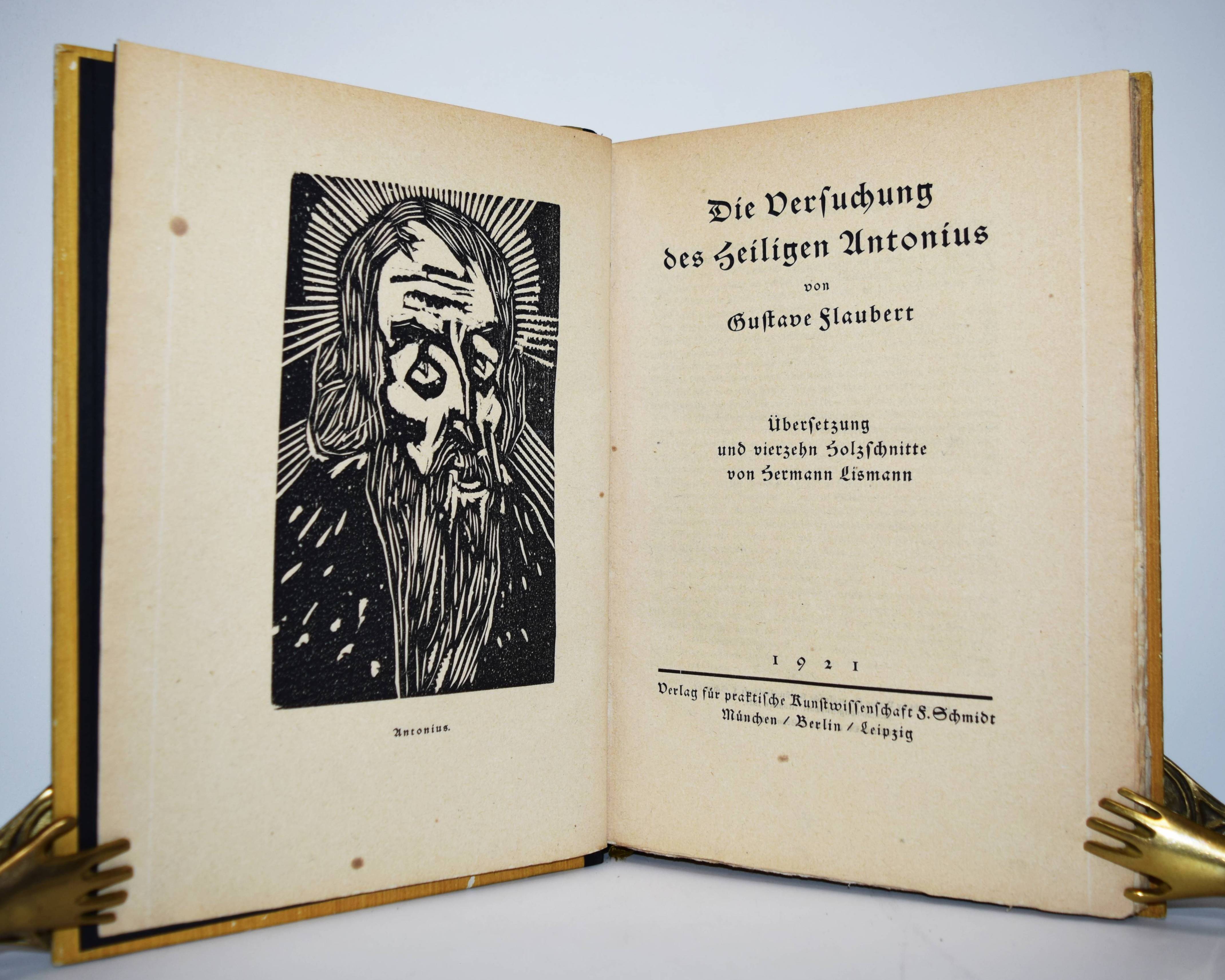 Flaubert, Gustave. Die Versuchung des Heiligen Antonius. Übersetzung und vierzehn Holzschnitte von Hermann Lismann. München, Berlin, Leipzig, Verlag für praktische Kunstwissenschaft F. Schmidt 1921. 4°. 170, [1] S. mit 14 Orig.-Holzschnitten. Orig.-Halblederband mit goldgepr. Rückentitel, Deckelvignette und Kopfgoldschnitt. Lang, Expressionismus 218. – Schöner bibliophiler Druck auf seitlich und unten unbeschnittenes Büttenpapier. – Der Expressionist H. Lismann (1878-1943) war Schüler von Franz Stuck in München und gehörte 1904 bis 1914 zum Kreis deutscher, dem Fauvismus nahestehender Künstler des Café du Dôme in Paris, so mit Rudolf Levy und Wilhelm Uhde. – Deckel etwas berieben, gutes Exemplar.