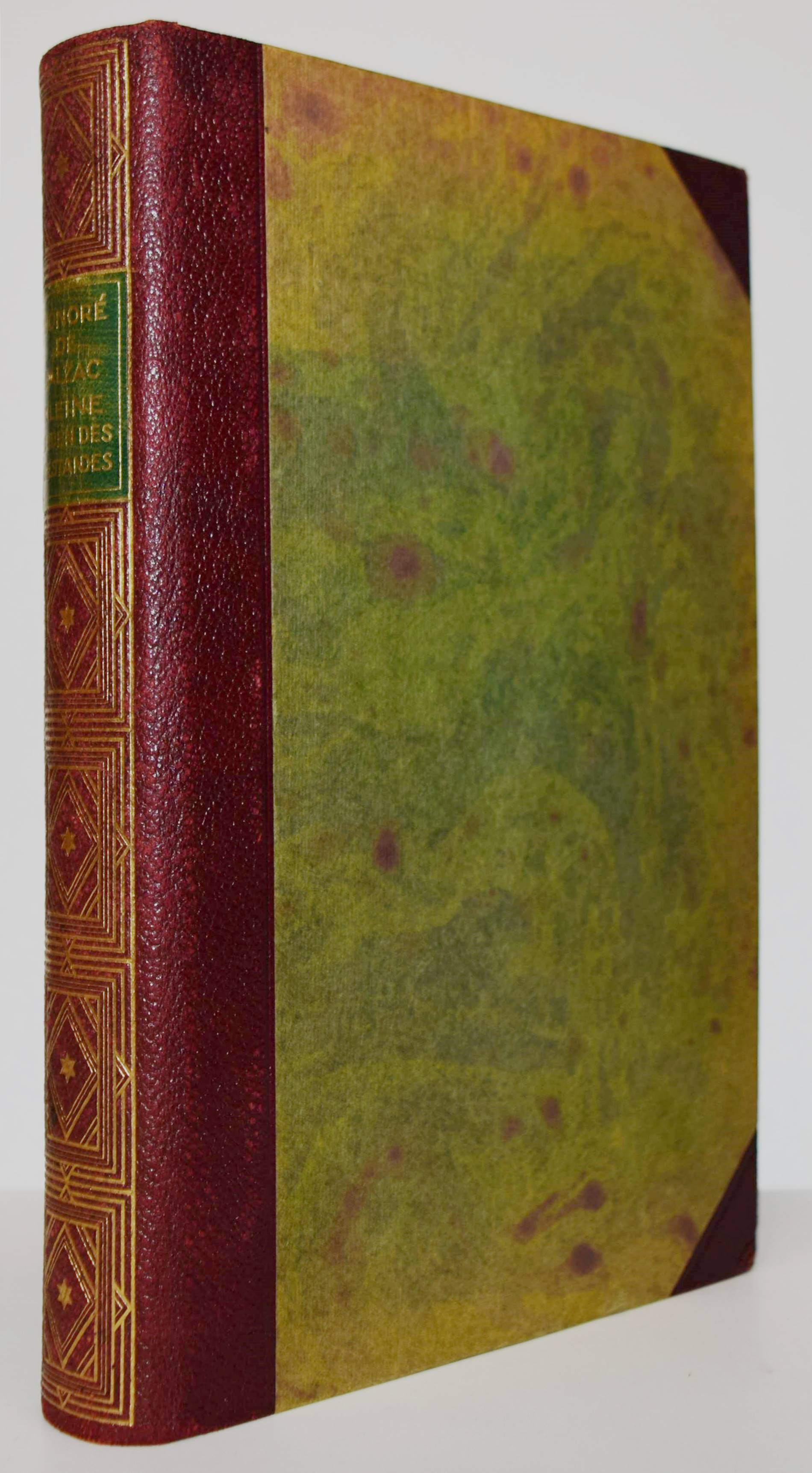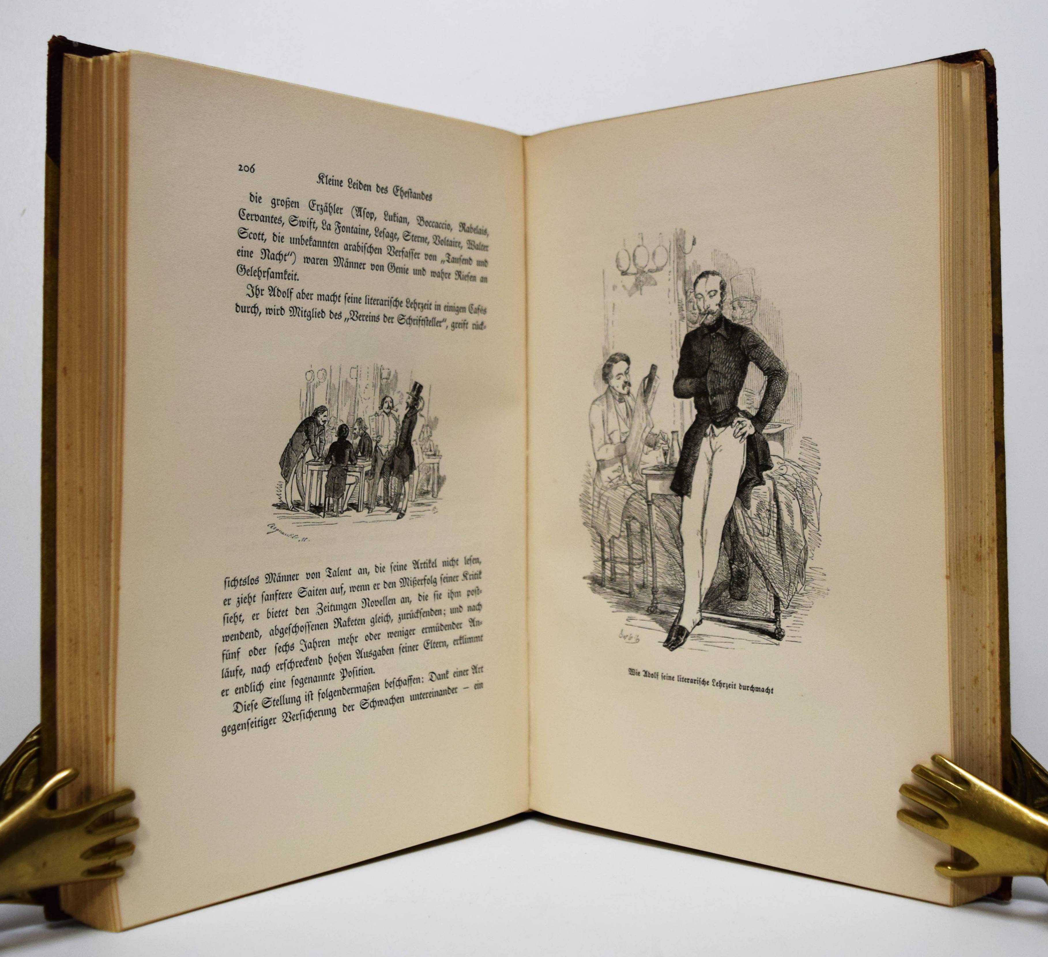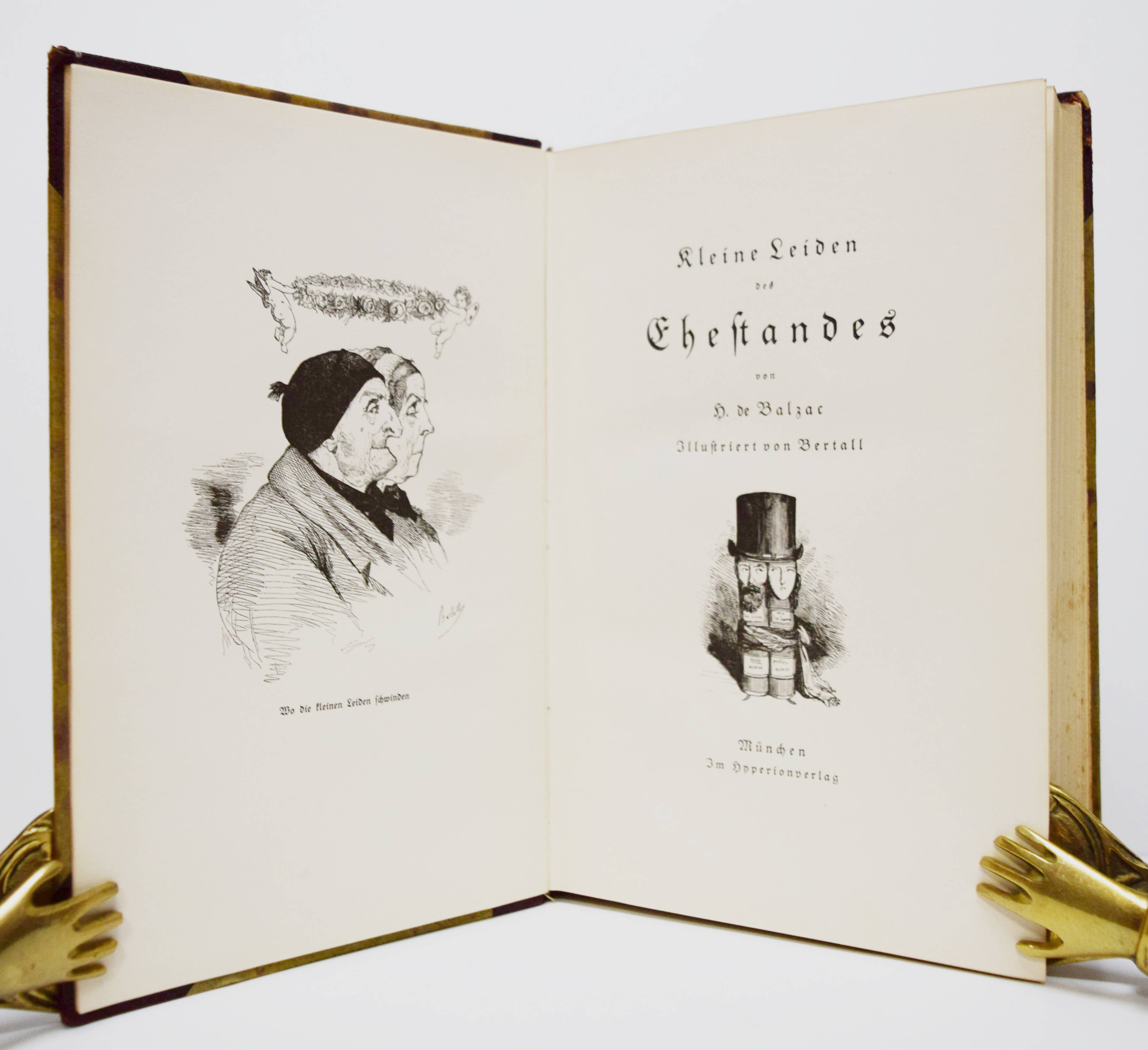 Balzac, H(onoré) de. Kleine Leiden des Ehestandes. Illustriert von Bertall (Charles Albert d’Arnoux). (Ins Deutsche übertragen von Camill Hoffmann). München, Hyperionverlag (1922). Gr.-8° (24 x 16,5 cm.). 385 S., [1] Bl. mit zahlr. Illustrationen nach Holzschnitten. Orig.-Halblederband mit goldgepr. Rückenschild, reicher Rückenvergoldung und Kopfgoldschnitt. Eines von 2150 Exemplaren. – Sehr gutes Exemplar.