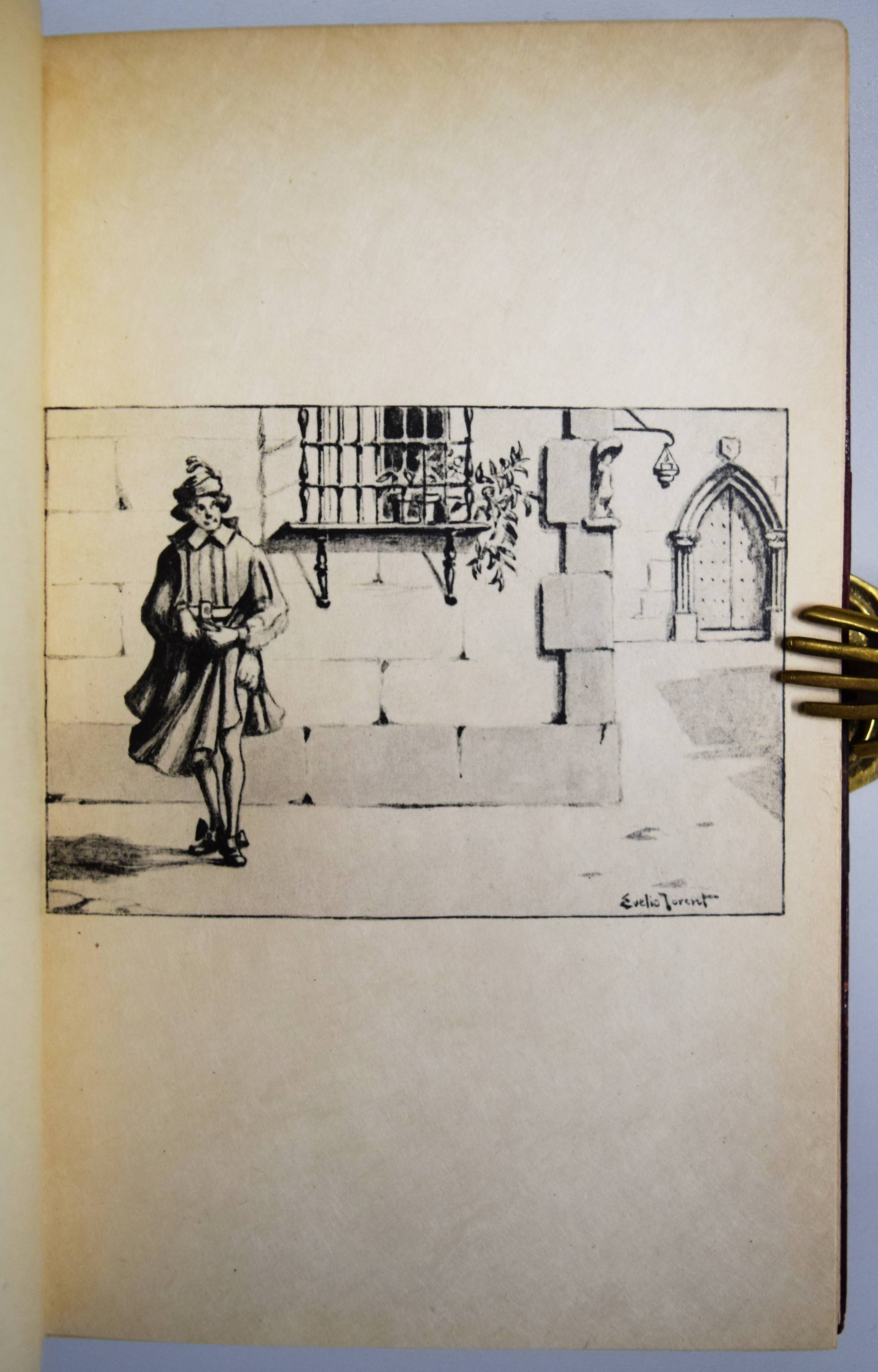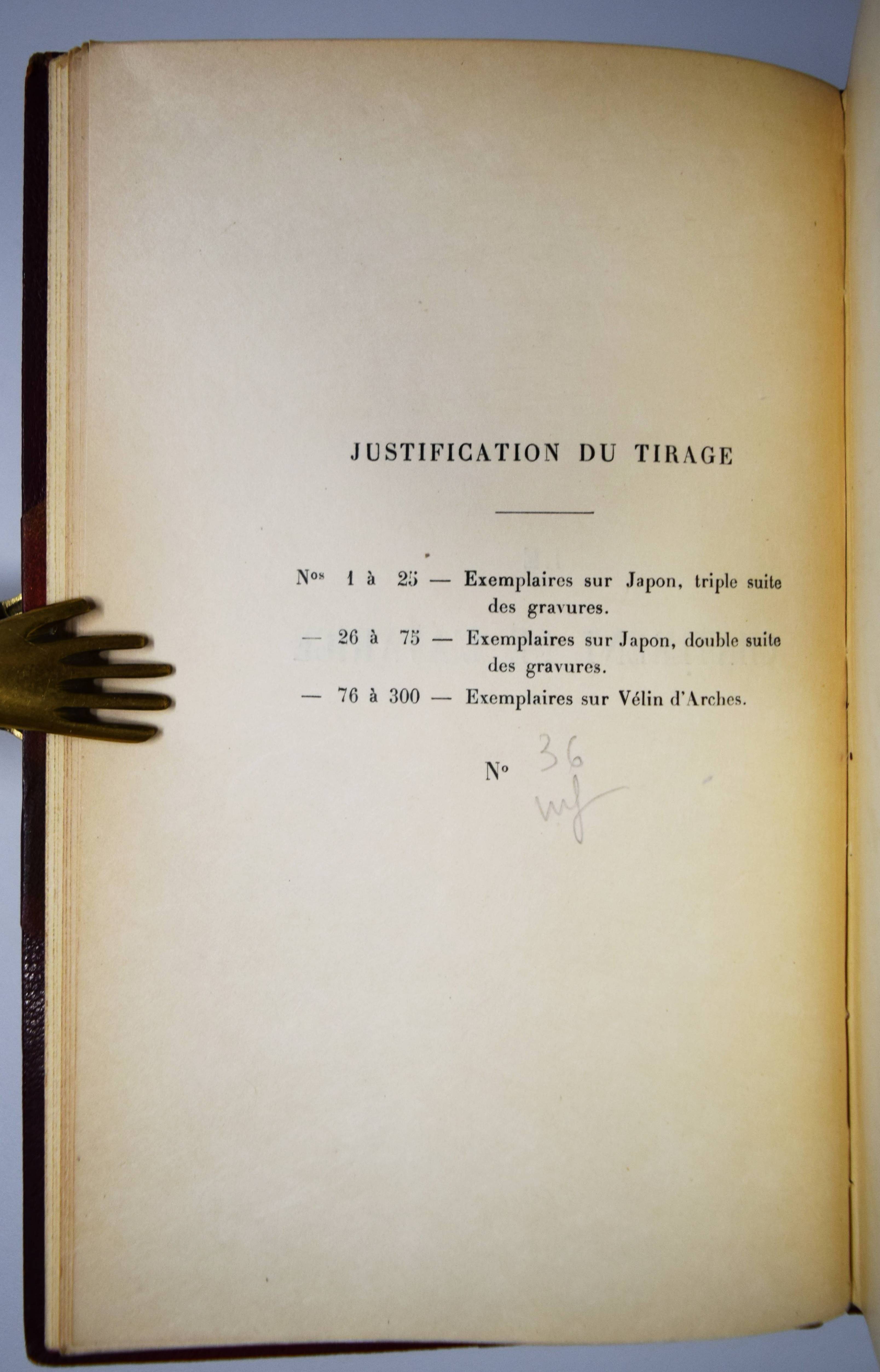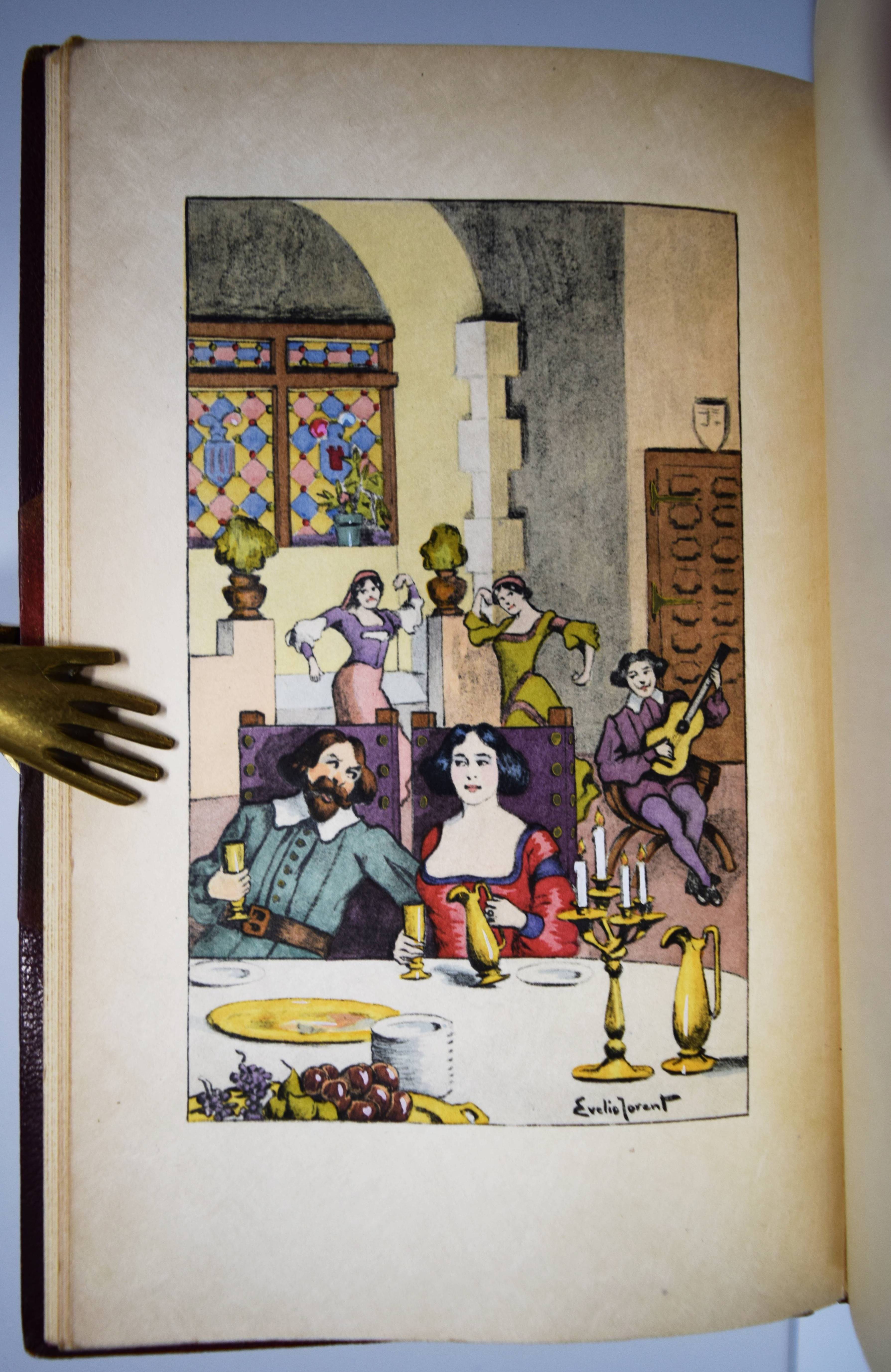 Scarron, Paul. Le Chatiment de l’Avarice. Paris, Maurice Glomeau 1913. 8°. VIII, 51 S., [1] Bl. mit farbigem Frontispiz von Emile Jovent, sowie zweitem Druck von Frontispiz und der Umschlag-Illustration in Schwarzweiß. Weinroter Halblederband der Zeit mit goldgepr. Rückentitel, reicher Rückenvergoldung und Kopfgoldschnitt (farbig illustr. Orig.-Umschlag beigebunden). Eines von 50 num. Exemplaren auf Japan (Gesamtauflage 300 Exemplare) mit Doppel-Suite des Frontispiz und der Umschlag-Illustration. – „Il n’y a pas longtemps qu’un jeune garçon aussi ambitieux que pauvre, et se piquant encore plus d’être cru Gentilhomme que d’être estimé animal raisonnable, sortit des montagnes de Navarre et vint avec son père chercher dans Madrid ce qui ne se rencontrait pas dans son pays, je veux dire des bienfaits de Fortune…“ (S. 1). – Gelenke etwas berieben, sehr schönes Exemplar in einem prachtvollen Handeinband.