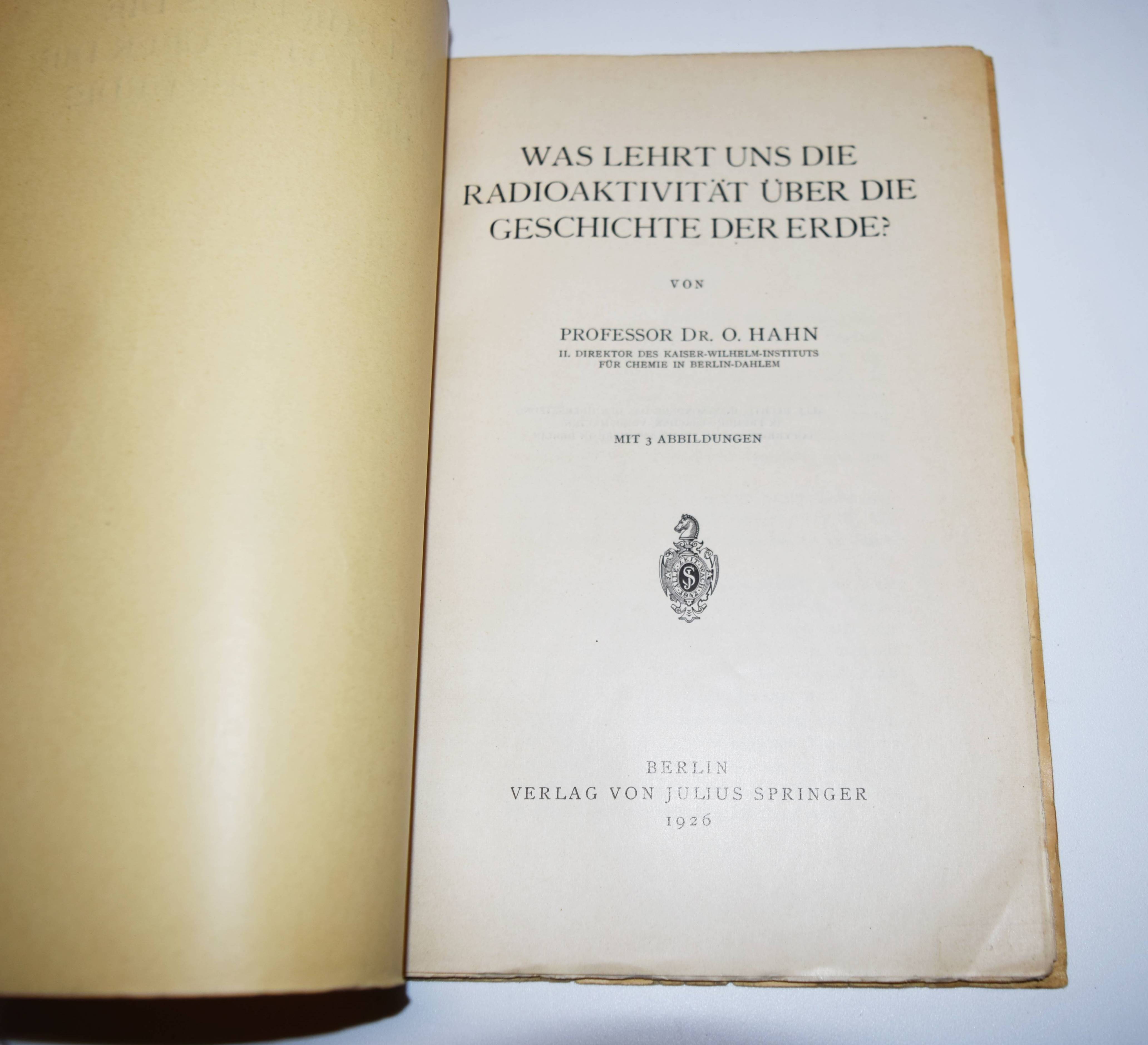Hahn, O(tto). Was lehrt uns die Radioaktivität über die Geschichte der Erde ? Berlin, Julius Springer 1926. 8°. IV, 64 S., 1 Bl. mit 3 Abbildungen. Typogr. Orig.-Broschur. Erweiterte Fassung eines Vortrages, den Otto Hahn am 25. November 1925 in öffentlicher Sitzung der Preußischen Akademie der Wissenschaften gehalten hat. – Umschlag etwas angestaubt, gutes Exemplar.