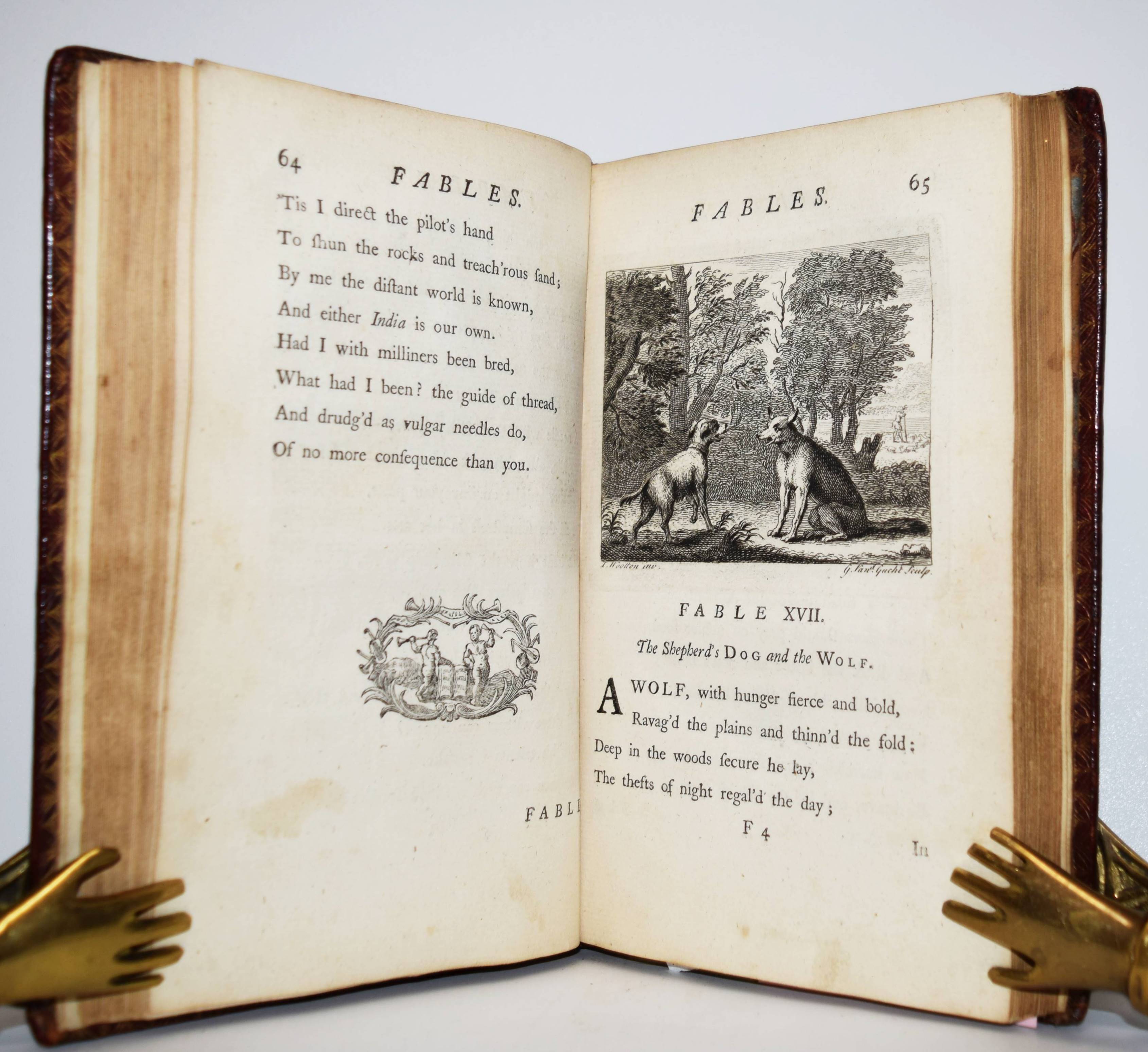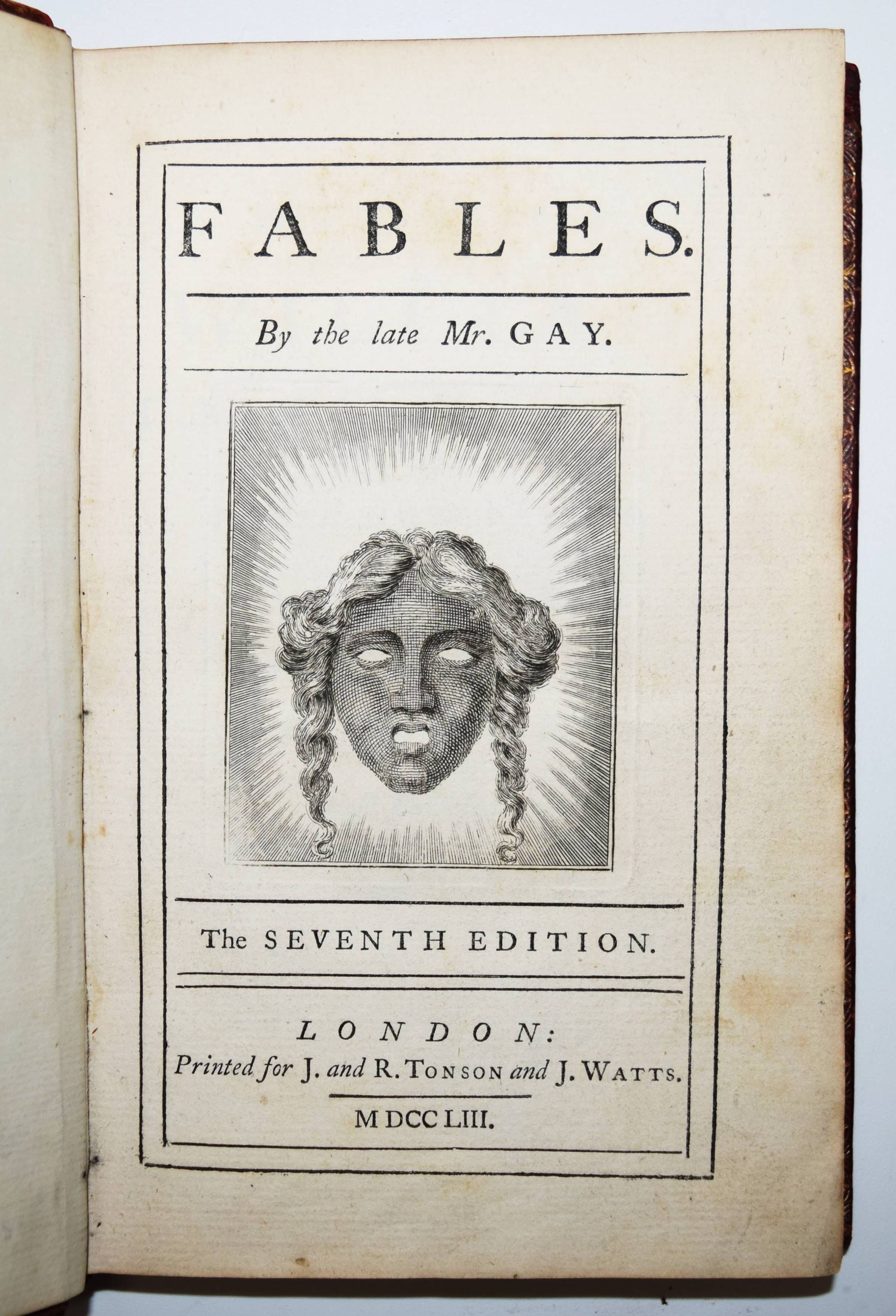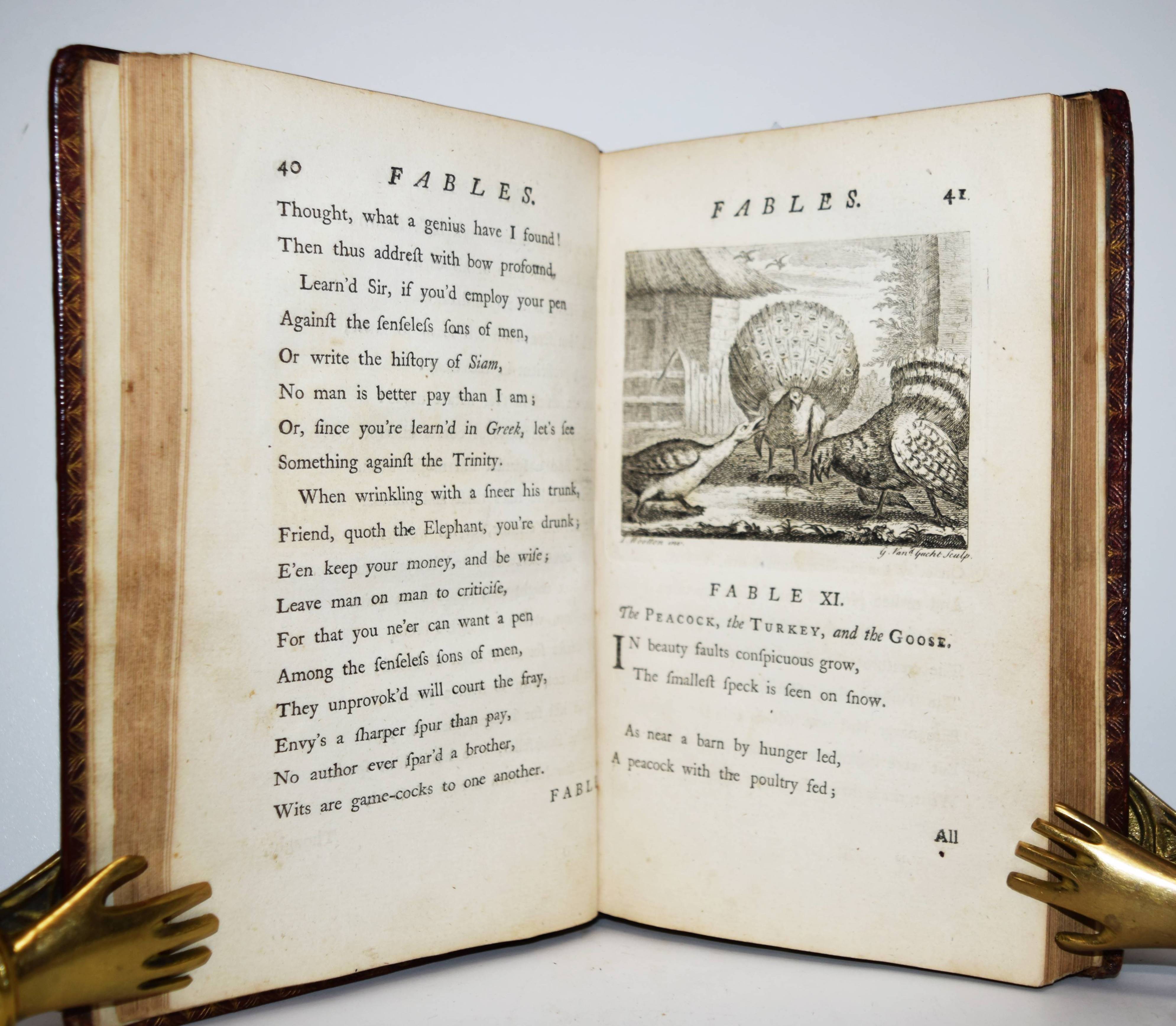 Gay, (John). Fables. By the late Mr. Gay. The seventh edition. London, printed for J. and R. Tonson and J. Watts 1753. 8°. [7] Bl., 194 S. mit gestoch. Titelvignette und 50 halbseitige Kupferstich-Illustrationen von Gerard van der Gucht, Pierre Fourdeinier und Bernard Baron nach William Kent (21) und John Wooton (29) und Schmuckvignetten in Holzschnitt. Weinroter Maroquin-Lederband der Zeit mit goldgepr. Rückenschild, Rücken-, Deckel- und Innenkantenvergoldung und Goldschnitt. Vgl. Bodemann 110.2 (5. Aufl. von 1737). Lowndes II, 869 f. – Zuerst 1727 erschienene „Sammlung von 50 Versfabeln, dem fünfjährigen Prinz William, dritter Sohn Georges II., gewidmet, stilistisch nach dem Vorbild La Fontaines gearbeitet, im Anspruch nach stofflicher Originalität aber an La Motte-Houdart orientiert. … Die Illustrationen jeweils vor Beginn der Fabel; z .T. mythologische Fabelszeren in höfischen Parkanlagen, idealen Landschaft – mit antiken Versatzstücken oder Interieurs der gehobenen bürgerlichen und höfischen Gesellschaft der Zeit. Daneben (besonders von Wootton) geschickte Tierdarstellungen in Naturkulissen und einfache, ländlich-bäuerliche Szenerien“ (W. Metzner in Bodemann). – Gelenke restauriert, stellenweise etwas fingerfleckig, schönes prachtvoll gebundenes Exemplar aus der Bibliothek des irischen Politikers George Ogle (1742-1814) mit dessen gestoch. Wappen-Exlibris.