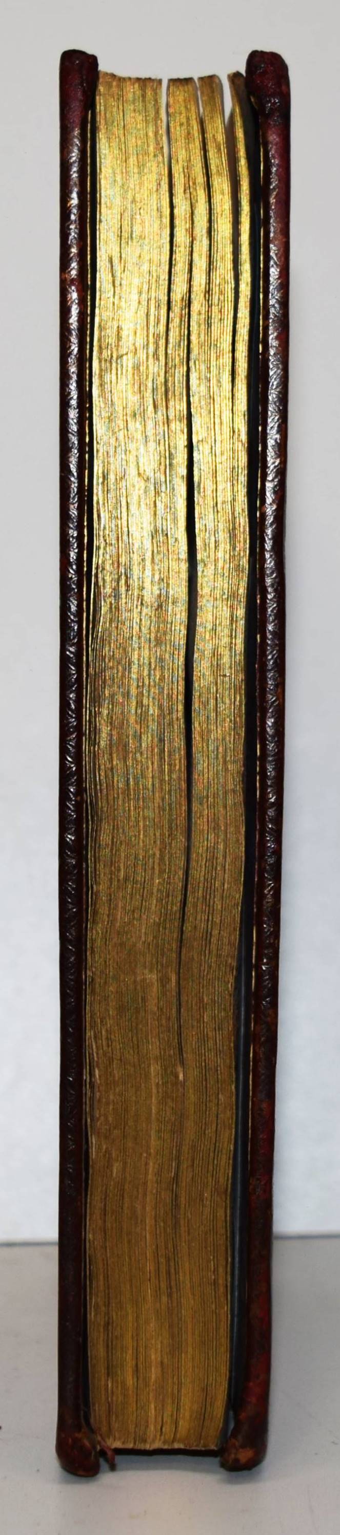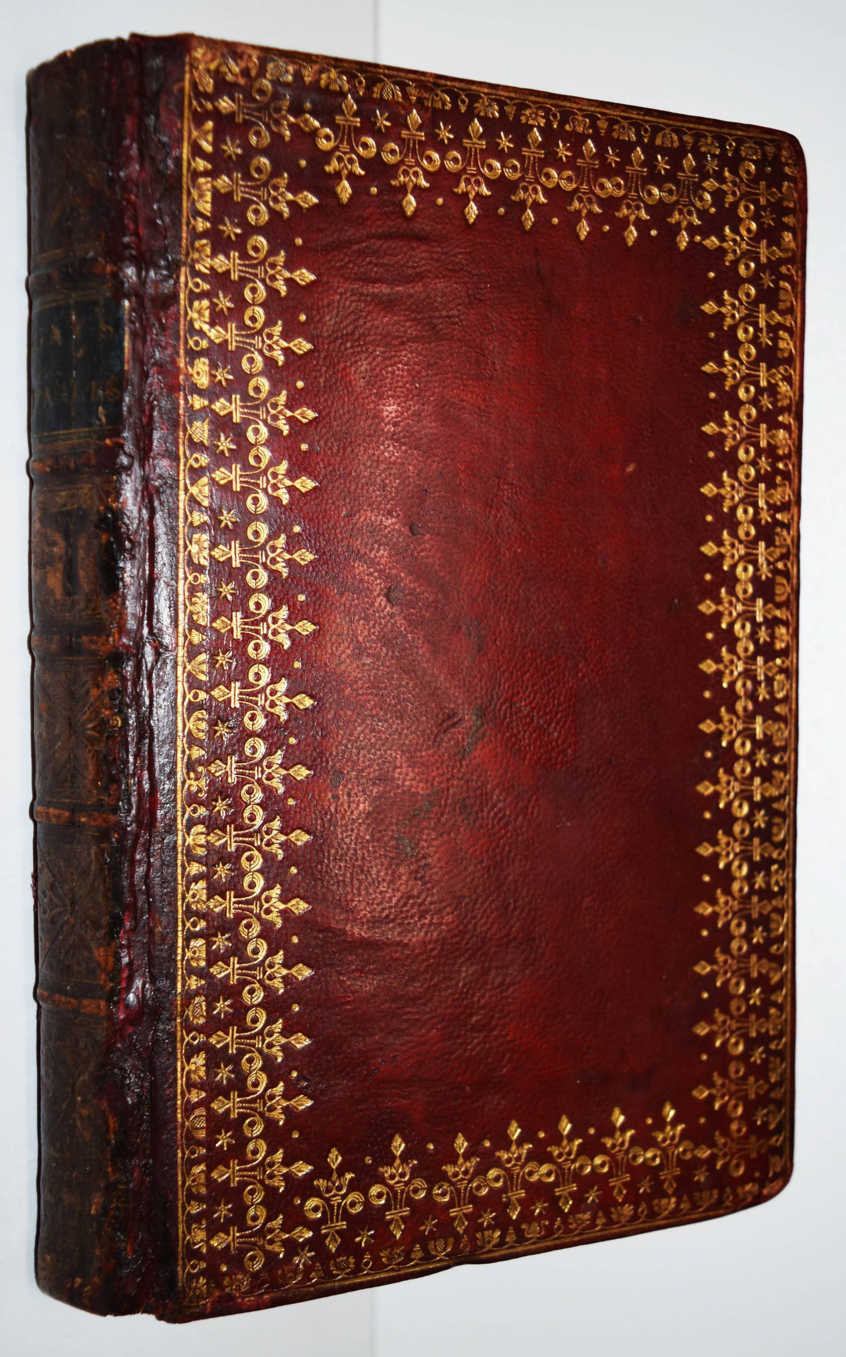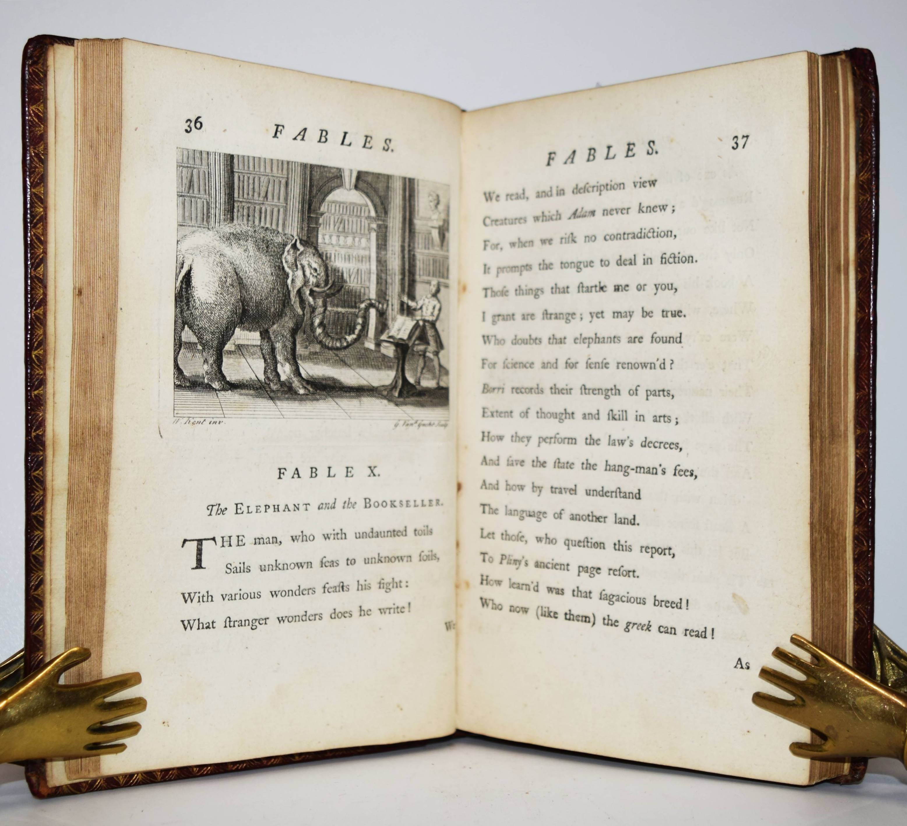 Gay, (John). Fables. By the late Mr. Gay. The seventh edition. London, printed for J. and R. Tonson and J. Watts 1753. 8°. [7] Bl., 194 S. mit gestoch. Titelvignette und 50 halbseitige Kupferstich-Illustrationen von Gerard van der Gucht, Pierre Fourdeinier und Bernard Baron nach William Kent (21) und John Wooton (29) und Schmuckvignetten in Holzschnitt. Weinroter Maroquin-Lederband der Zeit mit goldgepr. Rückenschild, Rücken-, Deckel- und Innenkantenvergoldung und Goldschnitt. Vgl. Bodemann 110.2 (5. Aufl. von 1737). Lowndes II, 869 f. – Zuerst 1727 erschienene „Sammlung von 50 Versfabeln, dem fünfjährigen Prinz William, dritter Sohn Georges II., gewidmet, stilistisch nach dem Vorbild La Fontaines gearbeitet, im Anspruch nach stofflicher Originalität aber an La Motte-Houdart orientiert. … Die Illustrationen jeweils vor Beginn der Fabel; z .T. mythologische Fabelszeren in höfischen Parkanlagen, idealen Landschaft – mit antiken Versatzstücken oder Interieurs der gehobenen bürgerlichen und höfischen Gesellschaft der Zeit. Daneben (besonders von Wootton) geschickte Tierdarstellungen in Naturkulissen und einfache, ländlich-bäuerliche Szenerien“ (W. Metzner in Bodemann). – Gelenke restauriert, stellenweise etwas fingerfleckig, schönes prachtvoll gebundenes Exemplar aus der Bibliothek des irischen Politikers George Ogle (1742-1814) mit dessen gestoch. Wappen-Exlibris.