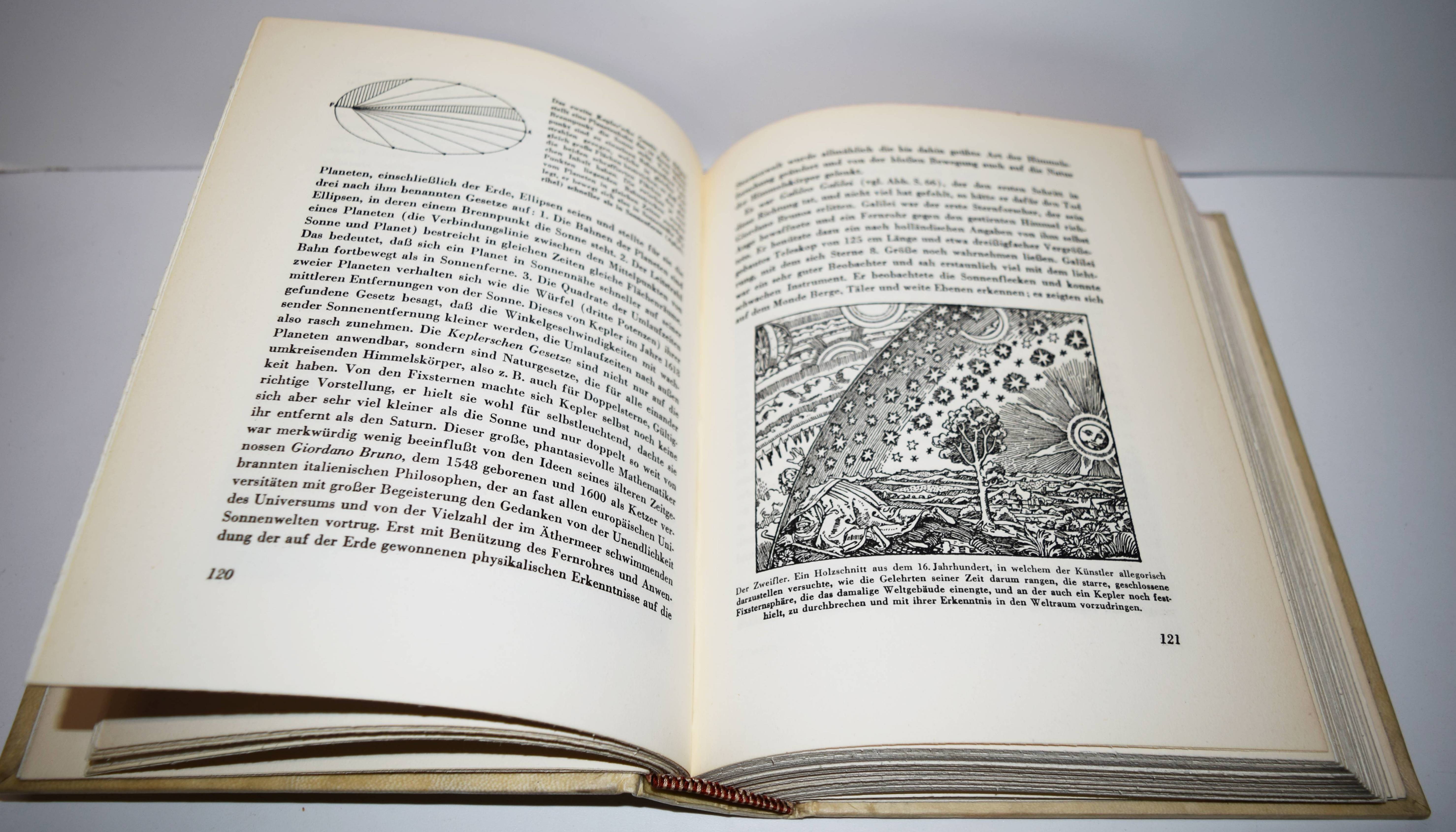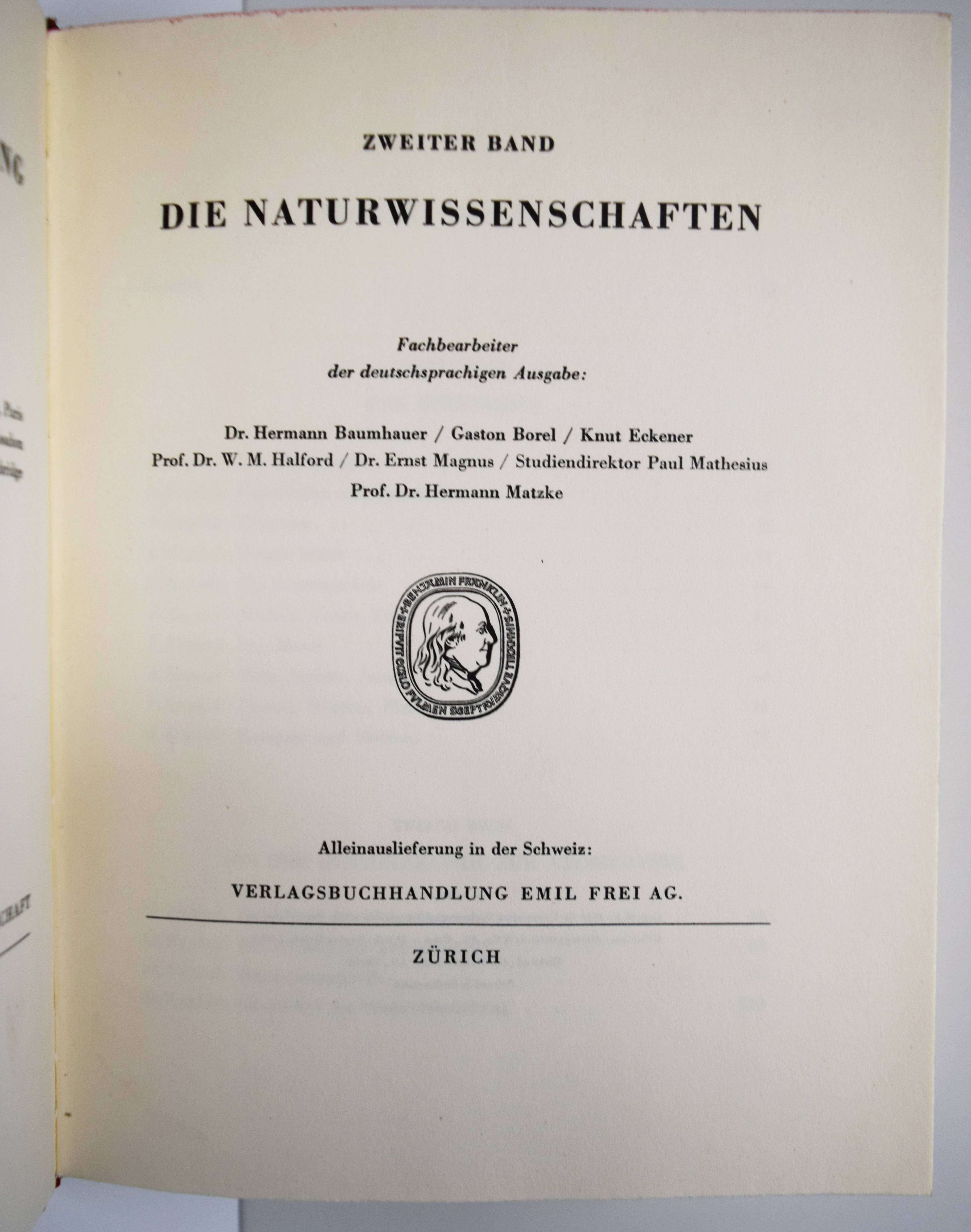 Bradish, J. A. v., Hermann Leicht und Otto Springer (Hrsg.). Grundriss der allgemeinen Bildung. Zweiter Band (von 2). Die Naturwissenschaften. Fachbearbeiter der deutschsprachigen Ausgabe: Hermann Baumhauer, Gaston Borel, Knut Eckener u. a. 3. Auflage. 7 Teile in 1 Band. Bern, London, Universitäts Verl.– und Vertriebs-Gesellschaft und Zürich, Emil Frei (1949). Gr.-8° (24,5 x 19 cm.). 528 S. mit zahlr., teils farb. Abbildungen im Text und auf Tafeln. Pergamenteinband der Zeit mit goldgepr. Rückentitel, Linienvergoldung auf dem Rücken und den Deckeln und Kopfgoldschnitt. Inhalt: I. Das Universum. – II. Von der Himmelskunde zur Atomphysik. – III. Wege zur Mathematik. – IV. Das Reich des Organischen. – V. Vom Wesen des Menschen. – VI. Das Wirtschaftsleben und seine Entfaltung. – VII. Die Technik des Maschinenzeitalters. – Außergewöhnliches Exemplar in einem kostbaren Hand-Einband.