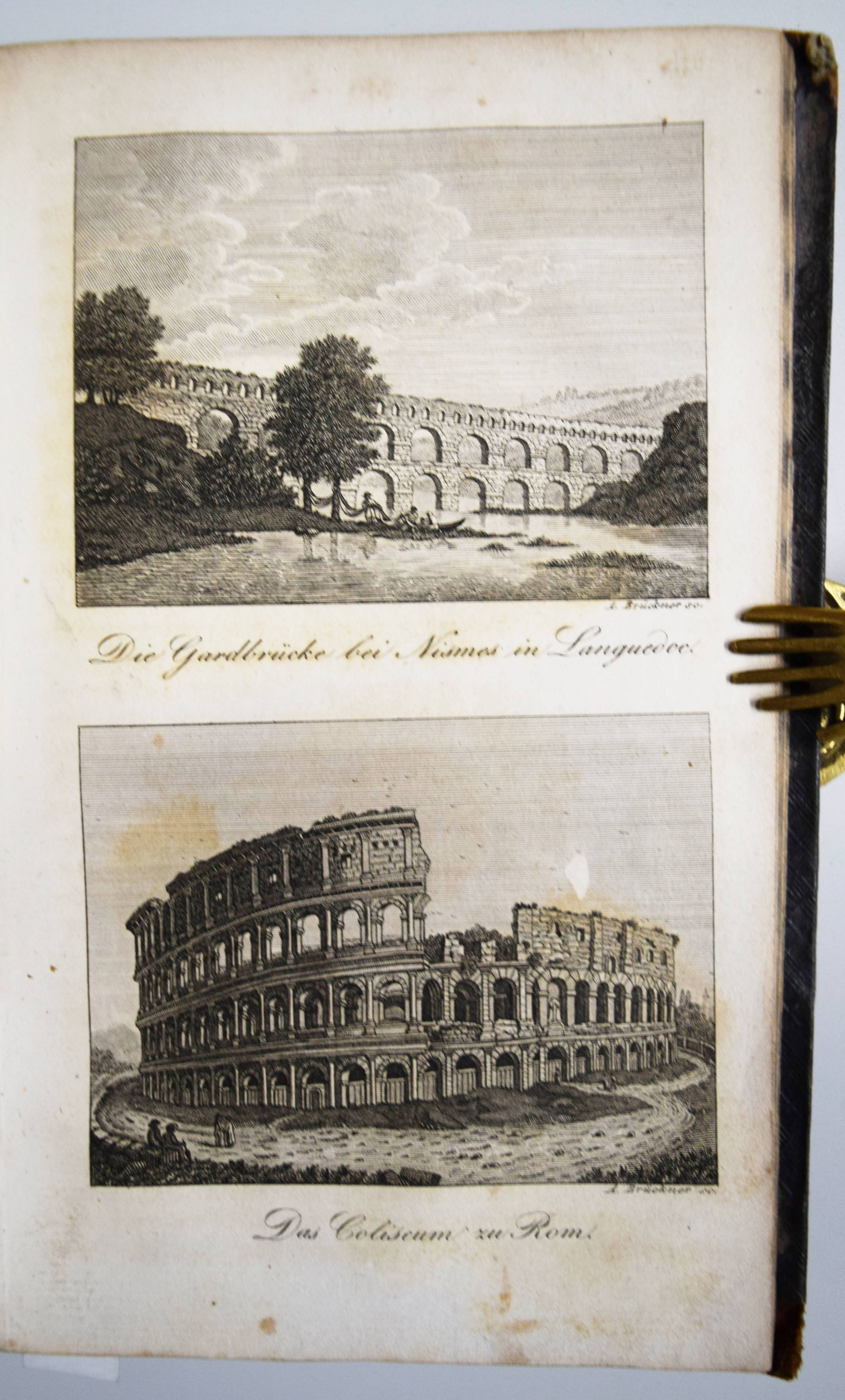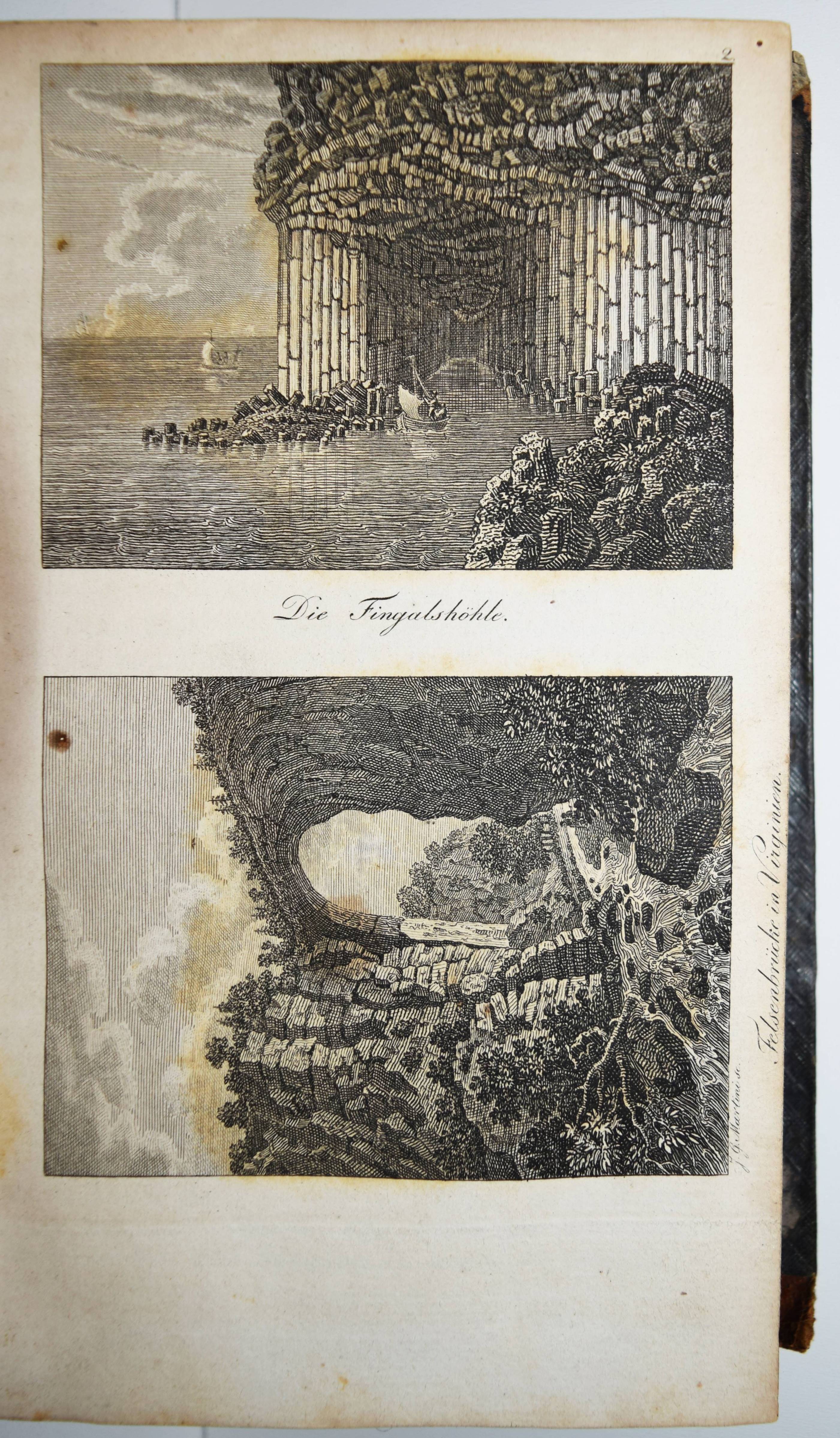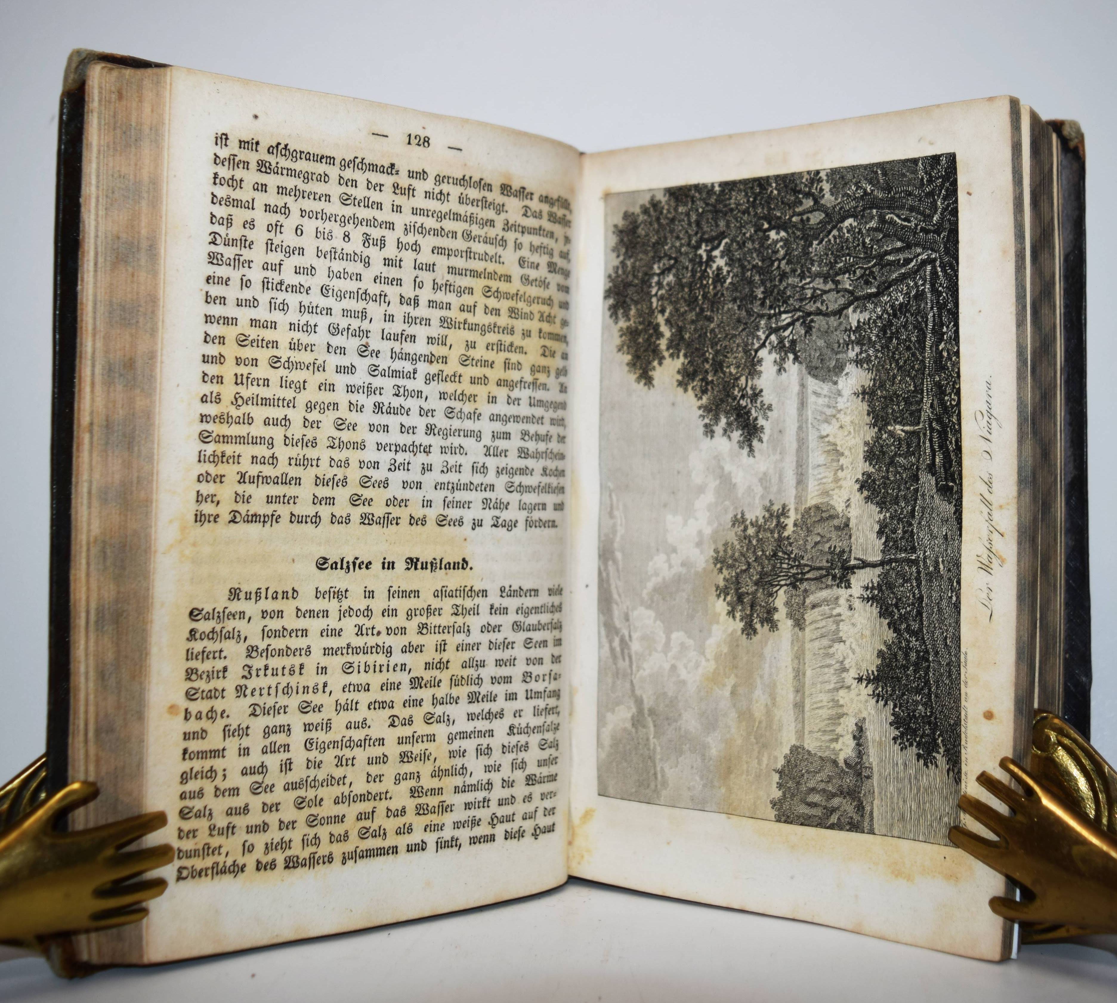 Clarke, C(harles) C(owden). Die hundert Wunder der Welt und der drei Naturreiche. Nach den besten und neuesten Quellen beschrieben und durch Abbildungen versinntlicht. Nach der achten Auflage der englischen Urschrift übersetzt von Gustav Heinrich Haumann. 4., durch L. v. Alvensleben vermehrte und verbesserte Auflage. Weimar, B. F. Voigt 1840. 8°. XVI, 626 S. mit gestoch. Frontispiz, 9 Abbildungen auf 5 Kupfertafeln und 1 Holzschnitt im Text. Halblederband der Zeit mit Rückenvergoldung. Vgl. Engelmann 45. – Die erste deutsche Ausgabe erschien 1821 mit Holzschnitt-Abbildungen; die dritte Auflage erschien 1831 mit den Kupfertafeln. – Beschreibt Wunder des Tier- und Pflanzenreichs, geographische und geologische Erscheinungen, metereologische Phänomene, besondere Bauwerke, Erfindungen (Automaten, Dampfmaschine, Taucherglocke, Fallschirm, Eisenbahn, Buchdruckerpresse etc.). – Die Kupfertafeln zeigen: „Der Porellanthurm zu Namking“, Vesuv und Aetna, die Niagara-Fälle, Fingalhöhle und Felsenbrücke in Virginien, Gardbrücke bei Nismes und „Coliseum zu Rom“, Leuchtturm und die Peterskirche in Rom. Der Holzschnitt zeigt eine Dampfmaschine. – Rücken berieben, Rückenvergoldung oxidiert, freie Vorsätze fehlen, durchgehend etwas braunfleckig, die ersten Blätter stärker, insgesamt gut erhalten.