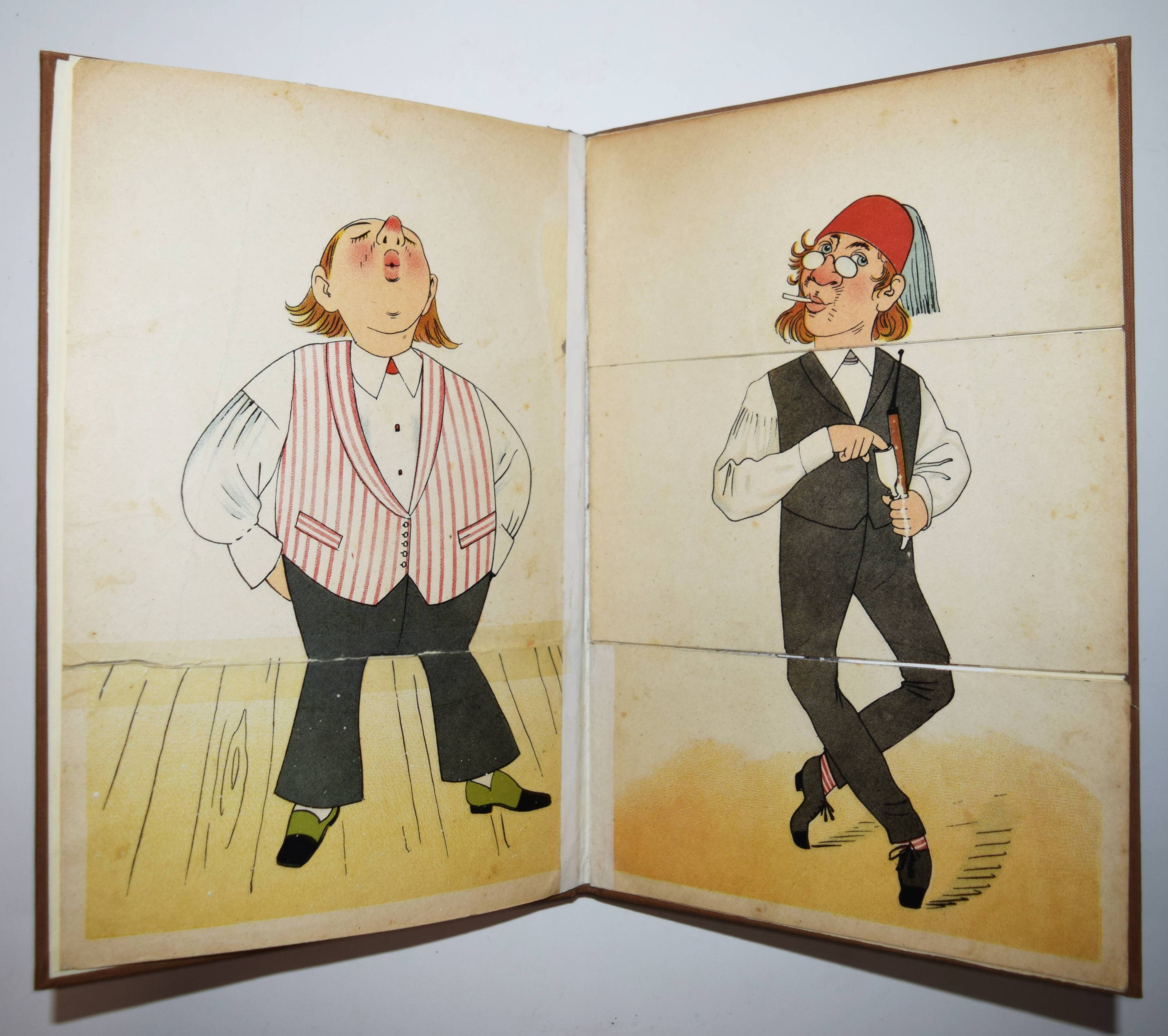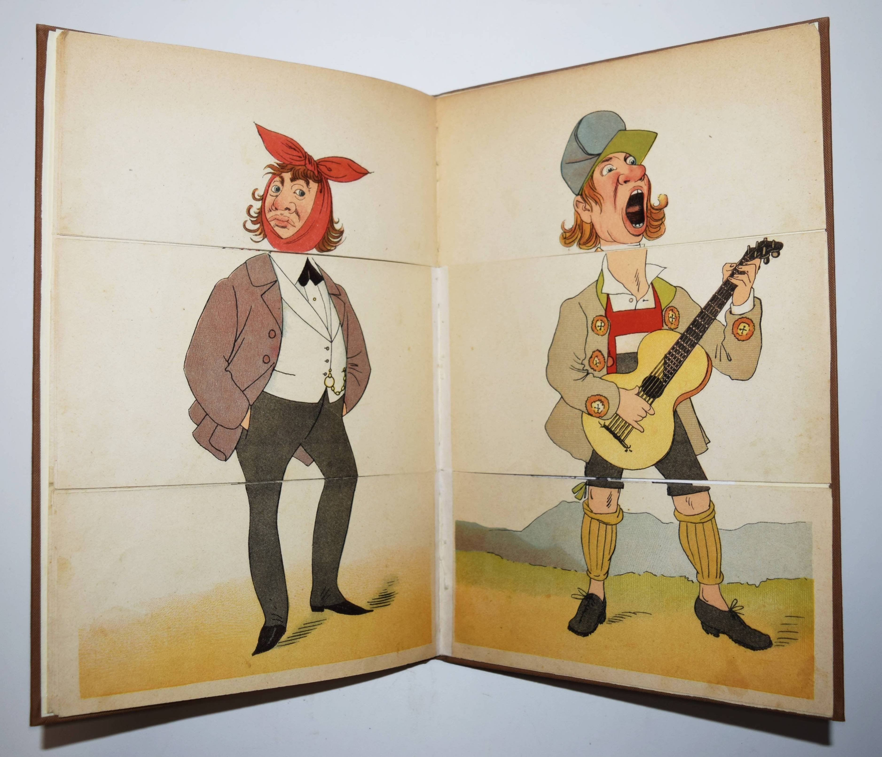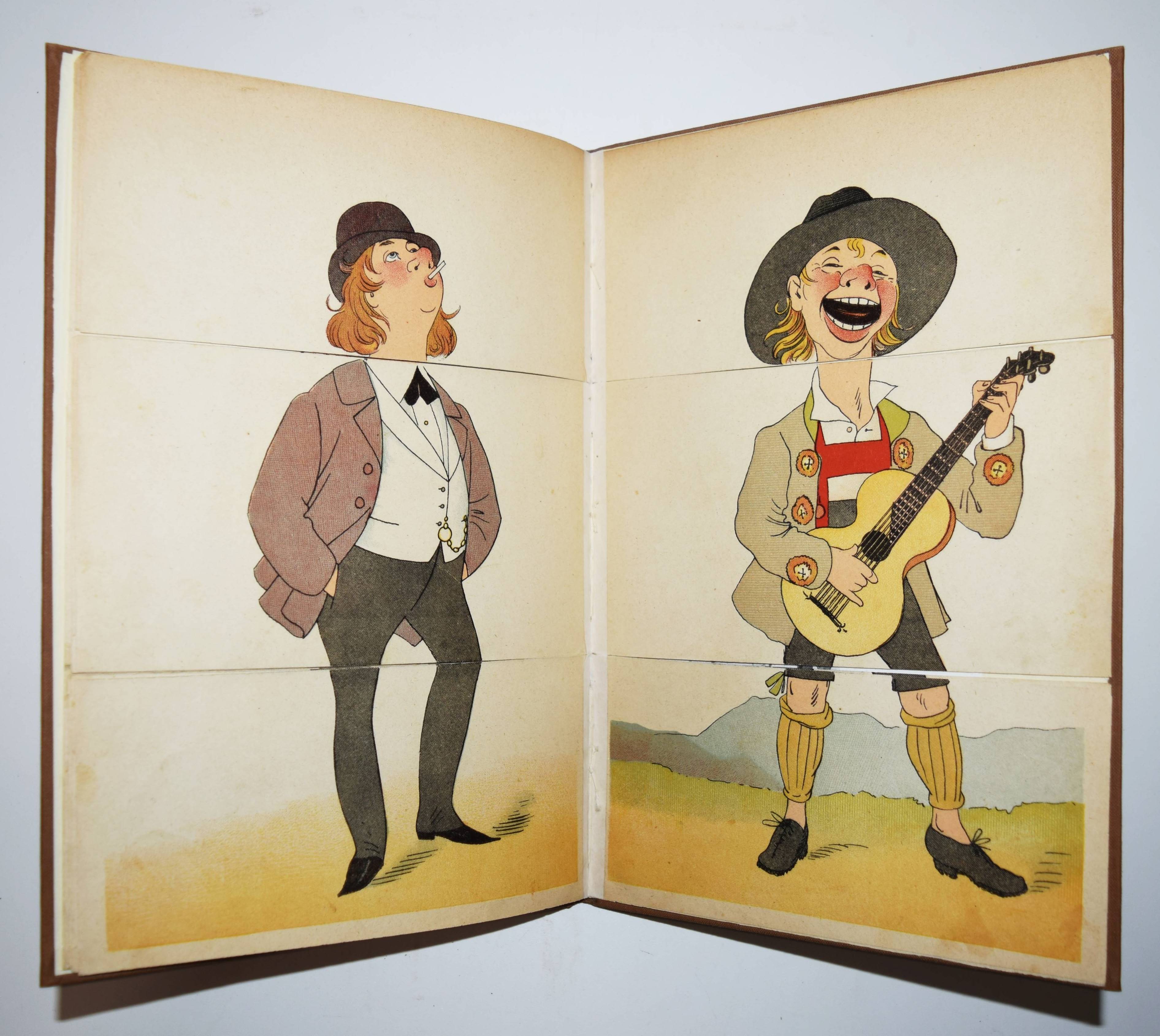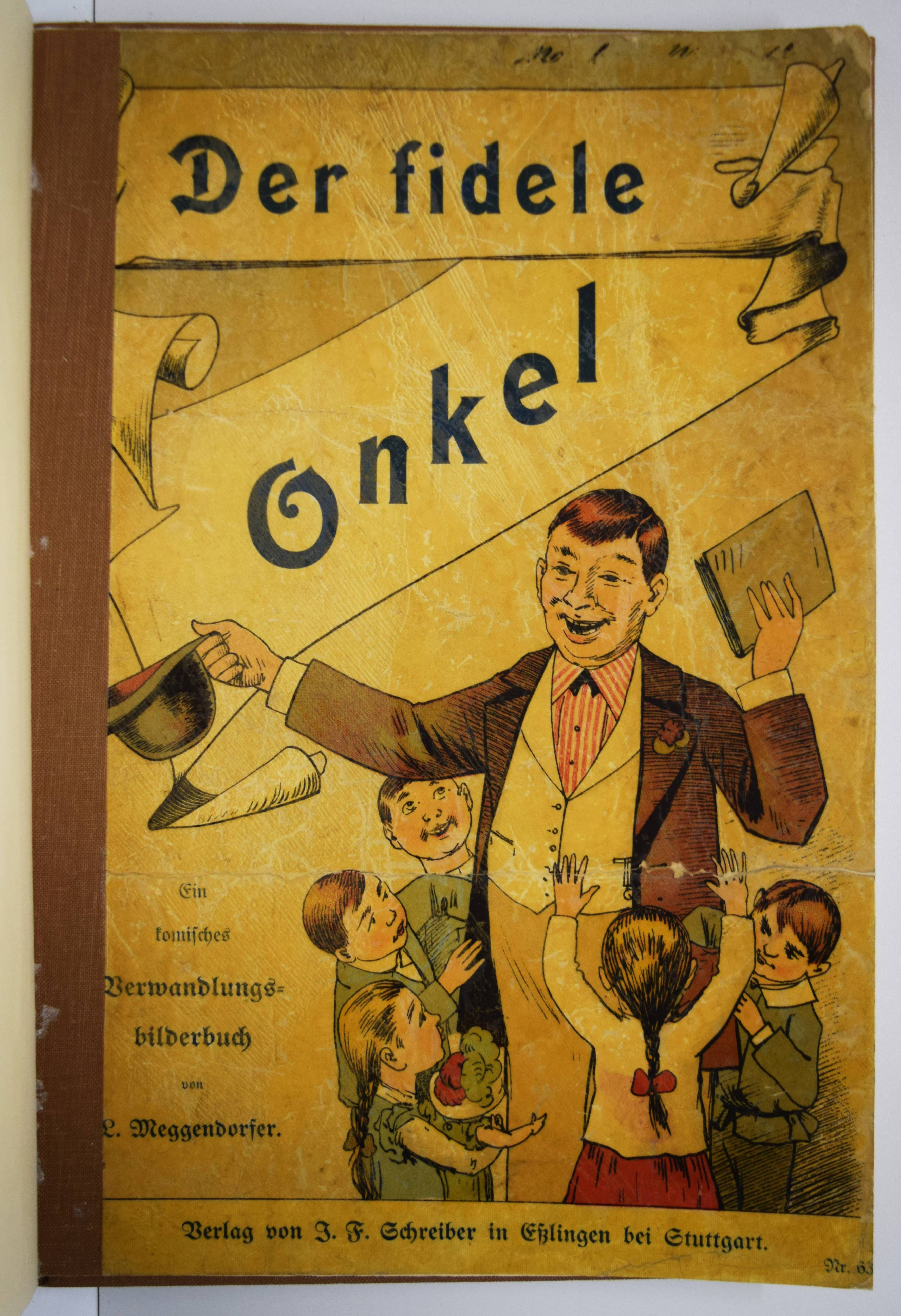 Meggendorfer, Lothar. Der fidele Onkel. Ein komisches Verwandlungsbilderbuch. Esslingen, J. F. Schreiber o. J. (1891). 4° (28 x 19 cm.). 14 chromolithographierte Tafeln (inkl. vorderem Umschlagdeckel), davon 12 (6 Bl.) zweifach waagerecht durchgeschnitten. Moderner Leinenband mit fotokopiertem Deckelbild. (Verlags-Nr. 63). Katzenheim S. 90. Krahé 36. LKJ II, 460. Ries 713, 74. Vgl. Slg. Breitschwerdt 116 (spätere Ausgabe). – Erste Ausgabe; bei späteren Ausgaben sind 14 Tafeln zweimal durchgeschnitten. „Nicht abschließend geklärt ist, ob der Titel zunächst in einer Ausgabe mit 12 Bildern erschien, die dann in einer weiteren Ausgabe um zwei Bilder auf 14 Bilder erweitert wurde“ (G. F. v. Katzenheim). Vor 1912 erschien der Titel auch als „Metamorphosenspiel mit 14 Figuren“. – „Mit ihren Tausenden von Kombinationsmöglichkeiten stellen diese Bücher eine unversiegliche Unterhaltungsquelle dar. Meggendorfer huldigte dem Typus mehrfach, nachdem er ihm, wie bei Krahé Seite 104 ausgeführt, in dem 1889 bei Stroefer verlegten, von ihm mit einer Umschlagzeichnung ausgestatteten Titel ,Kochs drolliges-Bilderbuch’ zum ersten Mal begegnet war“ (Hans Ries S. 55/3). – Einband und Vorsätze fachgerecht erneuert, der beigebundene Vorderdeckel mit Japanpapier kaschiert und restauriertem waagerechten Durchriss im unteren Drittel, im Blattrand teils etwas fingerfleckig, sonst gut erhalten.