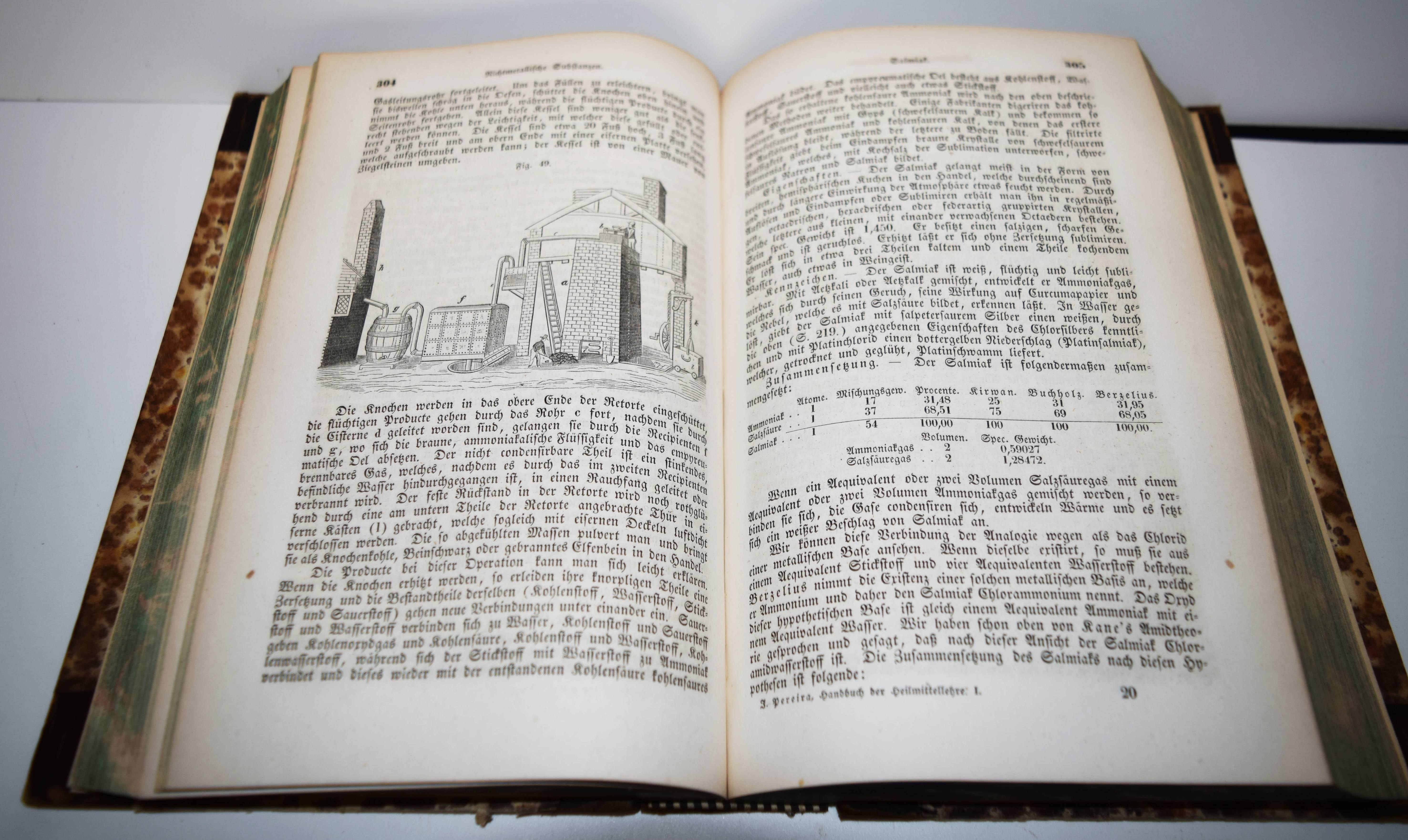 Pereira, Jonathan. Handbuch der Heilmittellehre. Nach dem Standpunkte der deutschen Medicin bearbeitet von Rudolf Buchheim. 2 Bände. Leipzig, Leopold Voß 1846-1848. Gr.-8° (23,5 x 14,5 cm.). XLVIII, 844 S.; XXII, 929, (1) S. Halblederbände der Zeit mit Romantikervergoldung. Hirsch-Hübotter I, 747 und IV, 555. Schelenz 677. – Erste deutsche Ausgabe (bearbeitete nach der 2. Englischen der „Elements of Materia Medica“, London 1842-43). – Rücken berieben, Gelenke spröde, sonst gut erhalten.