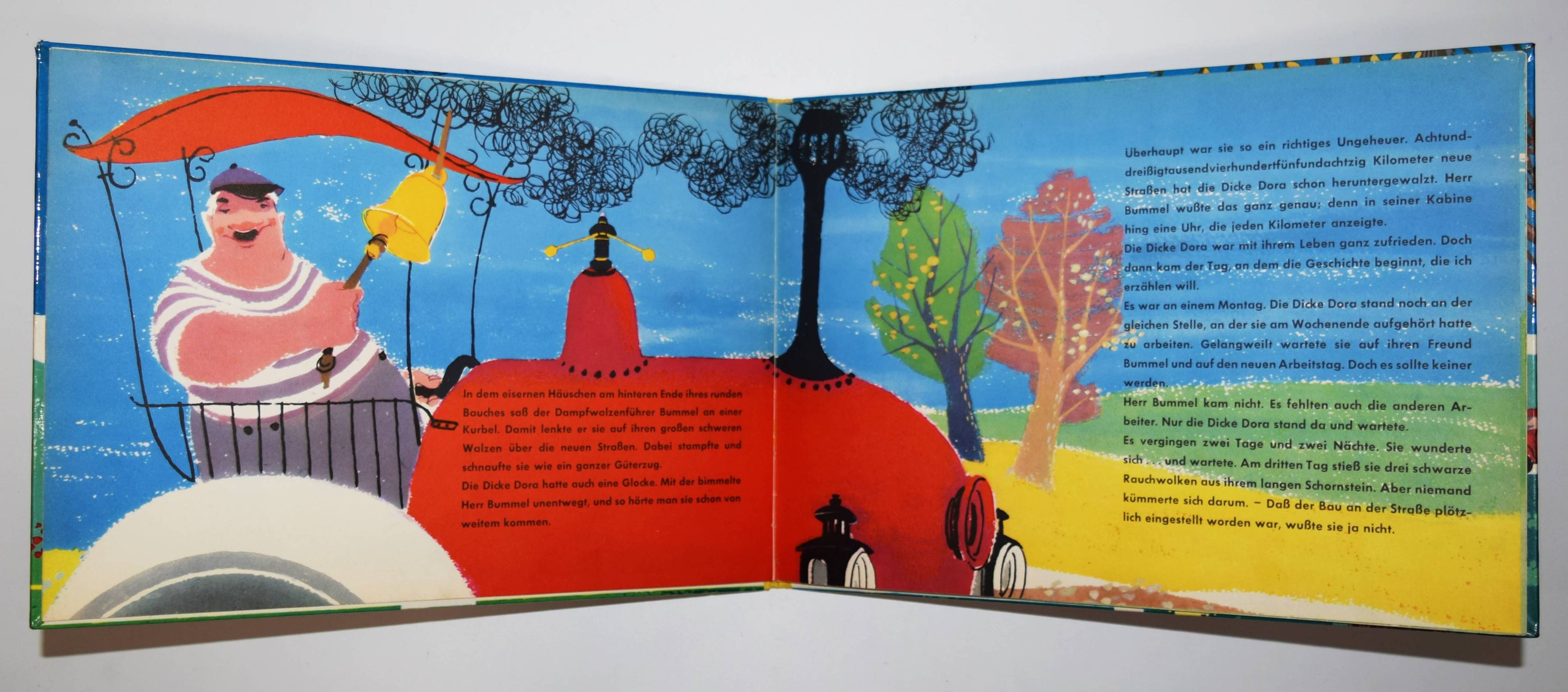 Hölle, Erich. Die dicke Dora. Die Abenteuer einer roten Dampfwalze erzählt und gezeichnet. München, Obpacher Buch- und Kunstverlag (1959). Quer-4° (23,5 x 33 cm.). [18] Bl. mit farbigen Illustrationen. Farbig illustr. Orig.-Halbleinenband. Doderer/Müller 996. LKJ IV, 287 f. – Erste Ausgabe des zweiten Bilderbuchs von E. Holle, der durch seine Illustrationen zu Max Kruses „Urmel aus dem Eis“ (1969) bekannt wurde. – Sehr gutes sauberes Exemplar.