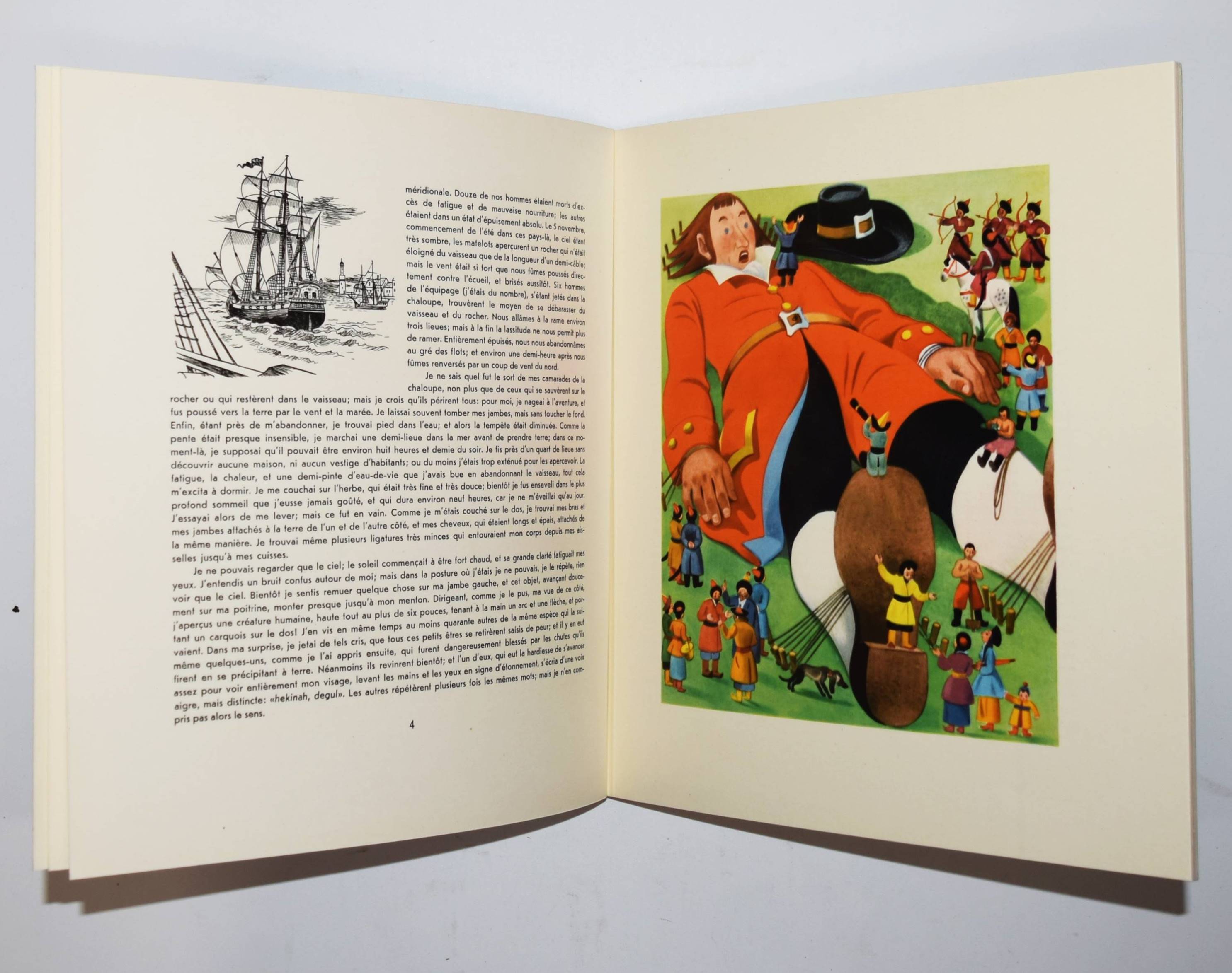 Swift, Jonathan. Voyage de Gulliver à Lilliput. Illustrations de Marcel Vidoudez. Lausanne, Èditions Novos (1945). 4° (26,5 x 25,5 cm.). 28 S. mit 4 Farbtafeln und Illustrationen im Text. Farbig illustr. Orig.-Halbleinenband. SBI 1034 und S. 80. – Erste französische Ausgabe; erschien gleichzeitig mit der deutschen Ausgabe. – Marcel Vidoudez (1900-1968) studierte an der Kunstgewerbeschule in Bern (1916-1918) und an der Ecole des Beaux-Arts in Lausanne und Paris (1920-1924). Er hat zahlreiche Bücher illustriert und auch als Gebrauchsgraphiker gearbeitet. – Sehr gutes sauberes Exemplar.