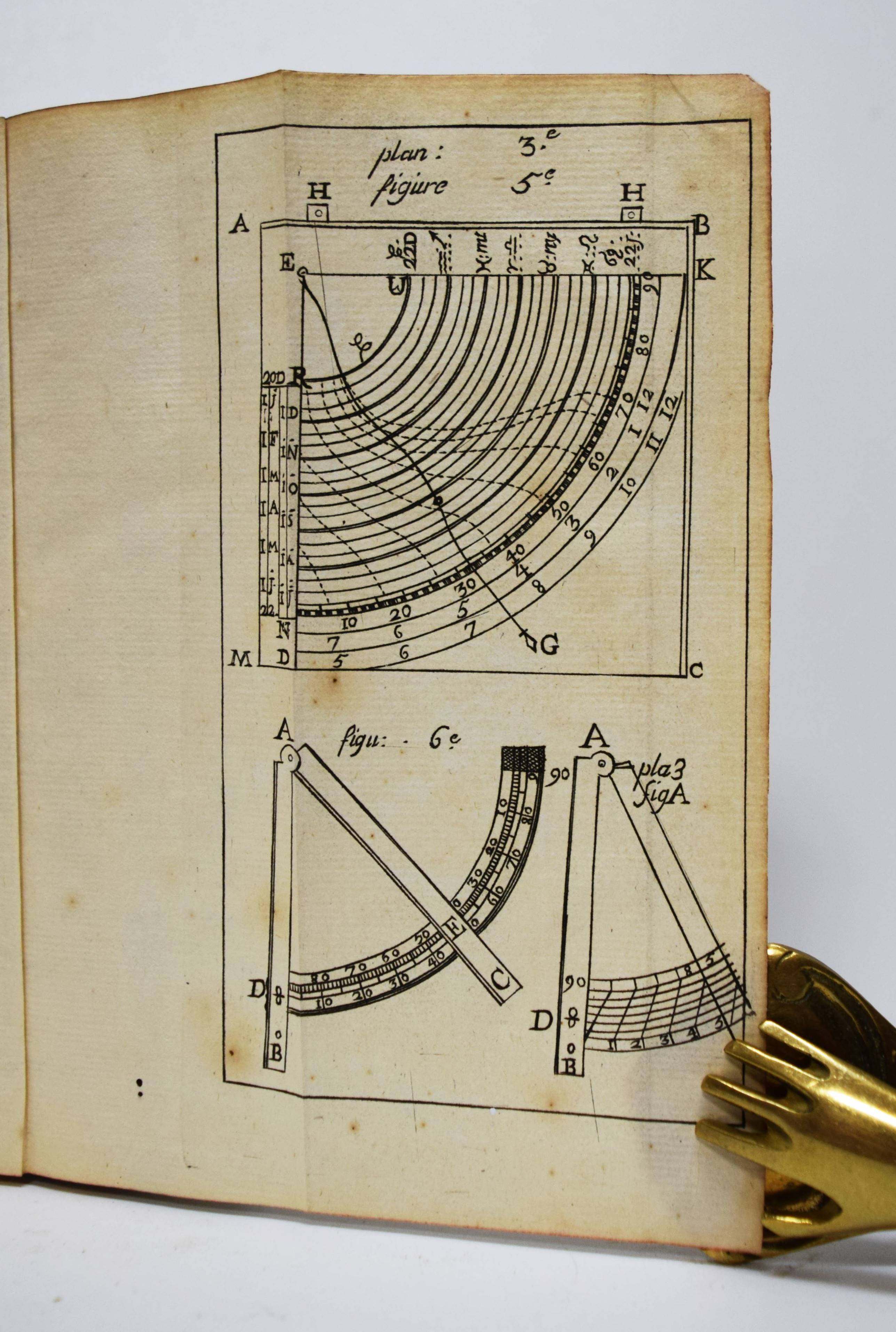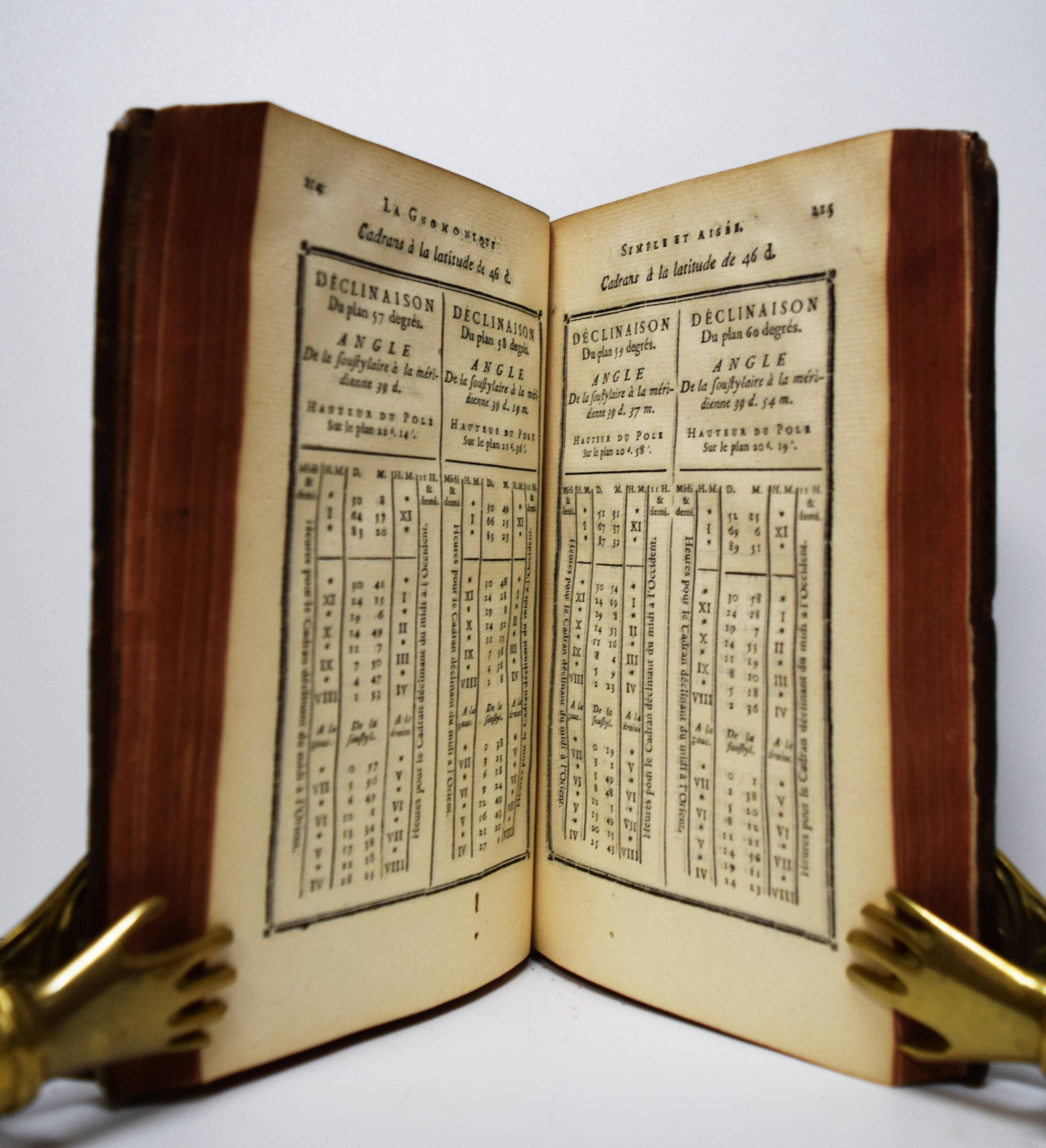 Garnier, Joseph-Blaise. Gnomonique mise à la portée de tout le monde, ou méthode simple et aisée pour tracer des cadrans solaires. Dans laquelle on trouvera des tables calculées depuis un degré de déclinaison tant orientale qu’occidentale jusqu’au 90 degré … Avec une table alphabétique des principales villes, & la fugure & l’explication des instrumens nécessaires pour l’opération. Marseille, Jean Mossy 1773. 8°. X, [1] Bl., 460 S. mit zahlr. Tabellen und 9 Abbildungen auf 5 gefalt. Kupfertafeln. Kalbslederband der Zeit mit goldgepr. Rückenschild und floraler Rückenvergoldung. Houzeau-Lancaster I, 11670. Lalande 535. Quérard III, 264. – Seltener erster Druck der ersten Ausgabe; der zweite Druck erschien bei Vincent in Paris. – Nach 37 Seiten Text folgen die Tabellen und die fünf Kupfertafeln. – Einband teils stärker bestoßen, sonst gut erhalten.