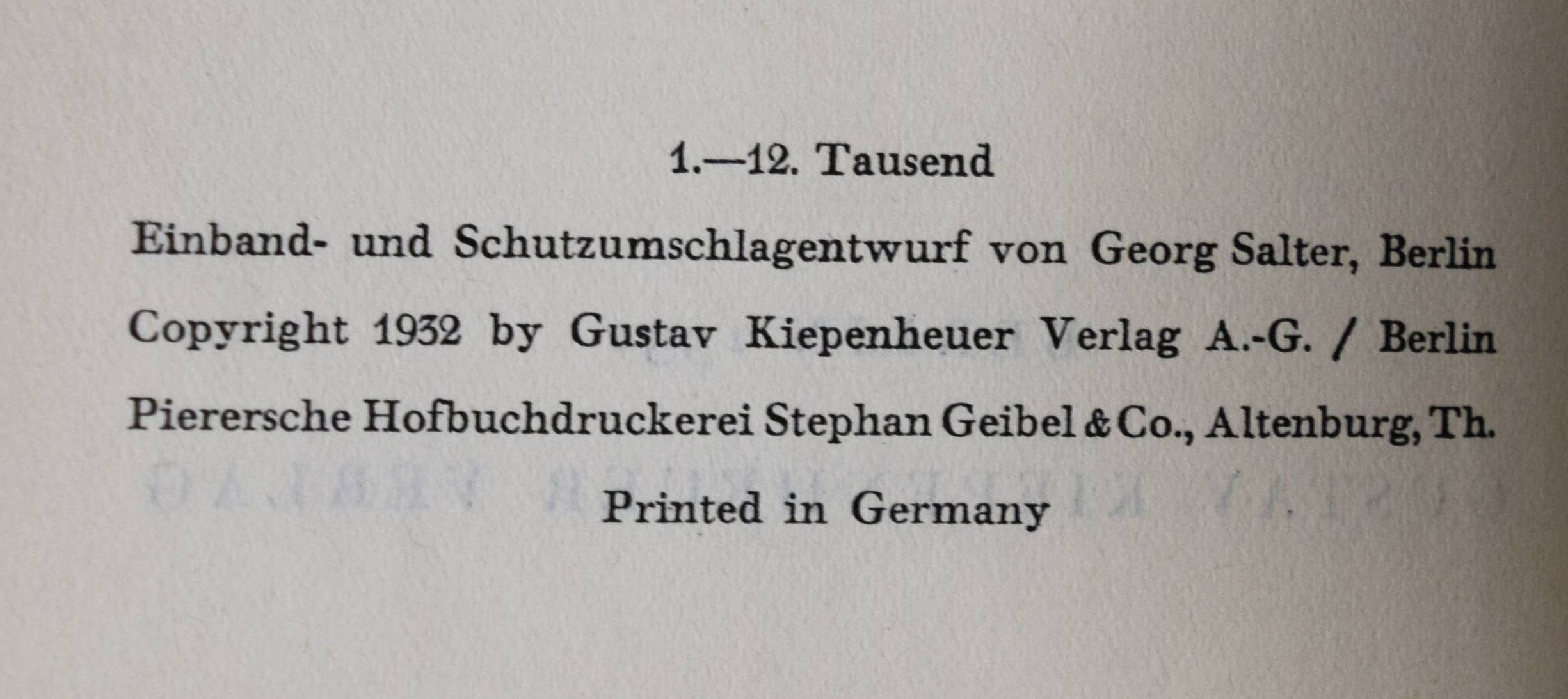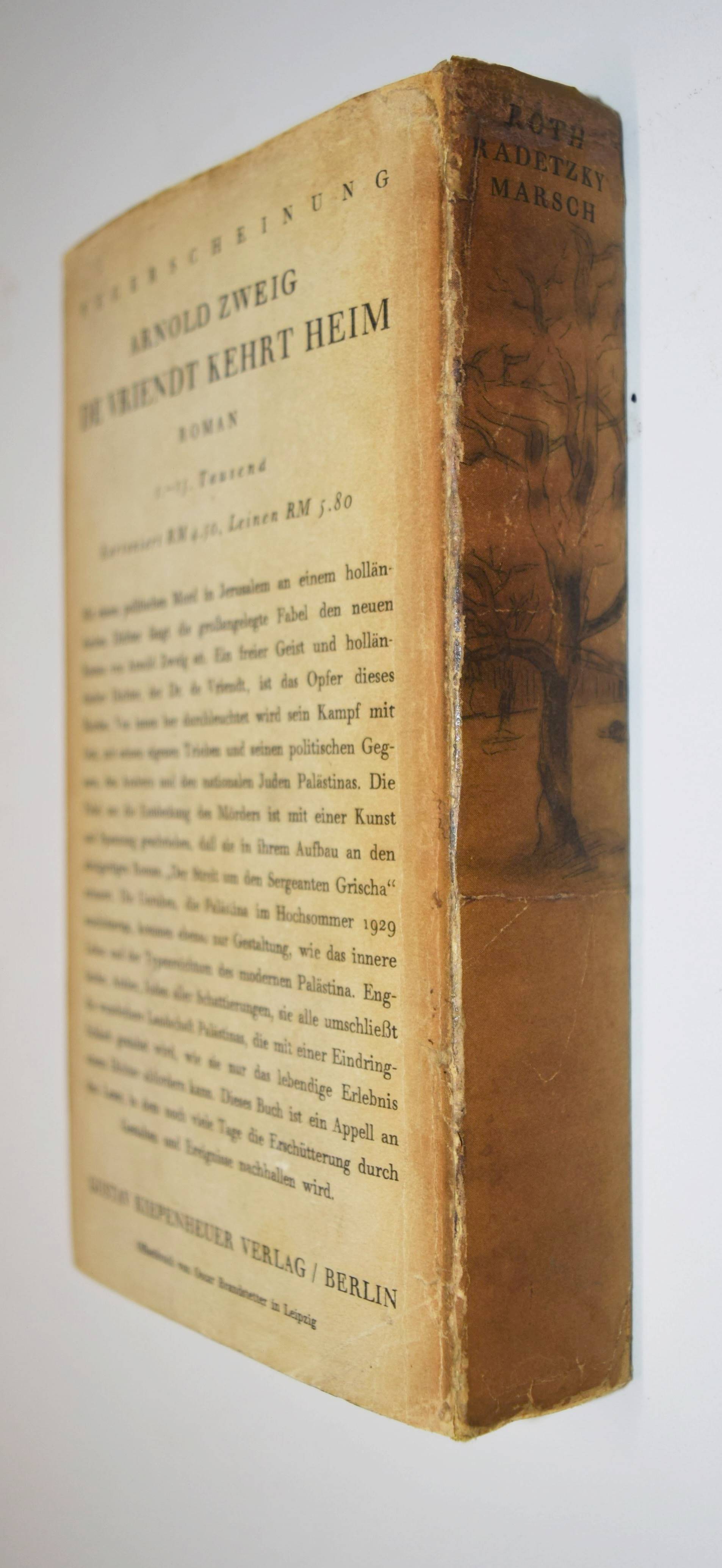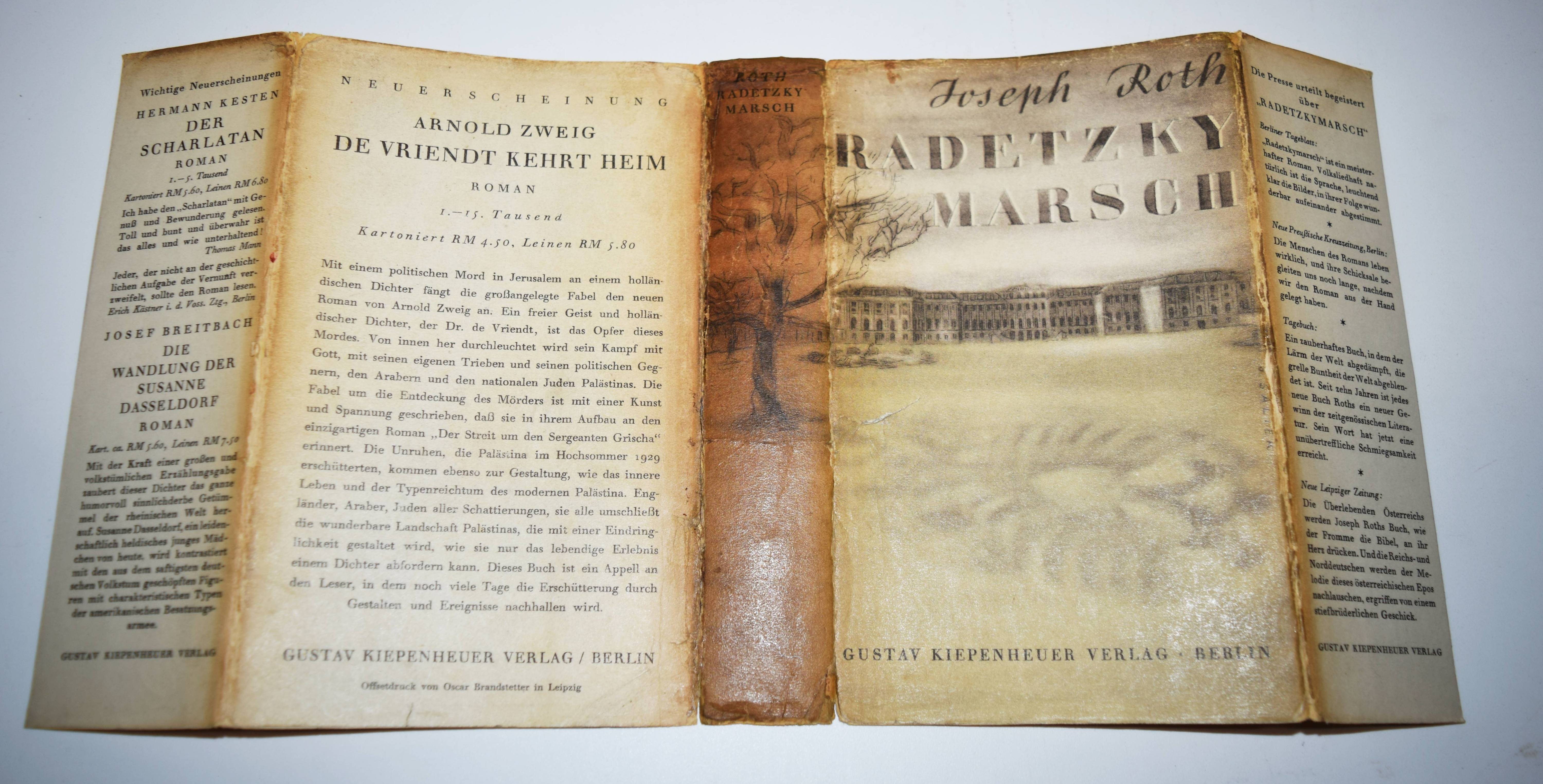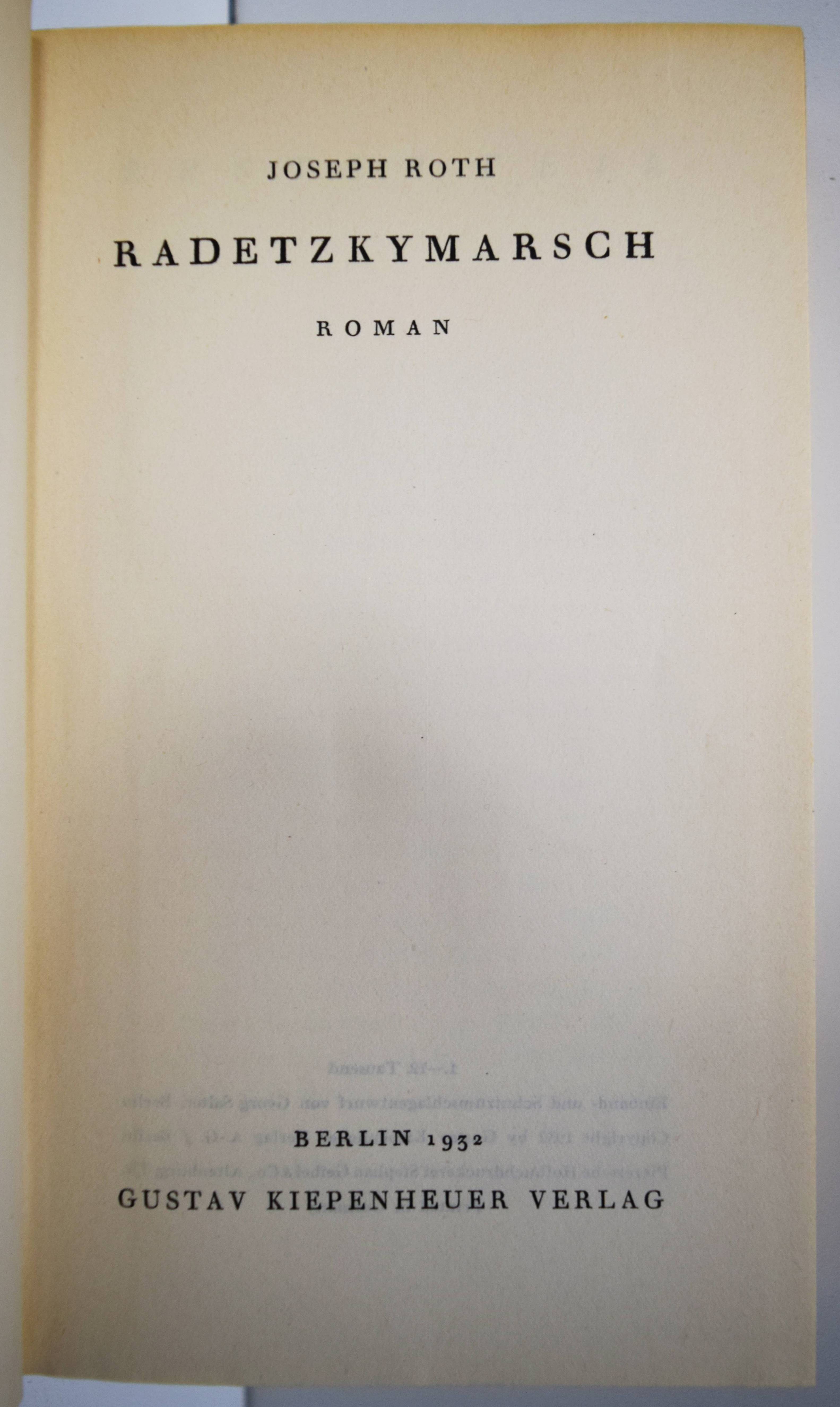 Roth, Joseph. Radetzkymarsch. Roman. Berlin, Gustav Kiepenheuer August oder September 1932. 8°. 582 S., [1] Bl. Orig.-Leinenband mit illustr. Schutzumschlag (Entwurf: Georg Salter). Holstein, Blickfang 14. Roth-Katalog 609. Sternfeld-Tiedemann 426. W.-G.² 11. – Seltene erste Ausgabe von J. Roth bekanntestem Roman, in dem er am Beispiel des Schicksals von vier Generationen einer Familie den allmählichen Zerfall des Habsburgerreiches darstellt. – Kritiker Marcel Reich-Ranicki zählt das Buch zu den zwanzig wichtigsten Romanen in deutscher Sprache. – „Zur Entstehung des Romans teilt der Verleger Wolf Jobst Siedler mit: „In den letzten Monaten vor der Machtergreifung der Nationalsozialisten [Januar 1933] hatte Joseph Roth monatelang [in Berlin] an einem bestimmten Tisch in Mampes Guter Stube gesessen, hier hatte er grosse Teile seines Radetzkymarschs geschrieben, und seine Trauer über den Untergang Habsburgs und des uralten Kaisers war wohl die Trauer über den Untergang des alten Europa.“ Tatsächlich geschrieben hat Roth diesen Roman, wie sich aus seinen Briefen rekonstruieren lässt, ab Herbst 1930 bei Freunden (u. a. Stefan Zweig) und in Hotels in Frankfurt a. M., Berlin, Paris, Baden-Baden und im französischen Antibes. Die Arbeit konnte im Sommer 1932 abgeschlossen werden. Die ersten Exemplare der Buchausgabe erschienen Ende August/Anfang September 1932 in Berlin“ (Wikipedia). – „The best political novel ever written“ (Mario Vargas Llosa). – „Joseph Roths Radetzkymarsch ist natürlich nicht einfach nur mein Lieblingsbuch. Es ist das schönste Buch der Welt. Das traurigste. Sentimentalste. Wundersamste. Es ist ein Wunder“ (Volker Weidermann: Mein Lieblingsbuch: „Radetzkymarsch“. In: FAZ. 12. Juli 2004, S. 31). – Der Schutzumschlag stammt wohl vom zweiten Druck der Erstausgabe (15.-20. Tsd.) und wurde erst später hinzugefügt (Einband am Rücken gebräunt, kein Text auf dem Vorderdeckel, außerdem mit der erst im Oktober erschienenen „Neuerscheinung“ von H. Kestens „Der Scharlatan“ auf der hinteren Klappe). – Schutzumschlag am Kapital unauffällig restauriert und am Rücken stärker gebräunt, sehr gutes Exemplar.