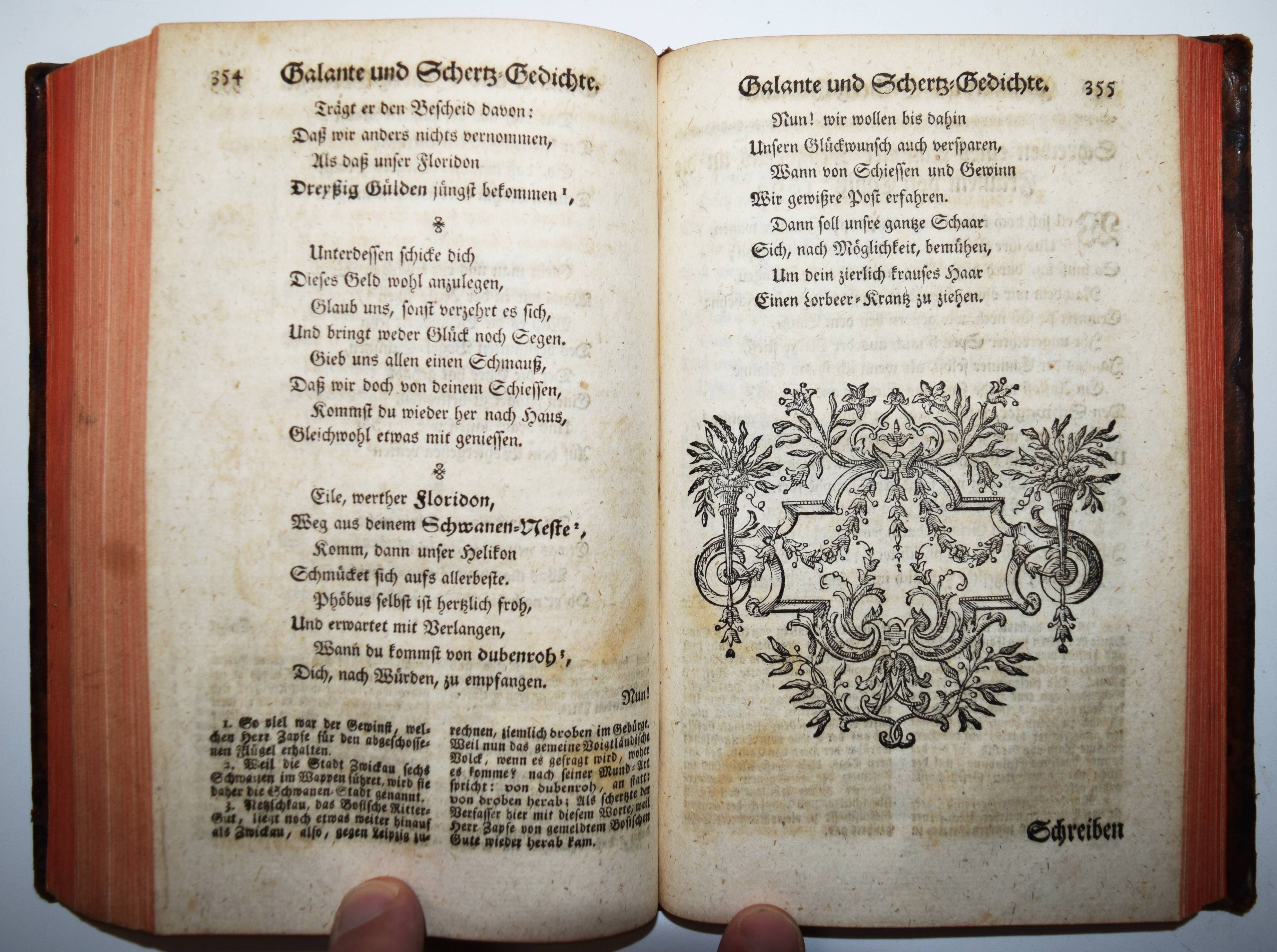 Canitz, (Friedrich Rudolf Ludwig) Freiherr v. Gedichte. Mehrentheils aus seinen eigenhändigen Schrifften verbessert und vermehret. Mit Kupfern und Anmerckungen. Nebst dessen Leben, und einer Untersuchung von dem guten Geschmack in der Dicht- und Rede-Kunst ausgefertiget von Johann Ulrich König. Dritte Auflage. Berlin und Leipzig, A. Haude und J. C. Spener 1750. 8°. LXXX (recte LXXVIII), 476 (recte 472) S., [3] Bl. (Register) mit gestoch. Frontispiz, 2 Portrait-Kupfertafeln und 1 halbs. Kupferstich am Anfang. Lederband der Zeit mit Rückenvergoldung. Brentano 293. Dünnhaupt II, 974, 6.5. Faber du Faur 1693. Goedeke III, 346, 2n. Jantz I, 726. Vgl. Seebaß/Edelmann I, 191 ff. u. III, 185 f. VD18 12715018. – Dritte Auflage der vom Dresdener Hofpoeten König (1688-1744) besorgten ersten Gesamtausgabe seiner Lyrik; der Erstdruck erschien ebenda 1727. Mit dessen berühmter Abhandlung über den guten Geschmack. „Die bedeutendste Stellungnahme zu den grundlegenden Fragen der Dichtkunst von Bodmer und Breitinger“ (Katalog Neufforge, S. 542). Enthält auf den Seiten 221 f. Canitz’ „Lob des Tobacks“ sowie auf den Seiten 300 f. das Loblied „Der Taback“ (zweisprachig) aus dem Französischen von Lombard. Canitz war bekanntlich leidenschaftlicher Raucher. – „Für die modische Beliebtheit der Canitzschen Poesie zeugen die 15 während eines halben Jahrhunderts erschienenen Auflagen“ (A. Seebaß). – Rücken berieben, Rückkenschild fehlt, vorderes Gelenk am Kapital etwas eingerissen, Stempel auf dem Titelblatt, stellenweise leicht braunfleckig und etwas gebräunt, sonst gut erhalten.