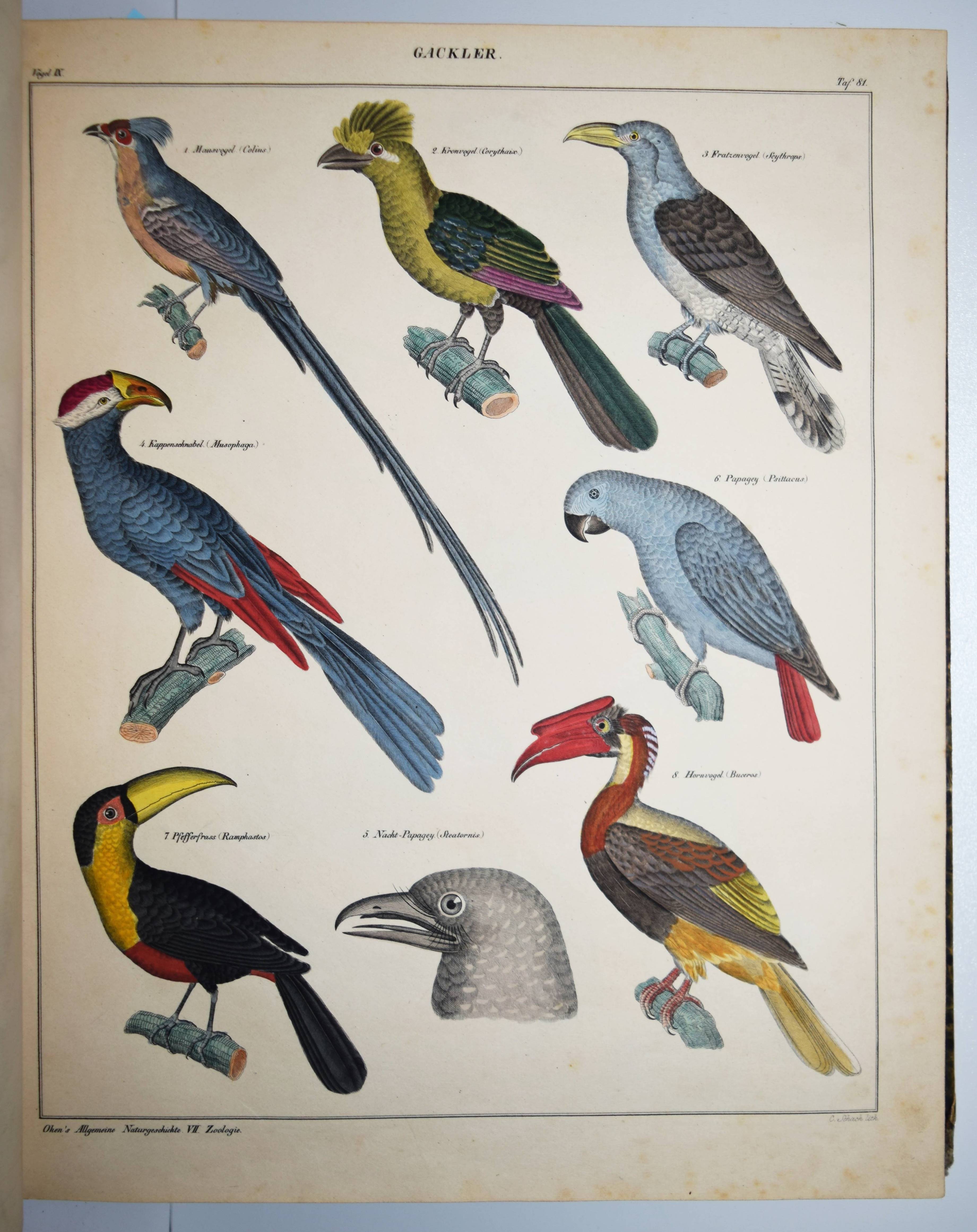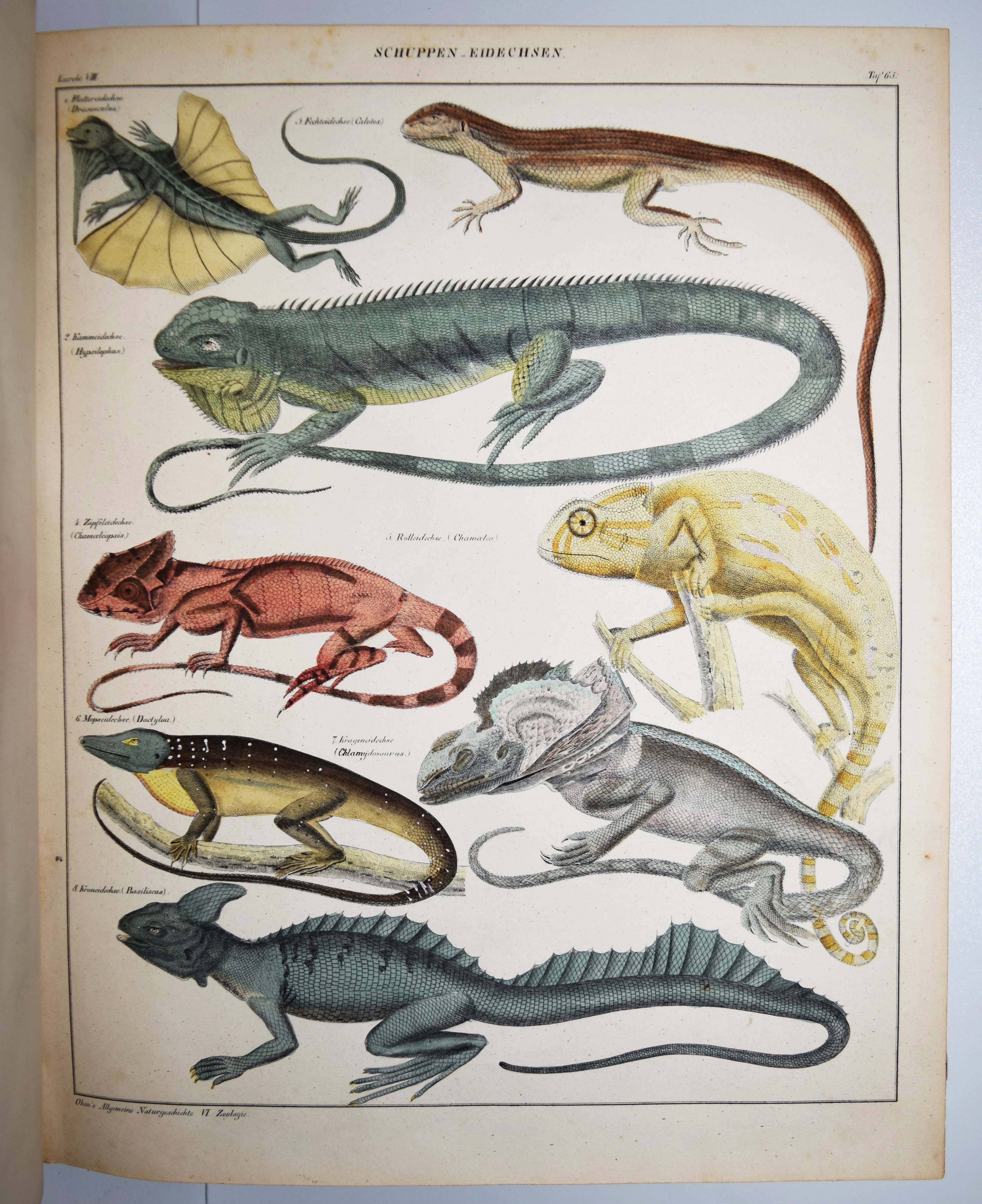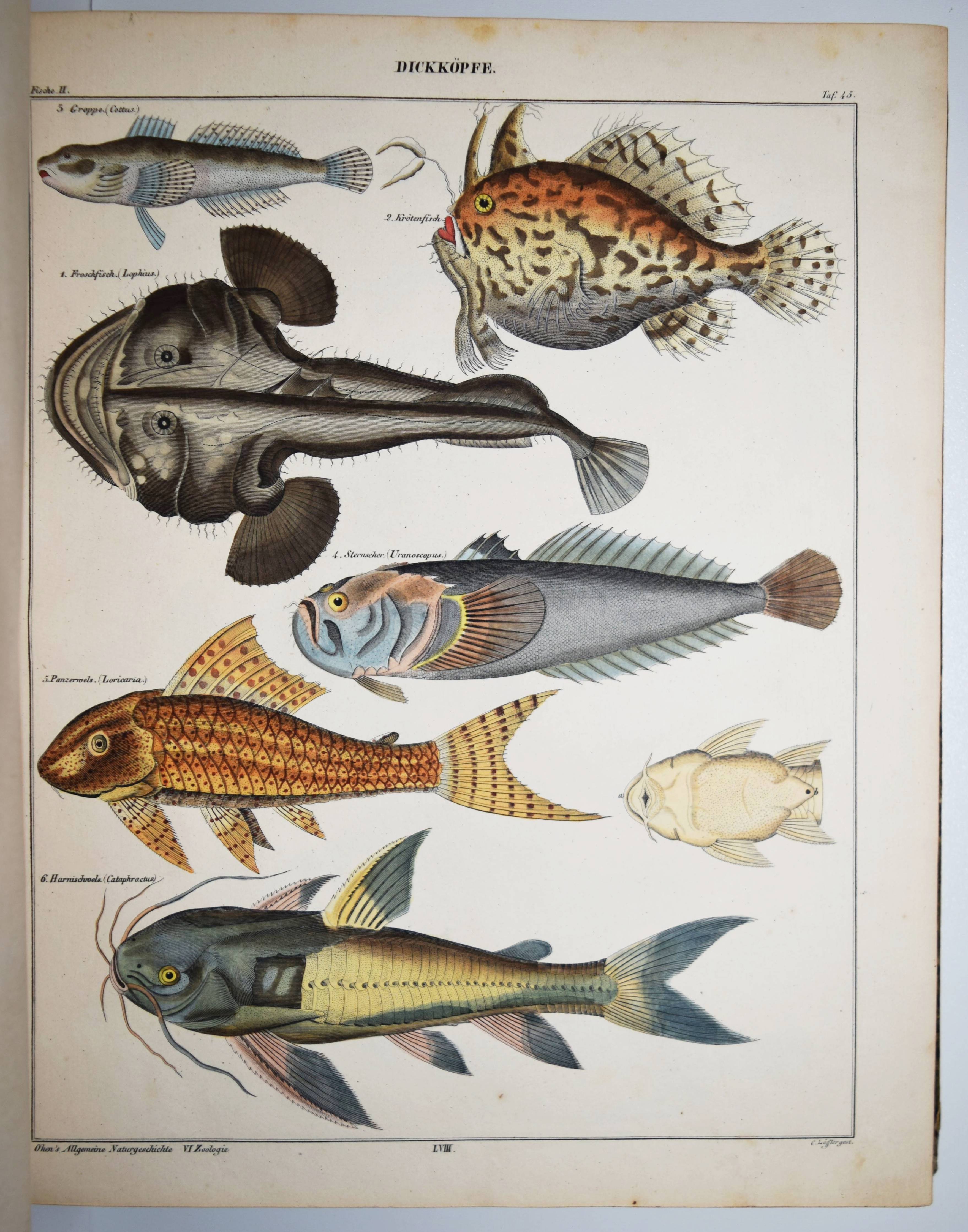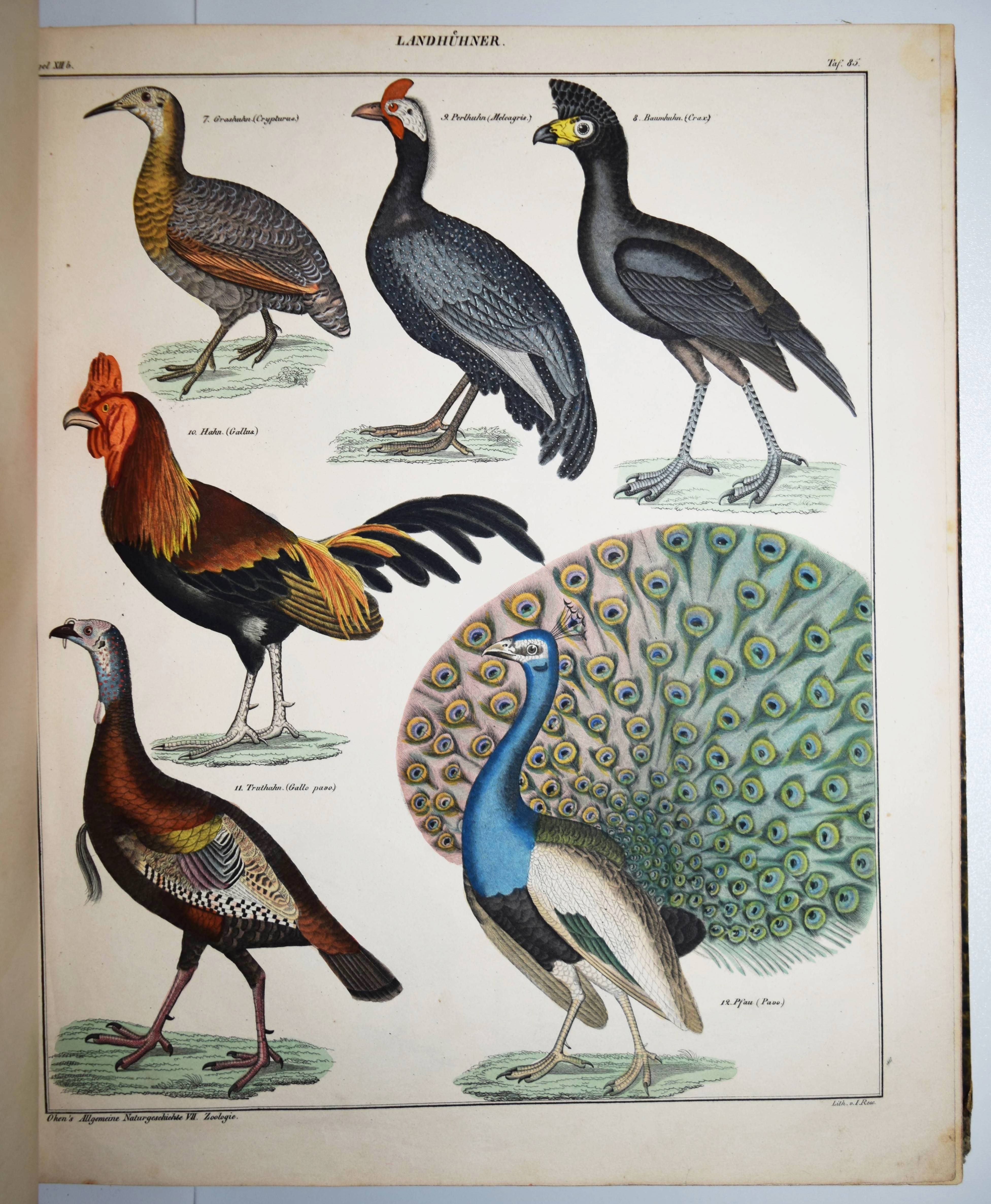 Oken, (Lorenz). Allgemeine Naturgeschichte für alle Stände. 7 Textbände in 14 (inkl. Registerband) und Tafelband (zus. 15 Bände). Stuttgart, Hoffmann 1838-1843. 8° (21 x 14 cm.) und Folio (35 x 29 cm.). Mit lithogr. illustr. Titel und 164 (132 handkolorierte) lithogr. Tafeln. Halblederbände der Zeit mit zweifarbigen goldgepr. Rückenschildern und Rückenvergoldung. ADB XXIV, 216 ff. Anker 375. Graesse V, 16. Horn-Schenkling 16535. Nissen, ZBI 3006. – Erste Ausgabe. – I. Mineralogie und Geognosie bearbeitet von F. A. Walchner. – II. und III., 1-3. Botanik. – IV. bis VII. Thierreich. – Registerband. – Tafelband mit Tafeln zur Mineralogie, Botanik, Anatomie und Zoologie, mit schönen Abbildungen von Fischen, Schmetterlingen, Vögeln u. a., deren Darstellung geht auf vergleichbare Sachbücher zurückgeht und die noch in der Tradition von Sammlerkabinetten steht. – „Seine große Naturgeschichte ist wohl das letzte Werk, in welchem ein und derselbe Verfasser die ganze Naturgeschichte erschöpfend behandelt. Sie ist eine weitere große Leistung Oken’s; denn wenn man auch zweifelhaft sein kann, ob das darin enthaltene Naturphilosophische anregend und befruchtend gewirkt hat, so ist doch der specielle Theil so reichhaltig und dabei so klar und faßlich behandelt, daß das vielverbreitete Werk oft und gern zu Rathe gezogen, „viel mehr benutzt als citirt wurde“. Von der Naturgeschichte des Mineralreichs stammt nur die allgemeine Einleitung aus Oken’s Feder. O. hatte schon 1809 eine eigene Classification der Mineralien aufgestellt, von der wenigstens die obersten Eintheilungen vielfach angenommen wurden. Die Botanik und Zoologie ist ganz Oken’s eigene Arbeit. Bei beiden geht dem speciellen, ausführlichen Theile eine allgemeine Einleitung voraus, welche vergleichende und descriptive Anatomie, Physiologie, Principien der Classification, geographische Verbreitung, Geschichte u. s. w. enthält. In der Einleitung zur Zoologie findet sich eine überaus klar und verständlich geschriebene, populäre Anatomie des Menschen. Als ein wirkliches Verdienst Oken’s gilt es, daß er vornehmlich in der Classification neben Fremdwörtern deutsche Termini nicht nur für Arten und Gattungen, sondern auch für die höheren Abtheilungen einführte“ (A. Lang in ADB). – Einbände etwas berieben und bestoßen, Tafel 57 (Fisch-Anatomie) mit restauriertem Eckabriß (minimaler Bildverlust), stellenweise etwas braunfleckig, sehr gutes dekorativ gebundenes Exemplar, vollständig mit dem Register- und Tafelband selten.