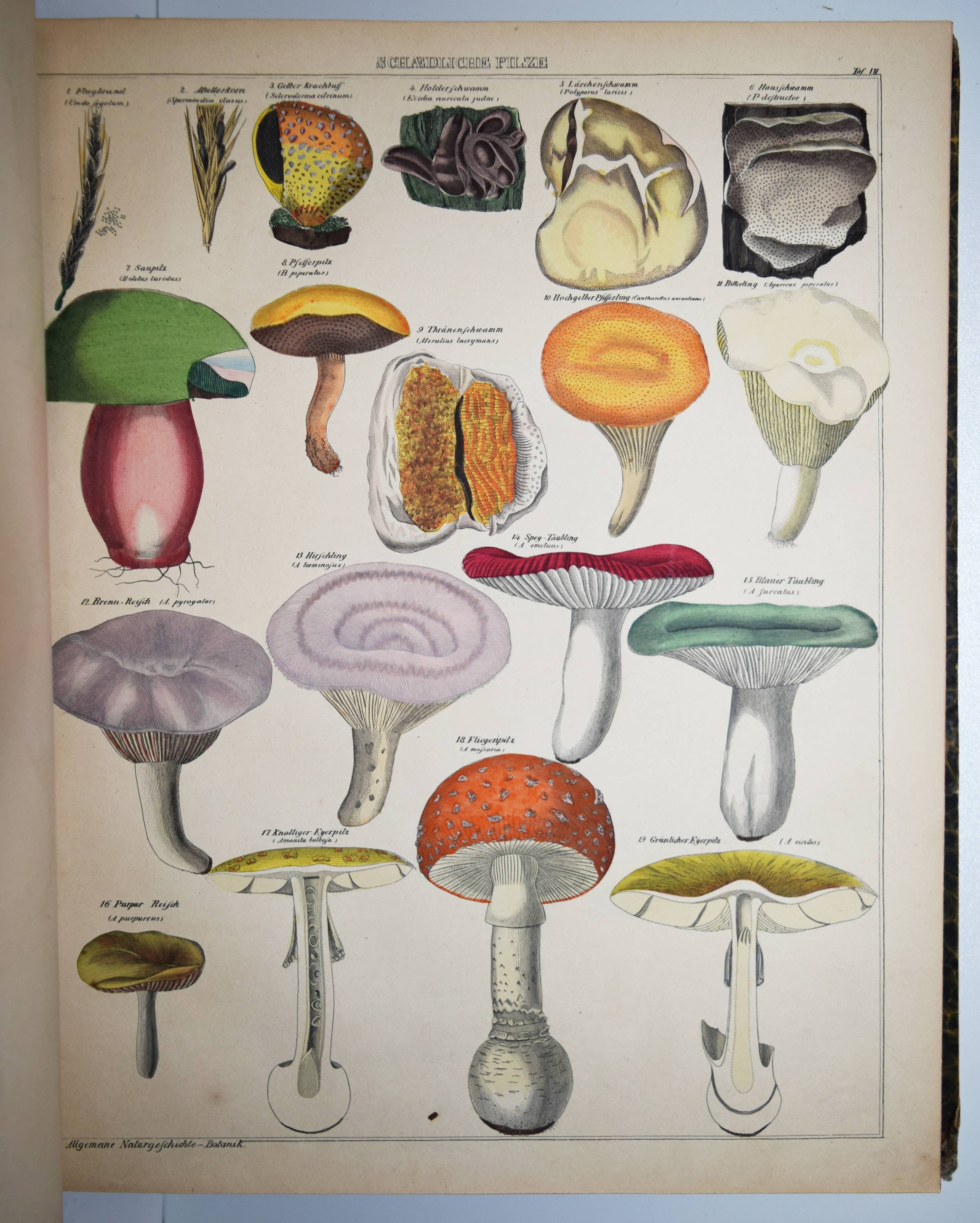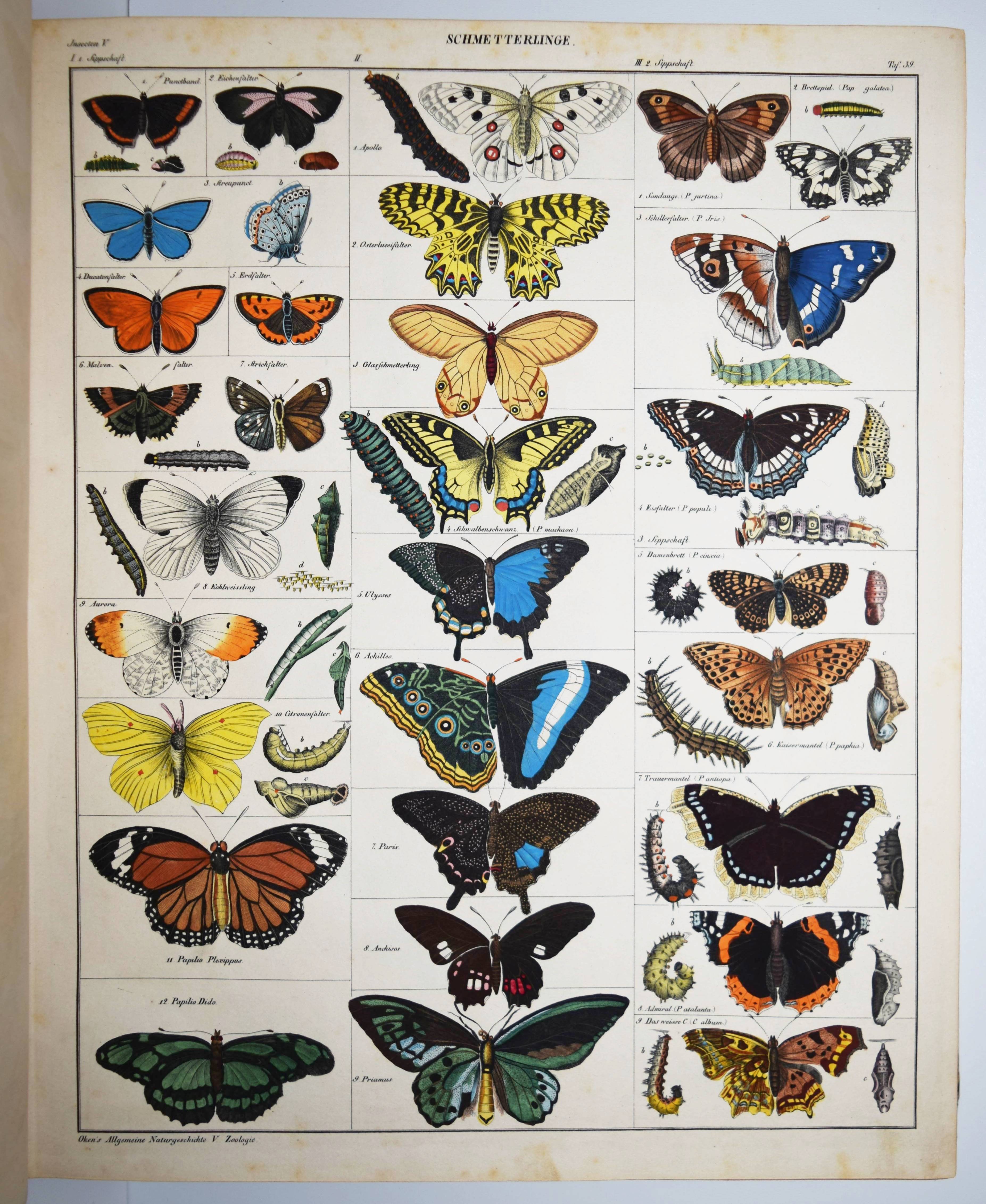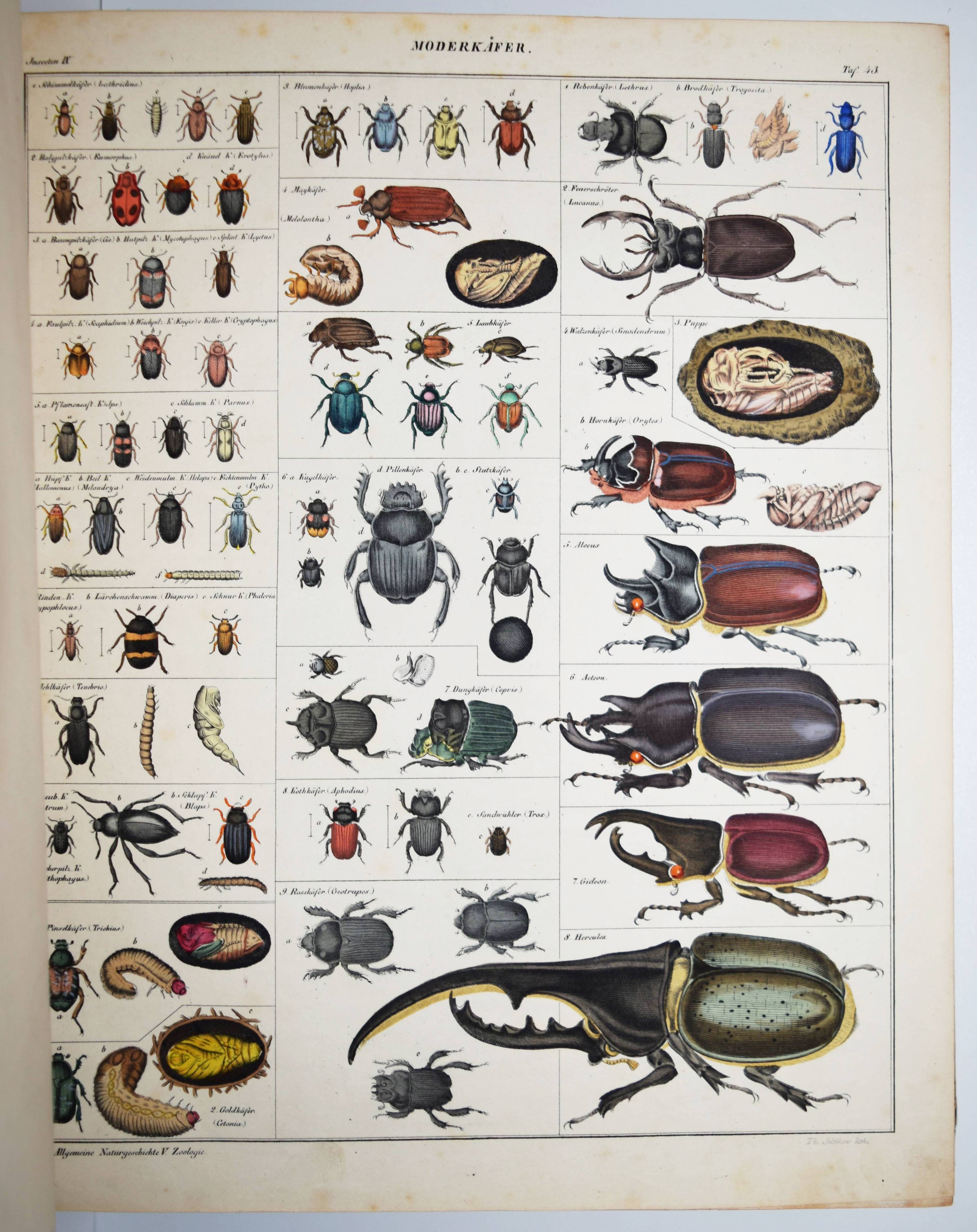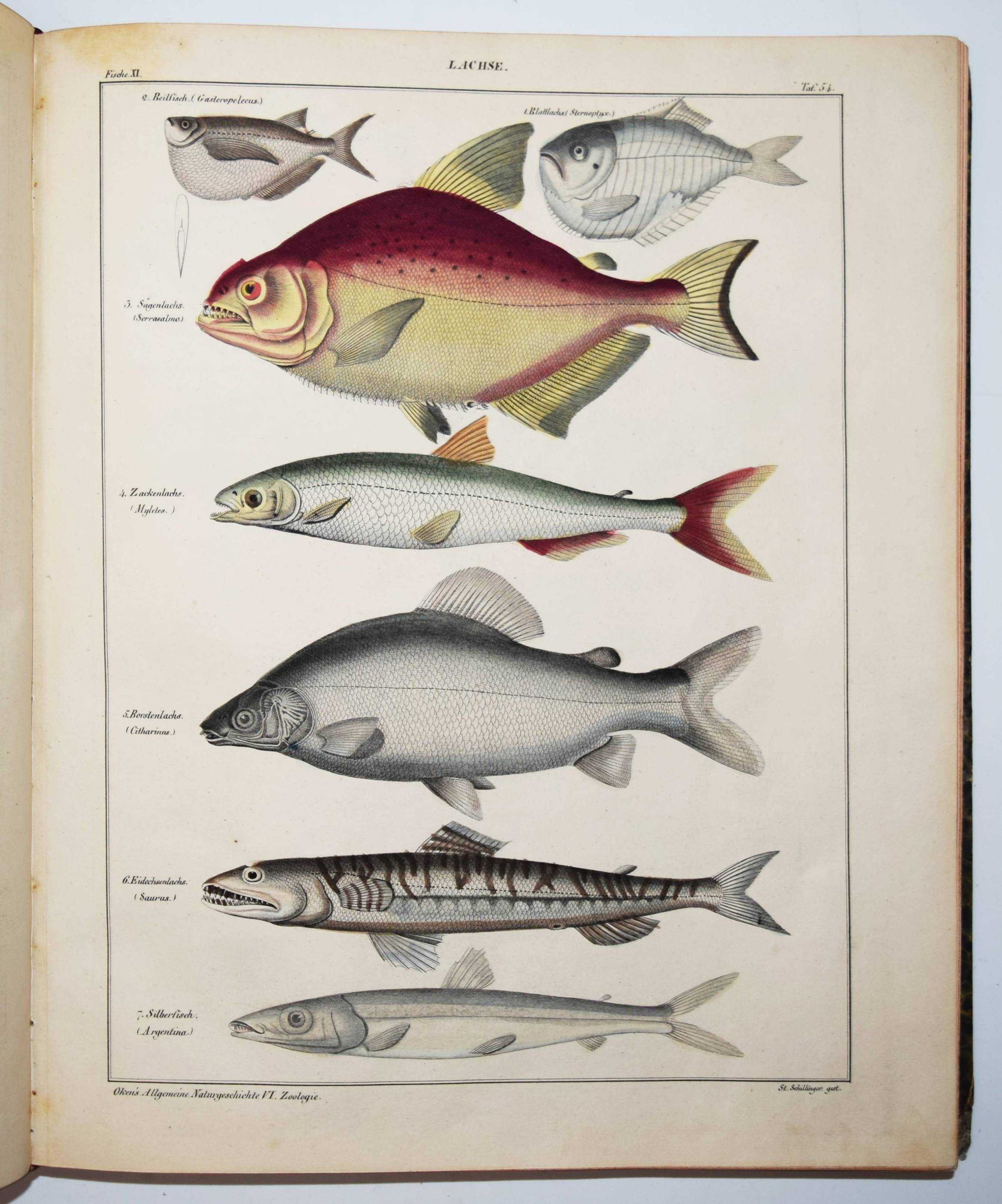 Oken, (Lorenz). Allgemeine Naturgeschichte für alle Stände. 7 Textbände in 14 (inkl. Registerband) und Tafelband (zus. 15 Bände). Stuttgart, Hoffmann 1838-1843. 8° (21 x 14 cm.) und Folio (35 x 29 cm.). Mit lithogr. illustr. Titel und 164 (132 handkolorierte) lithogr. Tafeln. Halblederbände der Zeit mit zweifarbigen goldgepr. Rückenschildern und Rückenvergoldung. ADB XXIV, 216 ff. Anker 375. Graesse V, 16. Horn-Schenkling 16535. Nissen, ZBI 3006. – Erste Ausgabe. – I. Mineralogie und Geognosie bearbeitet von F. A. Walchner. – II. und III., 1-3. Botanik. – IV. bis VII. Thierreich. – Registerband. – Tafelband mit Tafeln zur Mineralogie, Botanik, Anatomie und Zoologie, mit schönen Abbildungen von Fischen, Schmetterlingen, Vögeln u. a., deren Darstellung geht auf vergleichbare Sachbücher zurückgeht und die noch in der Tradition von Sammlerkabinetten steht. – „Seine große Naturgeschichte ist wohl das letzte Werk, in welchem ein und derselbe Verfasser die ganze Naturgeschichte erschöpfend behandelt. Sie ist eine weitere große Leistung Oken’s; denn wenn man auch zweifelhaft sein kann, ob das darin enthaltene Naturphilosophische anregend und befruchtend gewirkt hat, so ist doch der specielle Theil so reichhaltig und dabei so klar und faßlich behandelt, daß das vielverbreitete Werk oft und gern zu Rathe gezogen, „viel mehr benutzt als citirt wurde“. Von der Naturgeschichte des Mineralreichs stammt nur die allgemeine Einleitung aus Oken’s Feder. O. hatte schon 1809 eine eigene Classification der Mineralien aufgestellt, von der wenigstens die obersten Eintheilungen vielfach angenommen wurden. Die Botanik und Zoologie ist ganz Oken’s eigene Arbeit. Bei beiden geht dem speciellen, ausführlichen Theile eine allgemeine Einleitung voraus, welche vergleichende und descriptive Anatomie, Physiologie, Principien der Classification, geographische Verbreitung, Geschichte u. s. w. enthält. In der Einleitung zur Zoologie findet sich eine überaus klar und verständlich geschriebene, populäre Anatomie des Menschen. Als ein wirkliches Verdienst Oken’s gilt es, daß er vornehmlich in der Classification neben Fremdwörtern deutsche Termini nicht nur für Arten und Gattungen, sondern auch für die höheren Abtheilungen einführte“ (A. Lang in ADB). – Einbände etwas berieben und bestoßen, Tafel 57 (Fisch-Anatomie) mit restauriertem Eckabriß (minimaler Bildverlust), stellenweise etwas braunfleckig, sehr gutes dekorativ gebundenes Exemplar, vollständig mit dem Register- und Tafelband selten.