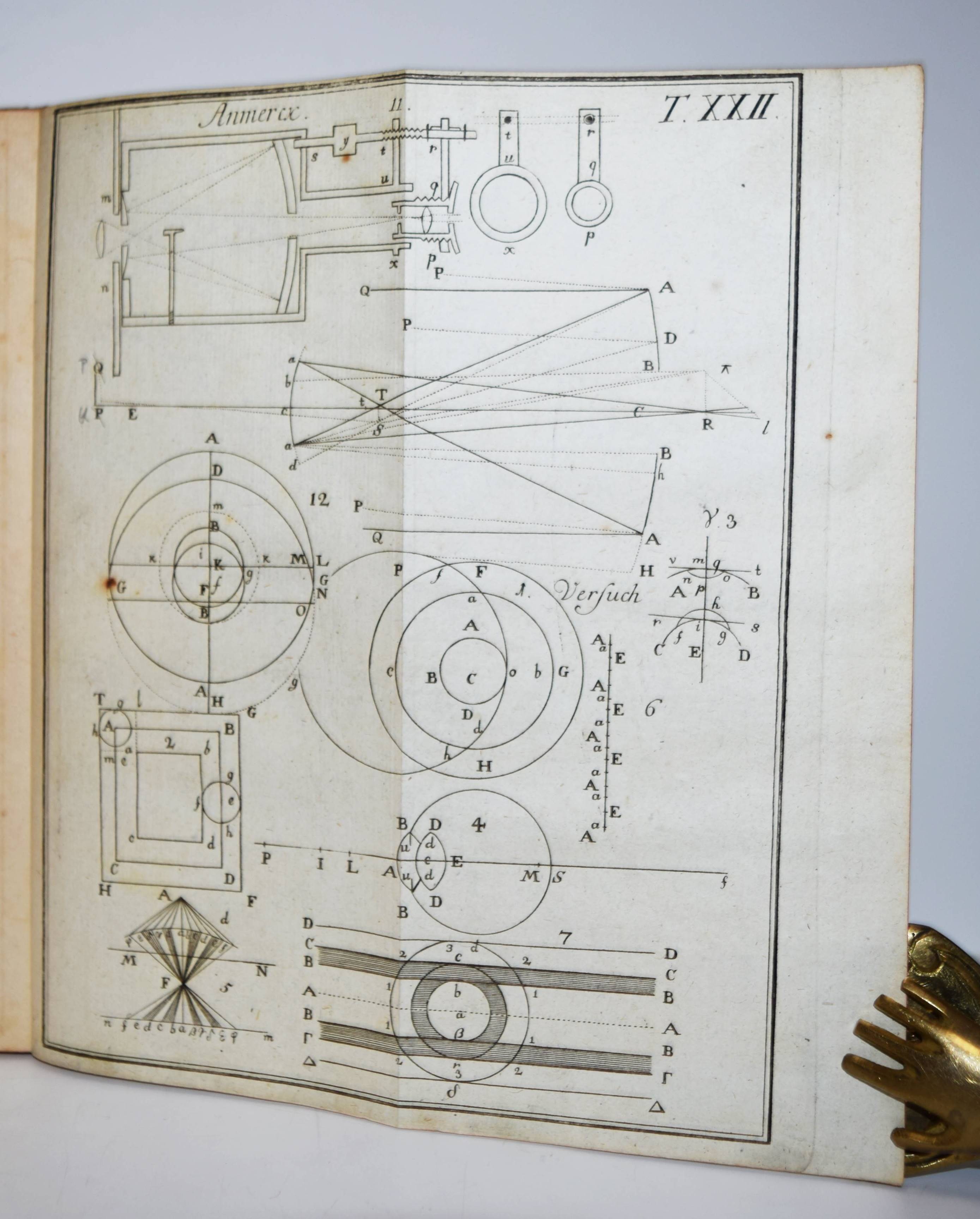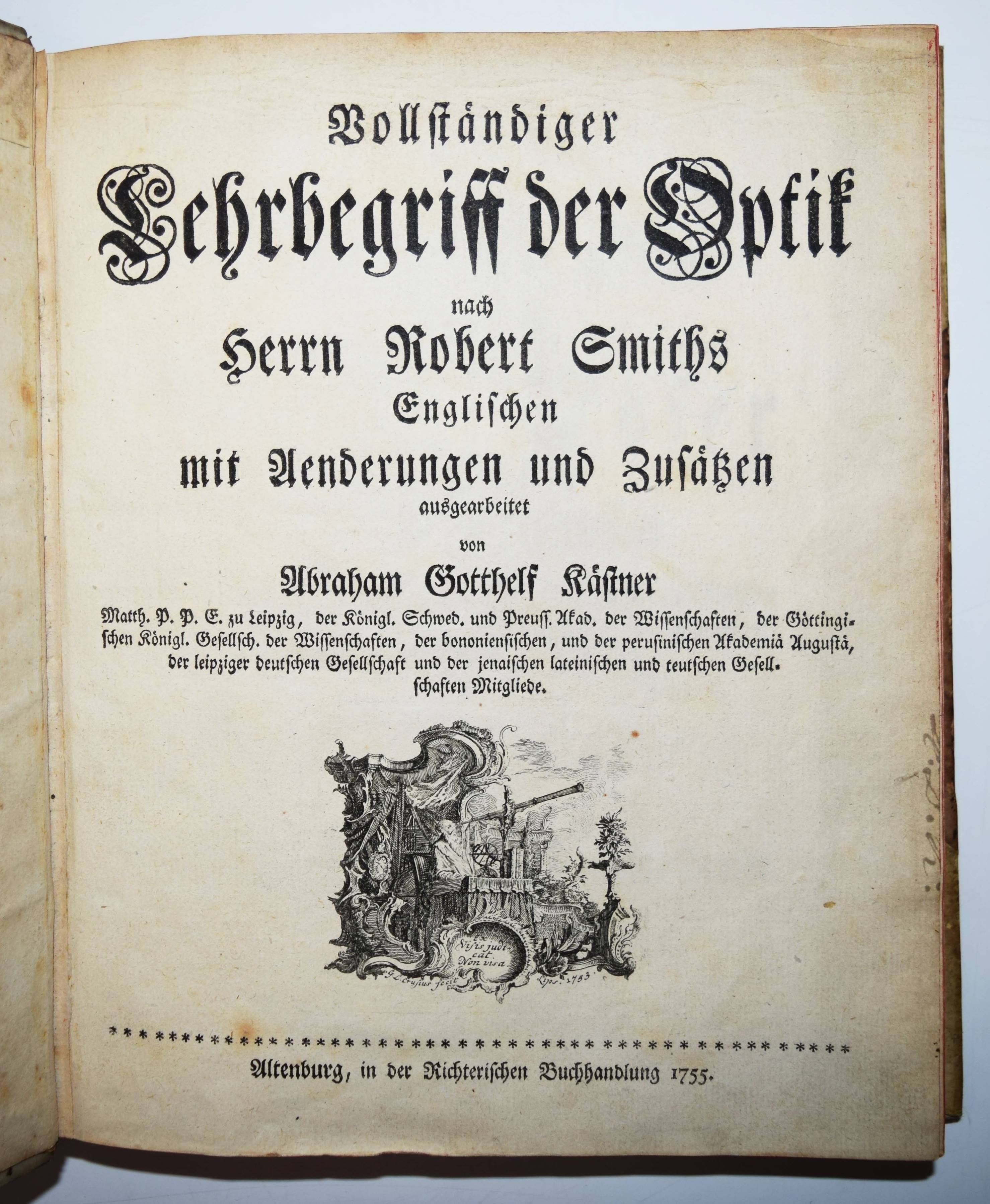 Smith, Robert. Vollständiger Lehrbegriff der Optik. Nach Herrn Robert Smiths Englischen mit Aenderungen und Zusätzen ausgearbeitet von Abraham Gotthelf Kästner. Altenburg, Richter 1755. 4° (23,5 x 20 cm.). [12] Bl., 531, (5) S. mit gestoch. Titelvignbette und 22 gefaltete Kupfertafeln. Halbpergamentband der Zeit. DSB XII, 477 (Smith) und VII, 206 (Kästner). Houzeau-Lancaster I, 3323. Poggendorff I, 1219. Rosenthal 293. VD18 10279660. – Erweiterte erste deutsche Ausgabe von R. Smiths „A compleat system of opticks in four books“ (London 1738). Über Spiegel und „Glaser für die Augen“, Augen und Sehen, Ursache der Brechung des Lichtes, Katoptrik, Fernrohre, Teleskope, Mikroskope, Camera obscura, laufende Bilder etc. – Smith’s work „became probably the most influential optical textbook of the eighteenth century. It was also published in Dutch in 1753, in German in 1755, and in two different French translations in 1767“ (DSB). – Einband etwas angestaubt und berieben, vorderer freier Vorsatz fehlt, stellenweise leicht gebräunt und gering braunfleckig, sehr gutes Exemplar.