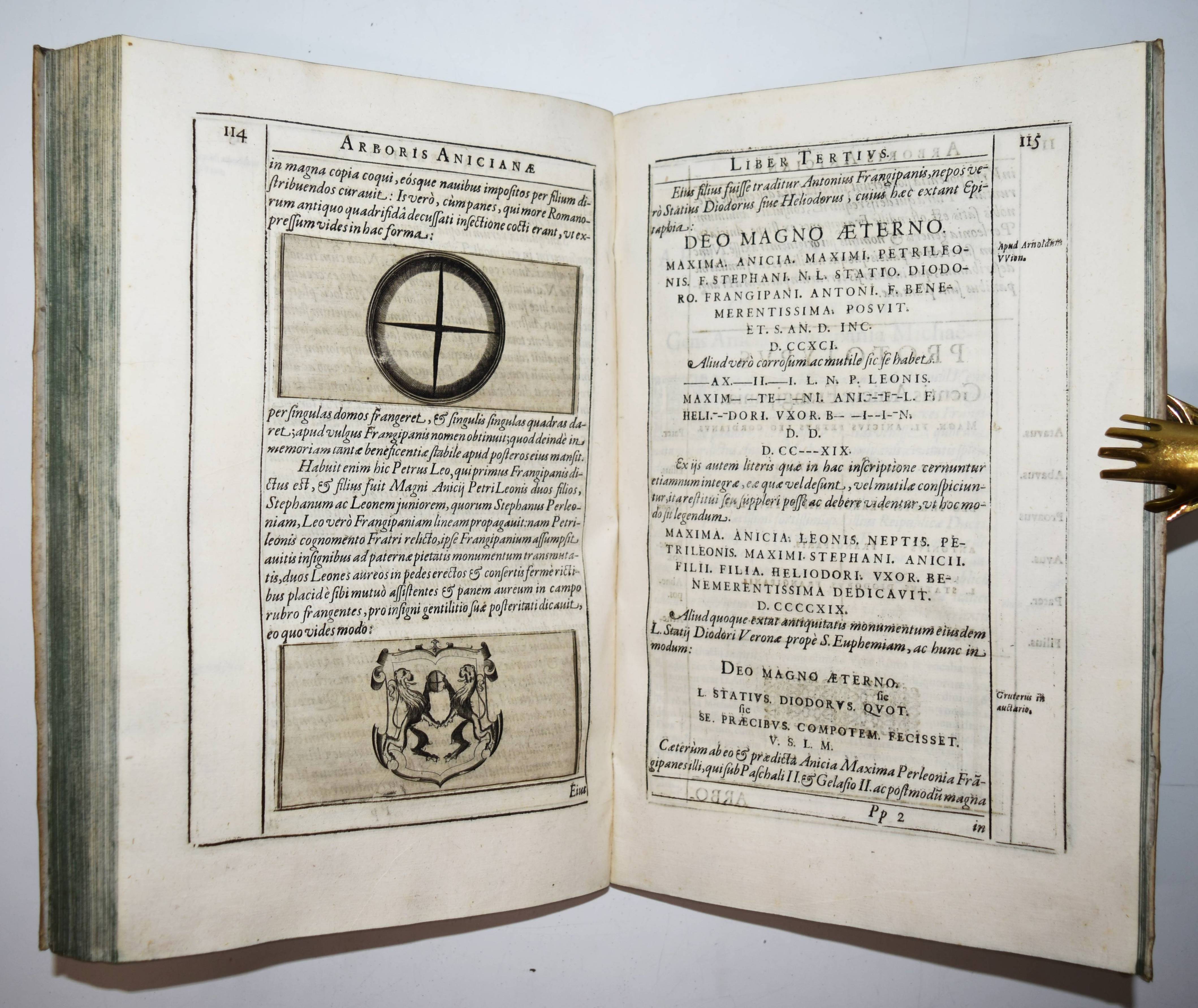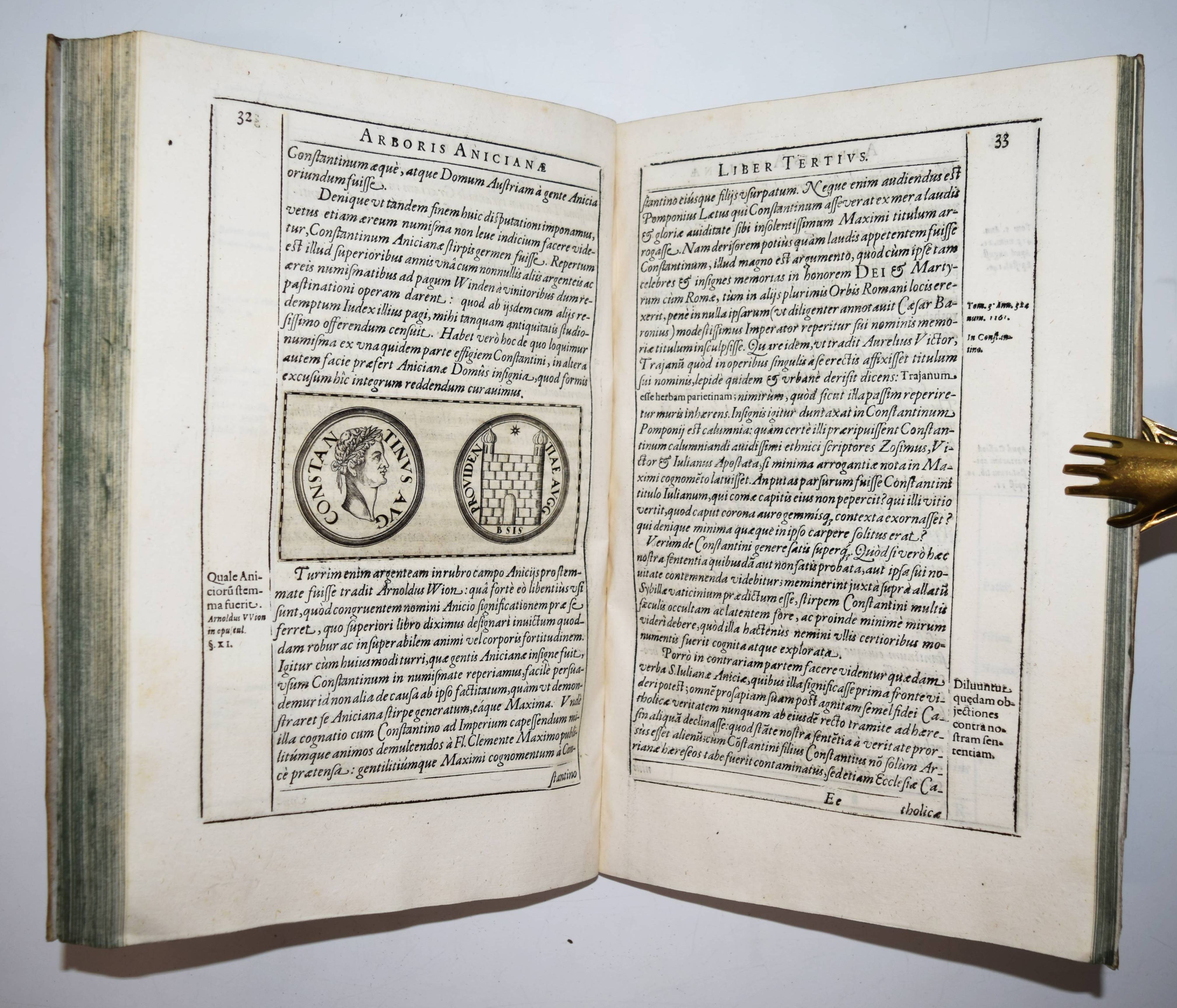 Seifried, Johann. Arbor Aniciana seu genealogia serenissimorum Augustissimae Austriae domus principum. Ab anicia antiquissima nobilissimaque urbis Romae familia deducta septemque libris explicata. 3 Teile in 1 Band (mehr nicht erschienen). Wien, Johann Fidler für den Autor in Zwettl 1613. Folio (31 x 21 cm.). [22] Bl., 83 S.; [5] Bl., 44 S.; 7 (erstes w.) Bl., 134 S., 1 Bl. Titel mit breitem Kupferstichrahmen und 9 Textkupfern. Pergamentband der Zeit. Coreth 31. Benzing, Buchdrucker 489. Bernd 2527 a. Jöcher IV, 485. Mayer I, 925. VD17 23:296807P. – Einzige Ausgabe, ursprünglich auf sieben Teile geplant. – Sehr seltener Wiener Druck; Johann Fidler war zwar Bürger der Universität, aber nicht Bürger der Stadt und konnte daher nur unter größten Schwierigkeiten drucken. Neben diesem Privatdruck ist nur ein weiterer Titel von ihm bekannt. – Eine der letzten Schriften, in der der römische Ursprung der Habsburger verfochten wurde. Johann Seifried stammte aus Breslau und war von 1612 bis 1625 Abt im Stift Zwettl. – Die Kupferstiche zeigen Münzen und Wappen. – Einband teils stärker angestaubt und fleckig, zu Beginn und Ende etwas wurmstichig, sonst gut erhalten.