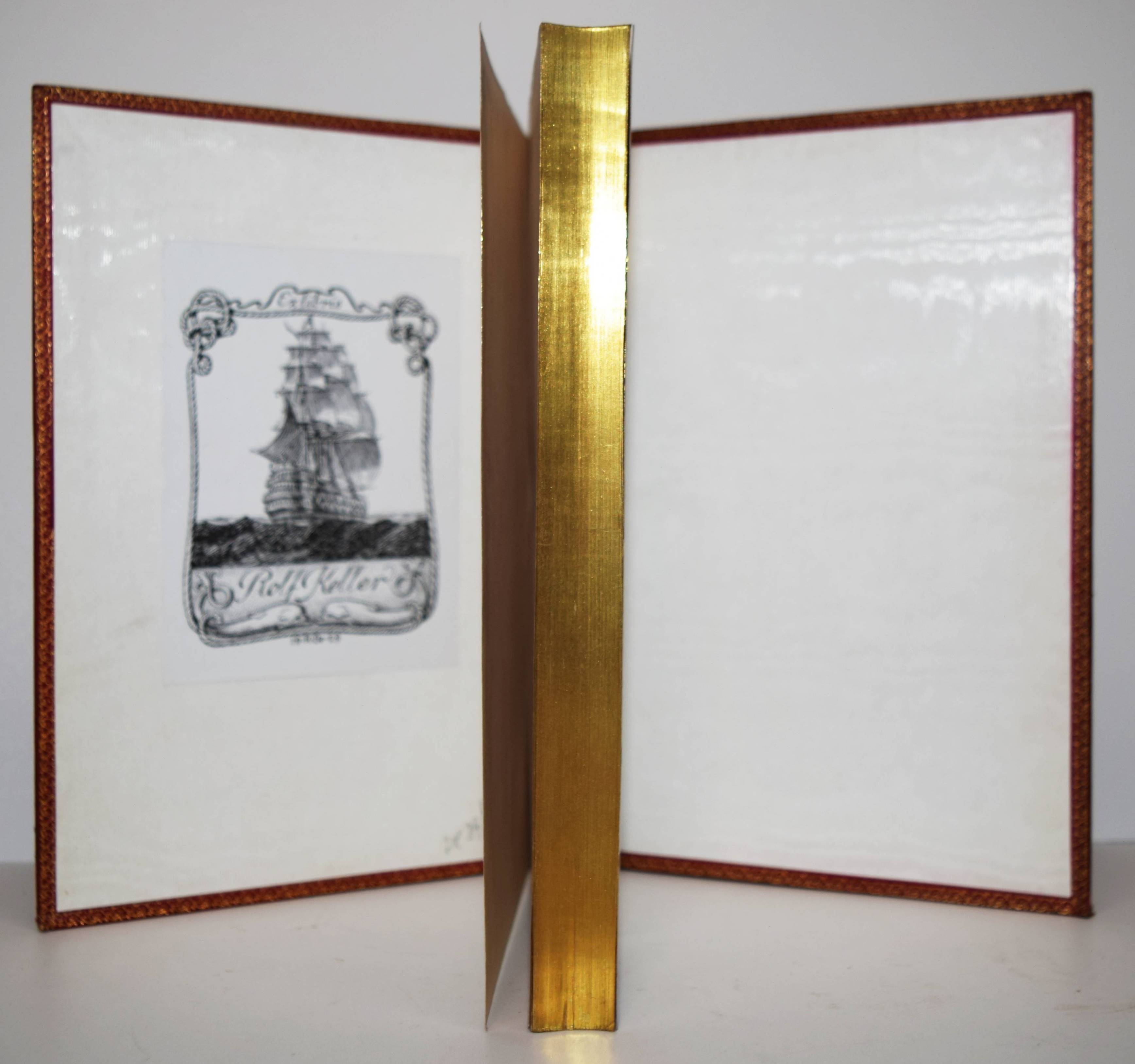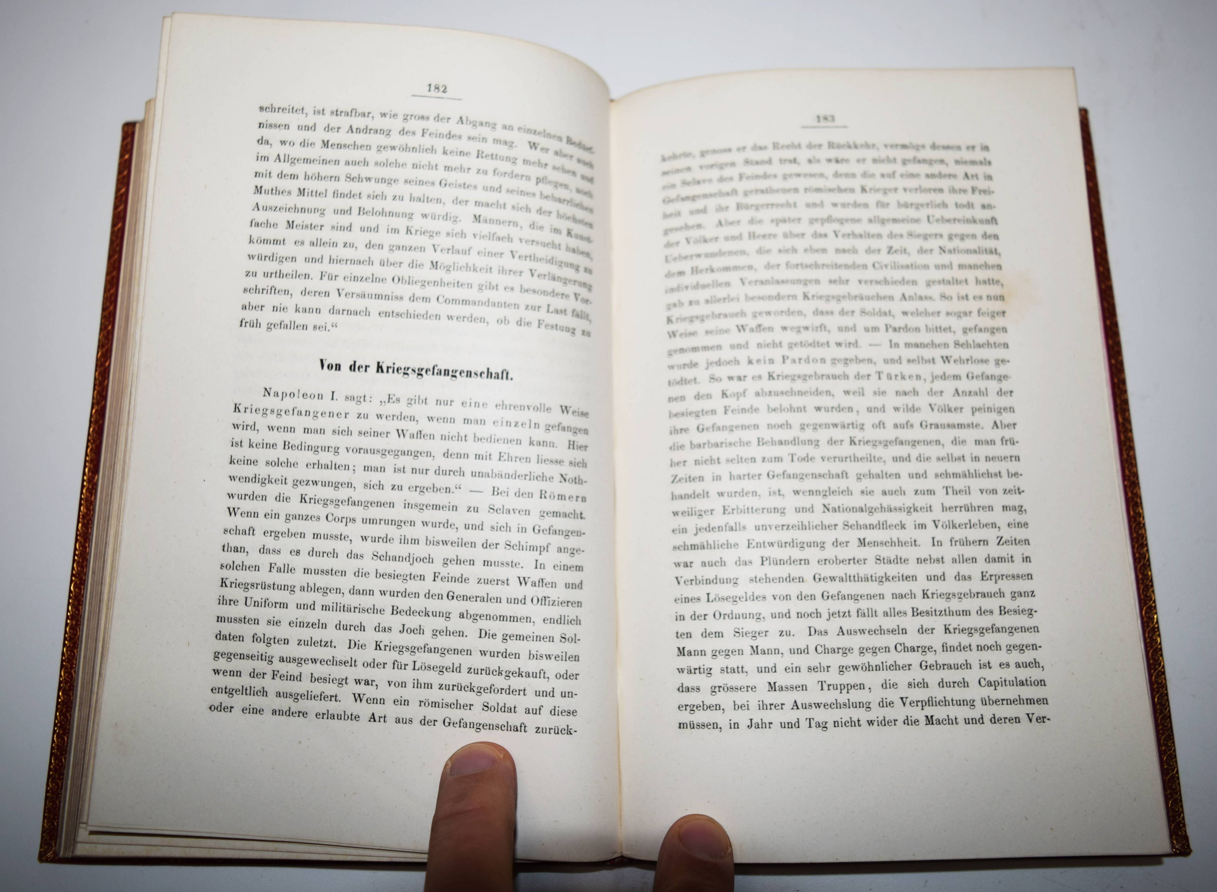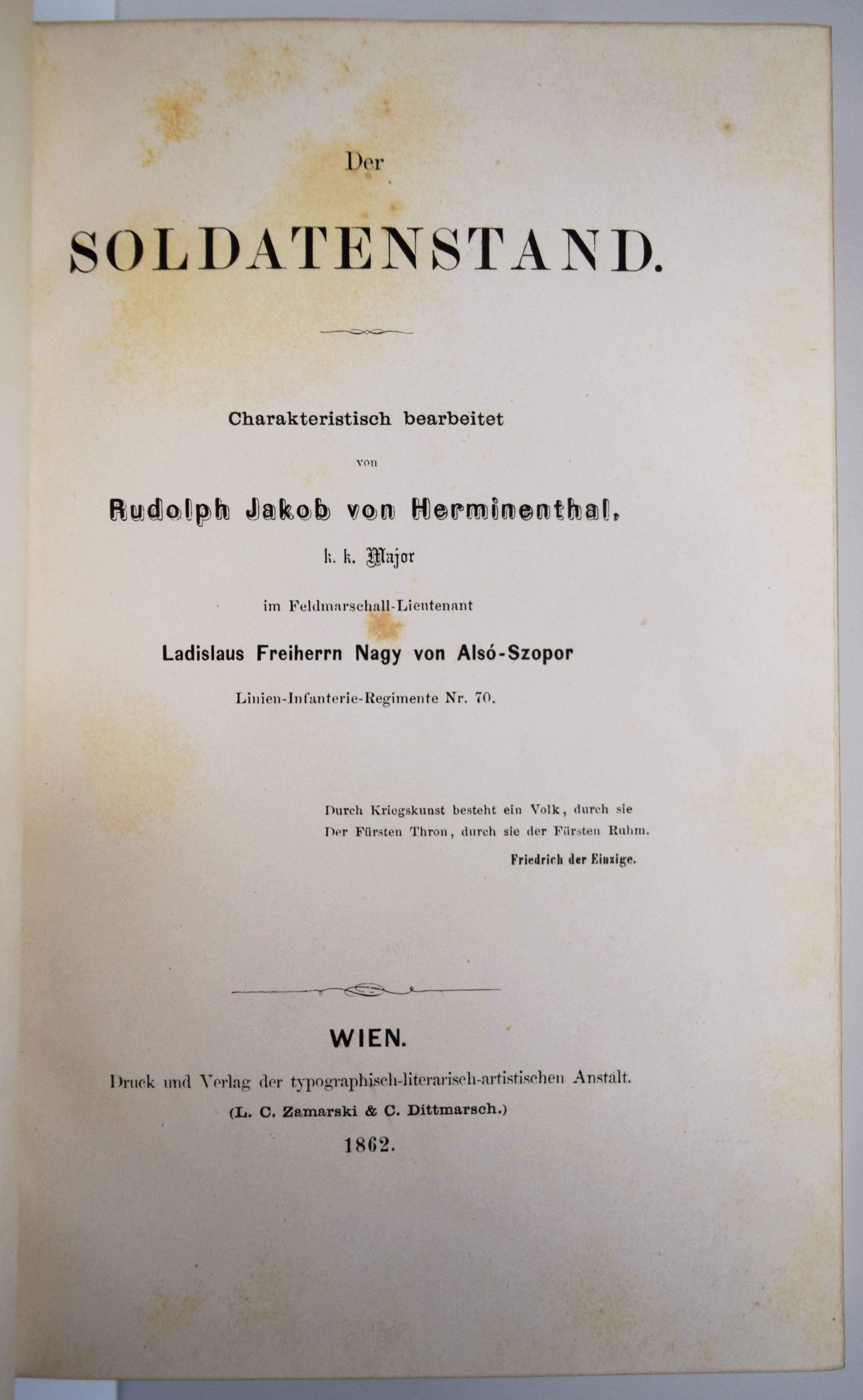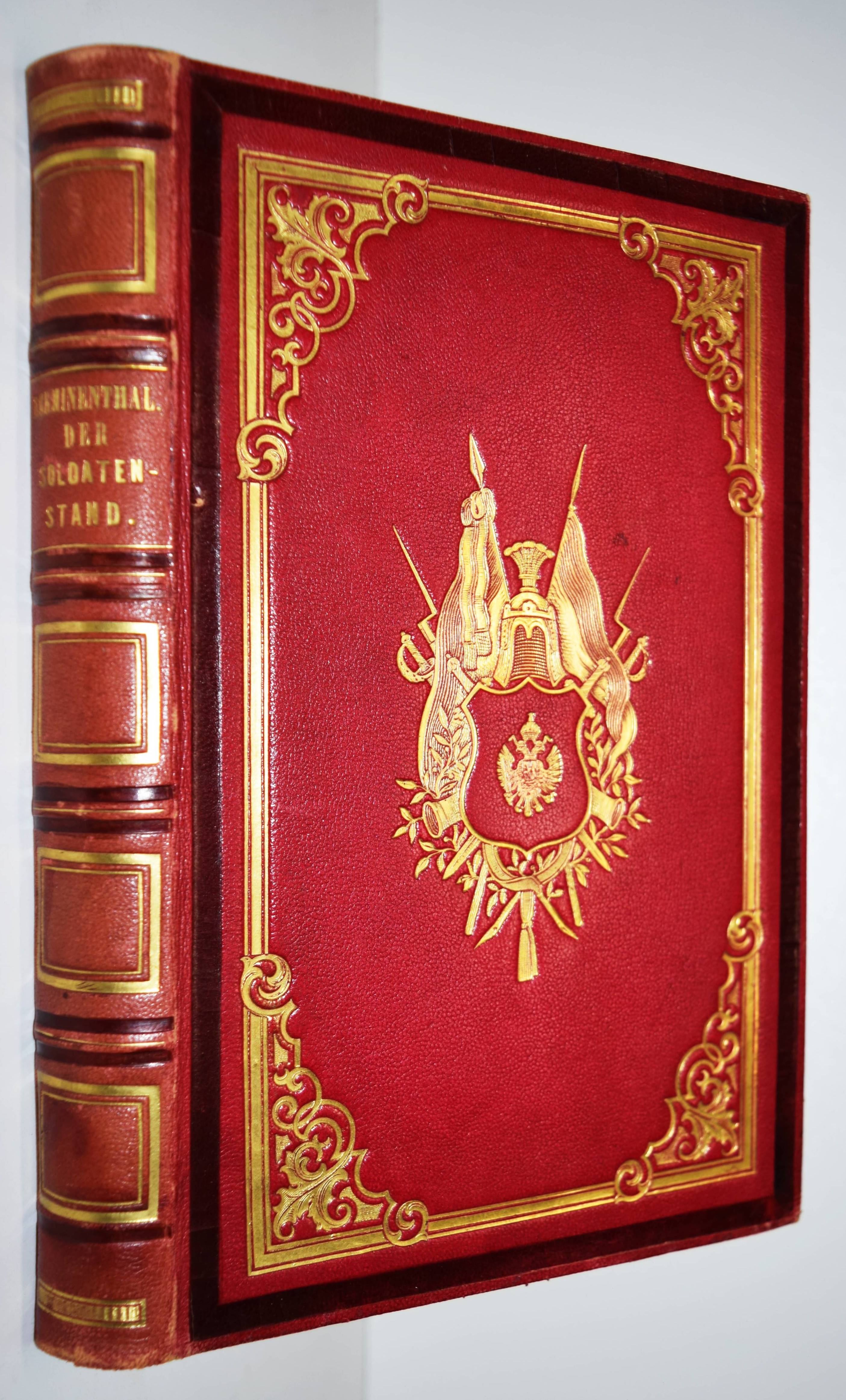 Herminenthal, Rudolph Jakob v. Der Soldatenstand. Wien, Druck und Verlag der typographisch-literatisch-artistischen Anstalt 1862. 8°. [6] Bl., 305, (5) S. Weinroter Maroquin-Lederband mit goldgepr. Rückentitel, Rücken-, Deckel- und Innenkanten, goldgepr. Deckelvignette (Doppeladler) und Goldschnitt. Erste Ausgabe; sehr selten, wohl nur in kleiner Auflage erschienen. – Sehr dekorativ gebundenes Geschenkexemplar. – Gewidmet Kronprinz Rudolph. Enthält Kapitel u. a. über Gebieten und Befehlen; Exerciren; Verpflegung des Soldaten; Beförderung; Heldenmuth; Fahnen und Standarten; Operationspläne; Kriegsgefangenschaft; Adjutant; General und General-Stab. – Der Autor war k.k. Major im Feldmarschall-Lieutenant Ladislaus Freiherrn Nagy von Also-Szopor Linien-Infanterie-Regimente Nr. 70. – Teils braunfleckig, schönes Exemplar aus der Bibliothek von Rolf Keller mit dessen Exlibris (gestaltet 1929 von Rudolf Oeffinger).