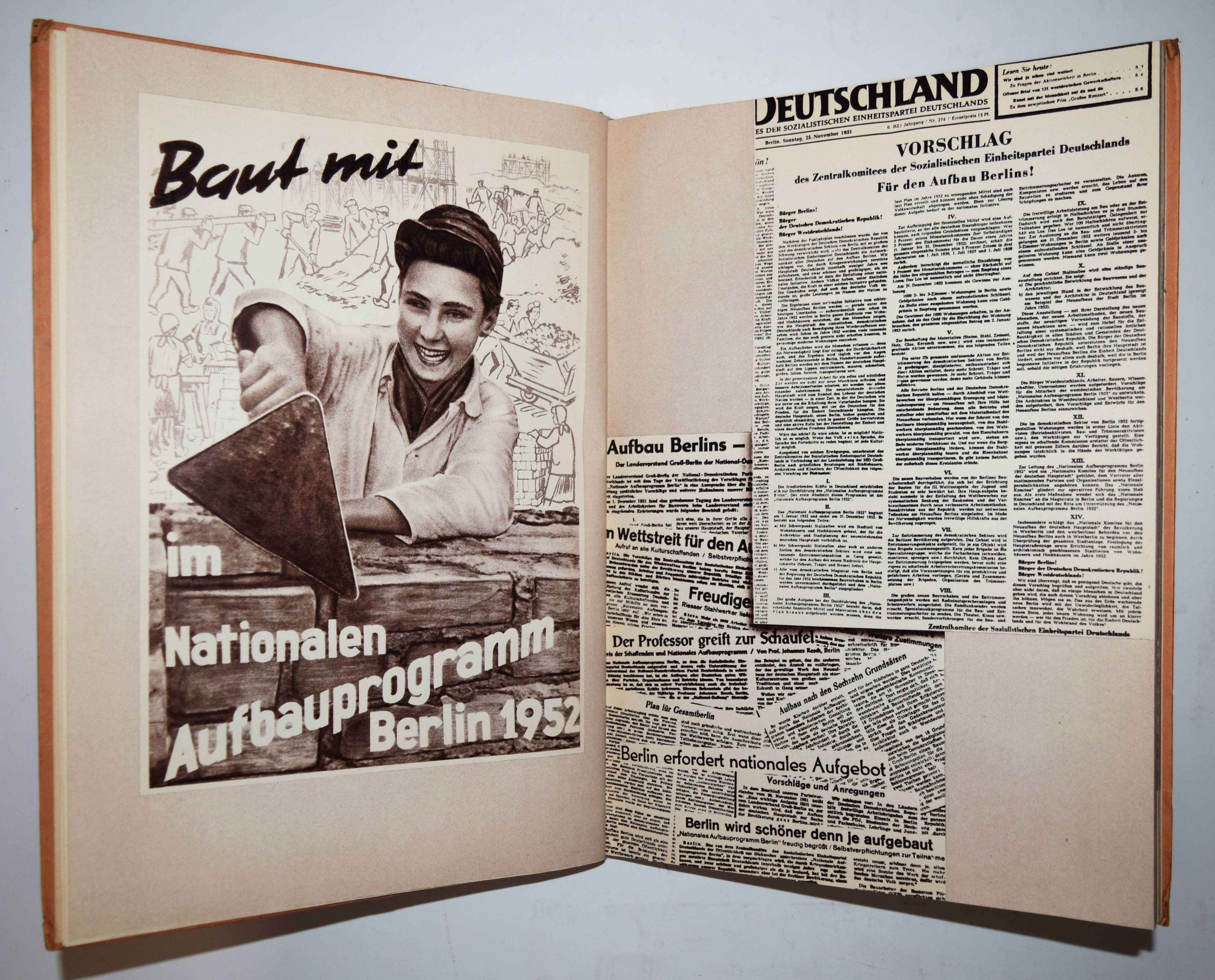 Puhlmann, Gerhard, (Max Ittenbach) u. a. Die Stalinallee. Nationales Aufbauprogramm 1952. Berlin, Verlag der Nation 1952. 4°. [102] Bl. mit 286 Abbildungen, 3 Fotomontagen und Illustrationen. Orig.-Halbleinenband. Parr/Badger I, 182. – Erste Ausgabe des seltenen Propaganda-Fotobuchs über die Berliner Prachtstraße. – Das Werk „sollte einen Beitrag dazu leisten, die Überlegenheit des Sozialismus darzustellen und zeigen, wie der sozialistische Staat für die Arbeiterklasse sorgt, indem großzügig anspruchsvolle Wohnungen gebaut werden. Das Entstehen der Straße sollte ursprünglich nur filmdokumentarisch begleitet werden. Da Gerhard Puhlmann aber den Architekten Professor Hermann Henselmann persönlich kannte, verantwortlich für die Wohnbebauung am Strausberger Platz und den ersten Abschnitt der Stalinallee, sicherte er sich den Auftrag für die fotografische Begleitung des gesamten Bauvorhabens und konnte so die ganze Bandbreite seines Könnens auf brillante Weise unter Beweis stellen. Die hohe Qualität von Puhlmanns Arbeit an diesem Projekt wurde geehrt mit dem Nationalpreis 1. Klasse, verbunden mit einem Geldpreis von 100.000 Mark. 1953 betrug das durchschnittliche Monatseinkommen in der DDR laut Rententabelle 324 Mark“ (Zu einer Neuausgabe im Berlin Story Verlag 2022). – „Propaganda-Fotobücher gibt es in allen Formen, Größen und Ideologien. Manchmal erzählen sie Halbwahrheiten, manchmal lügen sie unverhohlen, manchmal sind sie so sachlich wie Unternehmensberichte. Gerhard Puhlmanns fotografische Dokumentation des viel gepriesenen Wiederaufbauprojekts der DDR gehört zwar eindeutig zur letzteren Kategorie, den harmlosesten Propagandabüchern, lobt aber dennoch eindeutig die Vorzüge des Vorhabens. Die Stalinallee, die 1961 (als Stalins Name in Ungnade fiel) in Frankfurter Allee und Karl-Marx-Allee umbenannt wurde, war das wichtigste städtebauliche Projekt, das in Ost-Berlin durchgeführt wurde. Dieser riesige, 75 bis 80 Meter breite Ost-West-Boulevard endete am Alexanderplatz, dem Zentrum des sowjetisch besetzten Berlins. Entworfen von einem Team unter der Leitung des ostdeutschen Architekten Heinrich Henselmann, war es ein äußerst ehrgeiziges Projekt, dessen erste Phase in Puhlmanns Buch liebevoll dokumentiert wurde“ (M. Parr). – Sehr gutes sauberes Exemplar.