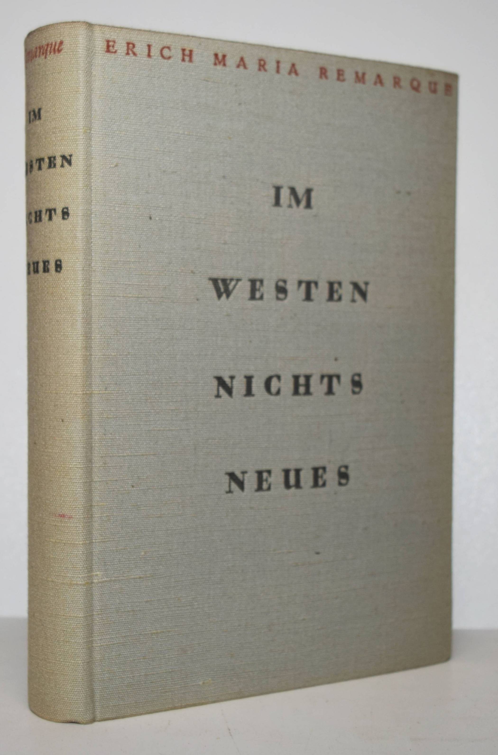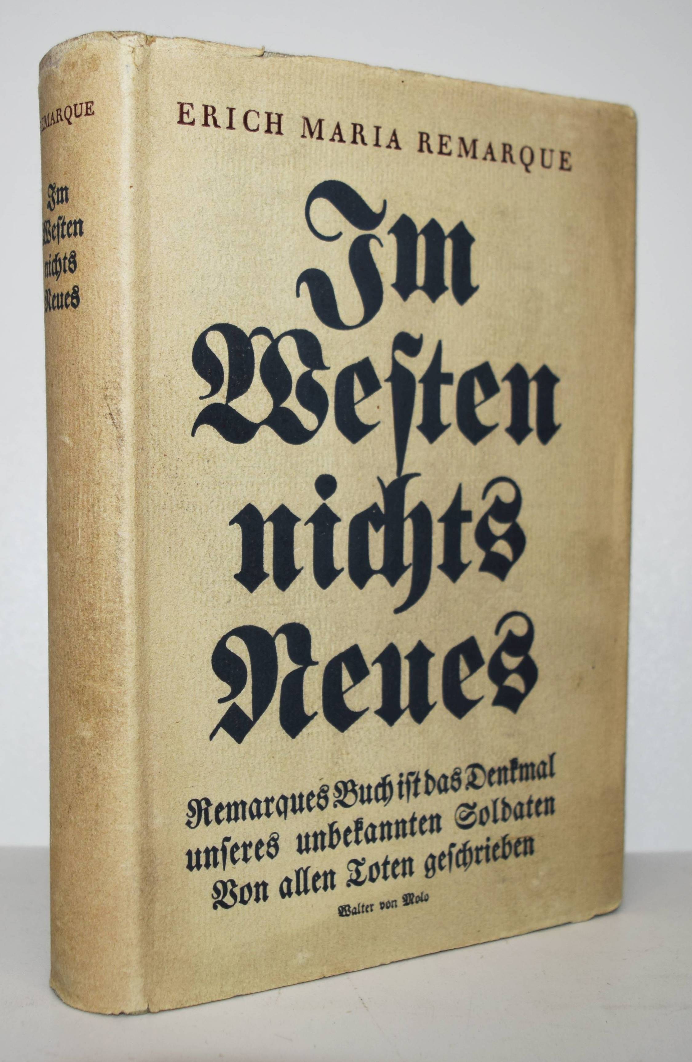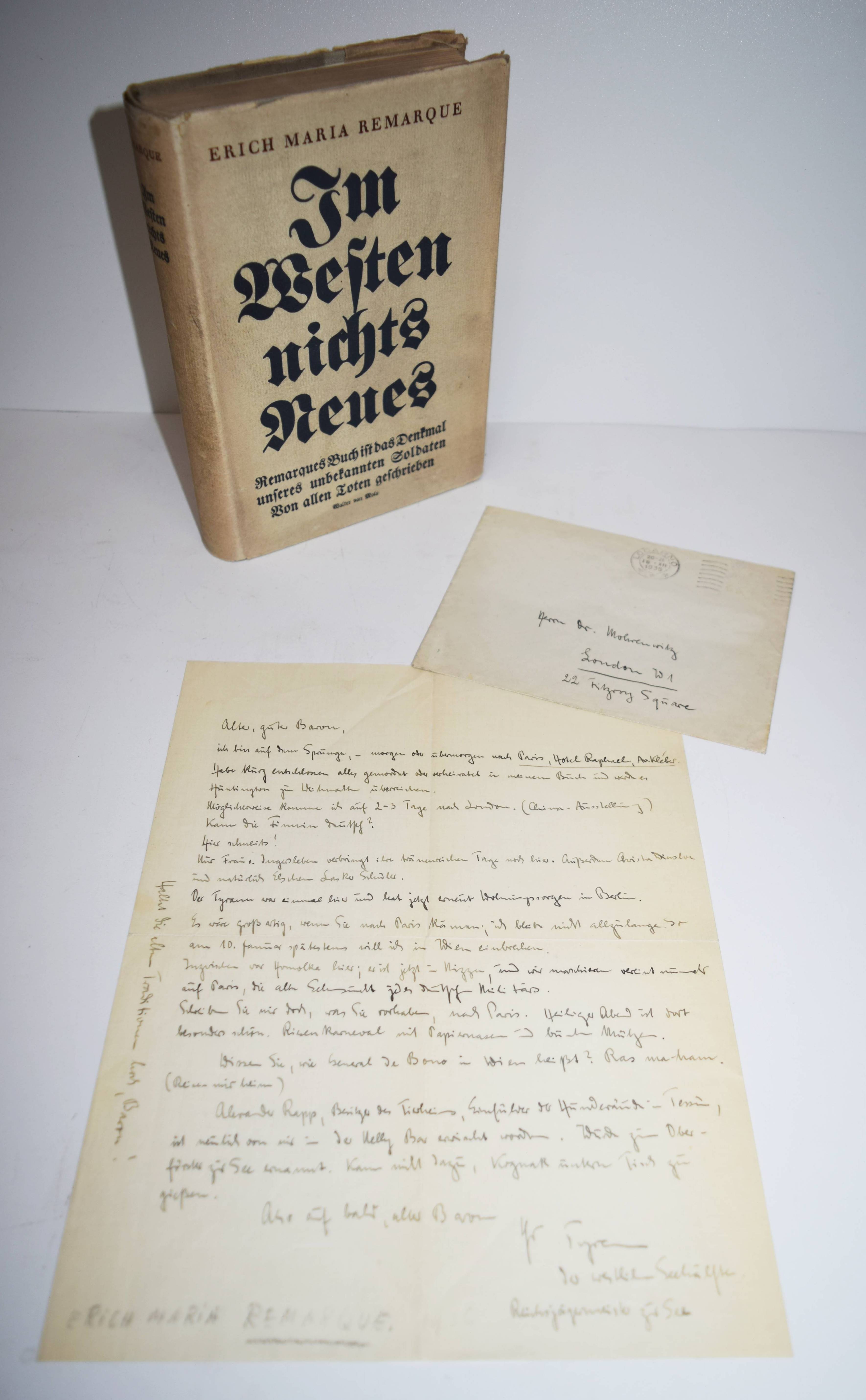 Remarque, Erich Maria (d. i. Erich Paul Remark). Im Westen nichts Neues. Berlin, Propyläen-Verlag (Ullstein & Co.) 1929. 8°. 287, (1) S. Orig.-Leinenband mit typogr. Schutzumschlag. W.-G.² 3. – Erste Ausgabe des berühmten Anti-Kriegsromans. Zuerst ab November 1928 als Vorabdruck in der Vossischen Zeitung erschienen. – Mit eigenhändigem Brief von E. M. Remarque, Porto Ronco 18. 12. 1935 (lt. Poststempel auf dem beil. Umschlag) an den befreundeten Verleger im Londoner Exil Lothar Mohrenwitz (1886-1960). „Alter, guter Baron, ich bin auf dem Sprunge, – morgen oder übermorgen nach Paris, Hotel Raphael, Av. Kléber. Habe kurz entschlossen alles gemordet oder verheiratet in meinem Buch und werde es Huntington zu Weihnachten überreichen [1936 erschien bei Gyldendal in Kopenhagen die erste Buchausgabe von „Drei Kameraden“]. Möglicherweise komme ich auf 2-3 Tage nach London […] Es wäre großartig, wenn Sie nach Paris kämen; ich bleibe nicht allzu lange. Inzwischen war Homolka hier; er ist jetzt in Nizza, und wir marschieren vereint nunmehr auf Paris, die alte Sehnsucht jedes deutschen Militärs. […] Ihr Tyrann der westlichen Seehälfte. Reichsjägermeister zur See [Quer:] Haltet die alten Traditionen hoch, Baron!“. – „Remarques Buch ist das Denkmal unseres unbekannten Soldaten. Von allen Toten geschrieben“ (Walter von Molo, Umschlagtext). – Schutzumschlag am Kapital unauffällig restauriert, sehr gutes sauberes Exemplar.