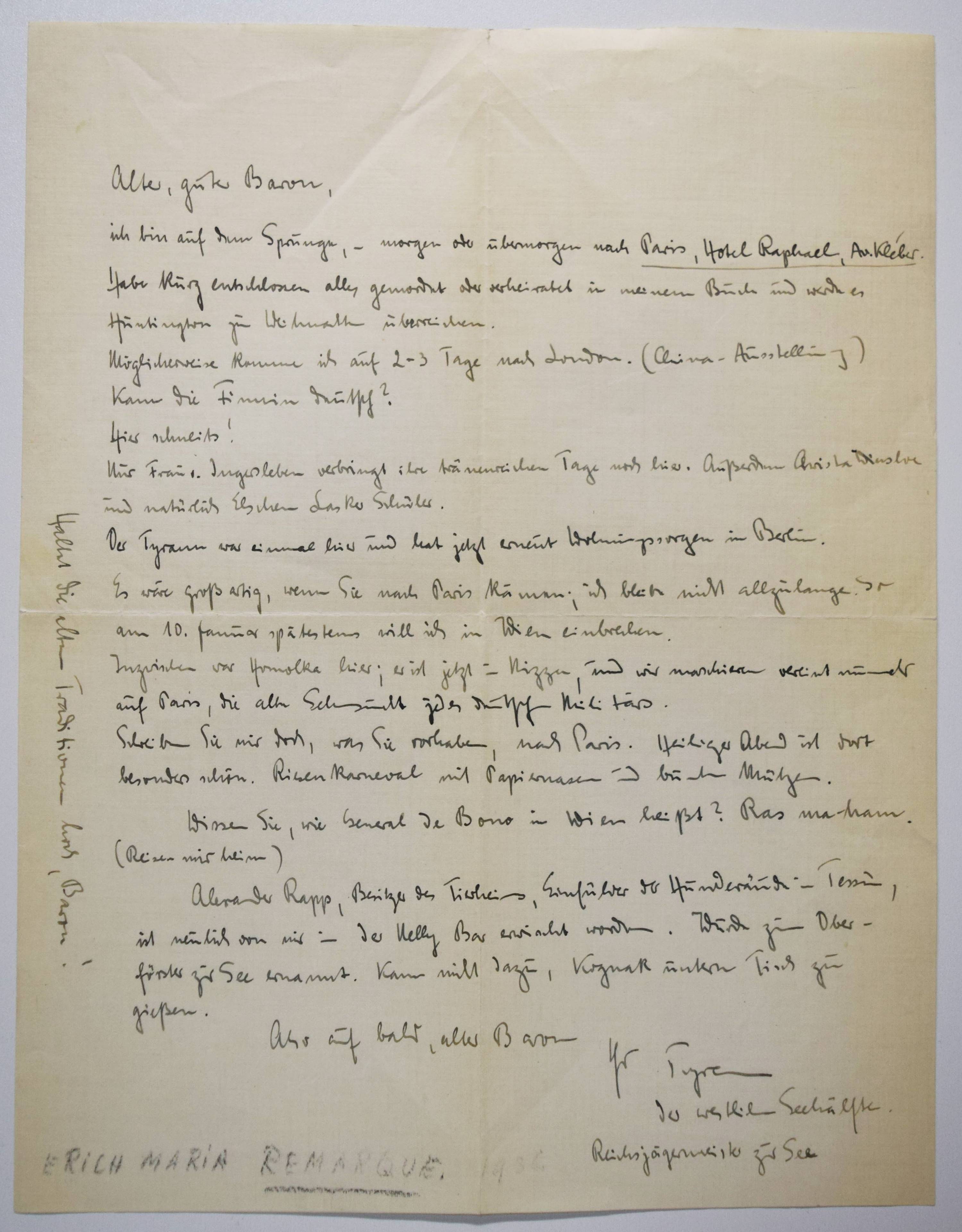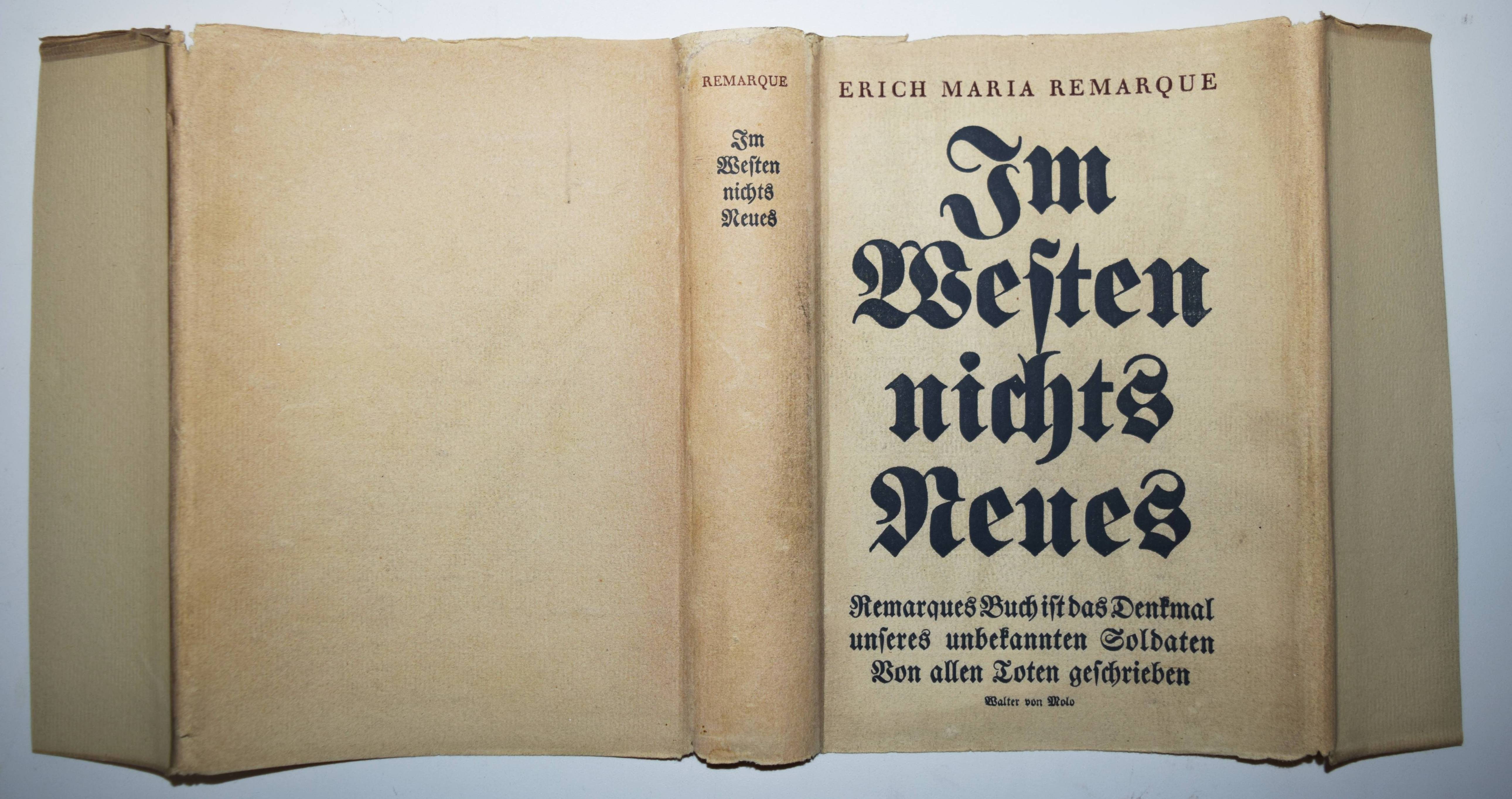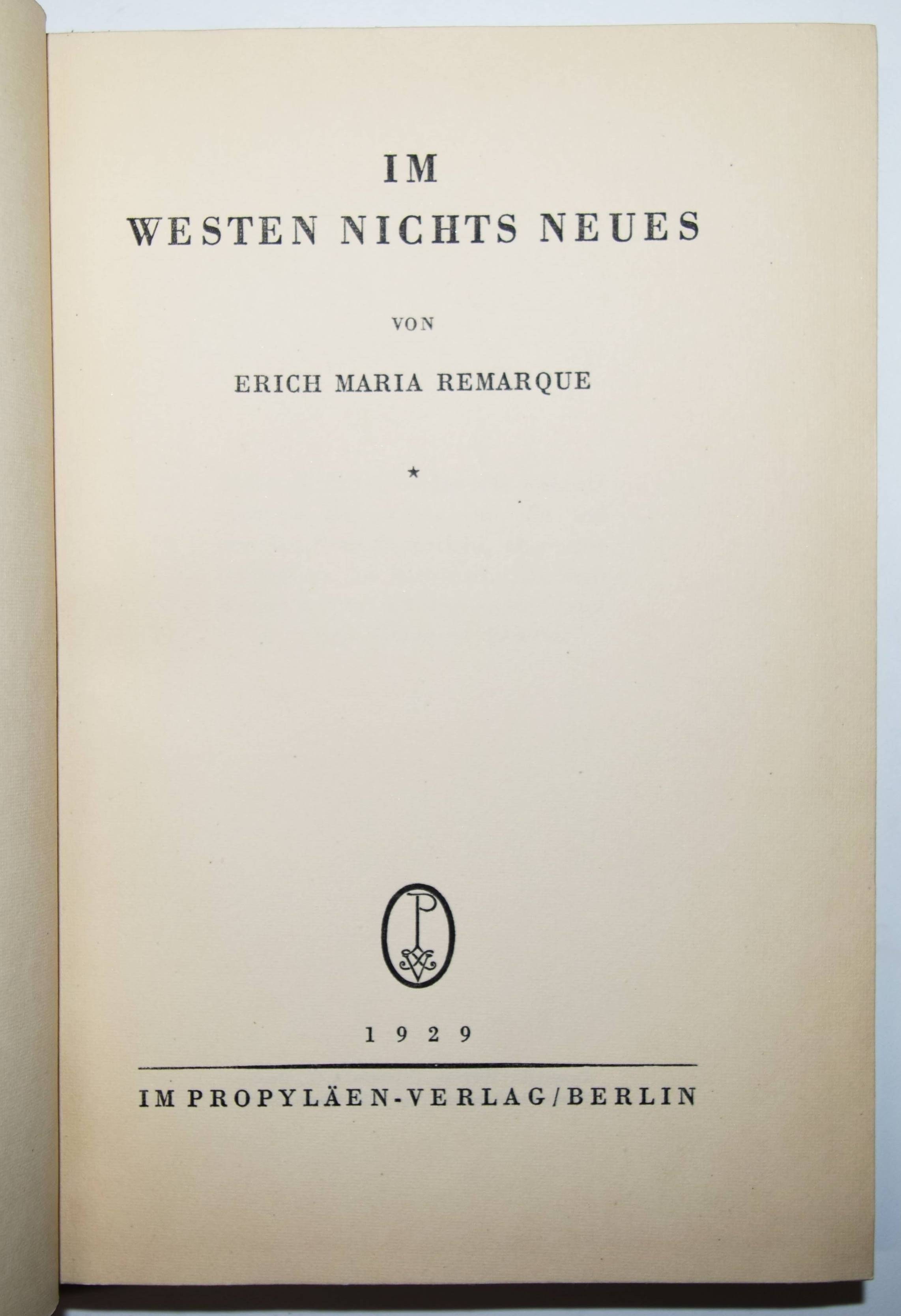 Remarque, Erich Maria (d. i. Erich Paul Remark). Im Westen nichts Neues. Berlin, Propyläen-Verlag (Ullstein & Co.) 1929. 8°. 287, (1) S. Orig.-Leinenband mit typogr. Schutzumschlag. W.-G.² 3. – Erste Ausgabe des berühmten Anti-Kriegsromans. Zuerst ab November 1928 als Vorabdruck in der Vossischen Zeitung erschienen. – Mit eigenhändigem Brief von E. M. Remarque, Porto Ronco 18. 12. 1935 (lt. Poststempel auf dem beil. Umschlag) an den befreundeten Verleger im Londoner Exil Lothar Mohrenwitz (1886-1960). „Alter, guter Baron, ich bin auf dem Sprunge, – morgen oder übermorgen nach Paris, Hotel Raphael, Av. Kléber. Habe kurz entschlossen alles gemordet oder verheiratet in meinem Buch und werde es Huntington zu Weihnachten überreichen [1936 erschien bei Gyldendal in Kopenhagen die erste Buchausgabe von „Drei Kameraden“]. Möglicherweise komme ich auf 2-3 Tage nach London […] Es wäre großartig, wenn Sie nach Paris kämen; ich bleibe nicht allzu lange. Inzwischen war Homolka hier; er ist jetzt in Nizza, und wir marschieren vereint nunmehr auf Paris, die alte Sehnsucht jedes deutschen Militärs. […] Ihr Tyrann der westlichen Seehälfte. Reichsjägermeister zur See [Quer:] Haltet die alten Traditionen hoch, Baron!“. – „Remarques Buch ist das Denkmal unseres unbekannten Soldaten. Von allen Toten geschrieben“ (Walter von Molo, Umschlagtext). – Schutzumschlag am Kapital unauffällig restauriert, sehr gutes sauberes Exemplar.