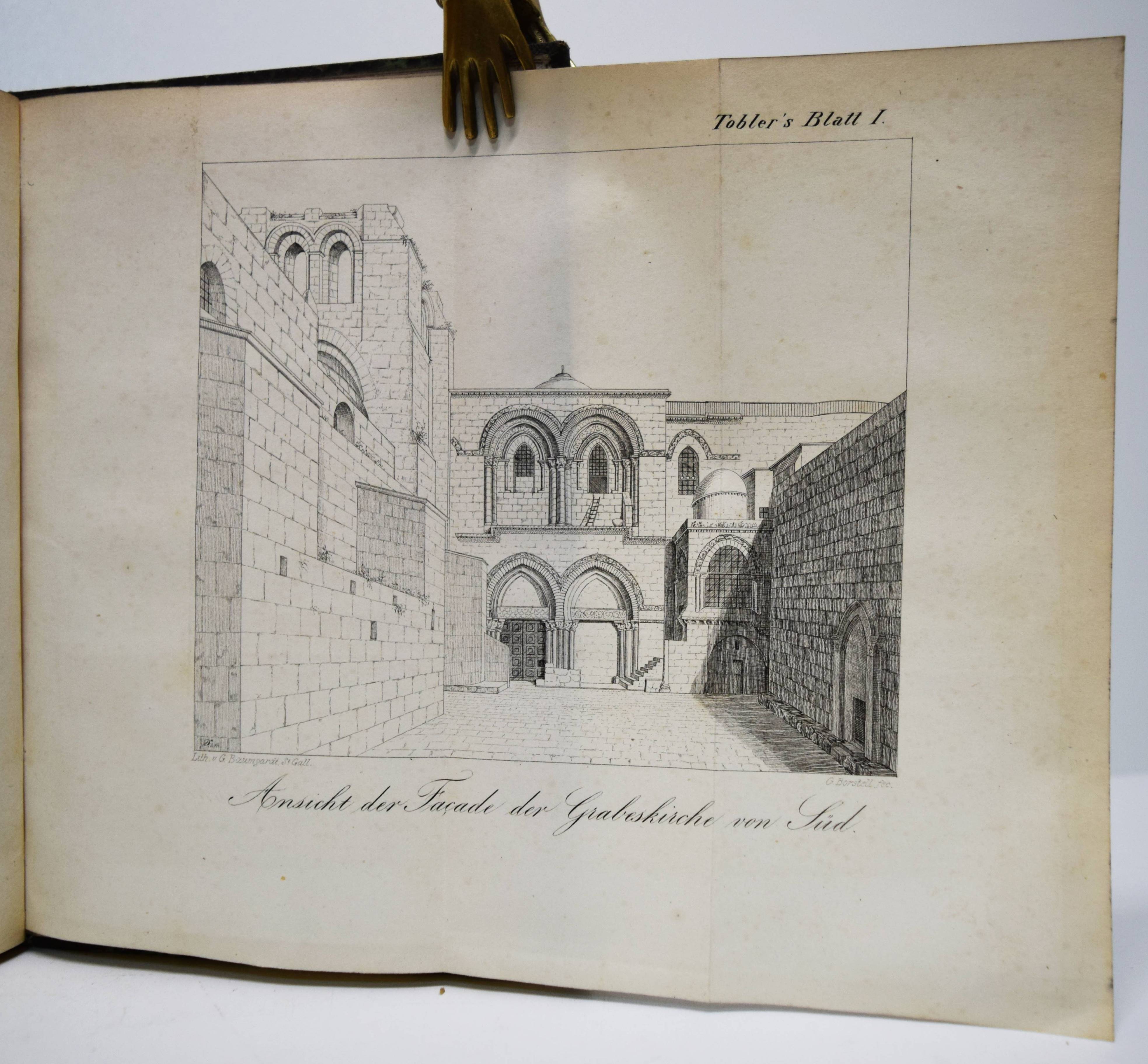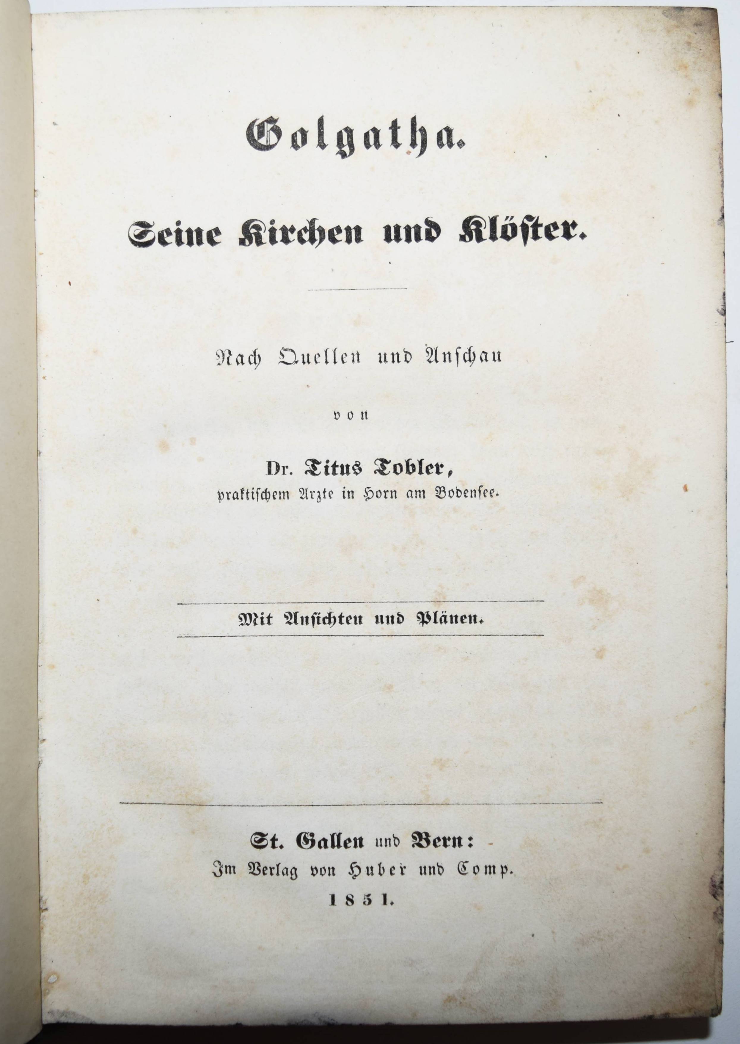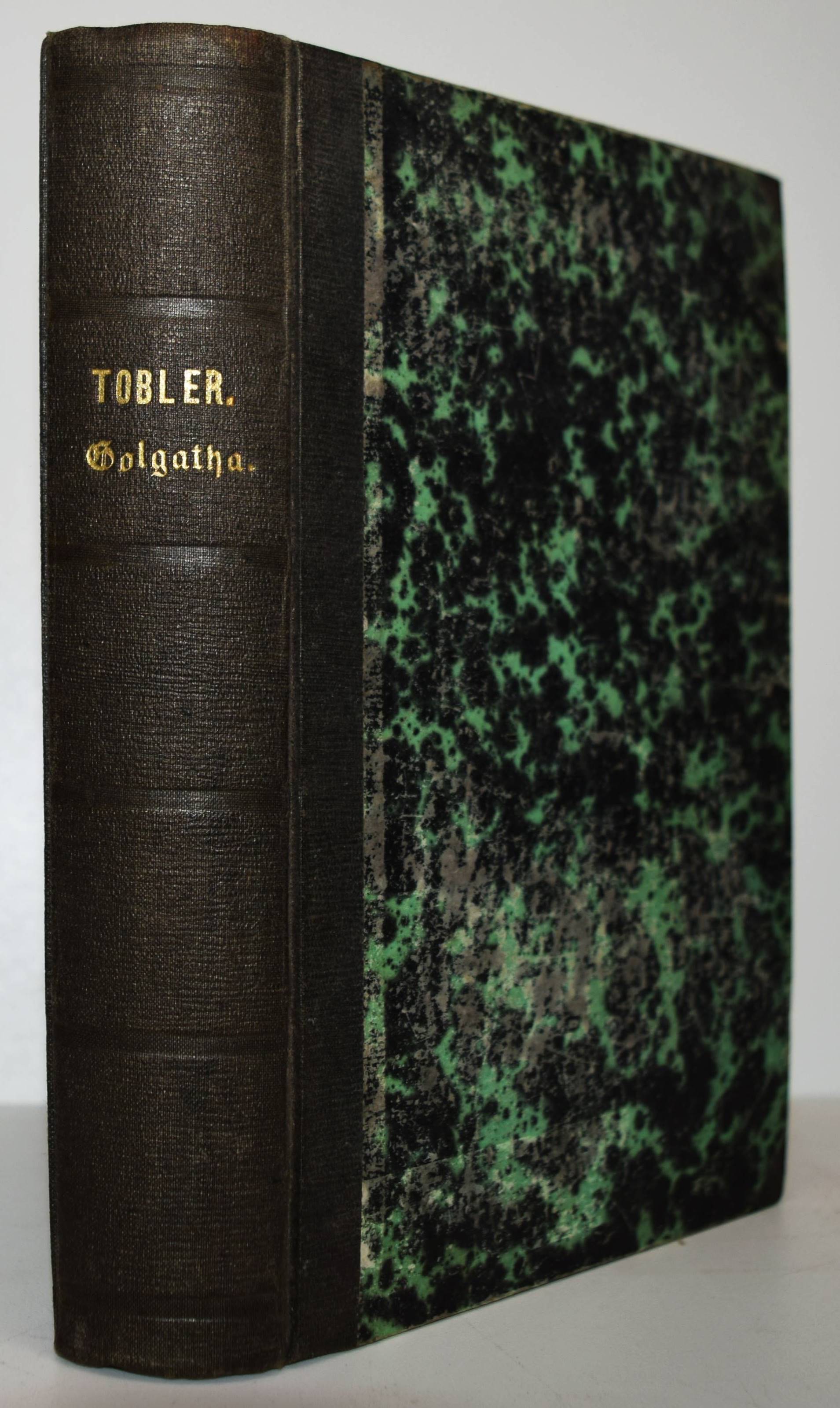 Tobler, Titus. Golgotha. Seine Kirchen und Klöster. Nach Quellen und Anschau. St. Gallen und Bern, Huber und Comp. 1851. 8°. XII, 552 S., [1] Bl., 5 lithogr. Tafeln mit Inschriften, 3 gefaltete lithogr. Tafeln, 1 gefalteter lithogr. Plan und einigen Textholzschnitten. Halbleinenband der Zeit mit goldgepr. Rückentitel. ADB XXXVIII, 395 ff. Röhricht 1823, 21. – Sehr seltene erste Ausgabe. – „Das Resultat seines Forschens an Ort und Stelle und in litterarischen Quellen veröffentlichte er in acht Schriften, die zu den Standard works der Palästinakunde gehören. Mit größter Genauigkeit schildert er das Selbstgeschaute, wobei er reichlich Gelegenheit hat, die Berichte Anderer zu corrigiren. Er hatte keine Gefahr gescheut, um zu einem möglichst klaren Einblick in die thatsächlichen Verhältnisse zu gelangen. So ward es ihm möglich, um nur einige Beispiele hervorzuheben, über die Gräberanlagen bei Jerusalem, über die Höhle Chareitun, über den complicirten Bau der Grabeskirche ganz neues Licht zu verbreiten. Von wichtigen Einzelheiten der Bodengestaltung Jerusalems, von dem Lauf der Gassen und ihren Namen gab er den ersten ganz zuverlässigen Bericht. Geradezu bahnbrechend war T. für eine systematische, die gesammte Ueberlieferung verarbeitende Ortsgeschichte“ (K. Furrer in ADB). – Deckel etwas berieben, Bibliotheksstempel auf den Vorsätzen, stellenweise etwas braunfleckig, sehr gutes Exemplar.