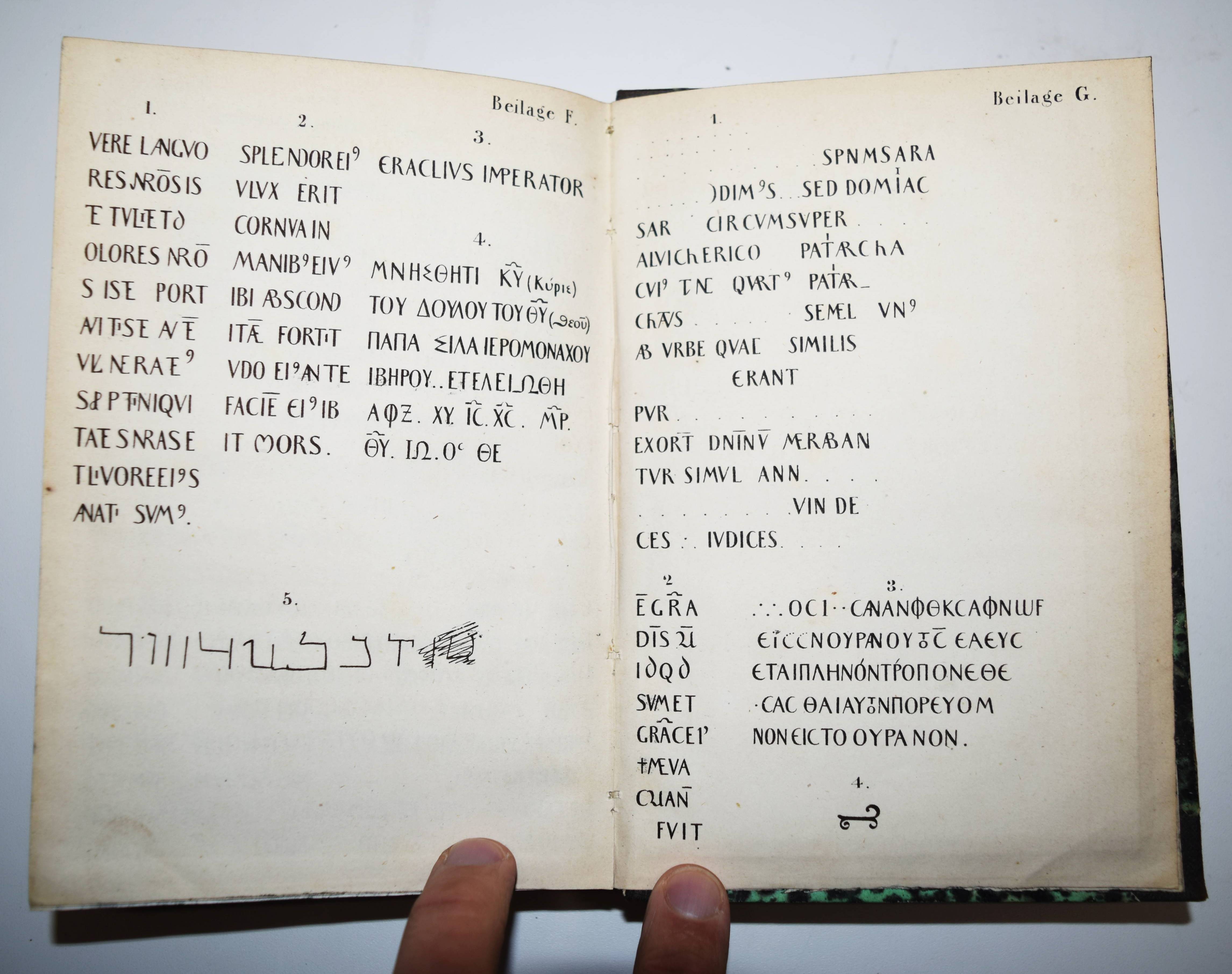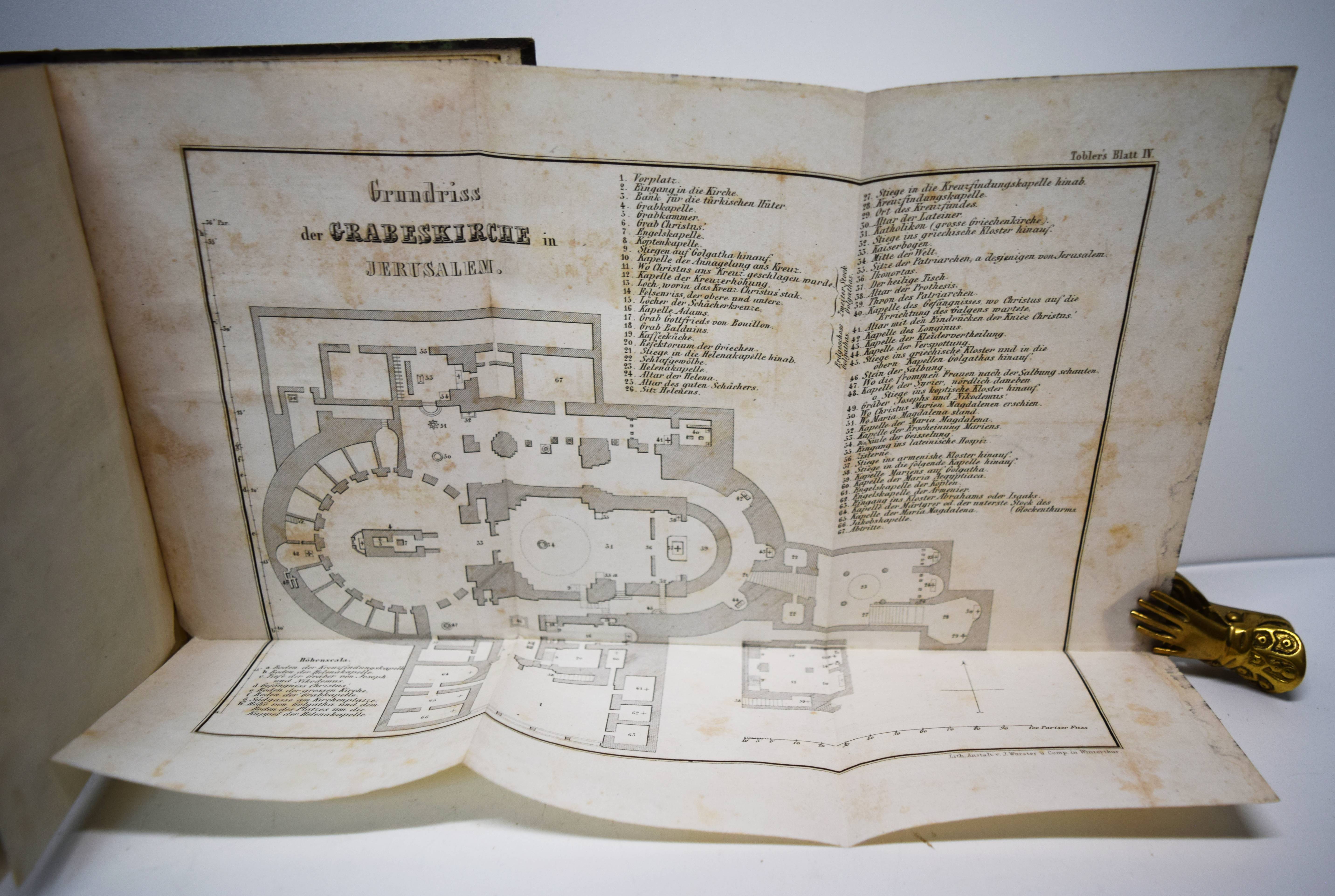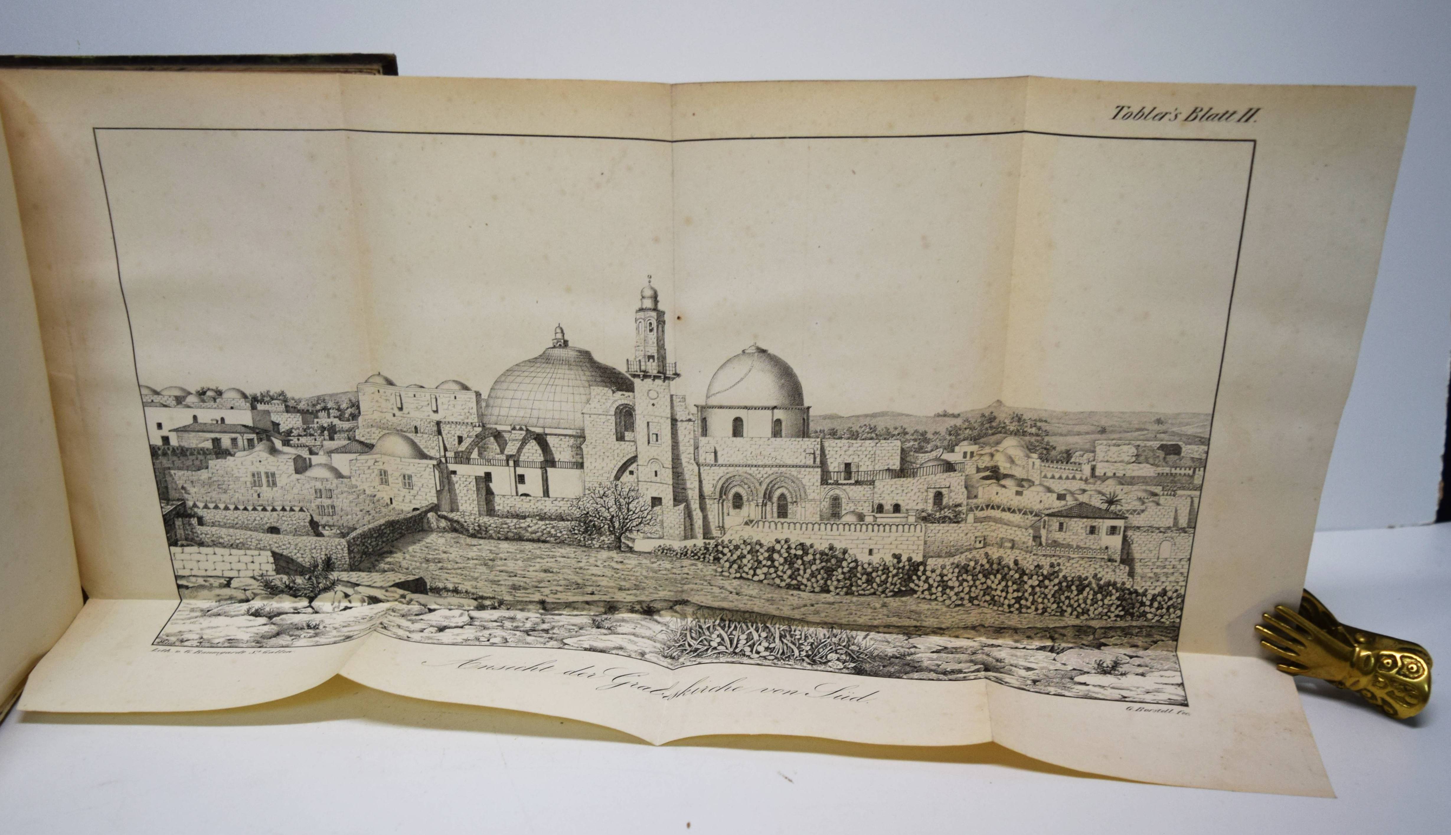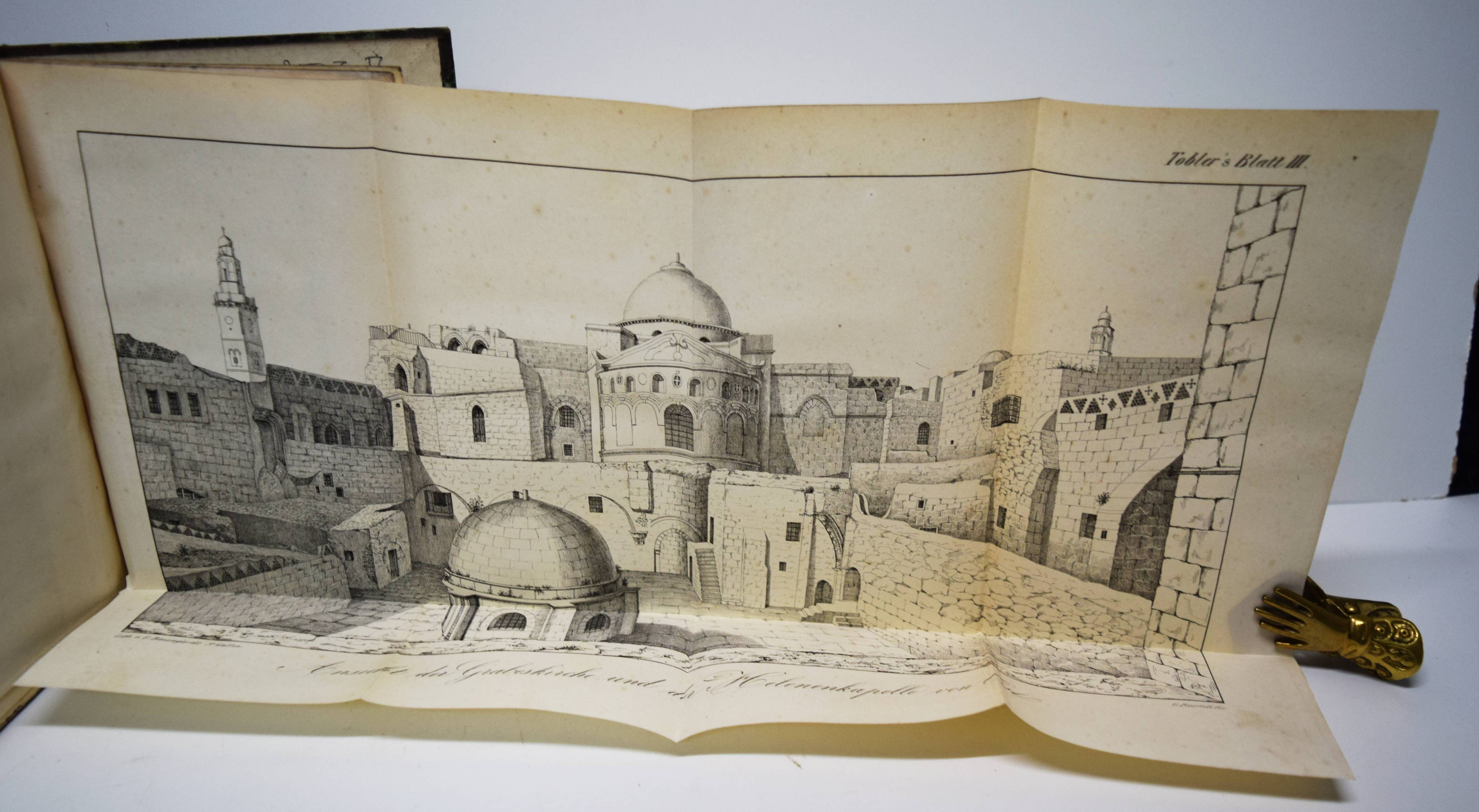 Tobler, Titus. Golgotha. Seine Kirchen und Klöster. Nach Quellen und Anschau. St. Gallen und Bern, Huber und Comp. 1851. 8°. XII, 552 S., [1] Bl., 5 lithogr. Tafeln mit Inschriften, 3 gefaltete lithogr. Tafeln, 1 gefalteter lithogr. Plan und einigen Textholzschnitten. Halbleinenband der Zeit mit goldgepr. Rückentitel. ADB XXXVIII, 395 ff. Röhricht 1823, 21. – Sehr seltene erste Ausgabe. – „Das Resultat seines Forschens an Ort und Stelle und in litterarischen Quellen veröffentlichte er in acht Schriften, die zu den Standard works der Palästinakunde gehören. Mit größter Genauigkeit schildert er das Selbstgeschaute, wobei er reichlich Gelegenheit hat, die Berichte Anderer zu corrigiren. Er hatte keine Gefahr gescheut, um zu einem möglichst klaren Einblick in die thatsächlichen Verhältnisse zu gelangen. So ward es ihm möglich, um nur einige Beispiele hervorzuheben, über die Gräberanlagen bei Jerusalem, über die Höhle Chareitun, über den complicirten Bau der Grabeskirche ganz neues Licht zu verbreiten. Von wichtigen Einzelheiten der Bodengestaltung Jerusalems, von dem Lauf der Gassen und ihren Namen gab er den ersten ganz zuverlässigen Bericht. Geradezu bahnbrechend war T. für eine systematische, die gesammte Ueberlieferung verarbeitende Ortsgeschichte“ (K. Furrer in ADB). – Deckel etwas berieben, Bibliotheksstempel auf den Vorsätzen, stellenweise etwas braunfleckig, sehr gutes Exemplar.