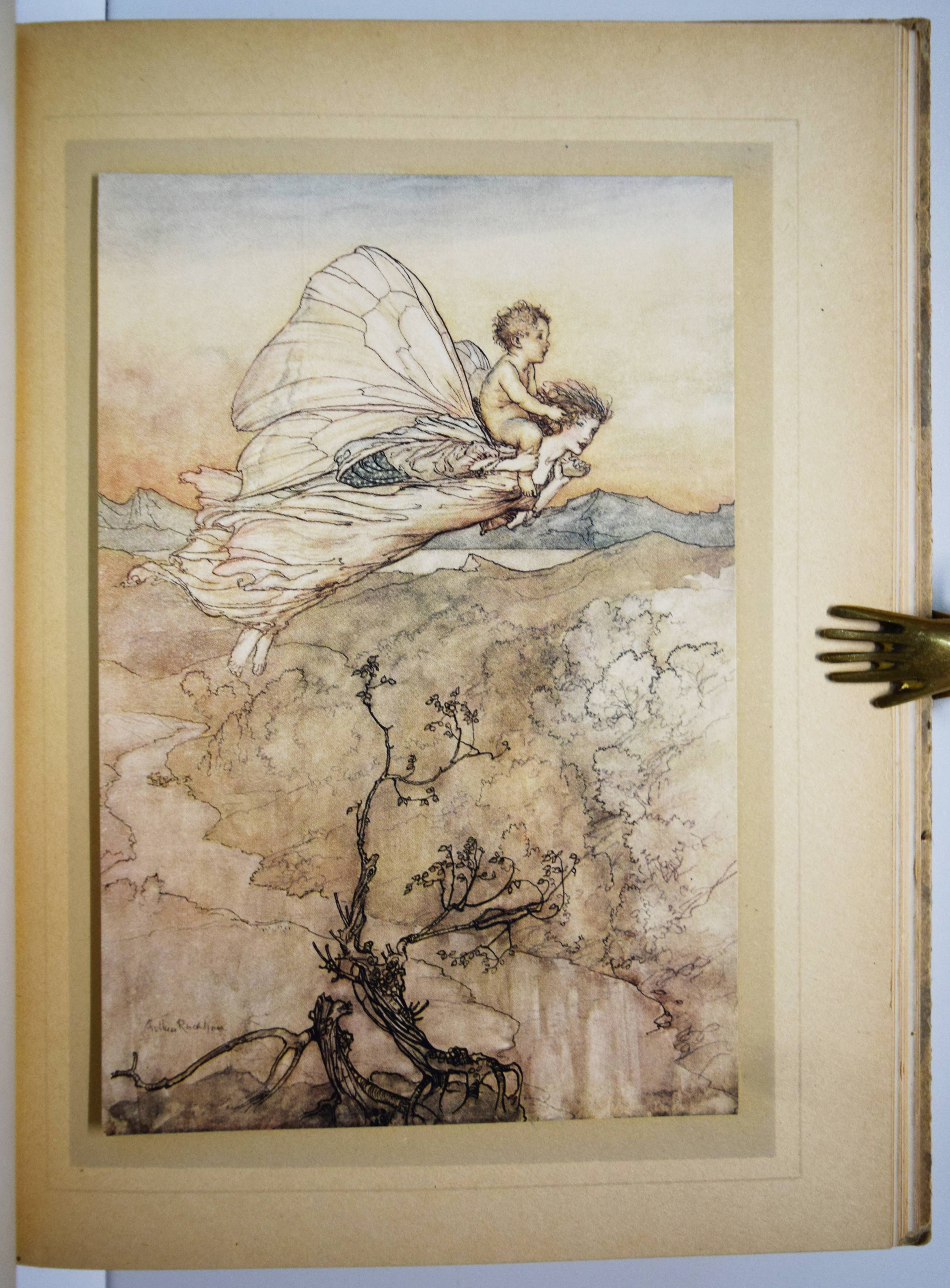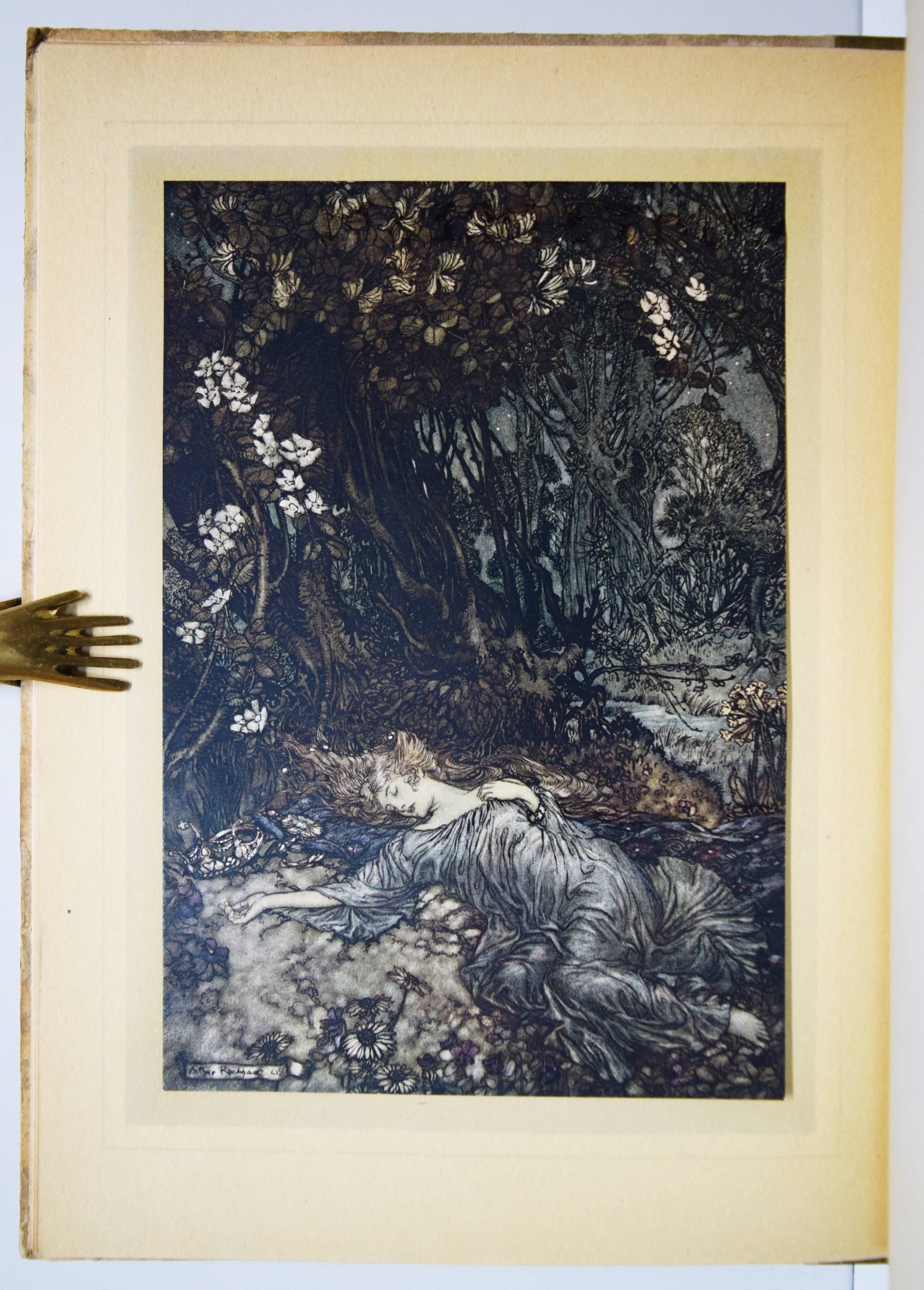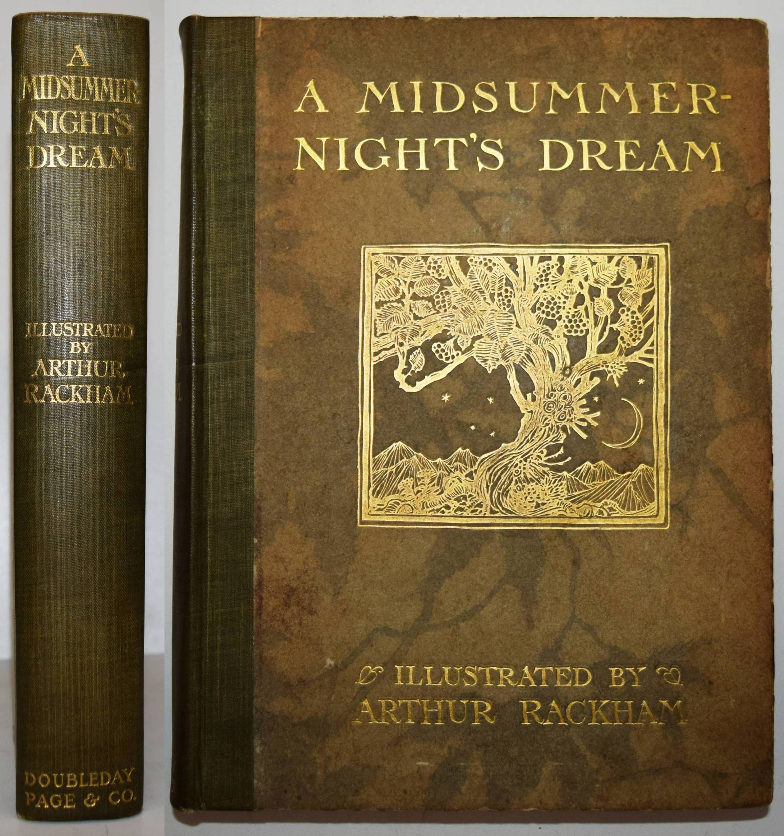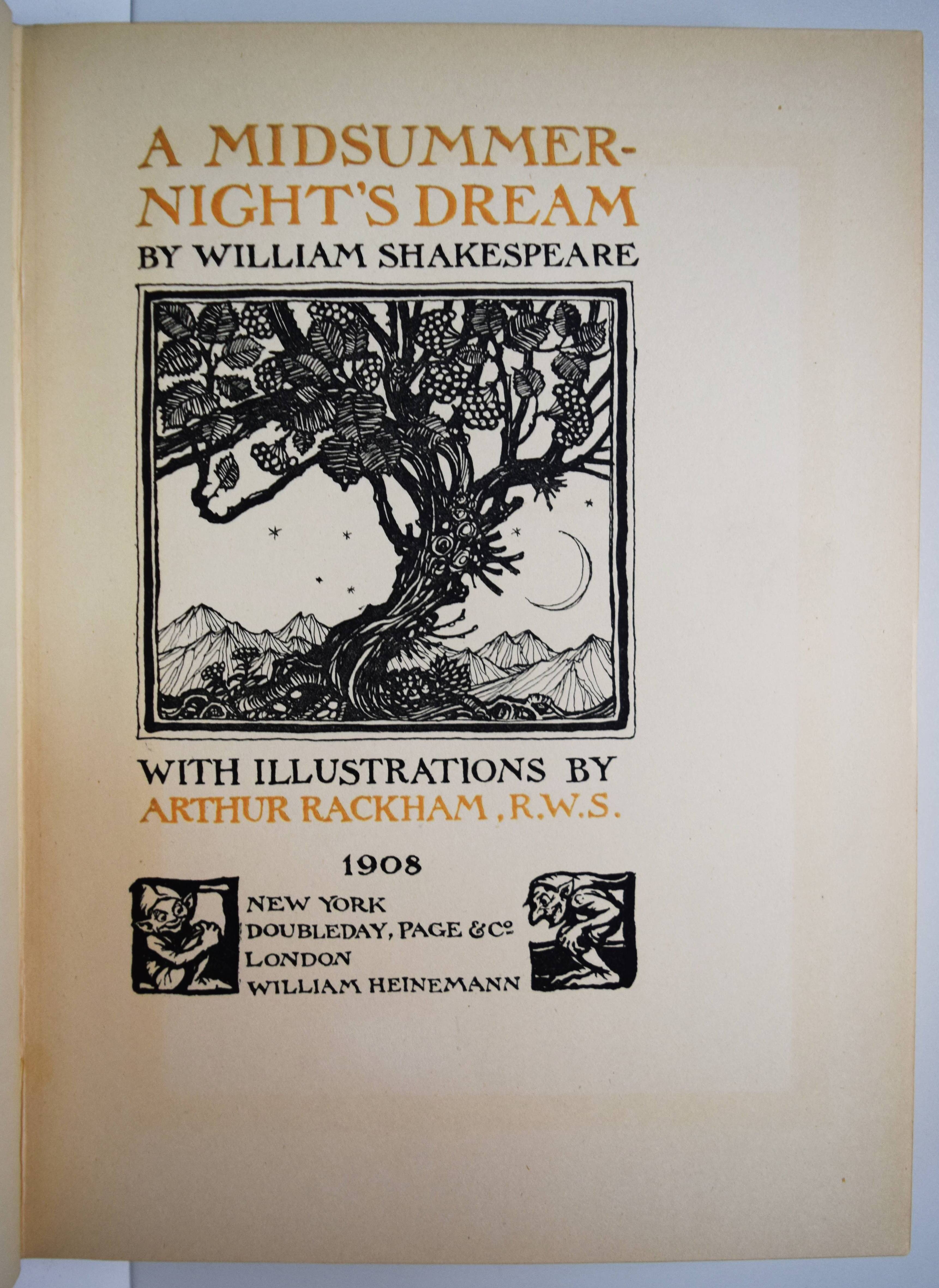 Shakespeare, William. A Midsummer-Night’s Dream. With Illustrations by Arthur Rackham. London, William Heinemann and New York, Doubleday, Page & Co. 1908. Gr.-8° (25,5 x 18,5 cm.). 134, (2) S. mit illustr. Titel und 40 mont. Farbtafeln sowie Jugendstil-Buchschmuck. Olivgrüner Orig.-Halbleinenband mit goldgepr. Rücken- und Deckeltitel, goldgepr. Deckelvignette und Kopfgoldschnitt. Hofstätter, Jugendstil S. 91 (mit Abb. S. 89). Latimore/ Haskell S. 32. Riall, S. 87. Rota S. 168. Vgl. Braesel 85 (deutsche Ausgabe). – Erste Ausgabe mit Rackhams Illustrationen. – „Der ‚Sommernachtstraum‘ bildete eines der Lieblingsthemen Rackhams, dem er sich viermal widmete. … Die bekannteste Ausgabe bildet der Zyklus, der 1908 publiziert wurde“ (Braesel). – „Subsequent illustrators and stage designers dealing with the play have found it difficult to put Rackham’s images out of their minds“ (G. Ray, Illustrator and the Book in England, S. 330). – Sehr gutes sauberes Exemplar.