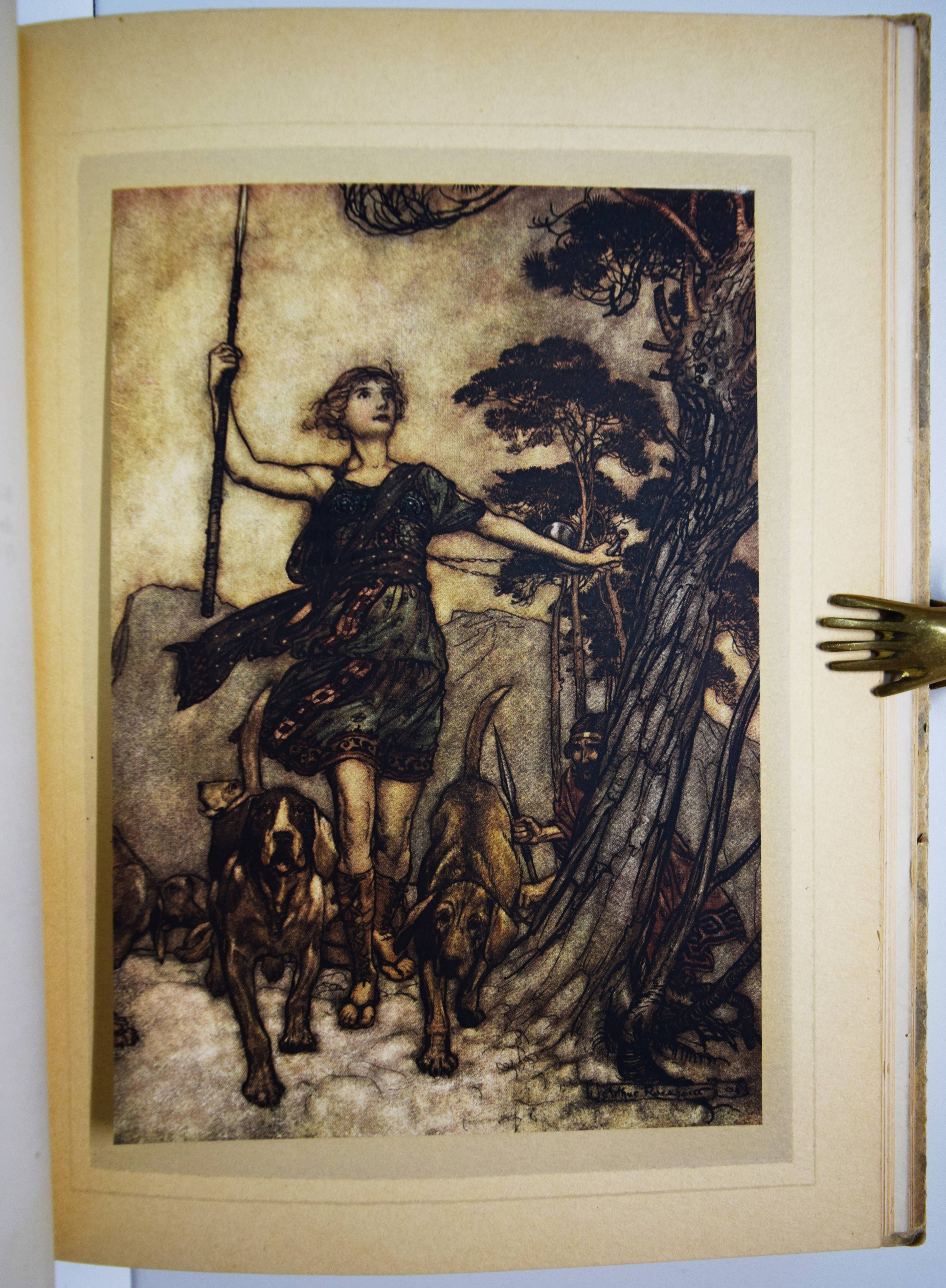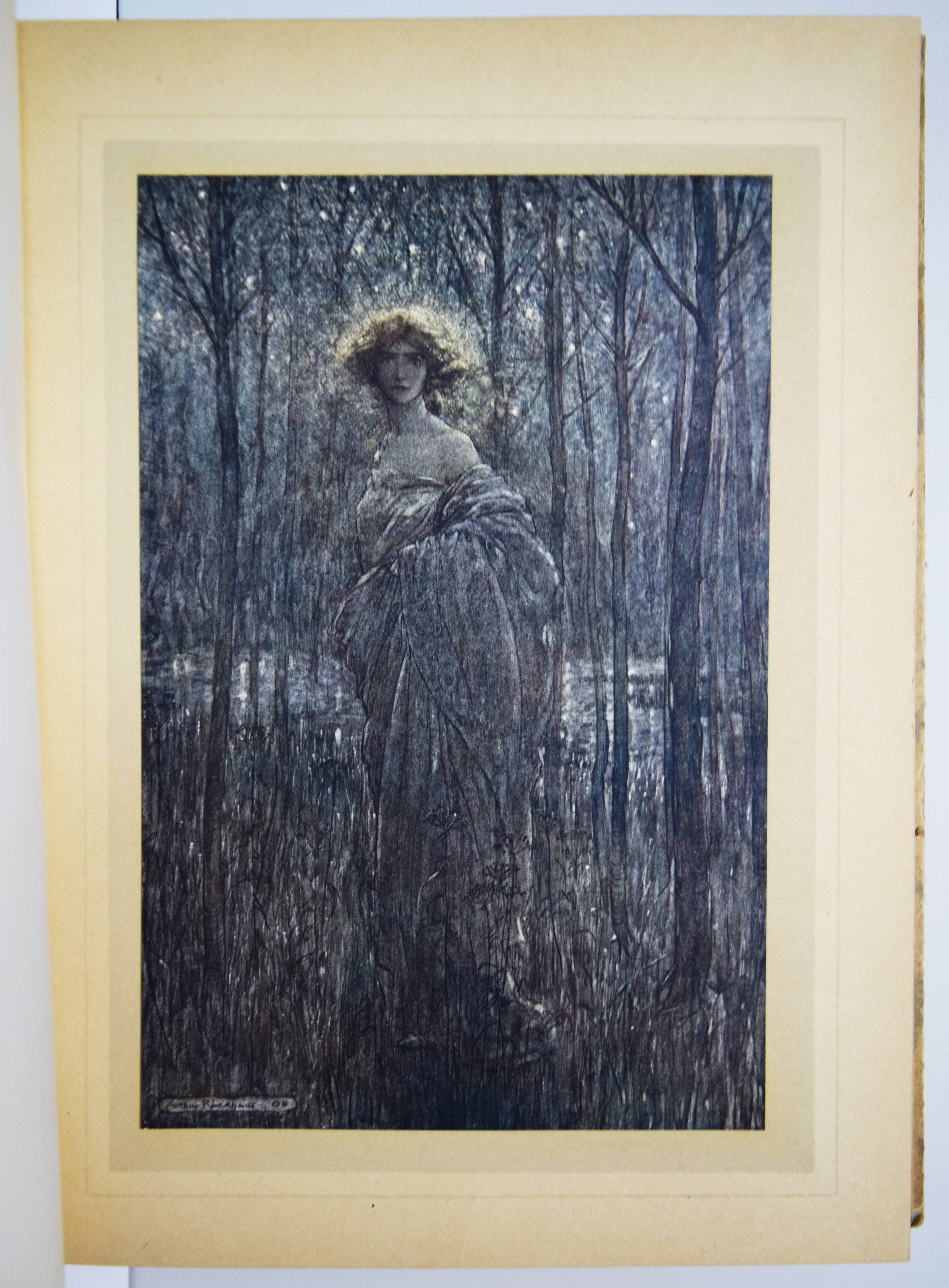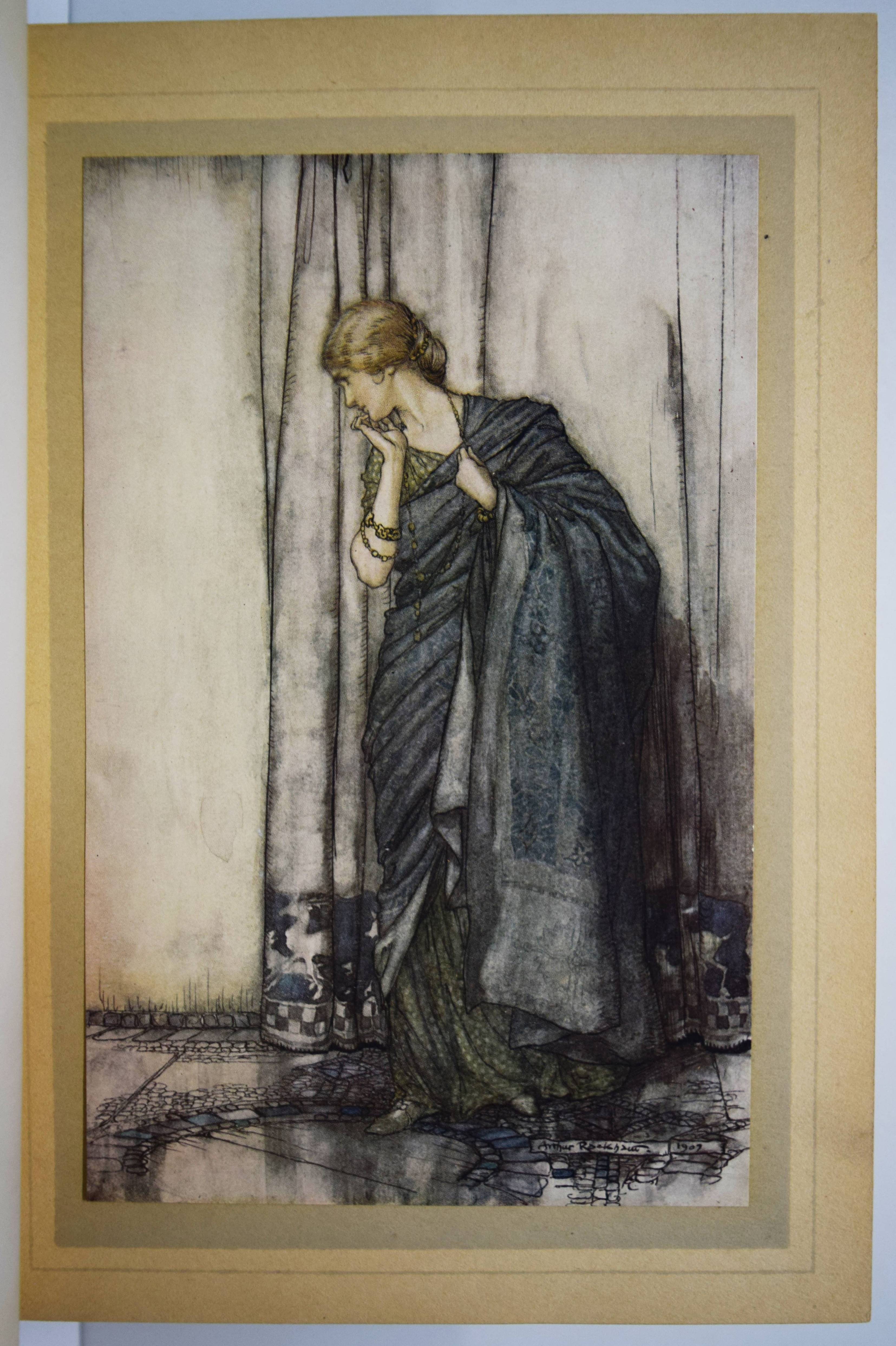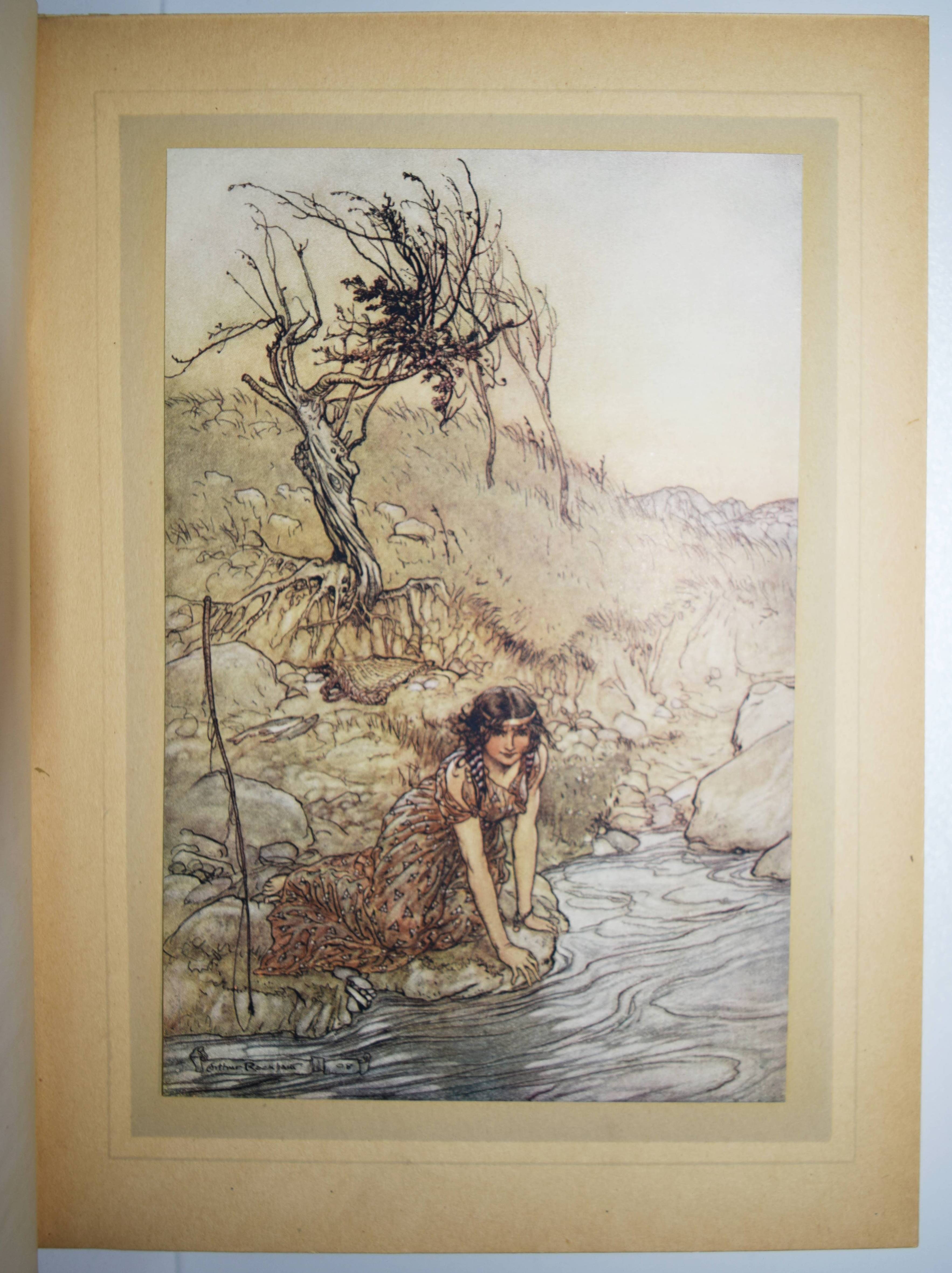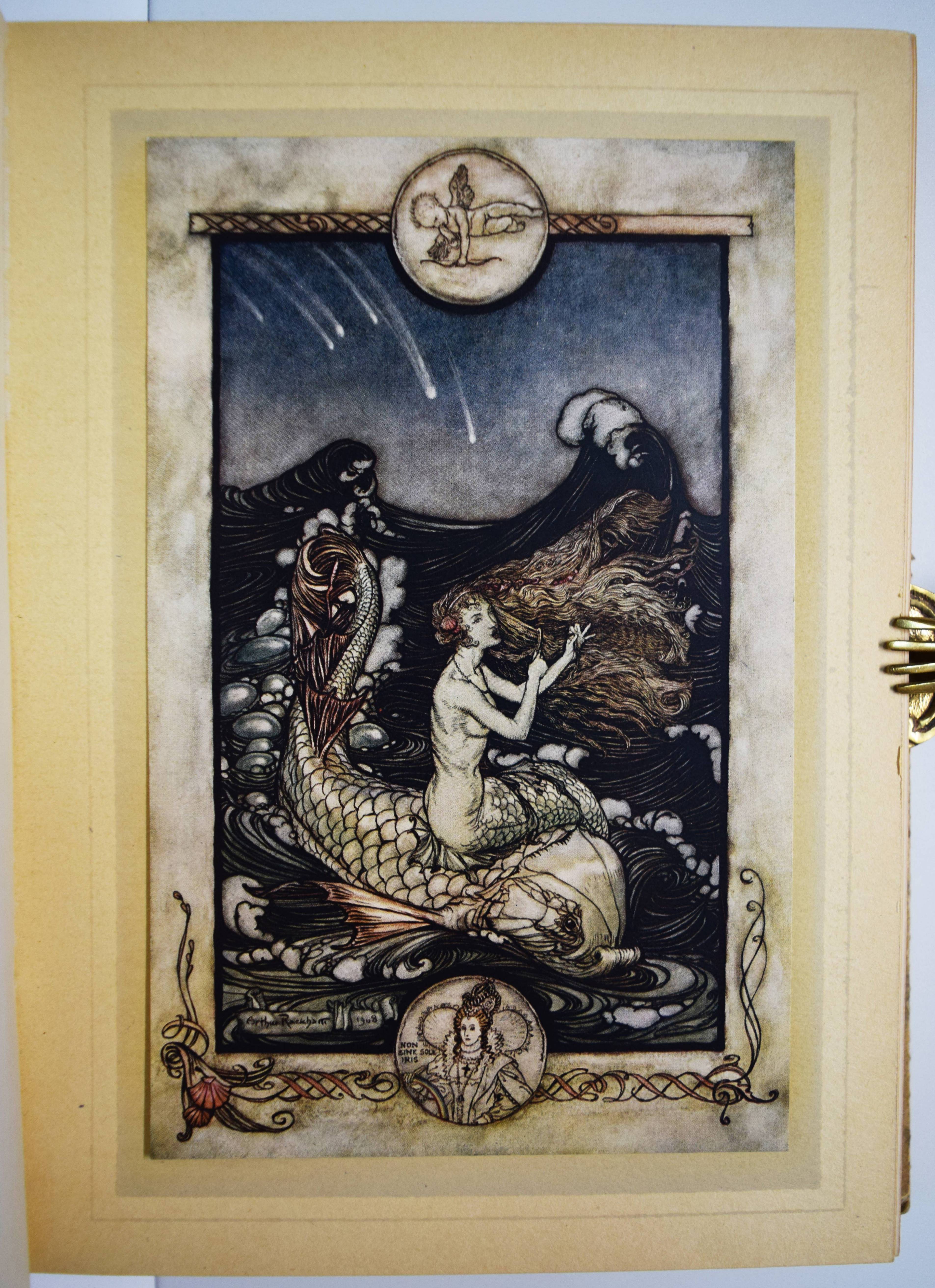 Shakespeare, William. A Midsummer-Night’s Dream. With Illustrations by Arthur Rackham. London, William Heinemann and New York, Doubleday, Page & Co. 1908. Gr.-8° (25,5 x 18,5 cm.). 134, (2) S. mit illustr. Titel und 40 mont. Farbtafeln sowie Jugendstil-Buchschmuck. Olivgrüner Orig.-Halbleinenband mit goldgepr. Rücken- und Deckeltitel, goldgepr. Deckelvignette und Kopfgoldschnitt. Hofstätter, Jugendstil S. 91 (mit Abb. S. 89). Latimore/ Haskell S. 32. Riall, S. 87. Rota S. 168. Vgl. Braesel 85 (deutsche Ausgabe). – Erste Ausgabe mit Rackhams Illustrationen. – „Der ‚Sommernachtstraum‘ bildete eines der Lieblingsthemen Rackhams, dem er sich viermal widmete. … Die bekannteste Ausgabe bildet der Zyklus, der 1908 publiziert wurde“ (Braesel). – „Subsequent illustrators and stage designers dealing with the play have found it difficult to put Rackham’s images out of their minds“ (G. Ray, Illustrator and the Book in England, S. 330). – Sehr gutes sauberes Exemplar.