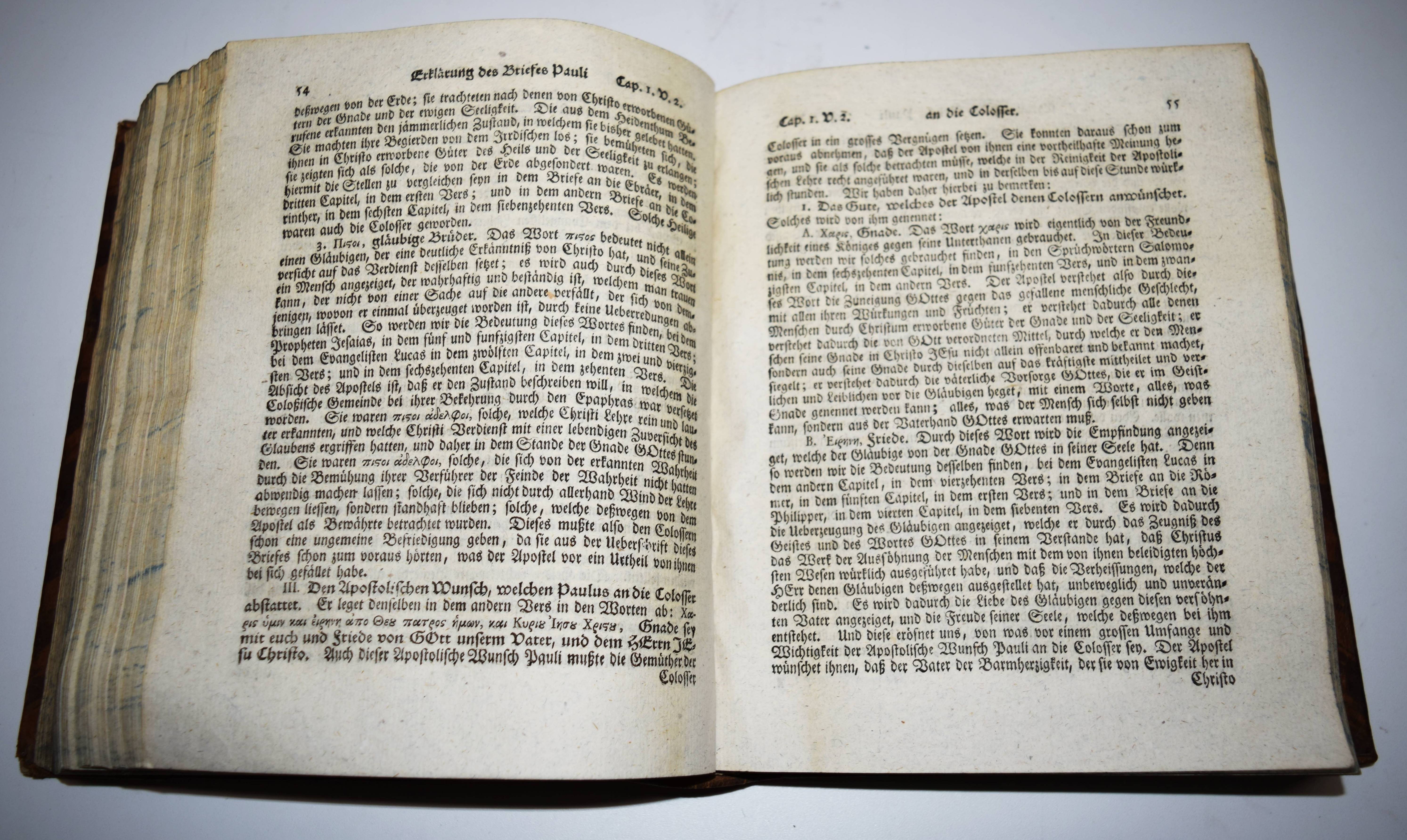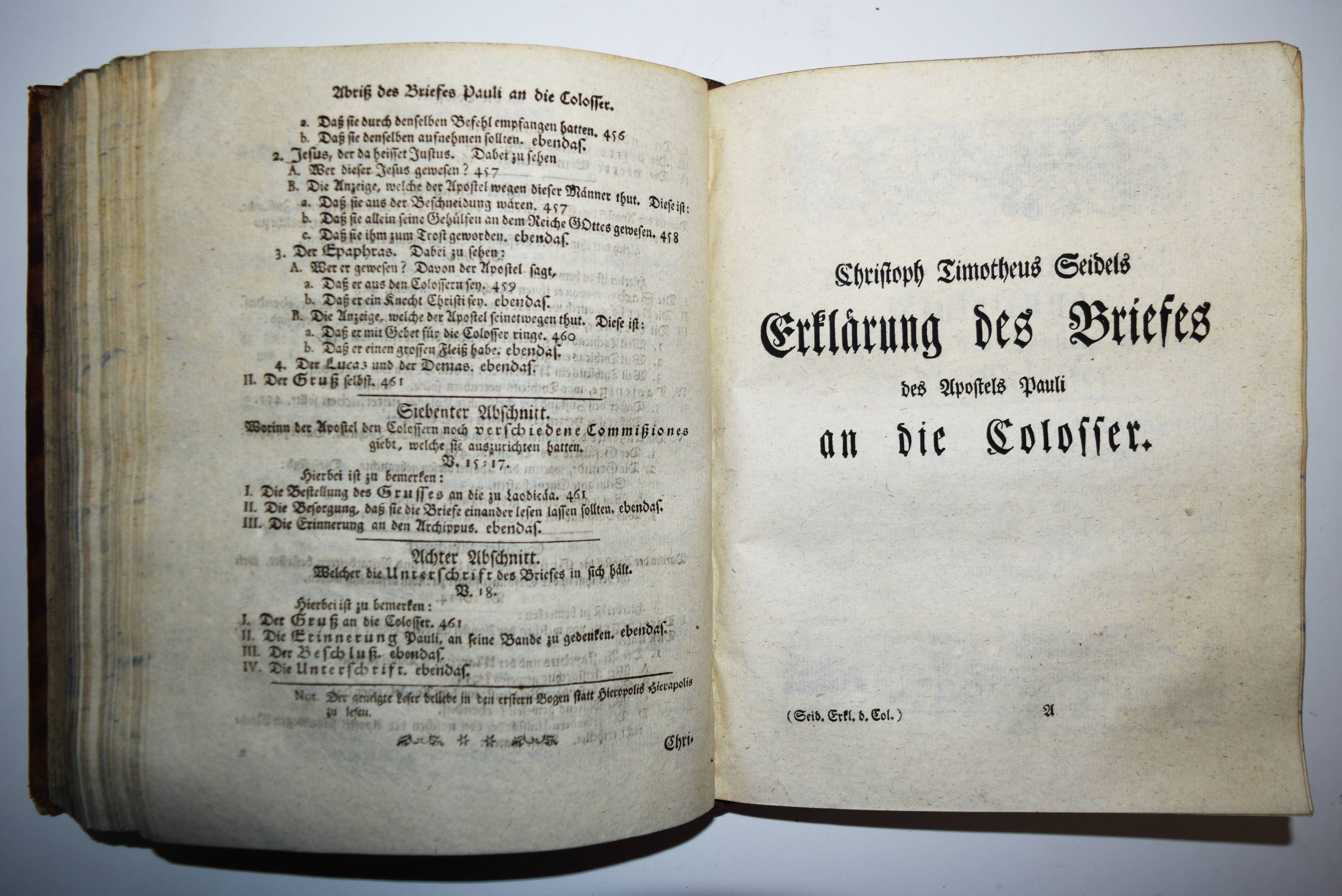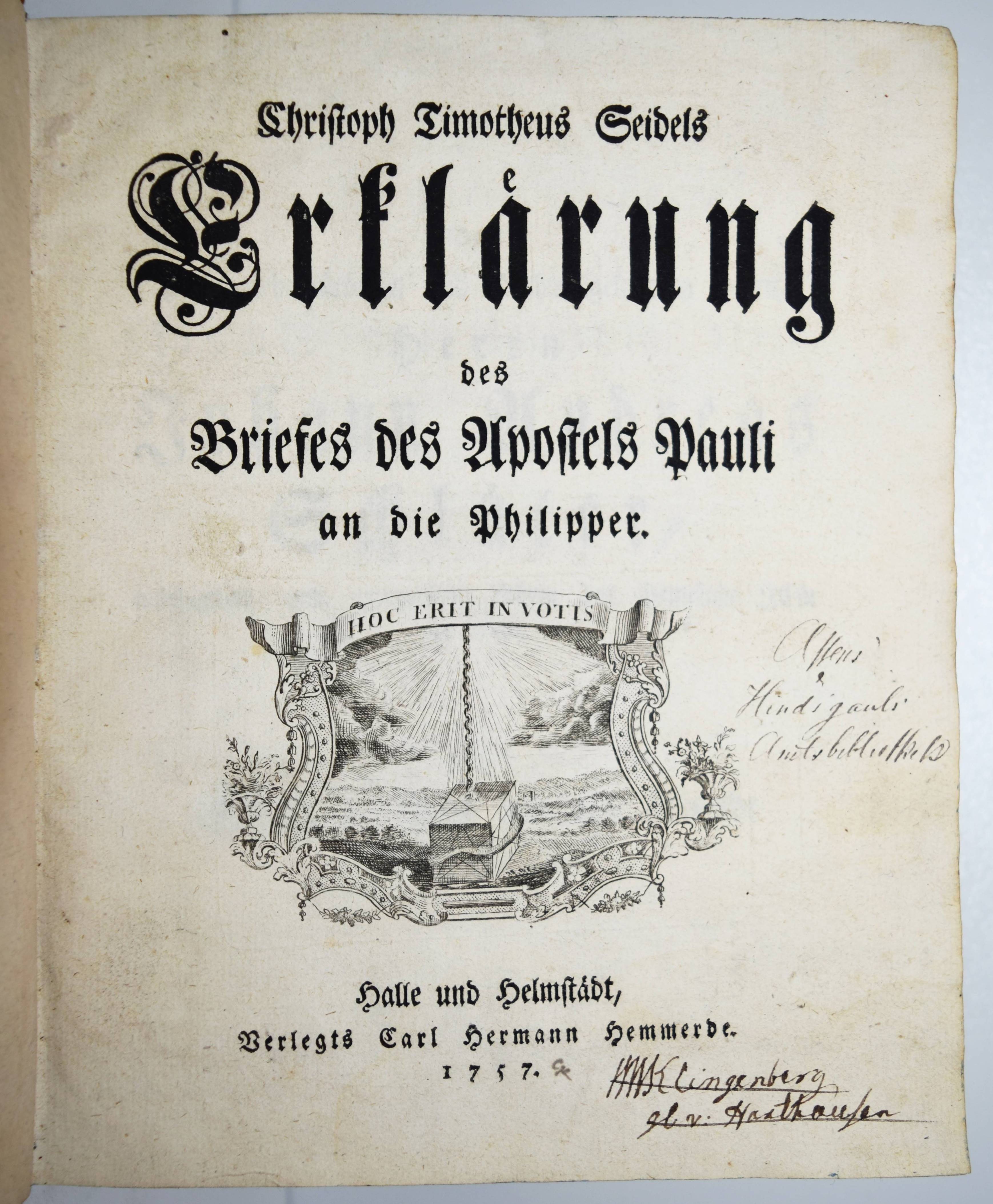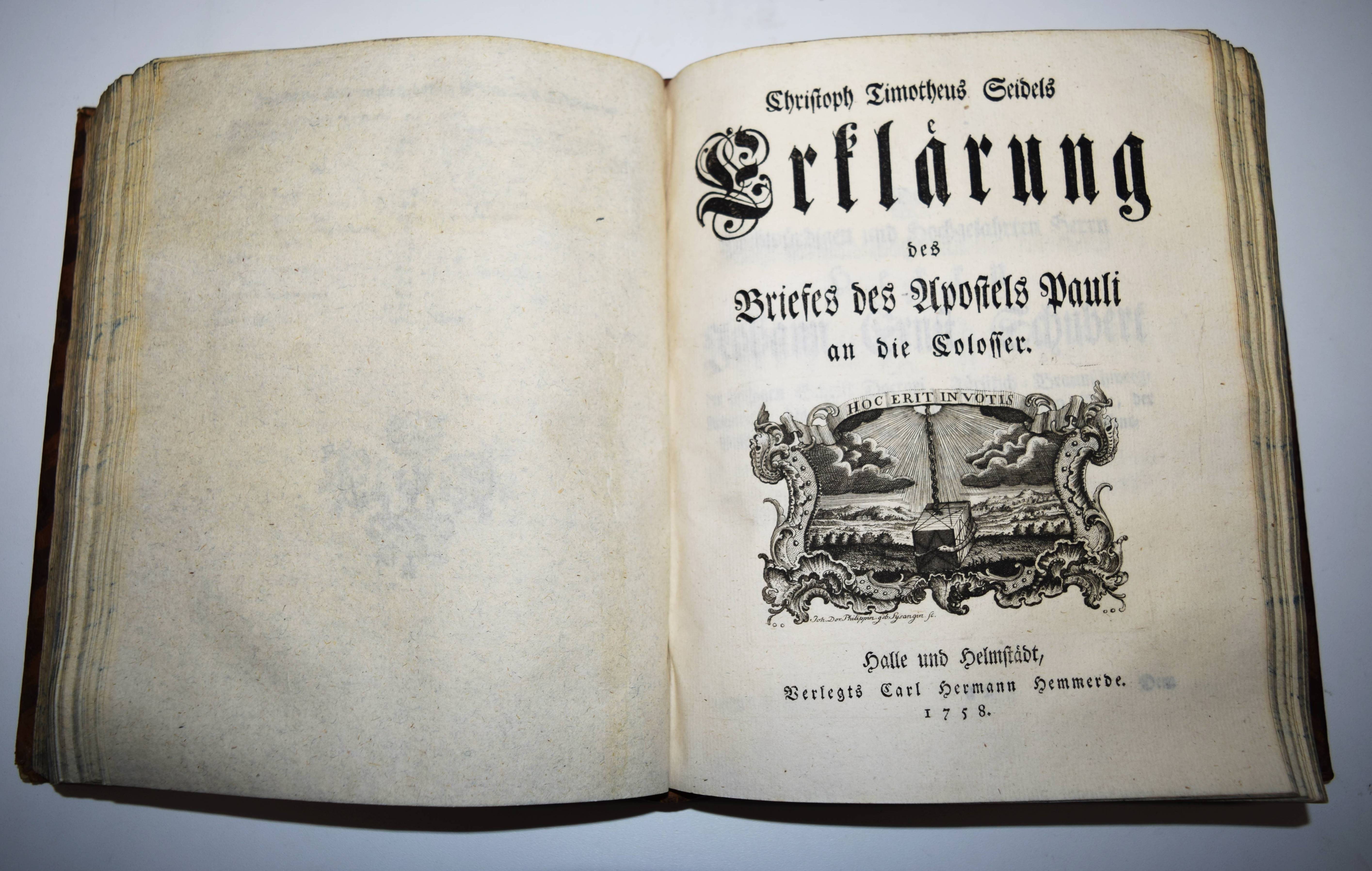 Seidel, Christoph Timotheus. Erklärung des Briefes des Apostels Pauli an die Philipper. Halle und Helmstädt, Carl Hermann Hemmerde 1757. Gr.-8° (22 x 18 cm.). [20] Bl., 469 S., [4] Bl. Kalbslederband der Zeit mit goldgepr. Rückenschild und reicher Rückenvergoldung. ADB XXXIII, 614 ff. VD18 11878746. – Erste Ausgabe. – C. T. Seidel (1703-1758) war seit 1730 Professor für Theologie in Helmstedt. – Einband etwas berieben, Exlibris, Titelblattmit zeitgenöss. Besitzvermerk, gutes dekorativ gebundenes Exemplar.