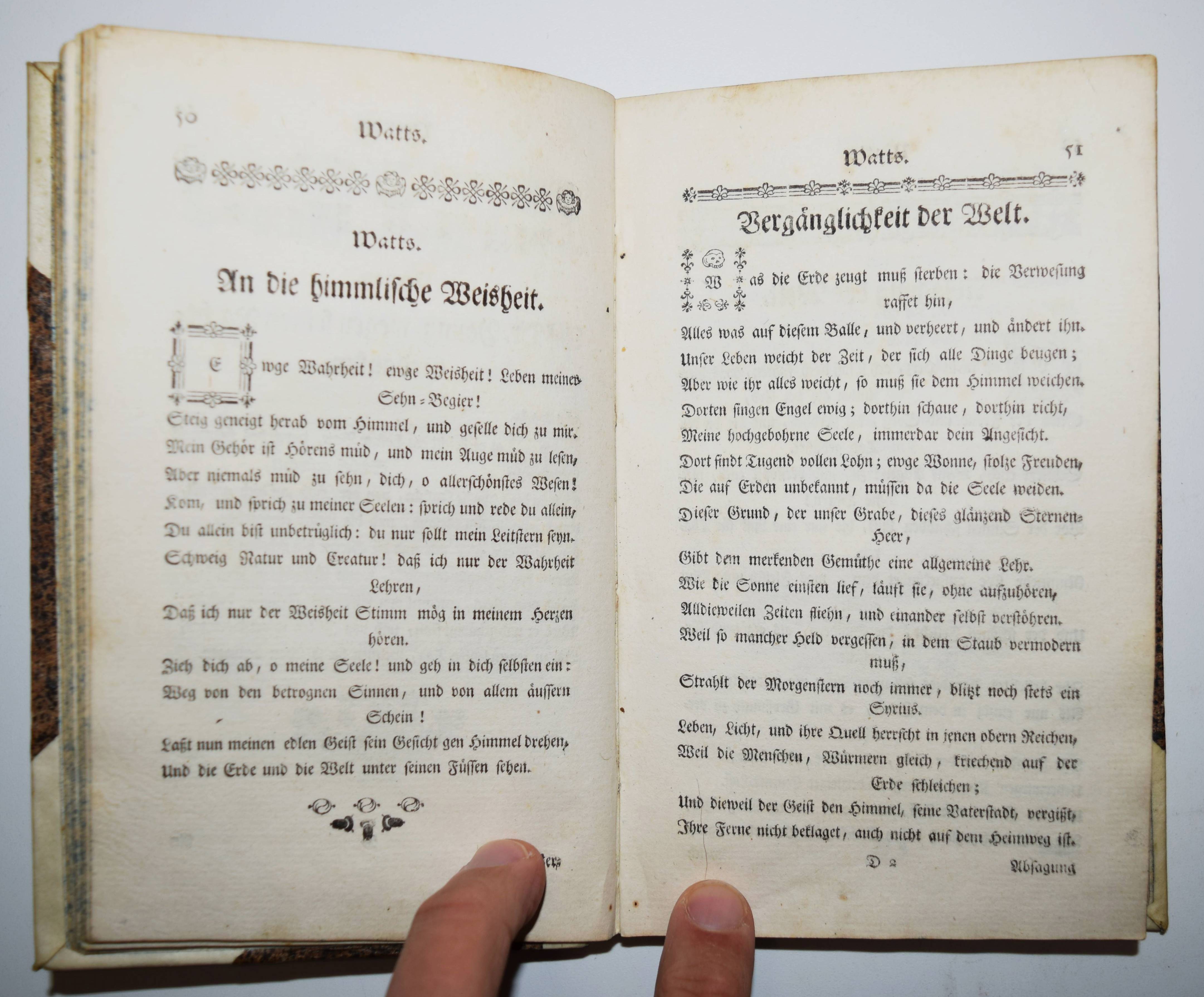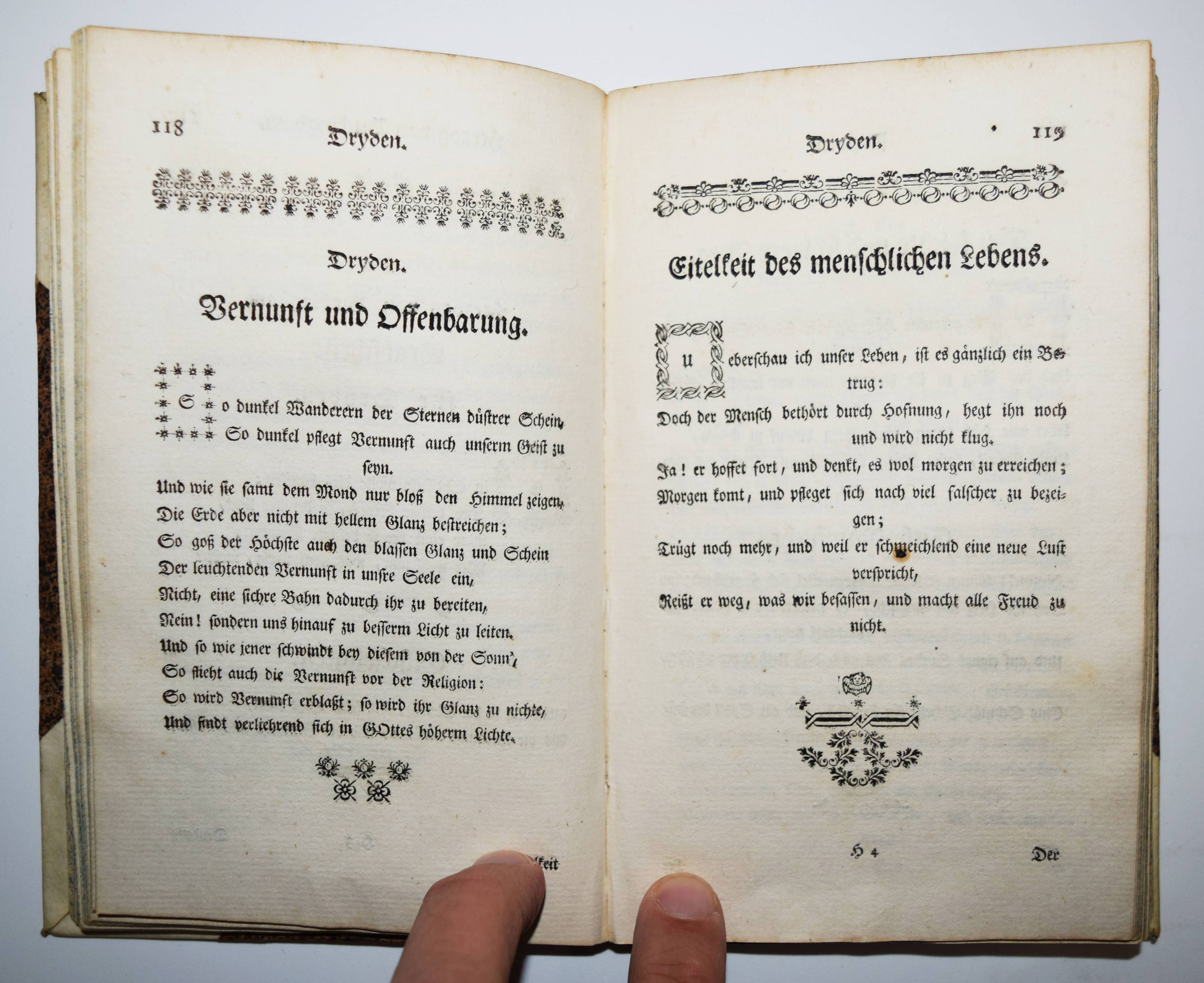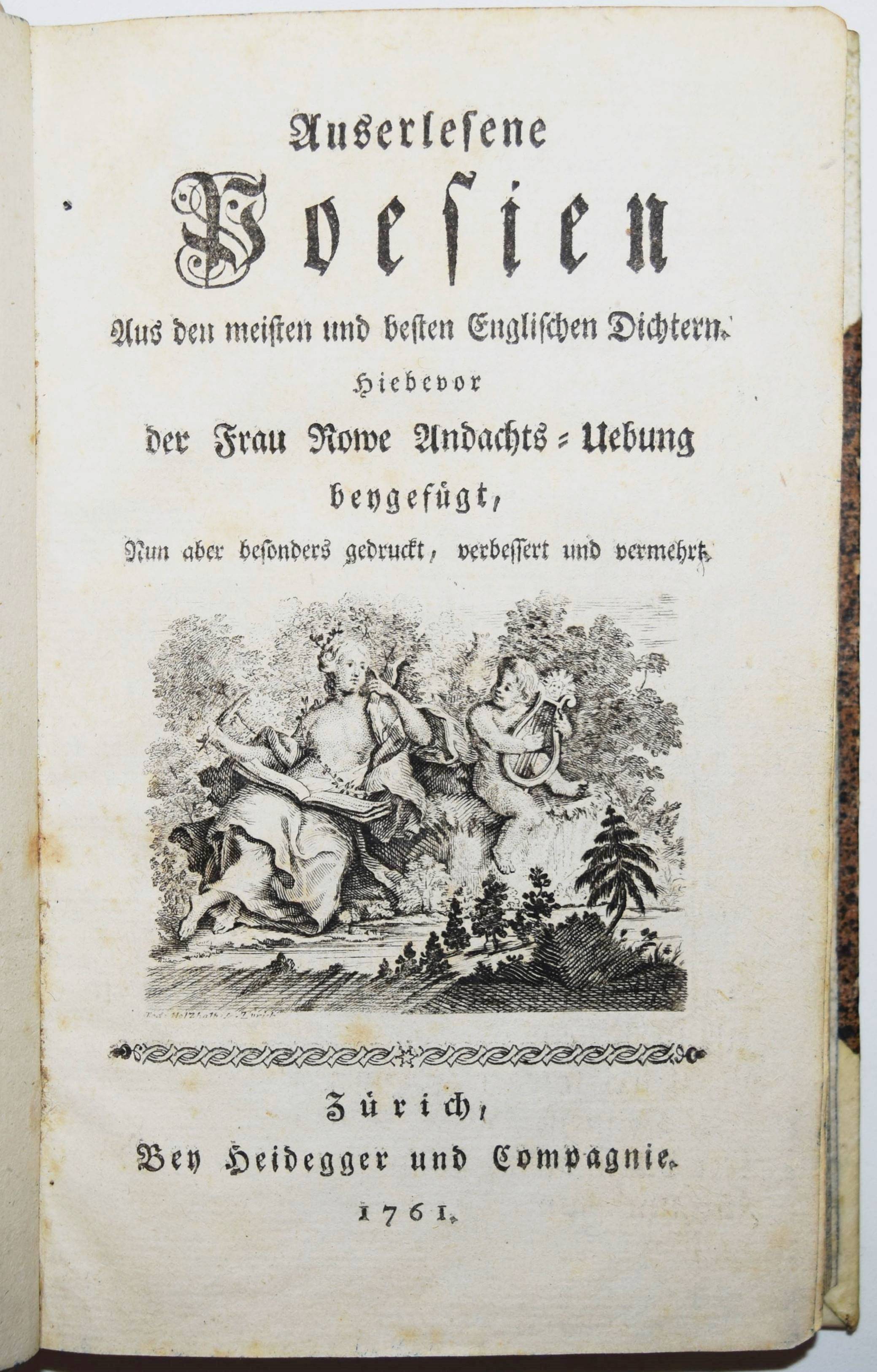 (Burckard, Johann Jakob, Übersetzung). Auserlesene Poesien Aus den meisten und besten englischen Dichtern. Hiebevor der Frau Rowe Andachts-Uebung beygefügt. Nun aber besonders gedruckt, verbessert und vemehrt. Zürich, Heidegger und Compagnie 1761. 8°. 215 S. mit gestoch. Titelvignette. Halbpergamentband der Zeit. Holzmann/Bohatta III, 9211. VD18 11106344. – Erste Ausgabe der englischen Anthologie. Mit Dichtungen von Addison, Baxter, Blackmore, Carter, Cowley, Dryden, Gay, Green, Johnson, Milton, Pope, Rowe, Swift, Tollet, Watts, Young u.v.a. – Nur vereinzelt leicht braunfleckig, sonst sehr gut erhalten.