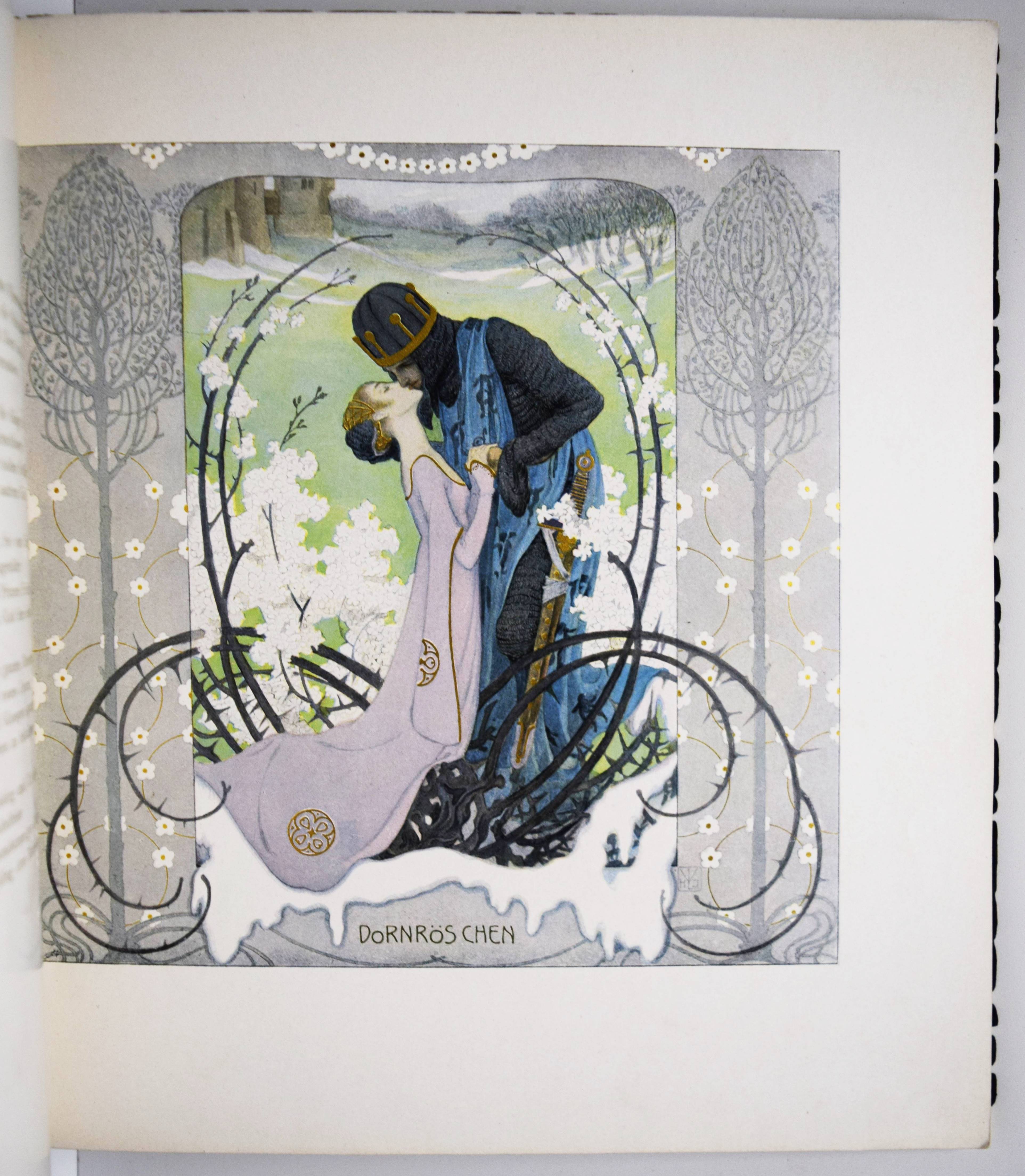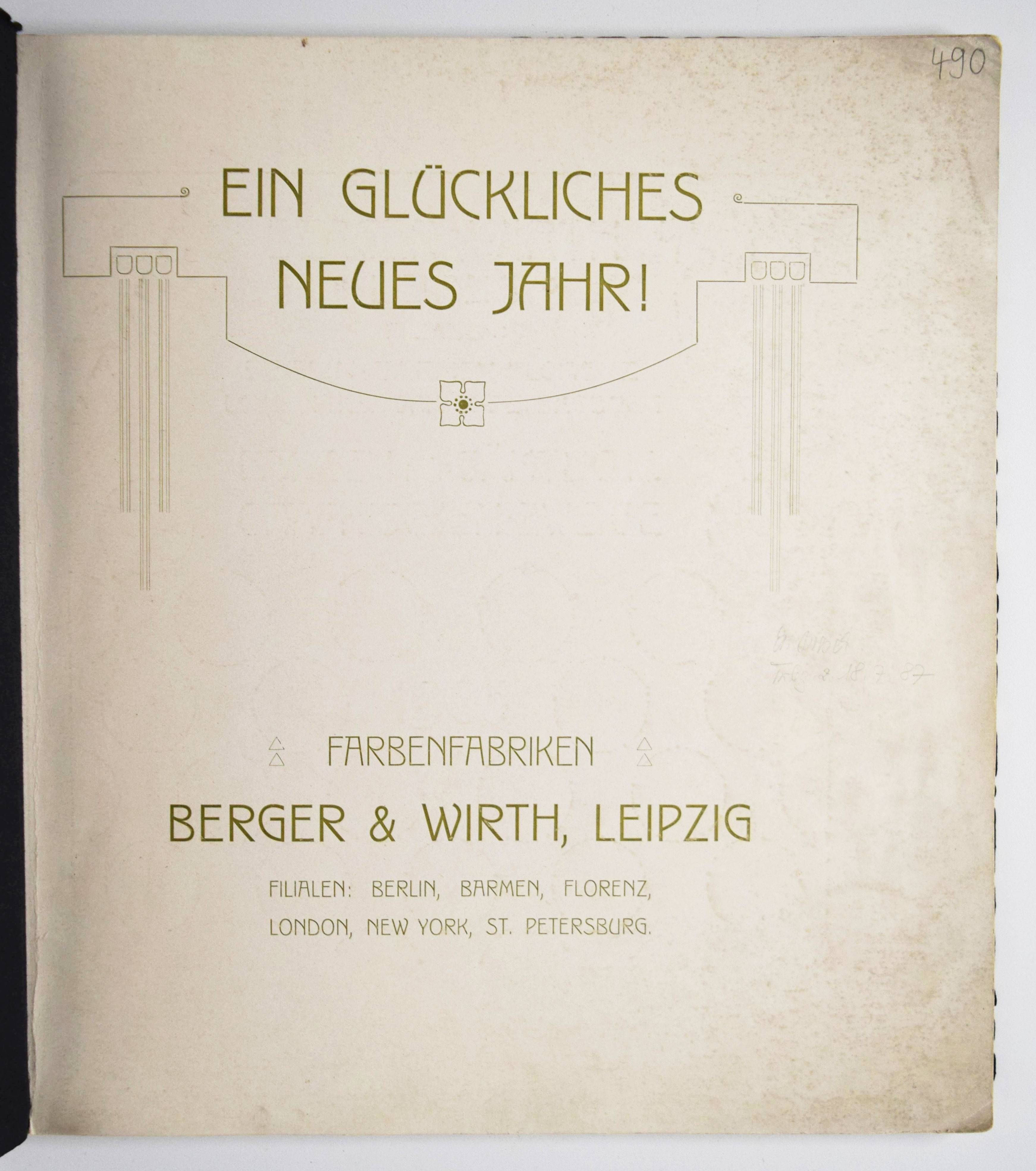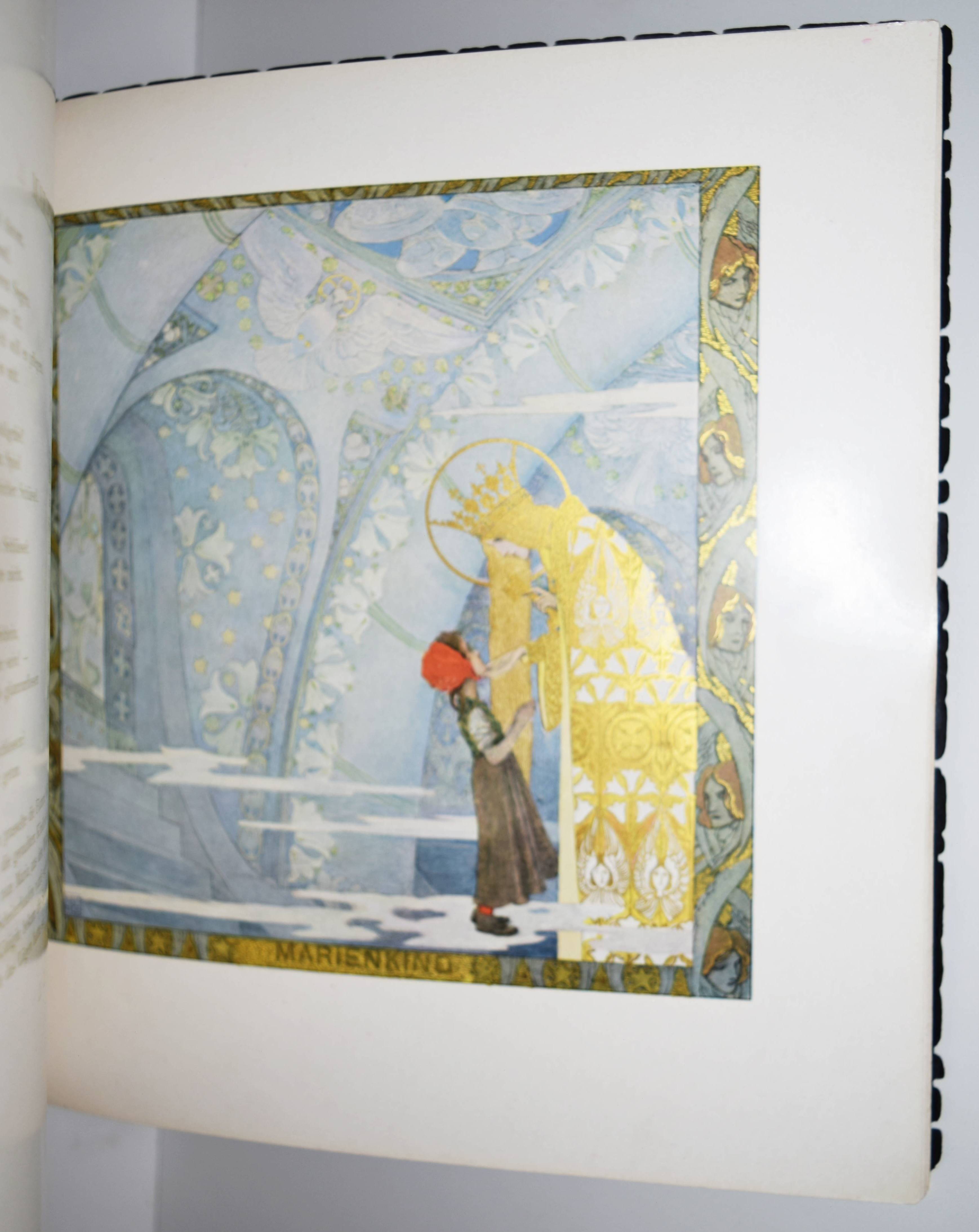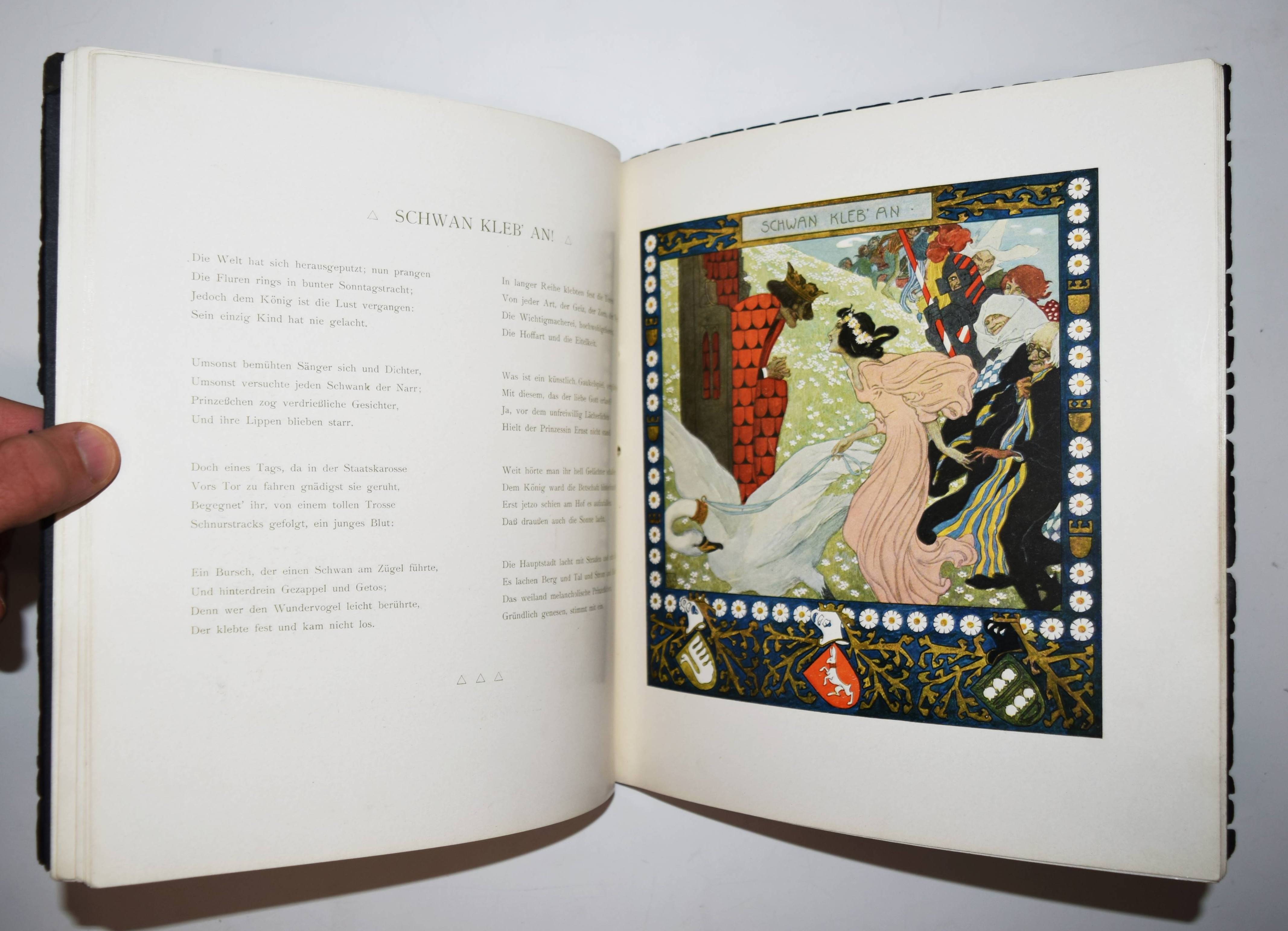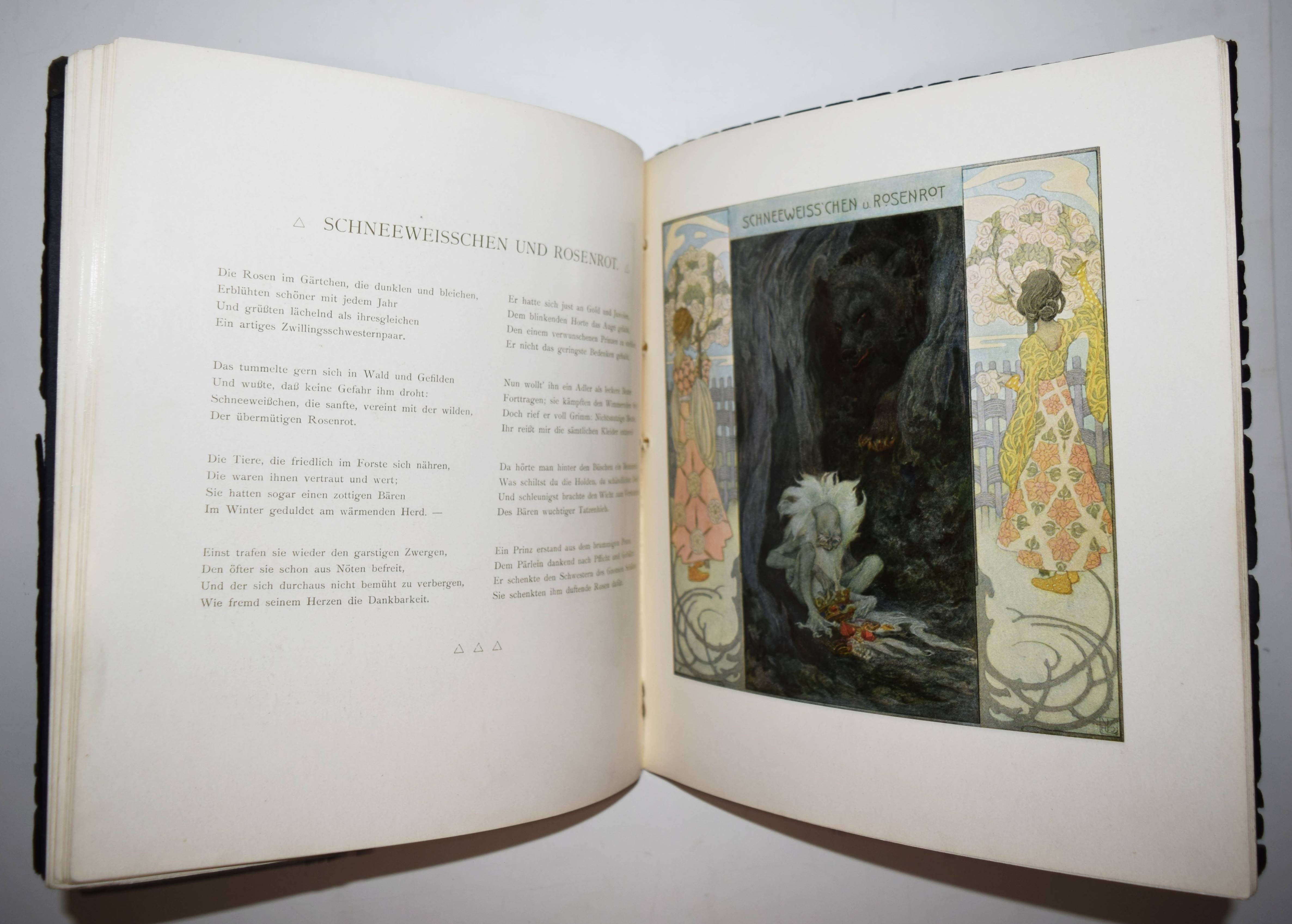 (Fulda, Ludwig. Märchen-Kalender für) 1905. (Gezeichnet von Heinrich Lefler und Joseph Urban). (Werbegabe der Firma:) Berger & Wirth Farbenfabriken, Leipzig. (Wien, Munk 1904). 4°. 25 unbez. Bl. mit 12 Farbtafeln in Autotypie mit Golddruck. Farbig illustr. OKart. mit goldgepr. Deckeltitel (Blockbuch-Bindung von der Leipziger Buchbinderei Gustav Fritzsche). Vgl. Doderer-Müller S.269. LKJ II, 330. Oldenburg, Künstler 139 (mit 2 Abb.). Ries 676,10 u. 937,4. Vgl. Stuck-Villa I, 420 u. II, 247. (Alle normale Ausgabe). – Erster Jahrgang dieser seltenen Wiener Jugendstil-Publikation, hier als Reklame-Bilderbuch, mit in Versform umgedichteten Märchen von Andersen und Grimm. – „Der Kalender erschien auch in den Folgejahren mit gleichbleibendem Bildteil, in der übrigen Ausstattung jedoch variierend… Möglicherweise sind die Illustrationen bereits 1902 entstanden“ (H. Ries). – „Die farbigen Bildtafeln… sind wie ‚Kling-Klang-Gloria‘ und weitere Werke in Zusammenarbeit Lefler/Urban entstanden. Wobei Urban allgemein die strengeren ornamentalen Rahmungen und die architektonische Gestaltung, Lefler die spielerisch-schmückenden und malerisch-szenischen Darstellungen zeichnete. Die stimmungsreichen Märchenszenen sind jeweils von einem ornamentalen Rahmen umgeben. Darin aufgenommene Symbole, die auf die Szene hinweisen oder sie auslegen, sind charakteristisch für die Gestaltungsweise Lefler/Urbans“ (G. Kruse in Oldenburg, Künstler). – „Selbst motivische Anregungen H. Vogelers werden aufgegriffen, so im Märchenkalender 1905, dessen Arbeiten teilweise in der Nähe der Fresken des Wiener Rathauskellers, Leflers bedeutendstem öffentlichen Auftrag, stehen“ (H. Ries in LKJ). – Sehr gut erhalten.
