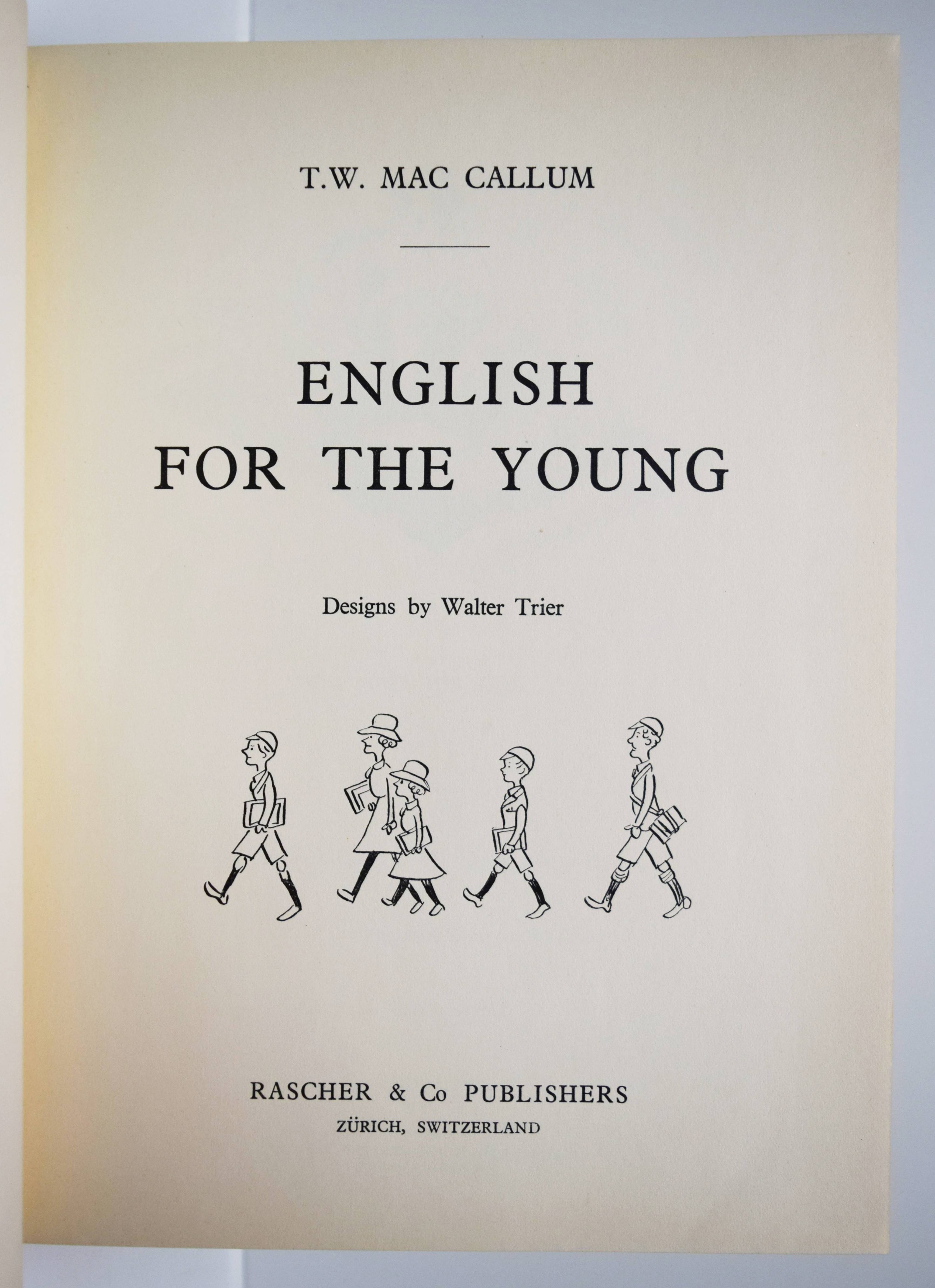 Mac Callum, T(homas) W(atson). English for the Young. Designs by Walter Trier. Zürich, Rascher & Co. (1940). 4°. 2 Bl., 64 S. mit illustr. Titel u. 186 (55 farb.) Illustrationen. Farbig illustr. Orig.-Halbleinenband. Deutsches Exilarchiv 3709. Exil S. 43 u. 75. Hatry 241. Lang 36. – Erste Ausgabe. – Sehr gutes sauberes Exemplar dieser seltenen reich illustrierten Exilveröffentlichung. (″Printed in France“).