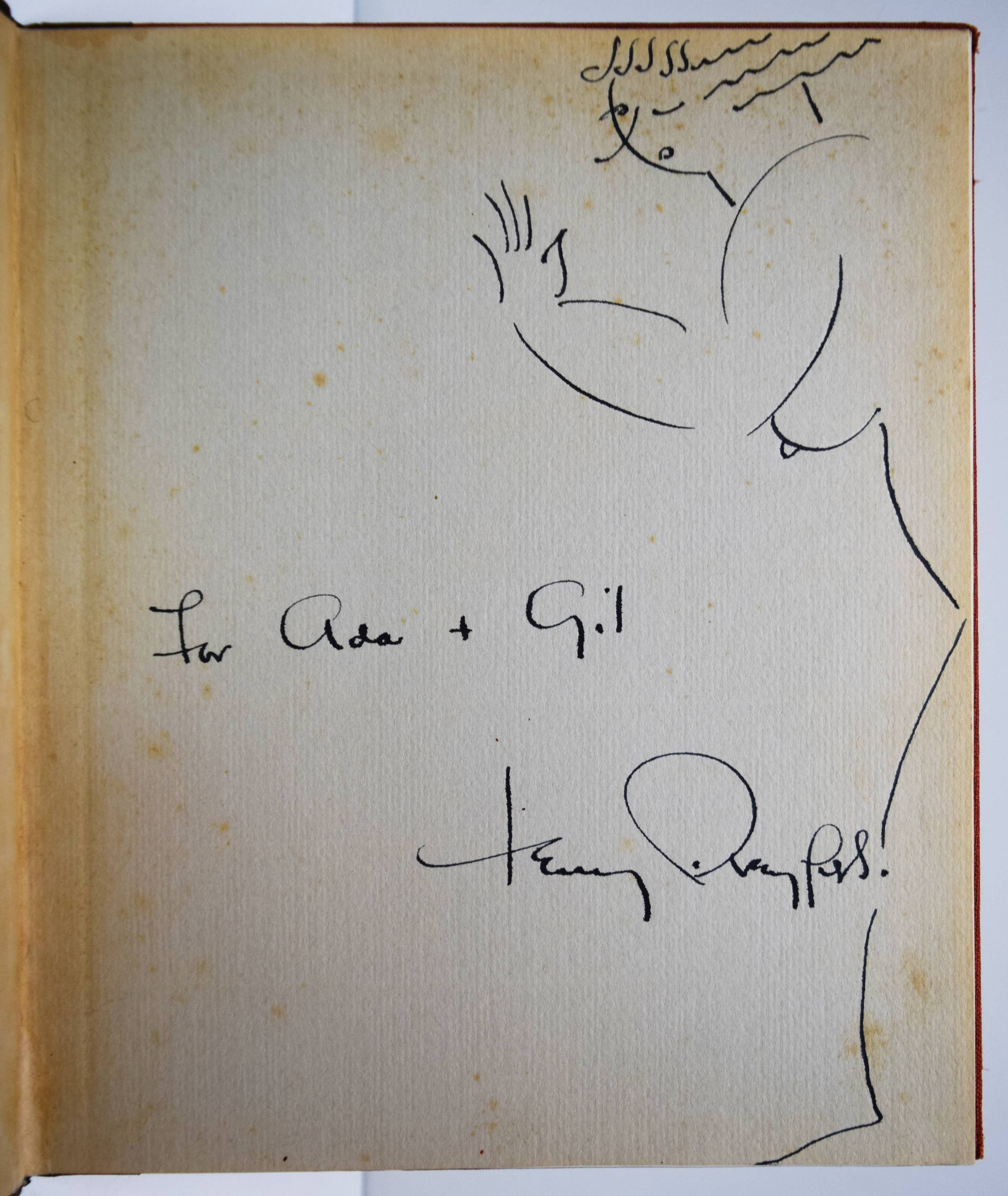 Dreyfuss – Seldes, Gilbert (Indroduction). Henry Dreyfuss. 10 Years of Industrial Design 1929 – 1939. New York, Self-published (1939). 4°. [32] 16 pages with numerous illustrations. Original cloth binding with gold-embossed title on the cover. First and only edition. – With handwritten dedication and drawing (female nude) by Henry Dreyfuss. – „10 YEARS ago Henry Dreyfuss began designing for industry. The following pages-a small portion of the designs he has made – will suggest the connection between his work and the progress of industrial design as a whole.“ – Henry Dreyfuss (1904-1972) „is known for designing the Western Electric Model 500 telephone, the Westclox Big Ben alarm clock, and the Honeywell T87 Round Thermostat. Dreyfuss, a native of Brooklyn, New York City, is one of the celebrity industrial designers of the 1930s and 1940s who pioneered his field. Dreyfuss dramatically improved the look, feel, and usability of dozens of consumer products. Sometimes compared to Raymond Loewy and other contemporaries, Dreyfuss was much more than a stylist; he applied common sense and a scientific approach to design problems, making products more pleasing to the eye and hand, safer to use, and more efficient to manufacture and repair. His work helped popularize the role of the industrial designer while also contributing significant advances to the fields of ergonomics, anthropometrics and human factors.“ (Wikipedia). – Fronts slightly brown-stained, otherwise very well preserved.
