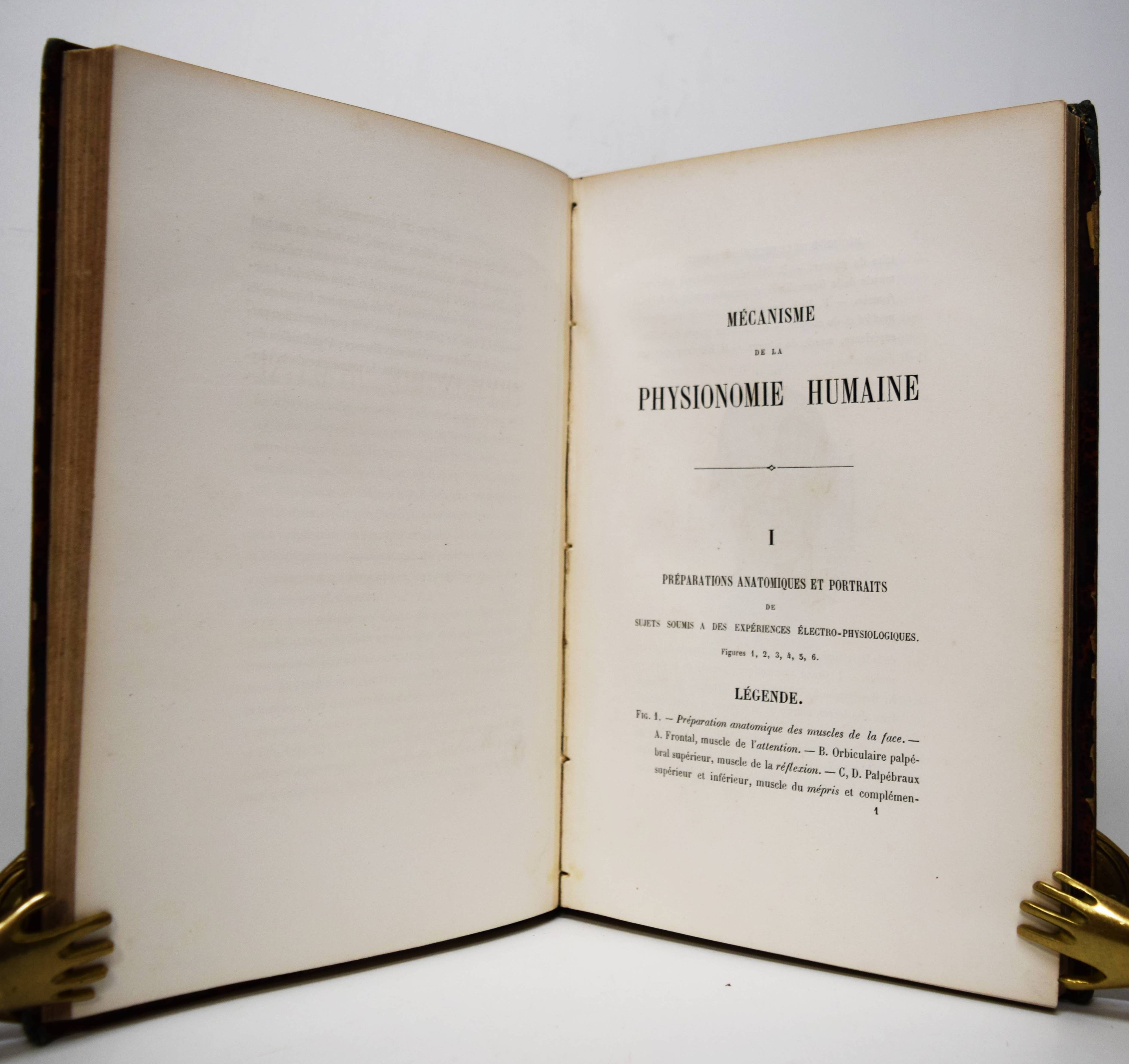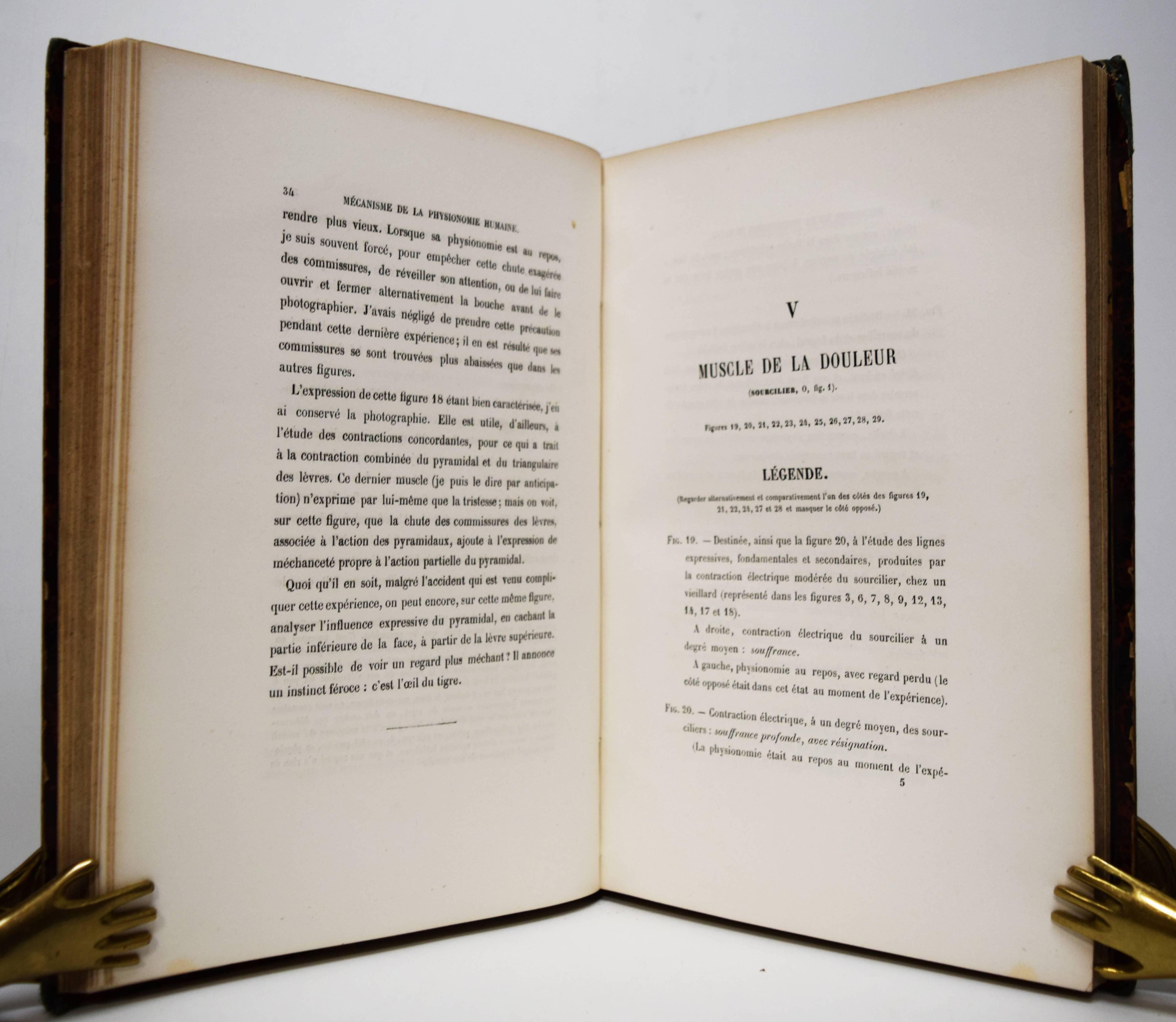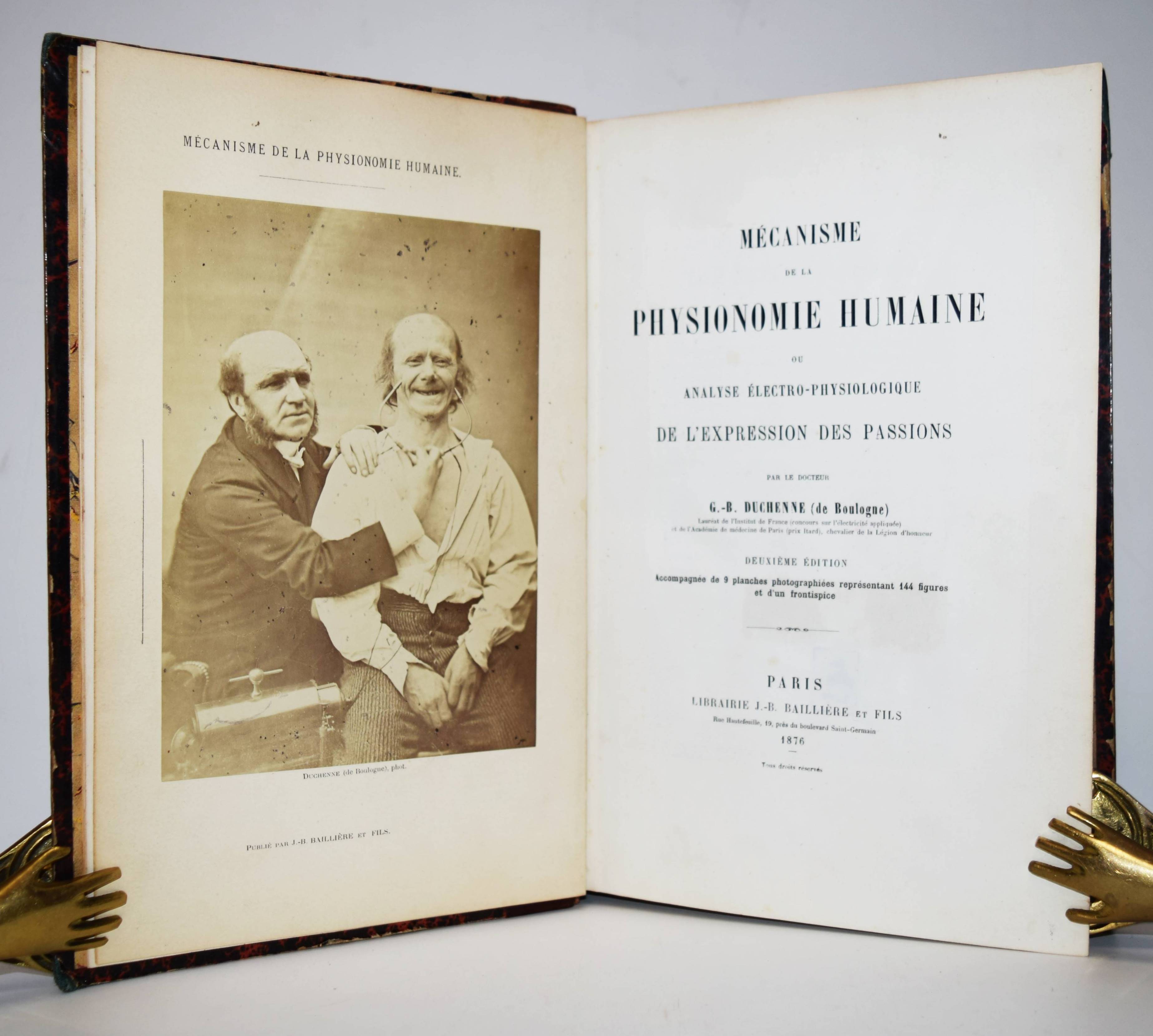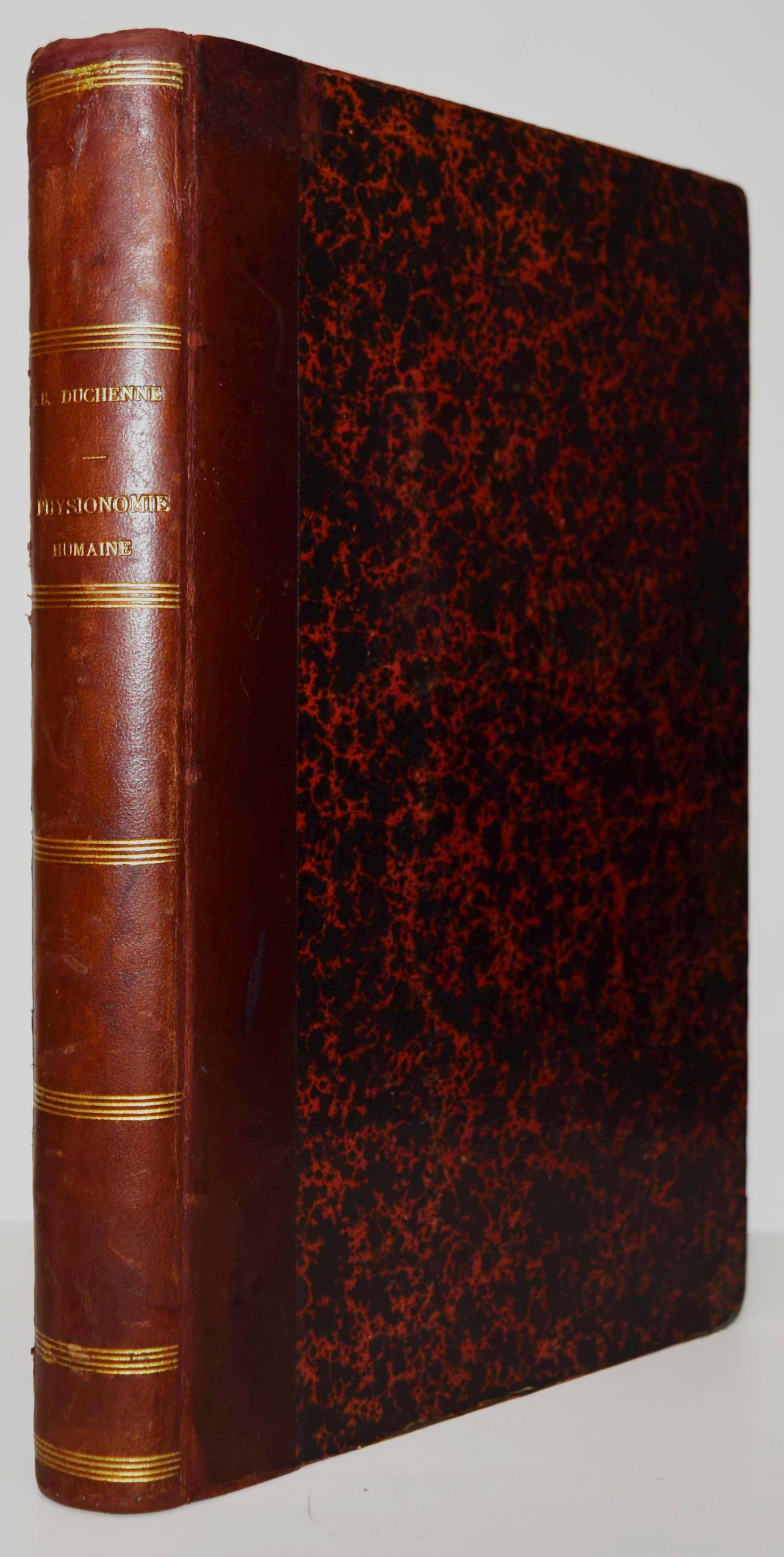 Duchenne (de Boulogne), G(uillaume) B(enjamin). Mécanisme de la physionomie humaine ou analyse électro-physilogique de l’expression des passion. Deuxième édition. Paris, Librairie J.-B. Baillière et fils 1876. 4° (27,5 x 18,5 cm.). XI, (1), 67, 196 S. mit 3 Holzstichen im Text und 10 Orig.-Photographien (Albumin-Abzüge, ca. 13 x 11 bis 17 x 12,5 cm., Frontispiz und auf 9 beil. Tafeln mit 144 kleinen Portraits). Halblederband der Zeit mit goldgepr. Rückentitel und Linienvergoldung. Roosens/Salu 3339. The Truthful Lens 49. Vgl. Auer 25. Garrison-Morton 4973. Hirsch/Hübotter II, 226 ff. Waller 2607 (alle erste Ausgabe von 1862). – „Illustrated with 1 albumen photographic frontispiece for the text volume (Duchenne applying electrodes to the face of a patient),… Assisted by the younger Nadar (Adrien Tournachon), Duchenne photographed part of the plates. This work marks the beginning of photography applied to anatomy and neurology. A second, enlarged edition was issued in 1876. See also No. 43, Darwin, The Expressions of the Emotions“ (W. J. Naef in The Truthful Lens). – Kapital mit unauffällig restaurierter Fehlstelle, stellenweise wie immer etwas gebräunt, sehr gutes Exemplar. – Capital with small restored defect, slightly browned in places as usual, very good copy.
