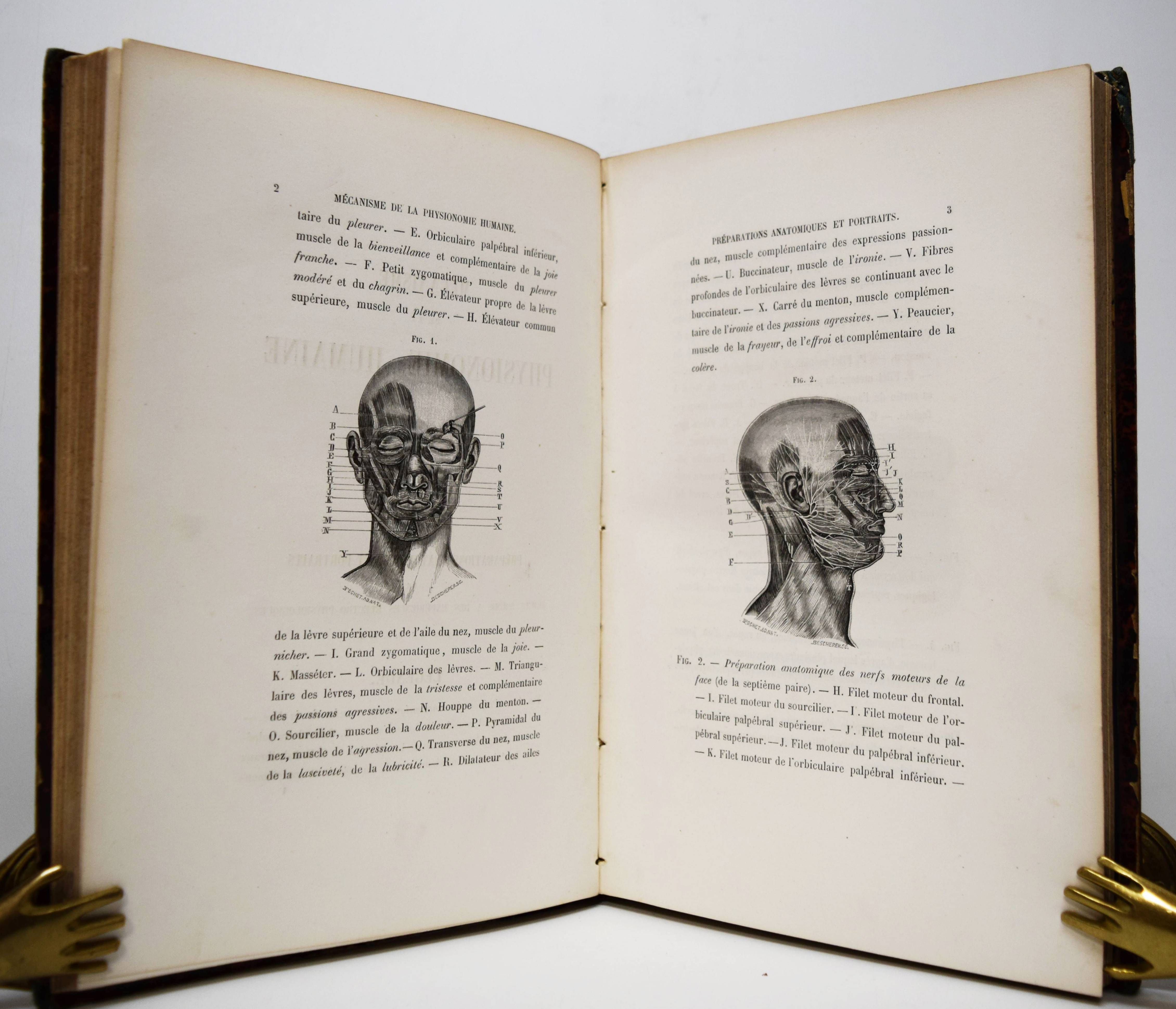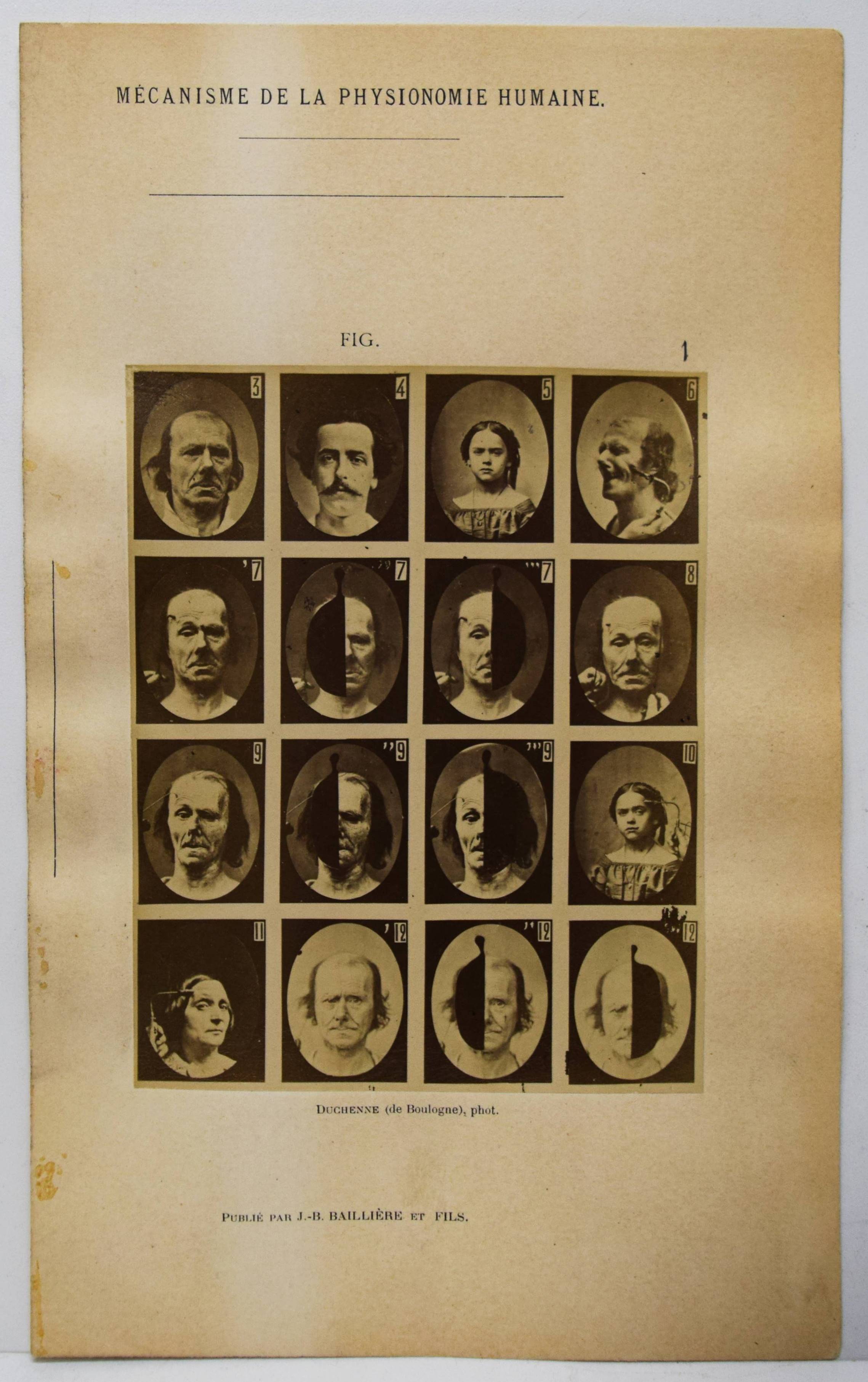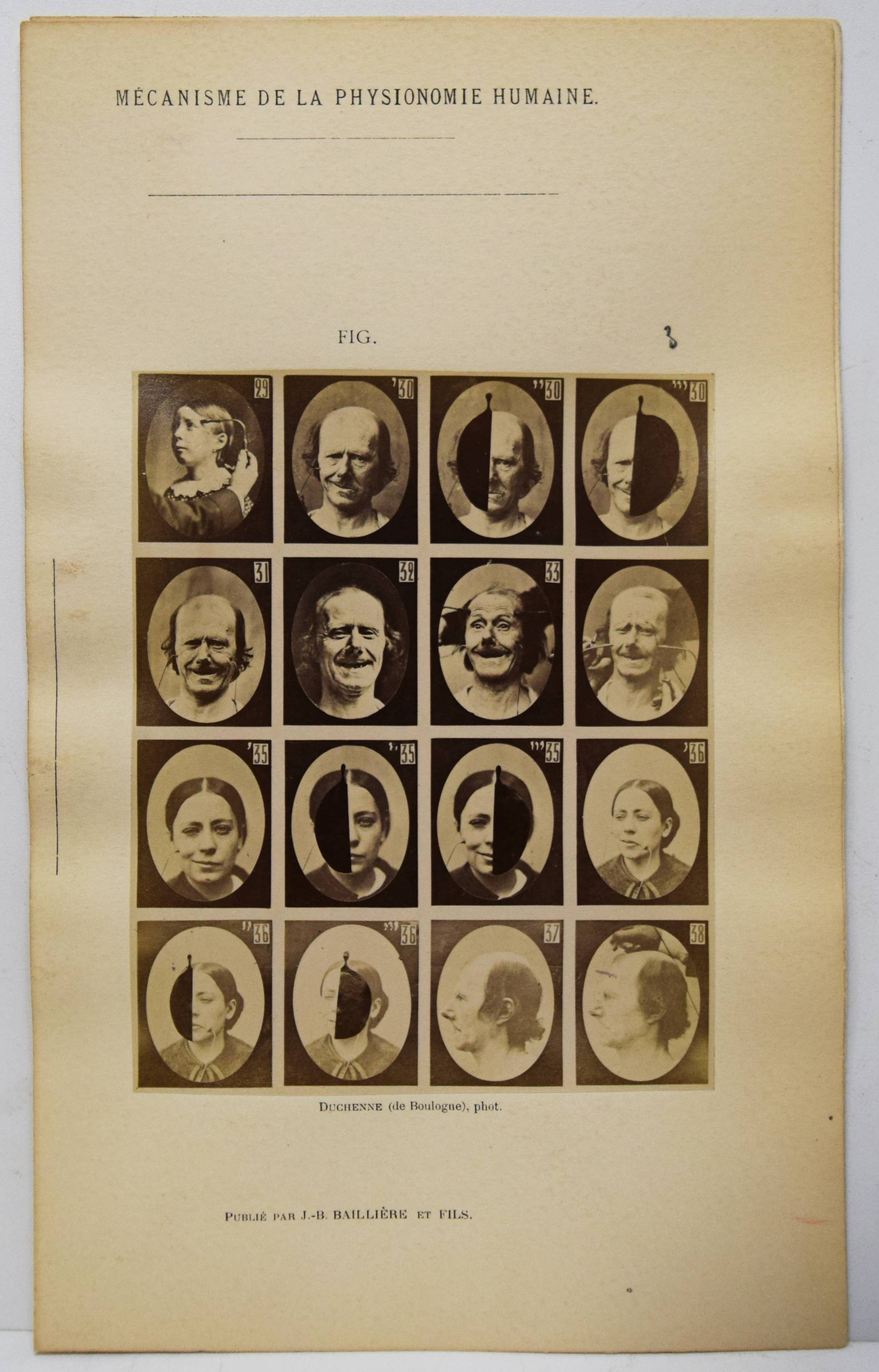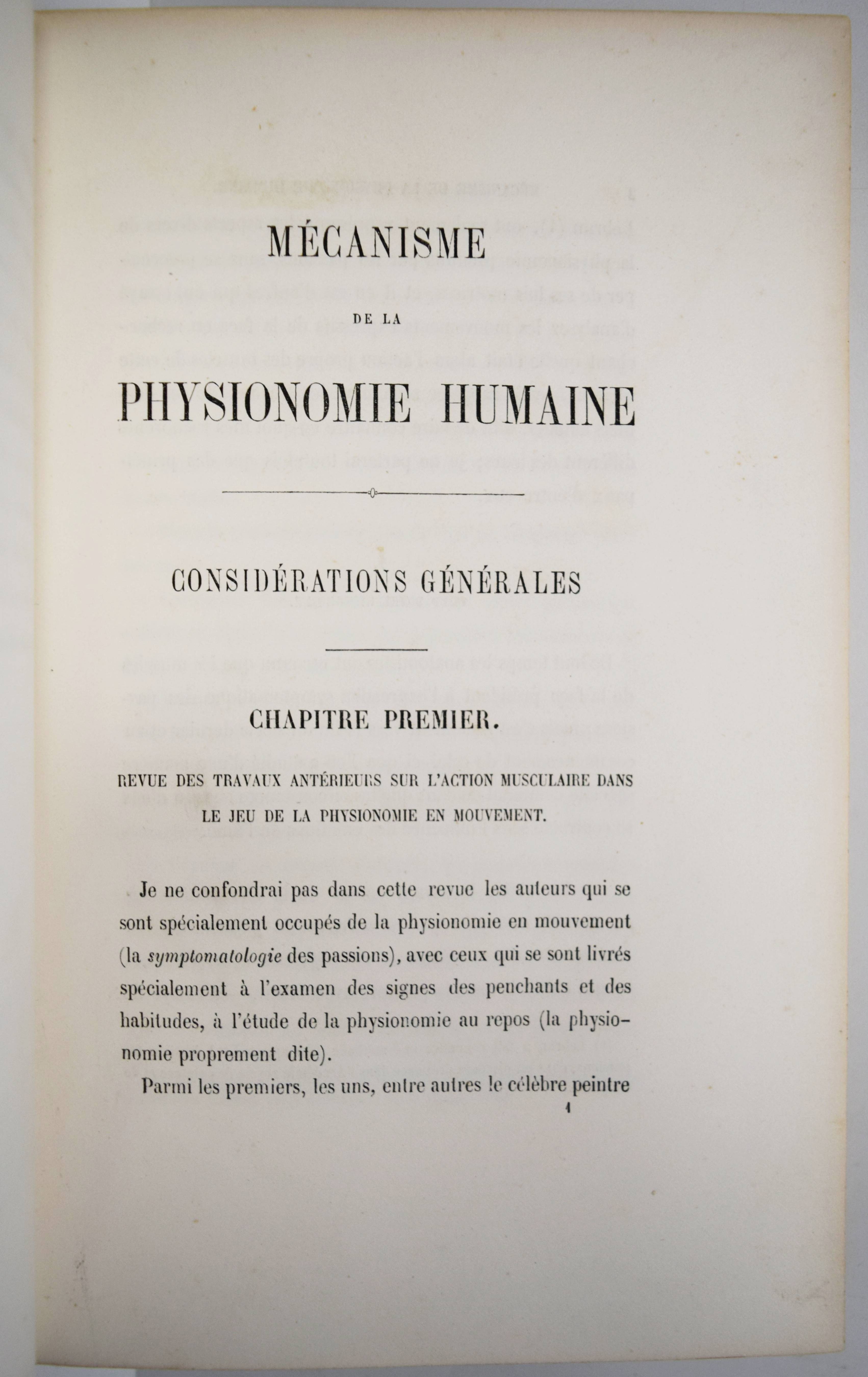 Duchenne (de Boulogne), G(uillaume) B(enjamin). Mécanisme de la physionomie humaine ou analyse électro-physilogique de l’expression des passion. Deuxième édition. Paris, Librairie J.-B. Baillière et fils 1876. 4° (27,5 x 18,5 cm.). XI, (1), 67, 196 S. mit 3 Holzstichen im Text und 10 Orig.-Photographien (Albumin-Abzüge, ca. 13 x 11 bis 17 x 12,5 cm., Frontispiz und auf 9 beil. Tafeln mit 144 kleinen Portraits). Halblederband der Zeit mit goldgepr. Rückentitel und Linienvergoldung. Roosens/Salu 3339. The Truthful Lens 49. Vgl. Auer 25. Garrison-Morton 4973. Hirsch/Hübotter II, 226 ff. Waller 2607 (alle erste Ausgabe von 1862). – „Illustrated with 1 albumen photographic frontispiece for the text volume (Duchenne applying electrodes to the face of a patient),… Assisted by the younger Nadar (Adrien Tournachon), Duchenne photographed part of the plates. This work marks the beginning of photography applied to anatomy and neurology. A second, enlarged edition was issued in 1876. See also No. 43, Darwin, The Expressions of the Emotions“ (W. J. Naef in The Truthful Lens). – Kapital mit unauffällig restaurierter Fehlstelle, stellenweise wie immer etwas gebräunt, sehr gutes Exemplar. – Capital with small restored defect, slightly browned in places as usual, very good copy.