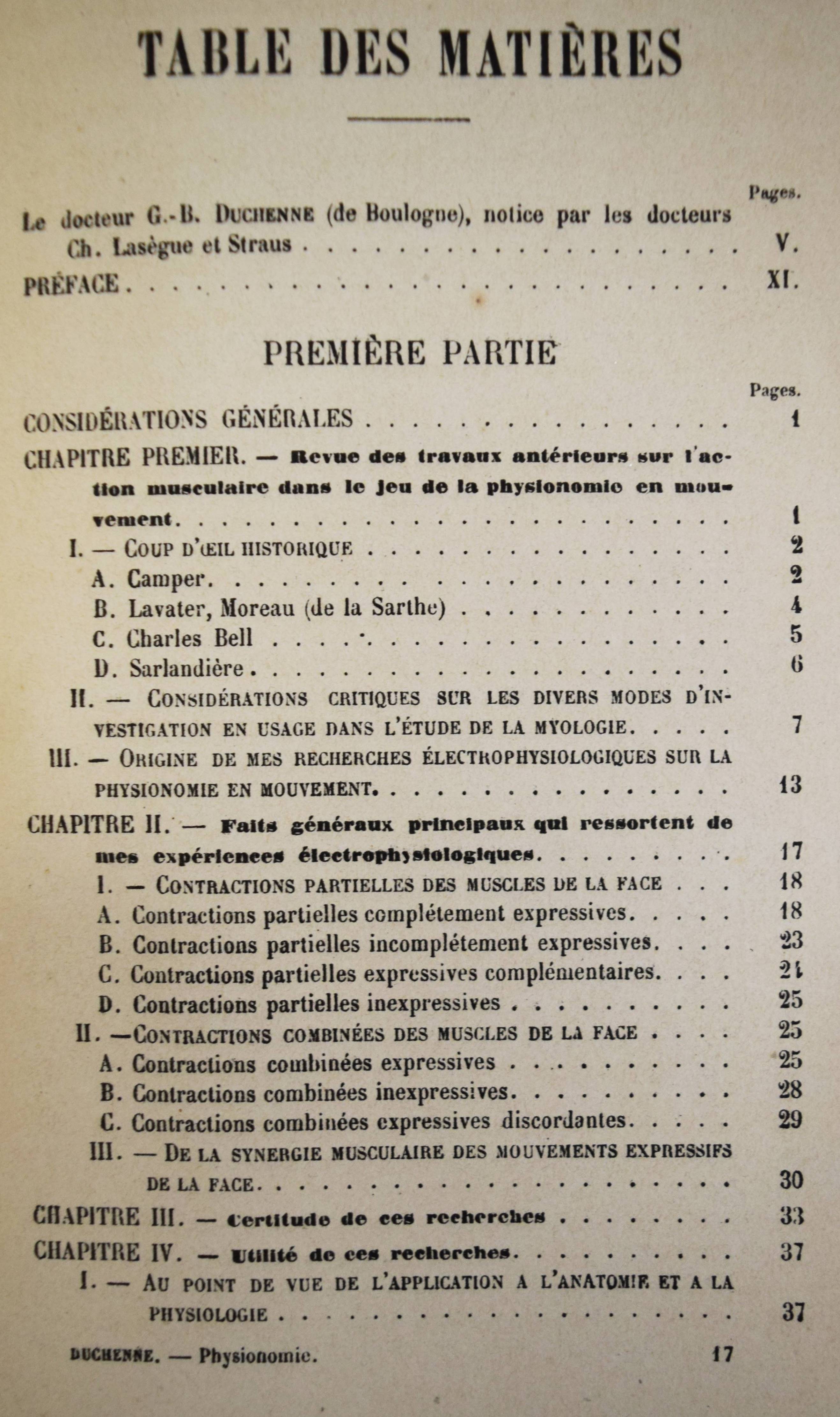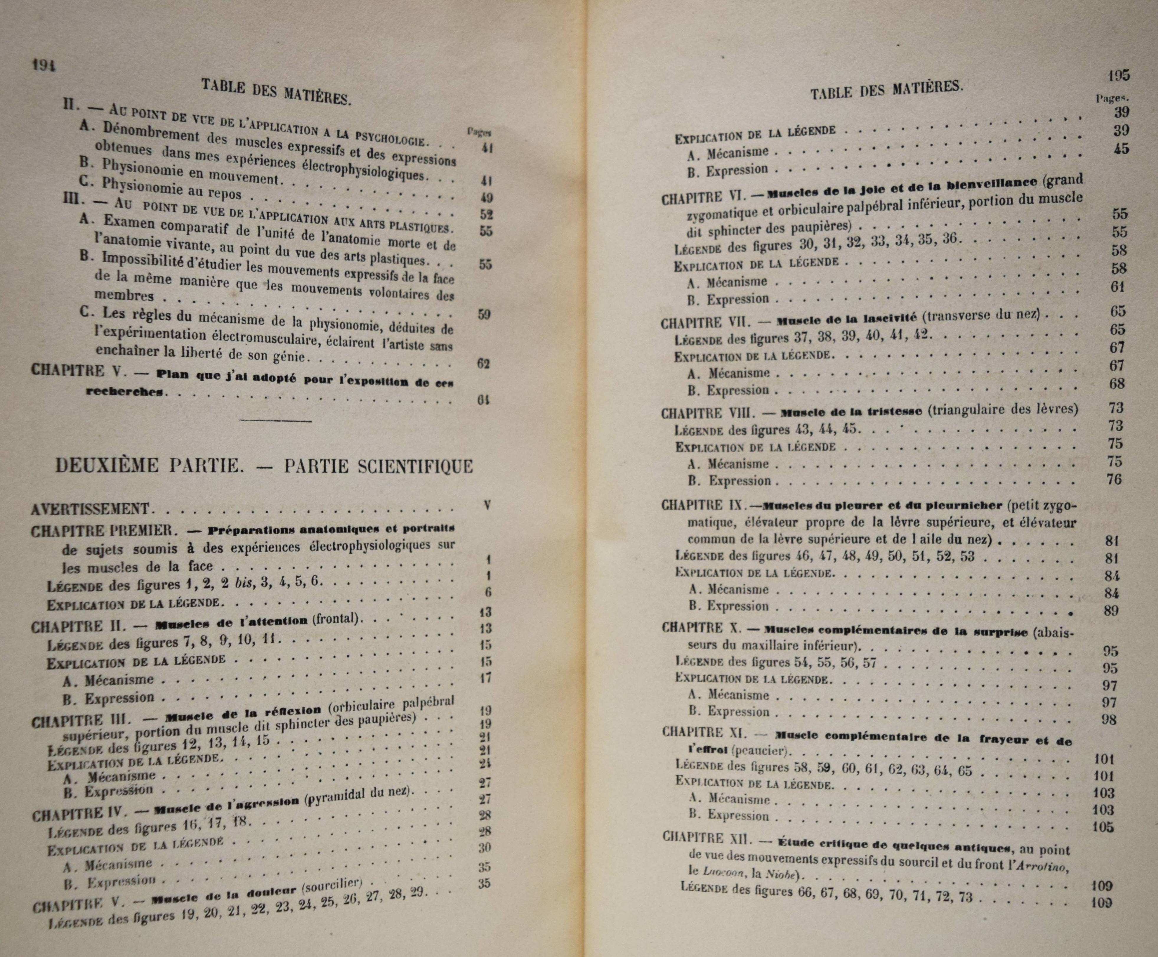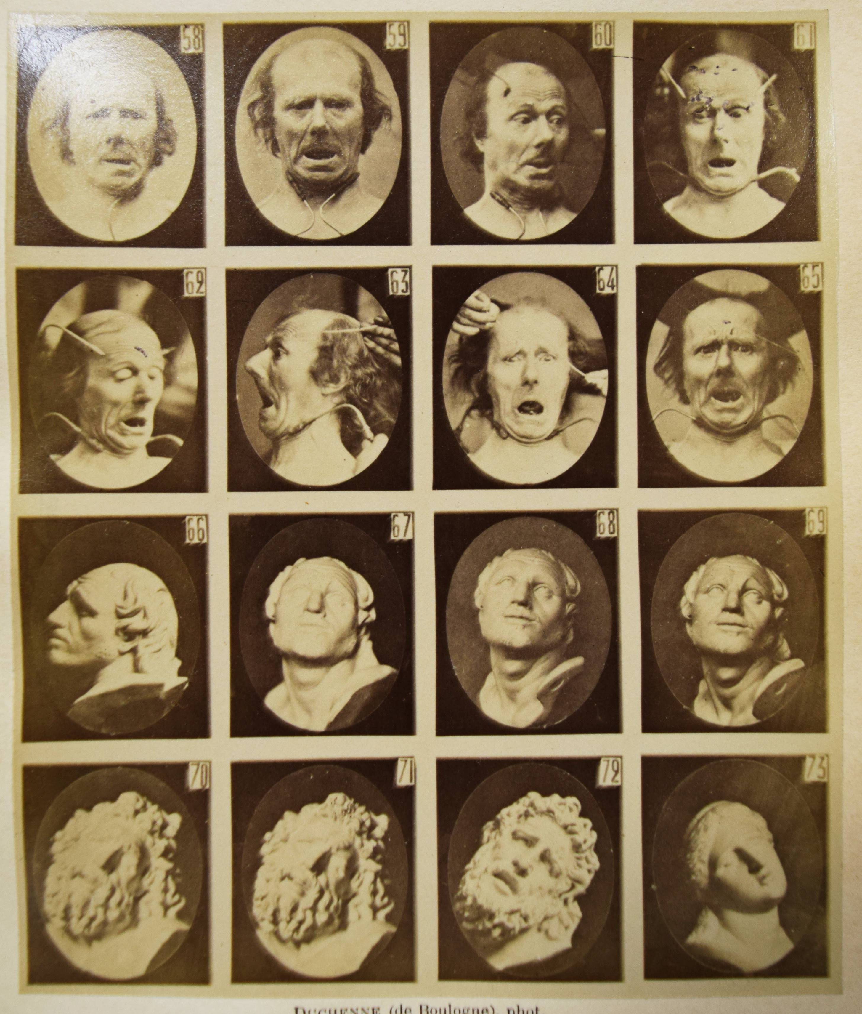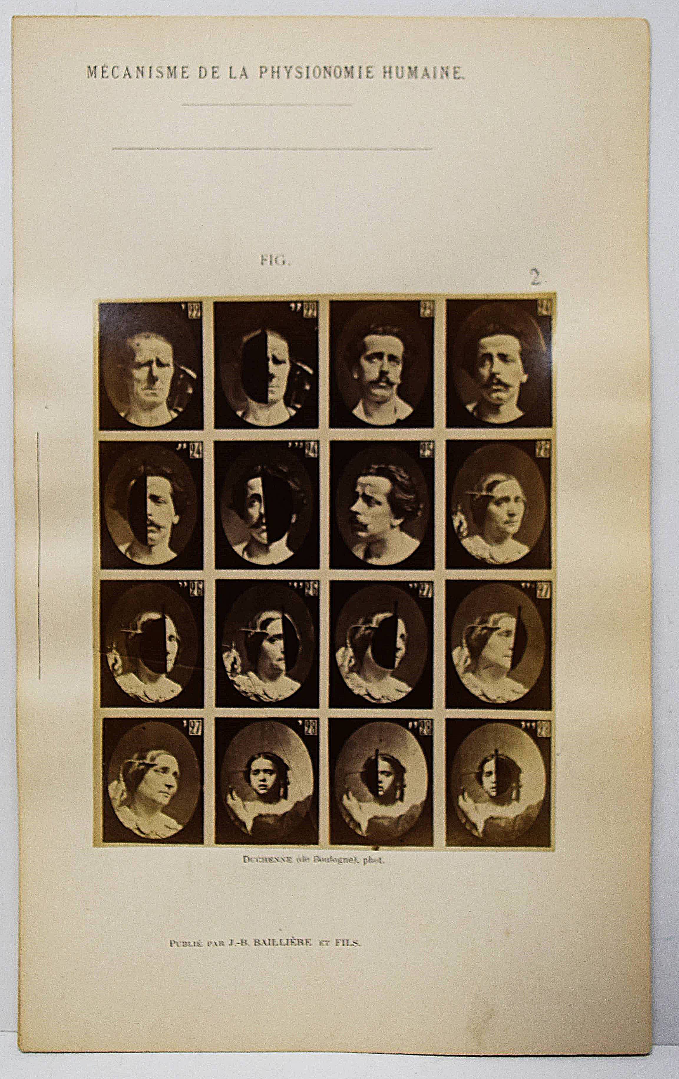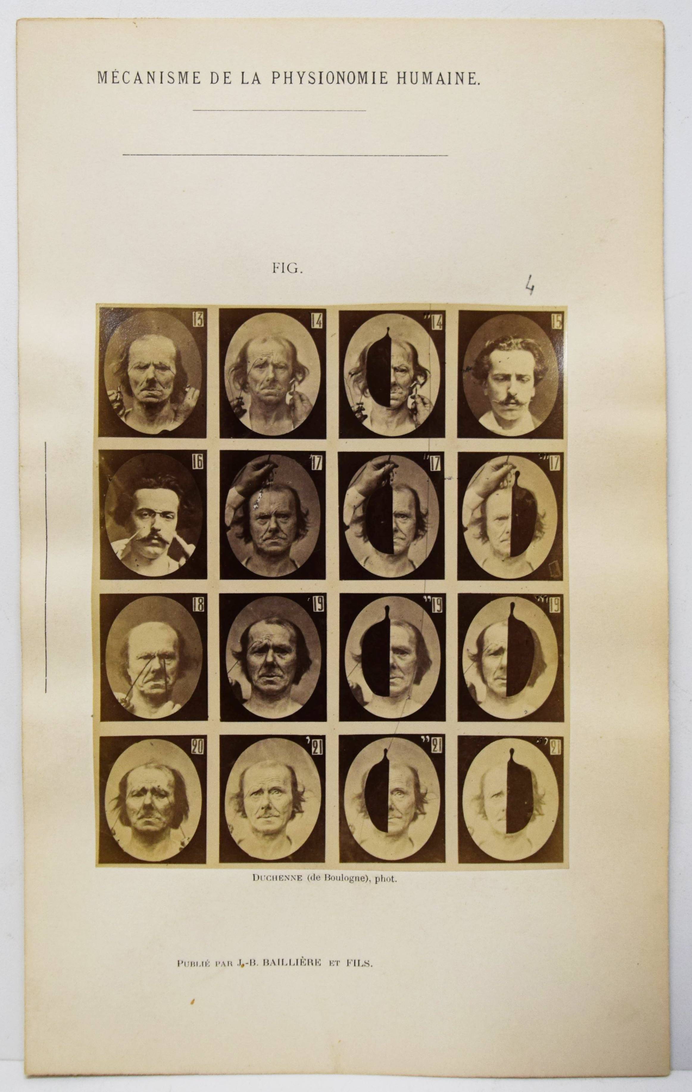 Duchenne (de Boulogne), G(uillaume) B(enjamin). Mécanisme de la physionomie humaine ou analyse électro-physilogique de l’expression des passion. Deuxième édition. Paris, Librairie J.-B. Baillière et fils 1876. 4° (27,5 x 18,5 cm.). XI, (1), 67, 196 S. mit 3 Holzstichen im Text und 10 Orig.-Photographien (Albumin-Abzüge, ca. 13 x 11 bis 17 x 12,5 cm., Frontispiz und auf 9 beil. Tafeln mit 144 kleinen Portraits). Halblederband der Zeit mit goldgepr. Rückentitel und Linienvergoldung. Roosens/Salu 3339. The Truthful Lens 49. Vgl. Auer 25. Garrison-Morton 4973. Hirsch/Hübotter II, 226 ff. Waller 2607 (alle erste Ausgabe von 1862). – „Illustrated with 1 albumen photographic frontispiece for the text volume (Duchenne applying electrodes to the face of a patient),… Assisted by the younger Nadar (Adrien Tournachon), Duchenne photographed part of the plates. This work marks the beginning of photography applied to anatomy and neurology. A second, enlarged edition was issued in 1876. See also No. 43, Darwin, The Expressions of the Emotions“ (W. J. Naef in The Truthful Lens). – Kapital mit unauffällig restaurierter Fehlstelle, stellenweise wie immer etwas gebräunt, sehr gutes Exemplar. – Capital with small restored defect, slightly browned in places as usual, very good copy.