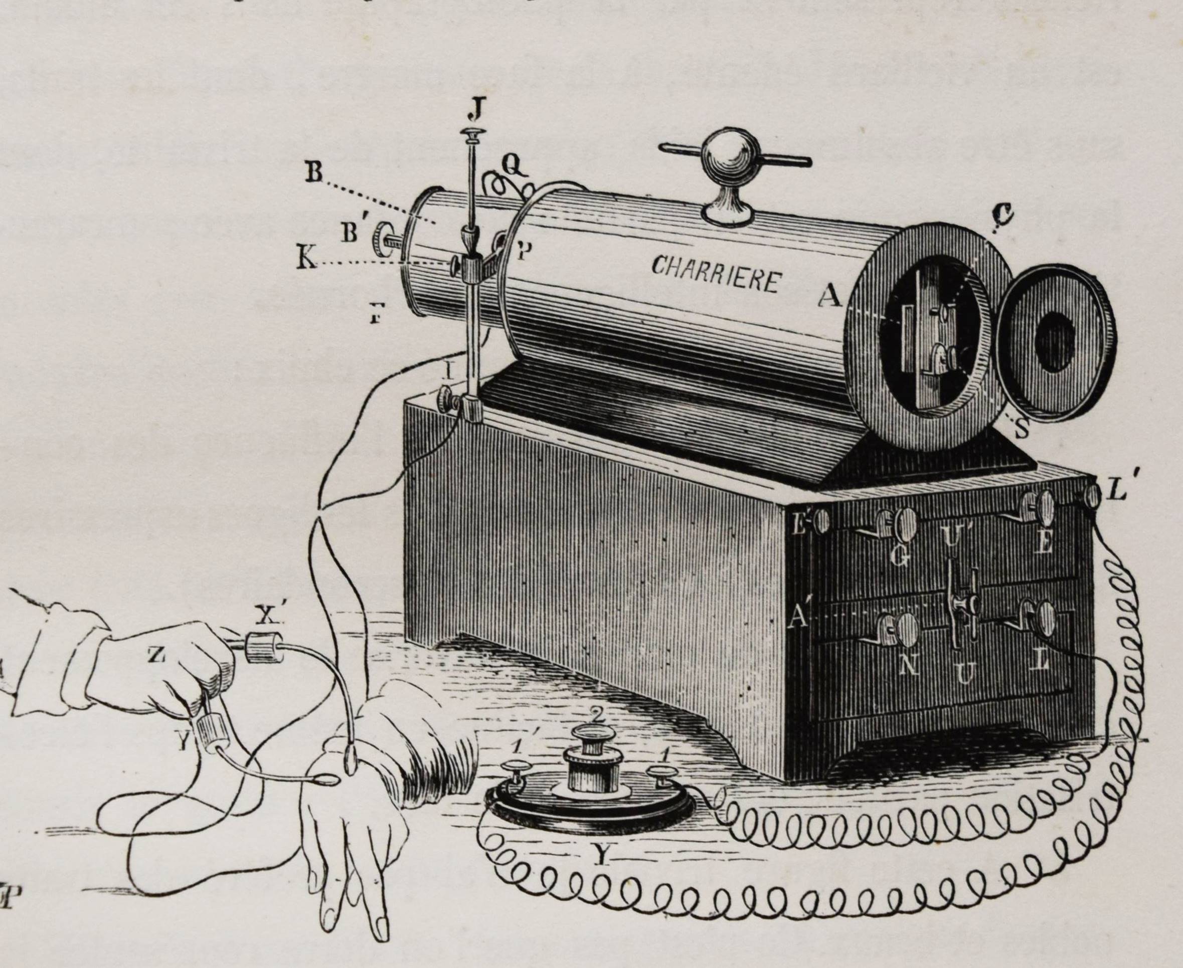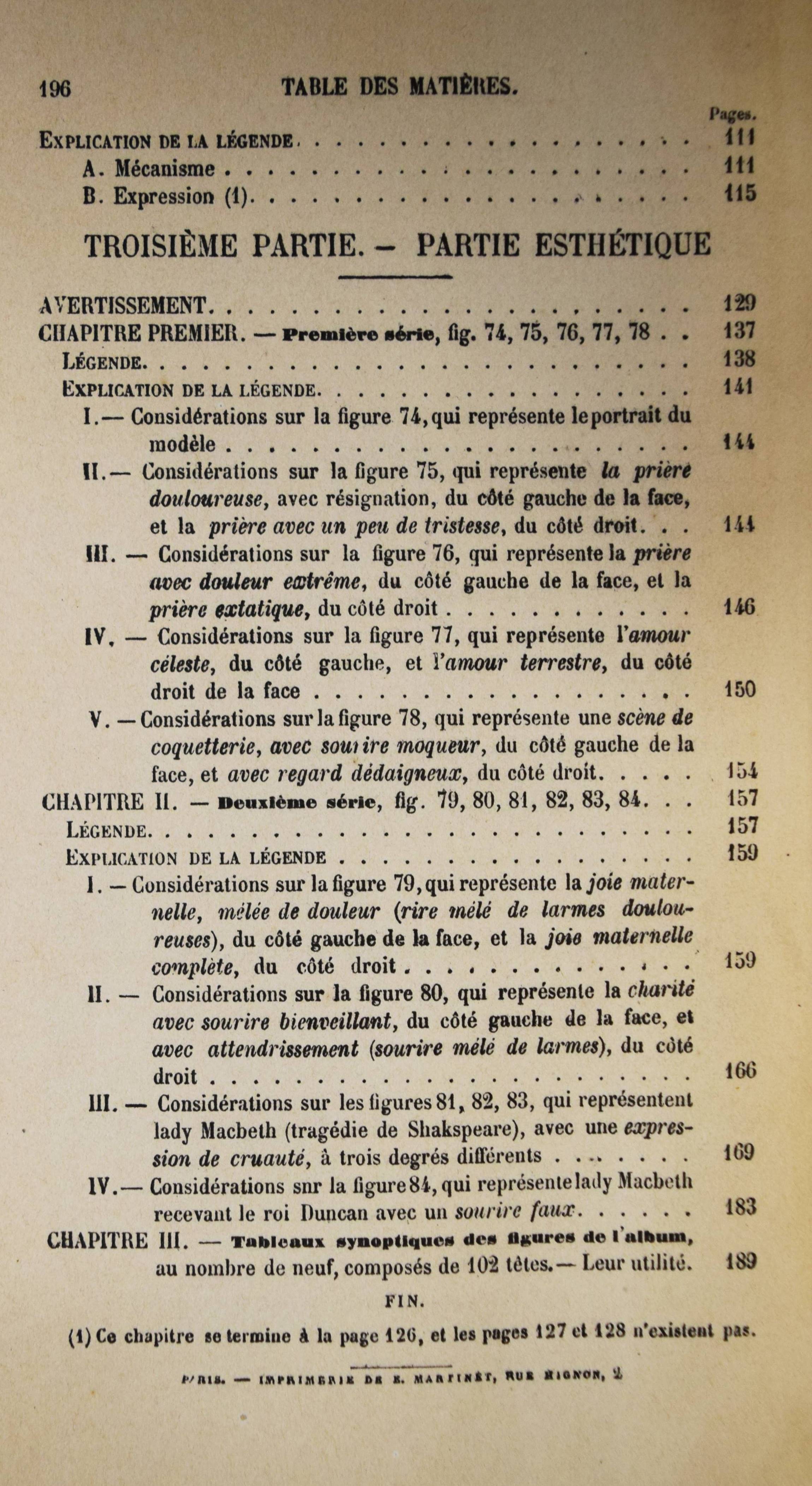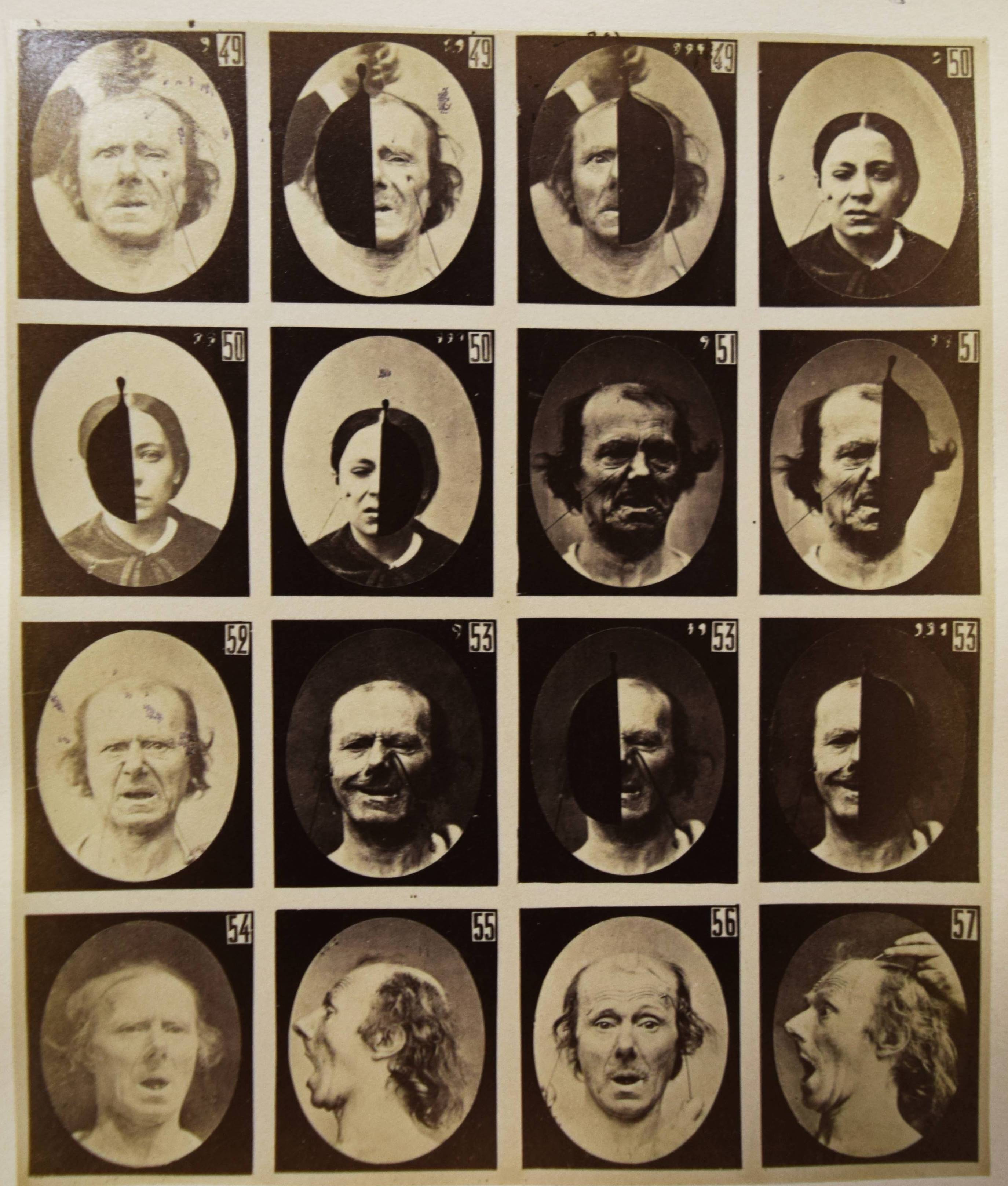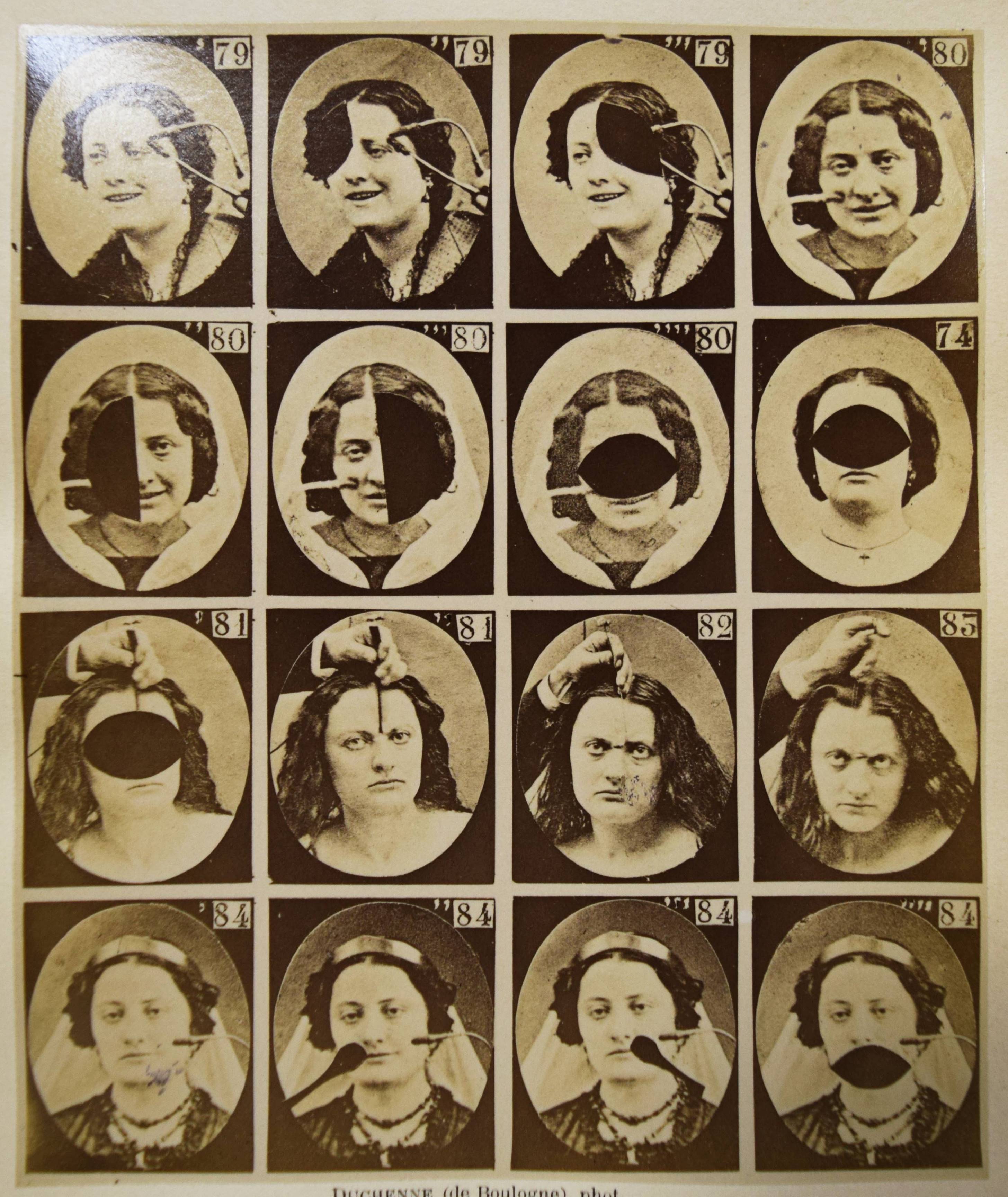 Duchenne (de Boulogne), G(uillaume) B(enjamin). Mécanisme de la physionomie humaine ou analyse électro-physilogique de l’expression des passion. Deuxième édition. Paris, Librairie J.-B. Baillière et fils 1876. 4° (27,5 x 18,5 cm.). XI, (1), 67, 196 S. mit 3 Holzstichen im Text und 10 Orig.-Photographien (Albumin-Abzüge, ca. 13 x 11 bis 17 x 12,5 cm., Frontispiz und auf 9 beil. Tafeln mit 144 kleinen Portraits). Halblederband der Zeit mit goldgepr. Rückentitel und Linienvergoldung. Roosens/Salu 3339. The Truthful Lens 49. Vgl. Auer 25. Garrison-Morton 4973. Hirsch/Hübotter II, 226 ff. Waller 2607 (alle erste Ausgabe von 1862). – „Illustrated with 1 albumen photographic frontispiece for the text volume (Duchenne applying electrodes to the face of a patient),… Assisted by the younger Nadar (Adrien Tournachon), Duchenne photographed part of the plates. This work marks the beginning of photography applied to anatomy and neurology. A second, enlarged edition was issued in 1876. See also No. 43, Darwin, The Expressions of the Emotions“ (W. J. Naef in The Truthful Lens). – Kapital mit unauffällig restaurierter Fehlstelle, stellenweise wie immer etwas gebräunt, sehr gutes Exemplar. – Capital with small restored defect, slightly browned in places as usual, very good copy.