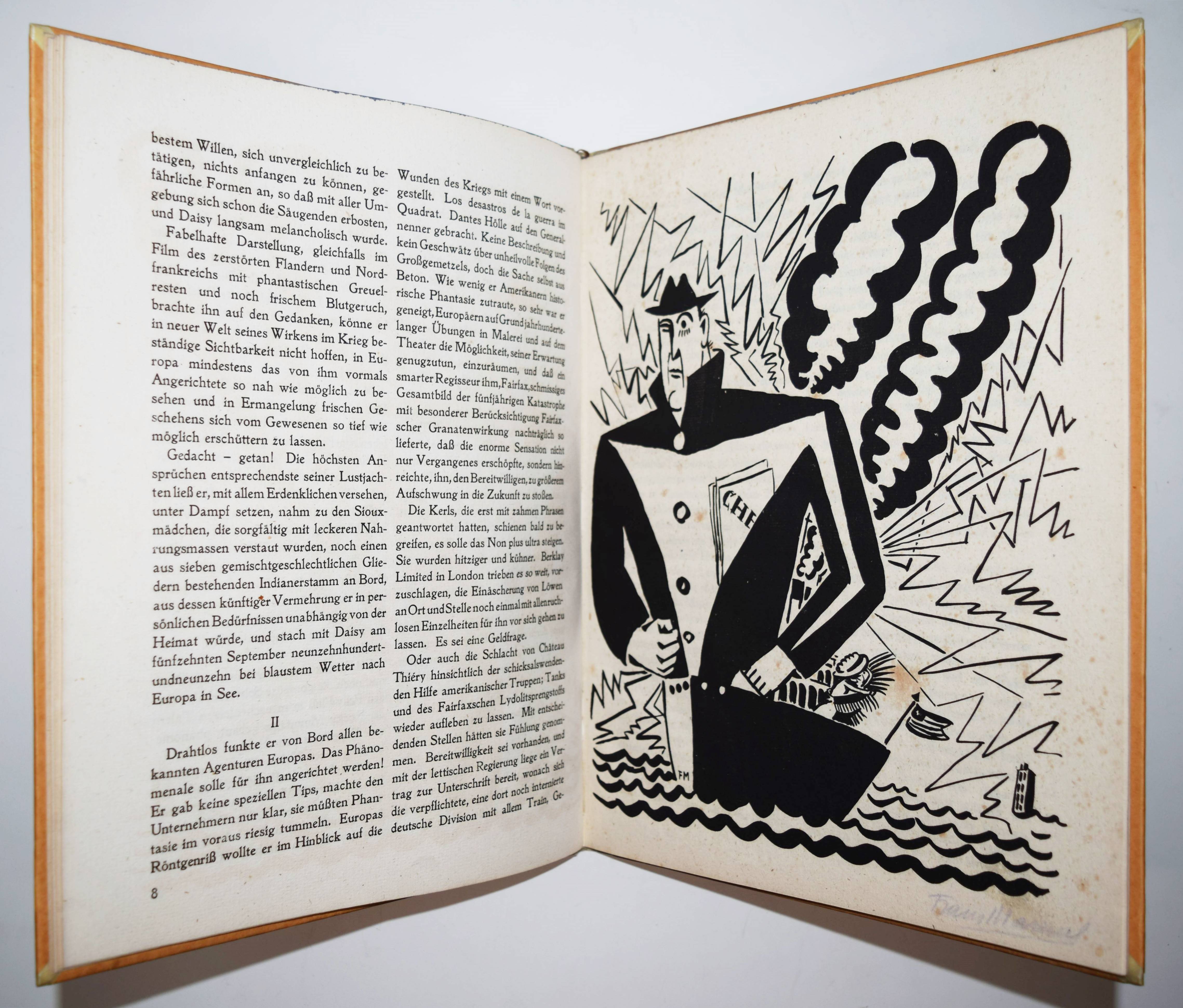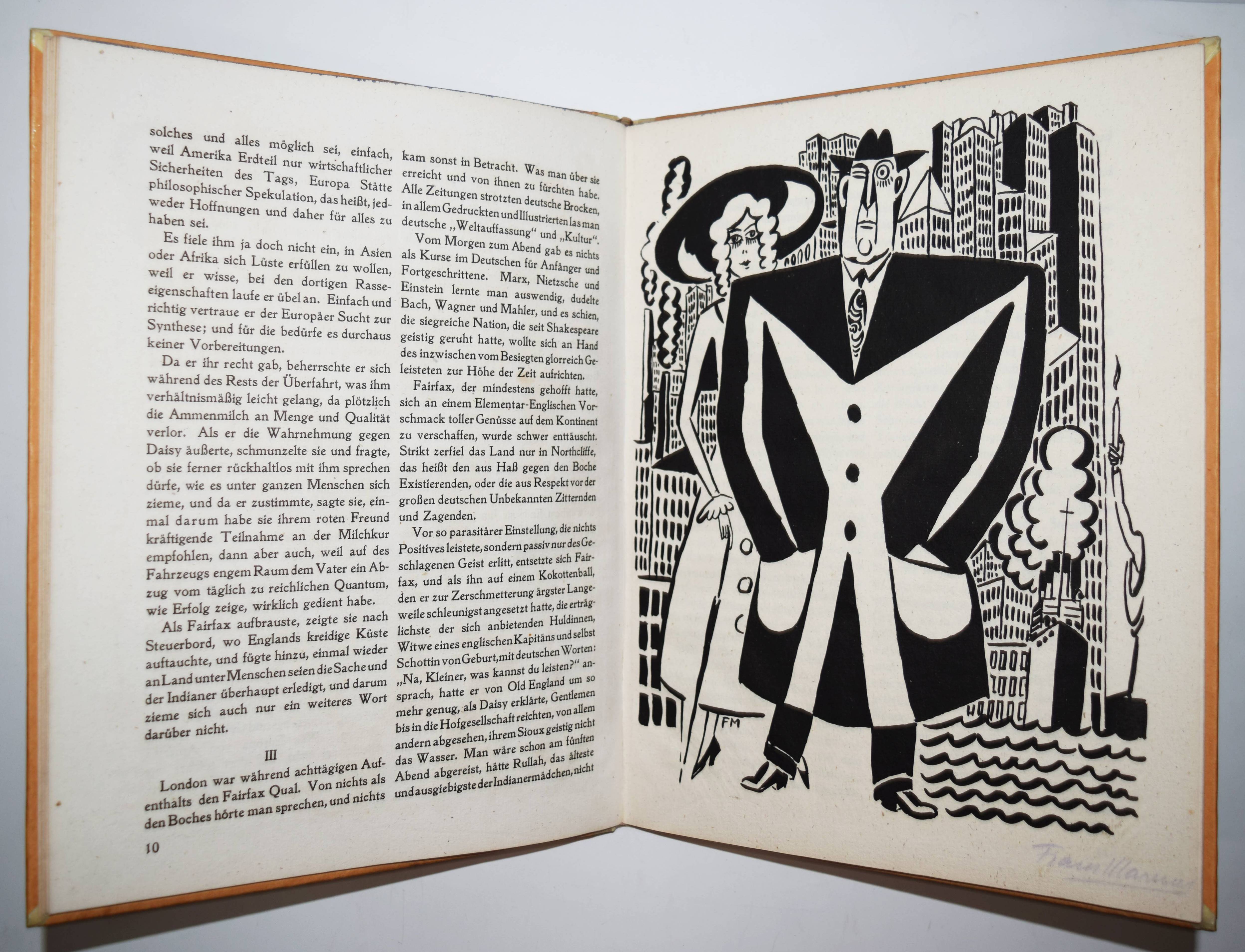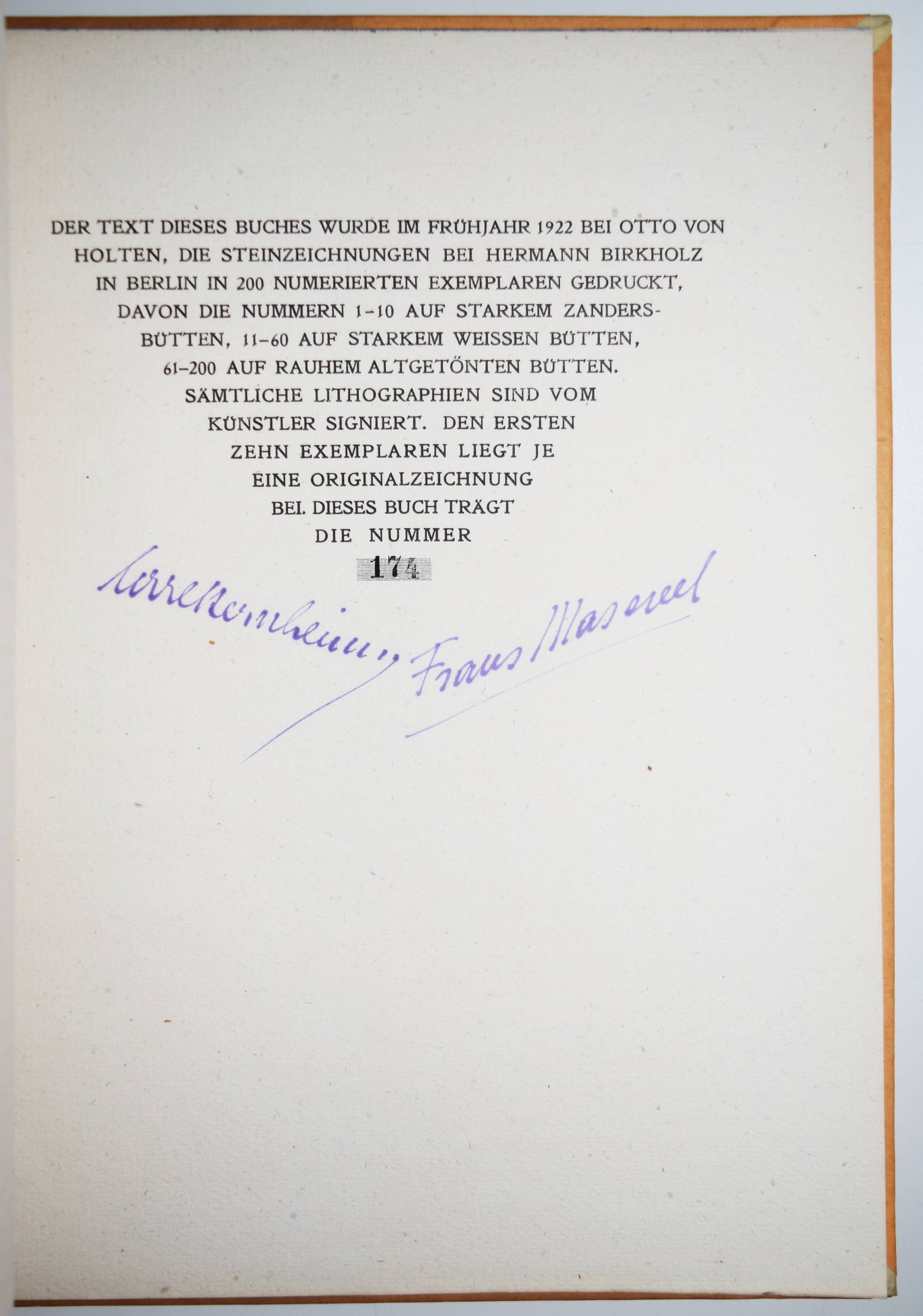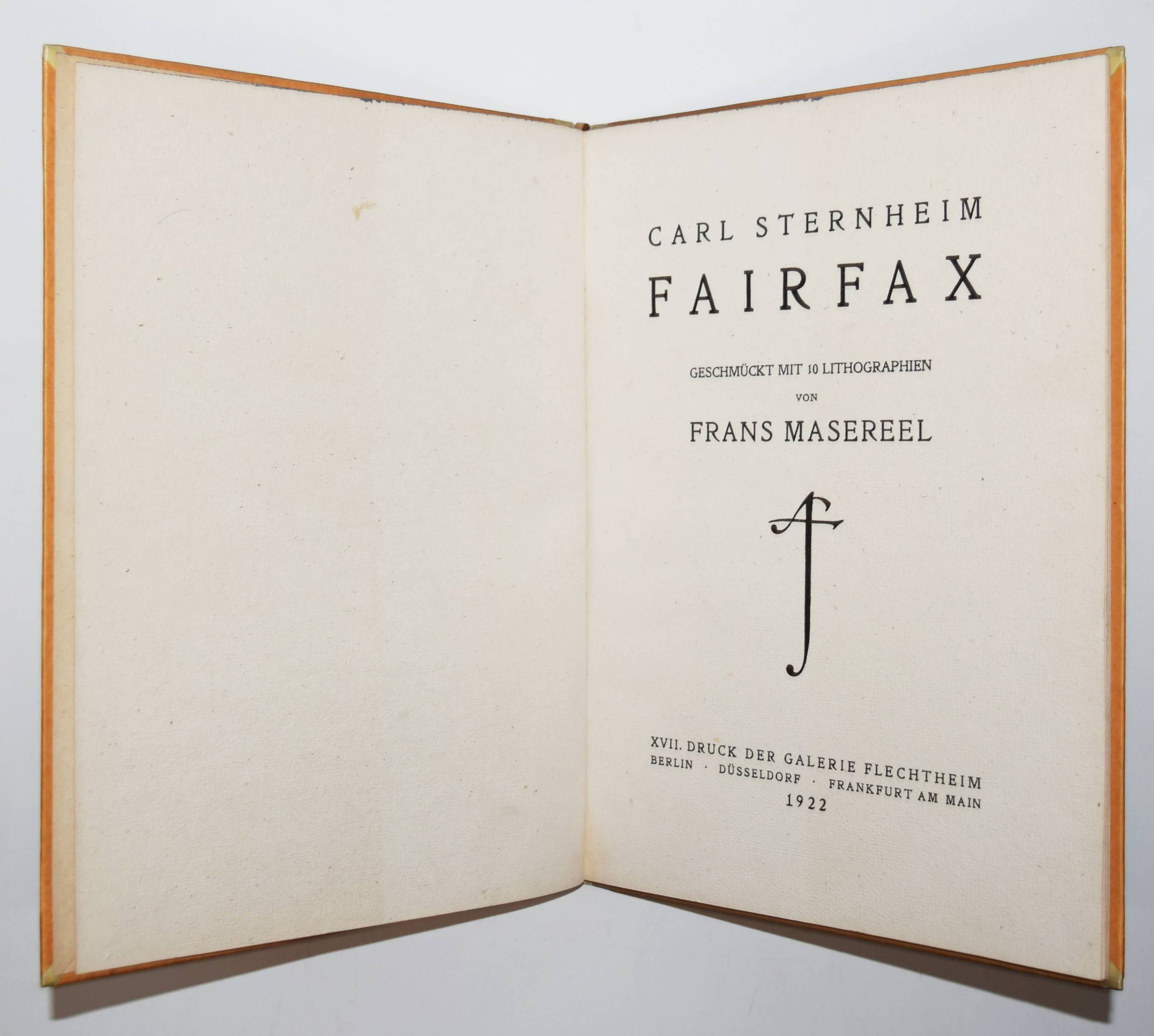 Sternheim, Carl. Fairfax. Geschmückt mit 10 Lithographien von Frans Masereel. Berlin, Düsseldorf, Frankfurt a. M., Galerie Flechtheim 1922. 4°. 35 S., [2] Bl. mit zehn signierten Lithographien. Illustr. Orig.-Halbpergamentband. (XVII. Druck der Galerie Flechtheim). Jentsch, Expressionismus 120. Raabe 291.3. Ritter C a 24. Rodenberg 355, 17. – Erste Ausgabe mit diesen Illustrationen. – Eines von 140 Exemplaren auf rauem altgetönten Bütten (Gesamtauflage 200 Exemplare). Im Druckvermerk von C. Sternheim und F. Masereel signiert und alle Lithographien vom Künstler signiert. – Carl Sternheims Erzählung „Fairfax“ erschien zuerst 1921 bei Ernst Rowohlt in Berlin. – In der Zeitschrift „Der Querschnitt“ äußerte sich Sternheim enthusiastisch über die Illustrationen Masereels: „Über den Schwarzweißkünstler Masereel steht das europäische Urteil fest: ein Phänomen! […] Masereels himmlische Bilder zum Fairfax aber haben mir wieder bewiesen: manchmal ist Leben doch feine Sache!“ (zitiert nach Jentsch). – Die letzte Lithographie etwas braunfleckig, sehr gutes Exemplar.