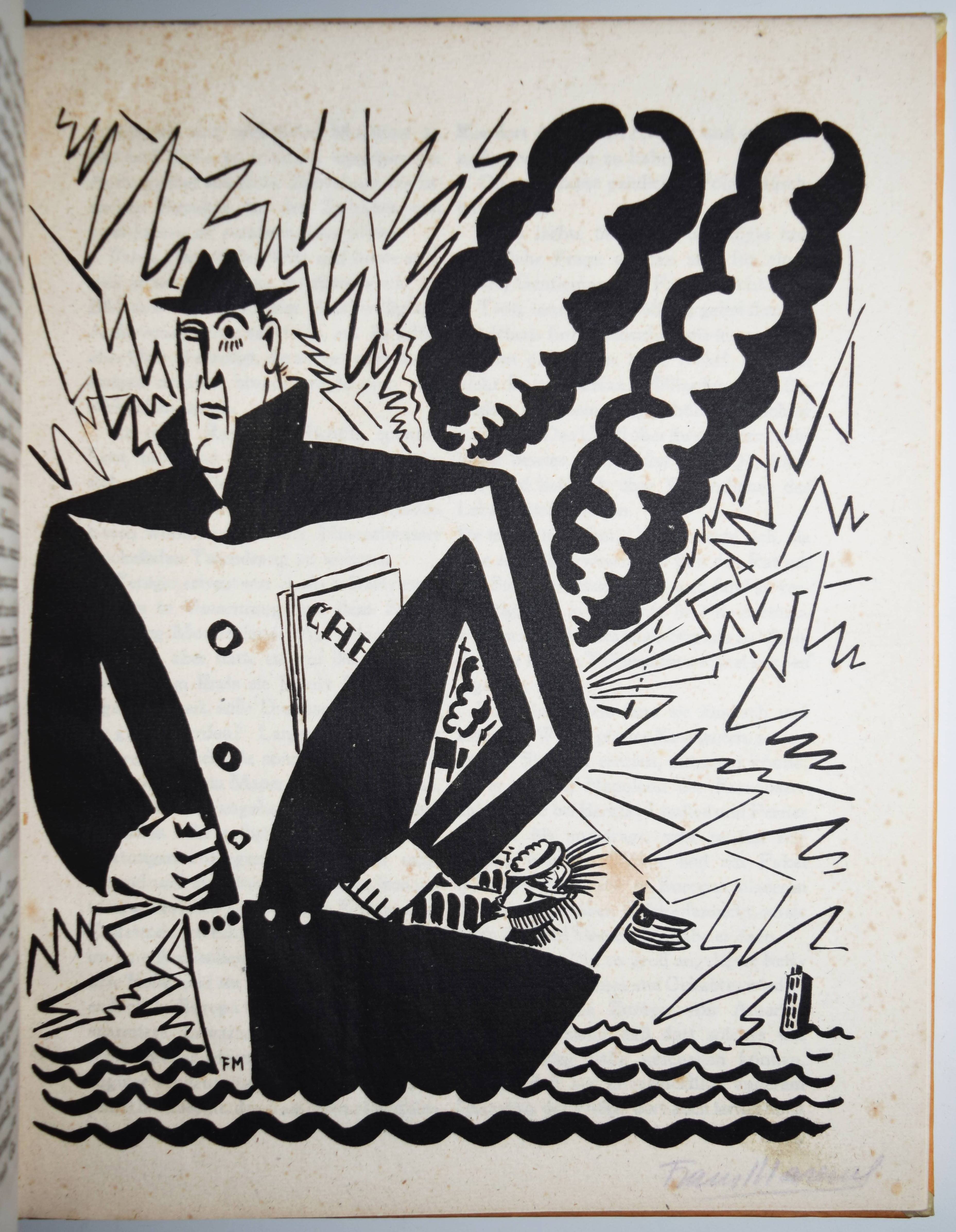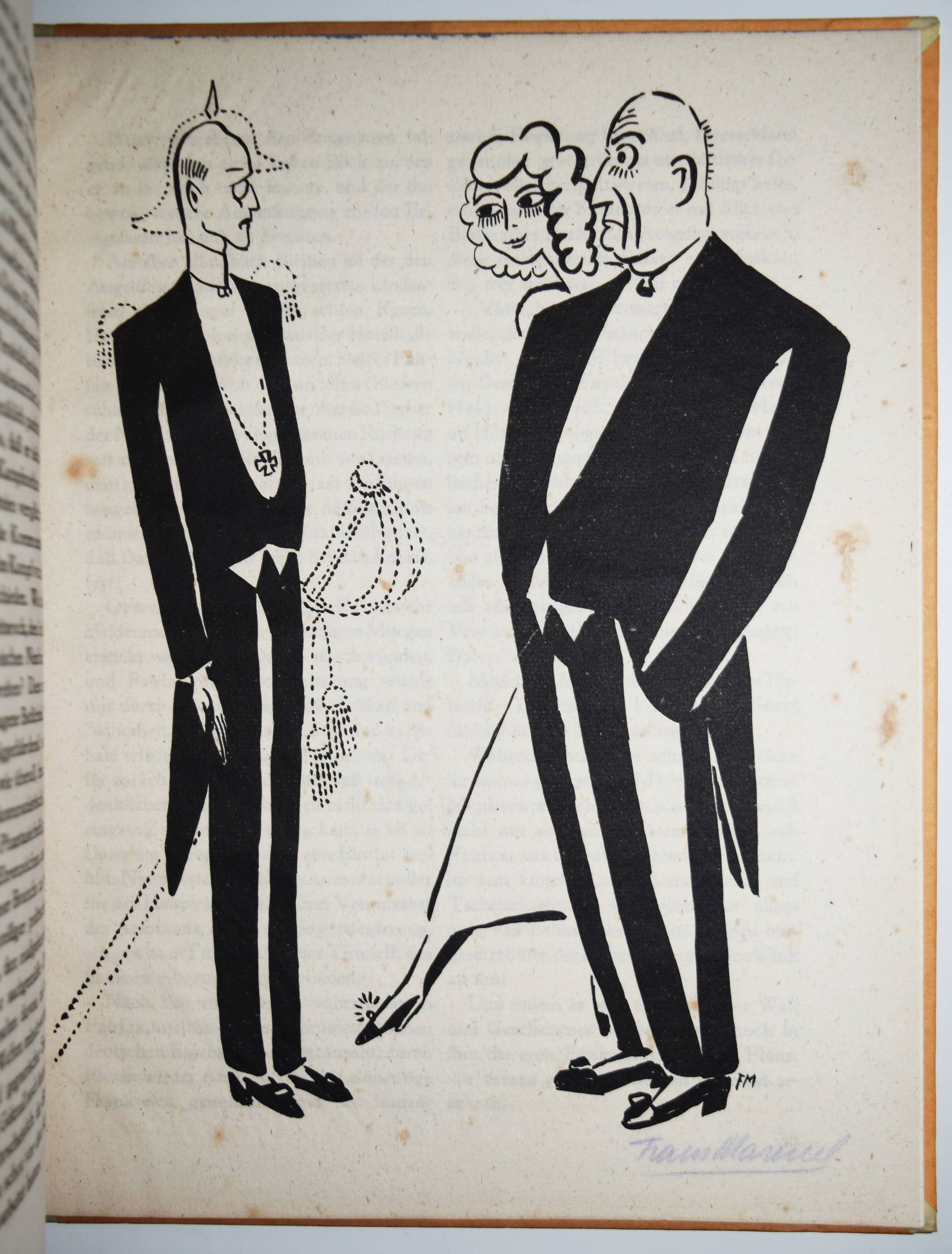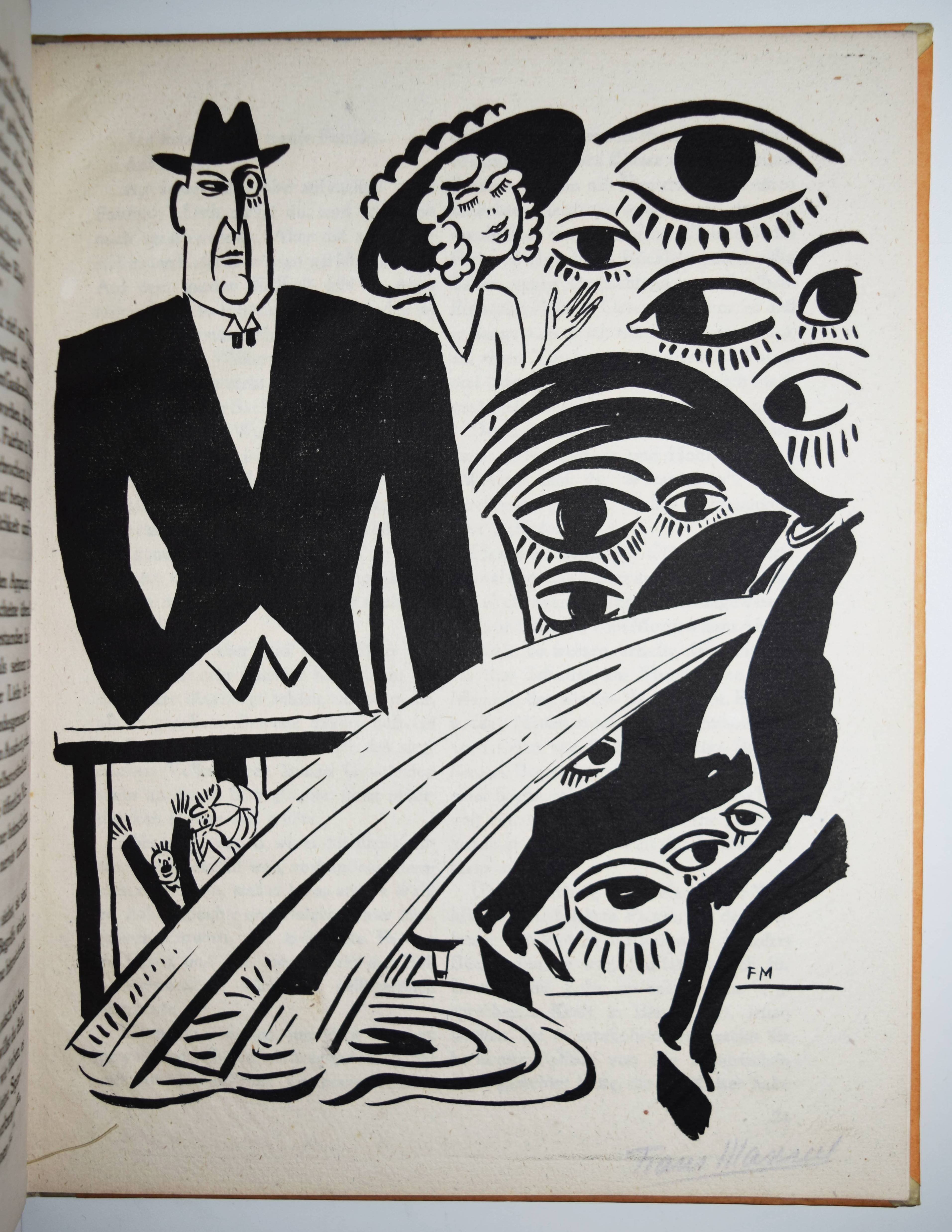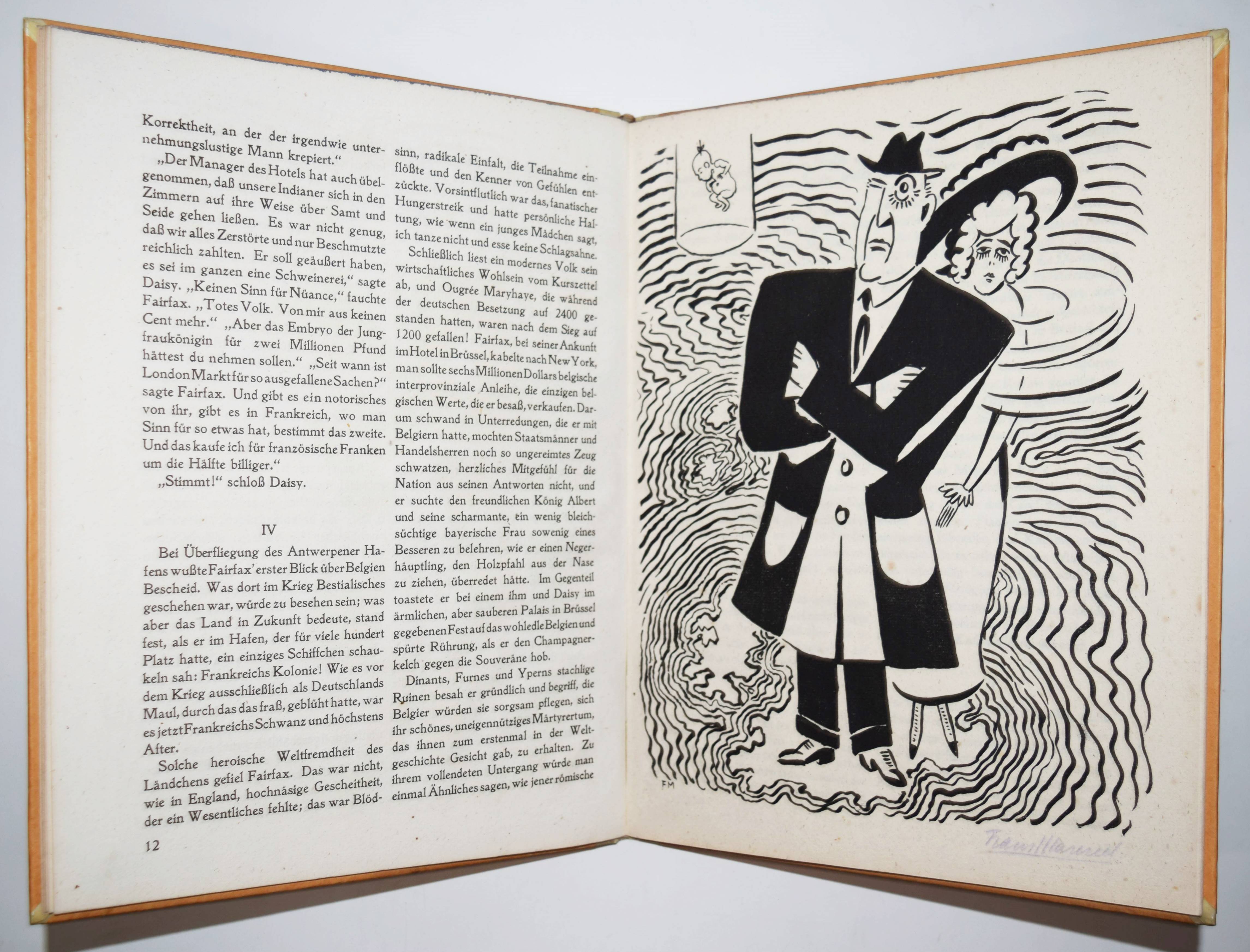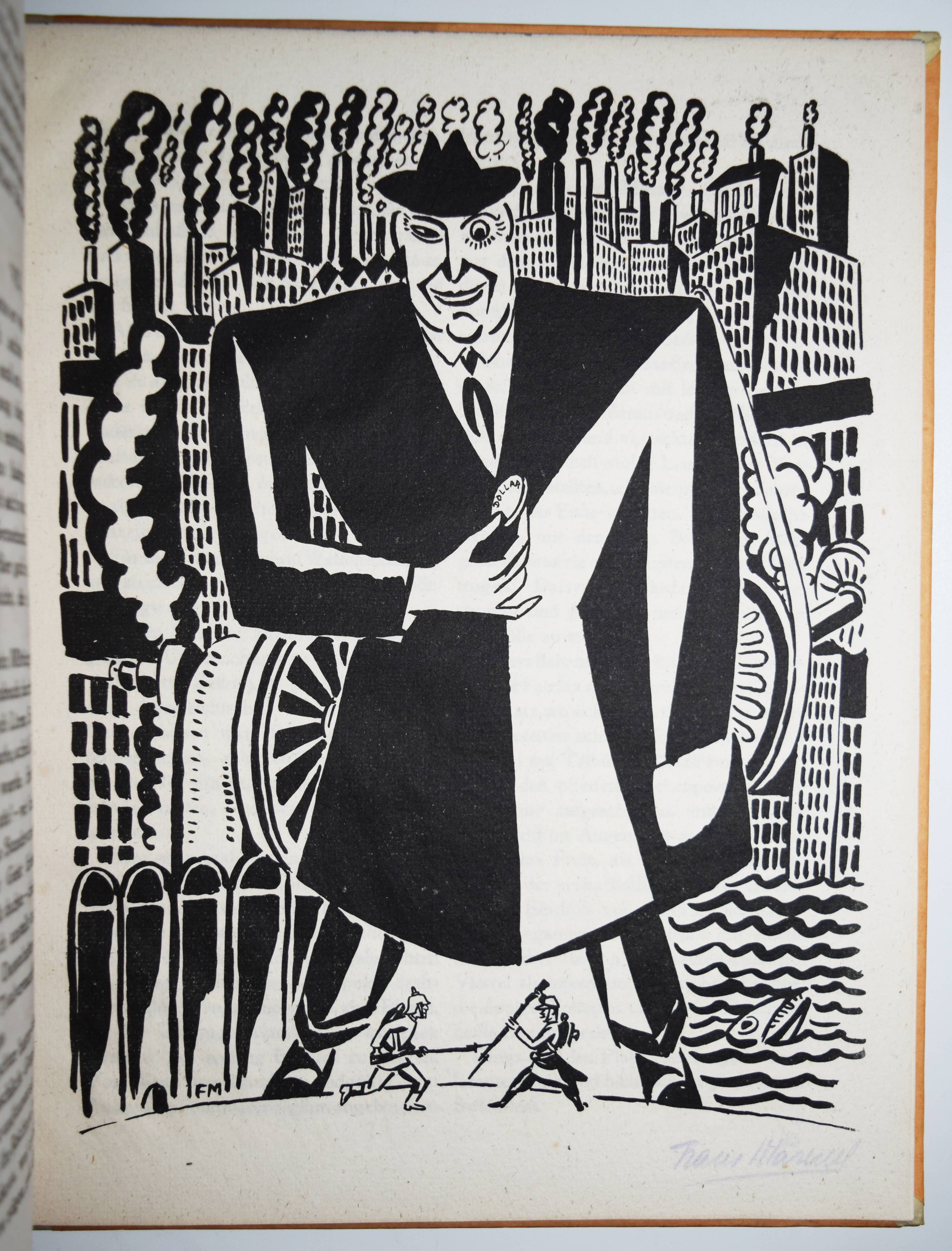 Sternheim, Carl. Fairfax. Geschmückt mit 10 Lithographien von Frans Masereel. Berlin, Düsseldorf, Frankfurt a. M., Galerie Flechtheim 1922. 4°. 35 S., [2] Bl. mit zehn signierten Lithographien. Illustr. Orig.-Halbpergamentband. (XVII. Druck der Galerie Flechtheim). Jentsch, Expressionismus 120. Raabe 291.3. Ritter C a 24. Rodenberg 355, 17. – Erste Ausgabe mit diesen Illustrationen. – Eines von 140 Exemplaren auf rauem altgetönten Bütten (Gesamtauflage 200 Exemplare). Im Druckvermerk von C. Sternheim und F. Masereel signiert und alle Lithographien vom Künstler signiert. – Carl Sternheims Erzählung „Fairfax“ erschien zuerst 1921 bei Ernst Rowohlt in Berlin. – In der Zeitschrift „Der Querschnitt“ äußerte sich Sternheim enthusiastisch über die Illustrationen Masereels: „Über den Schwarzweißkünstler Masereel steht das europäische Urteil fest: ein Phänomen! […] Masereels himmlische Bilder zum Fairfax aber haben mir wieder bewiesen: manchmal ist Leben doch feine Sache!“ (zitiert nach Jentsch). – Die letzte Lithographie etwas braunfleckig, sehr gutes Exemplar.