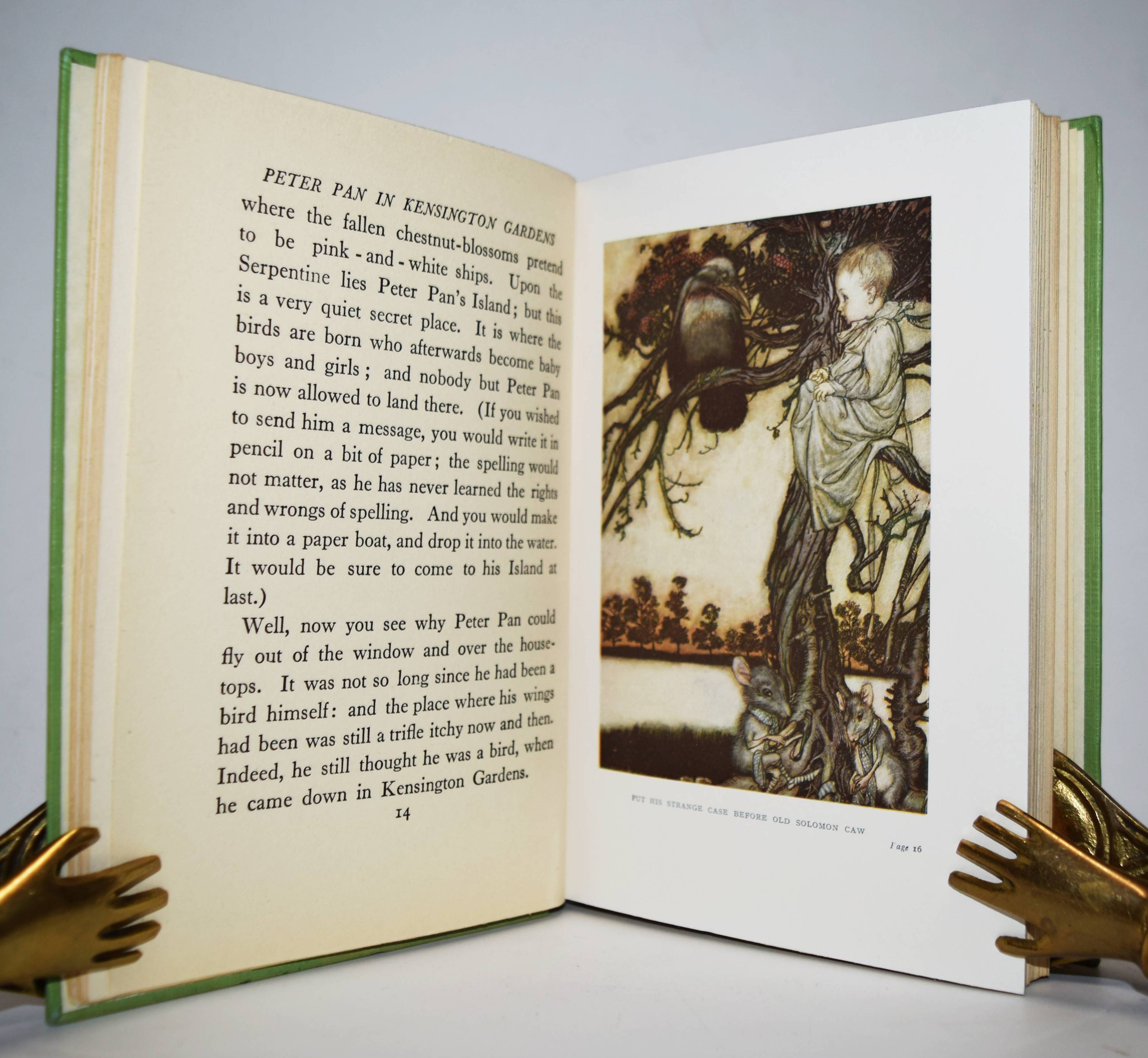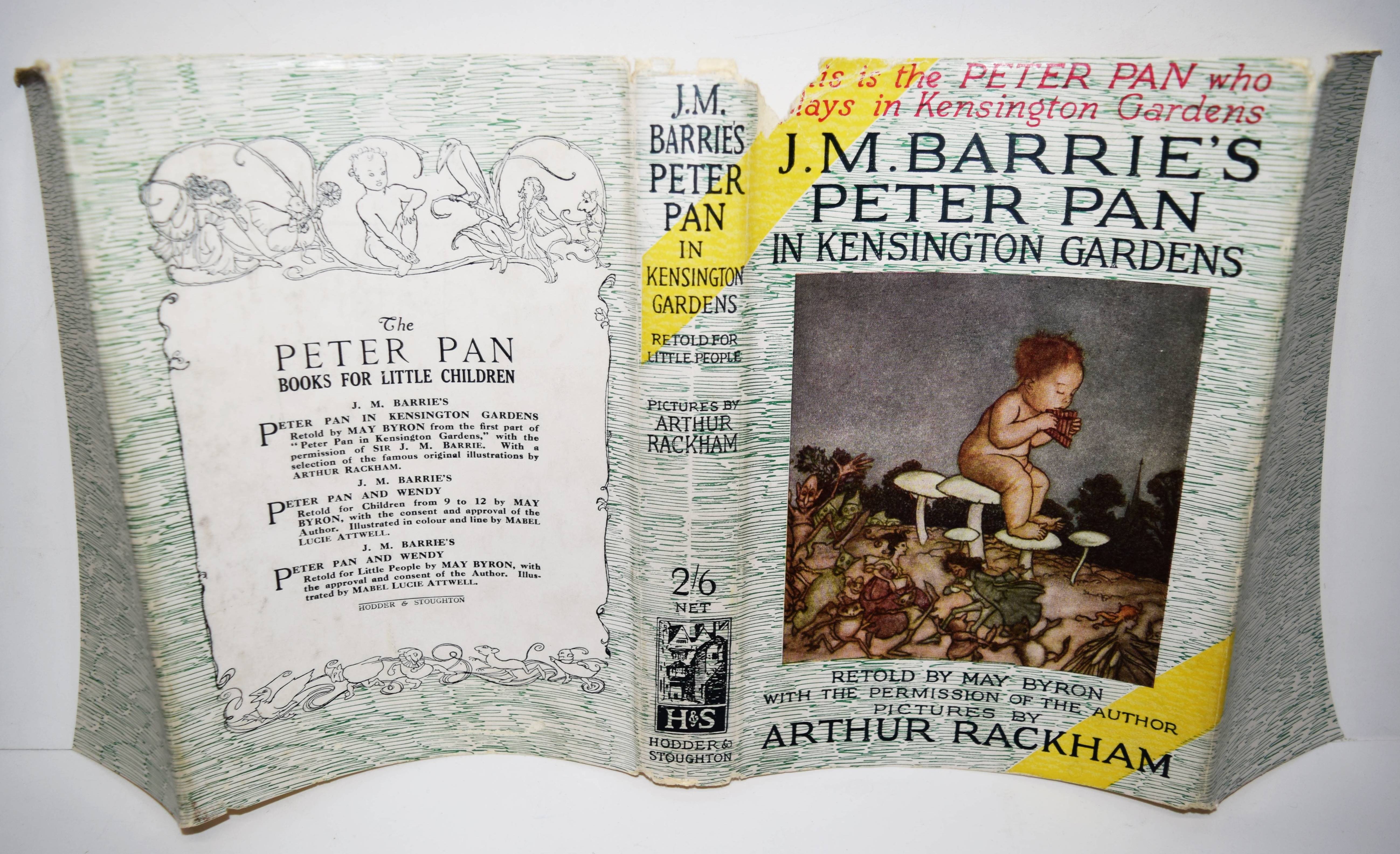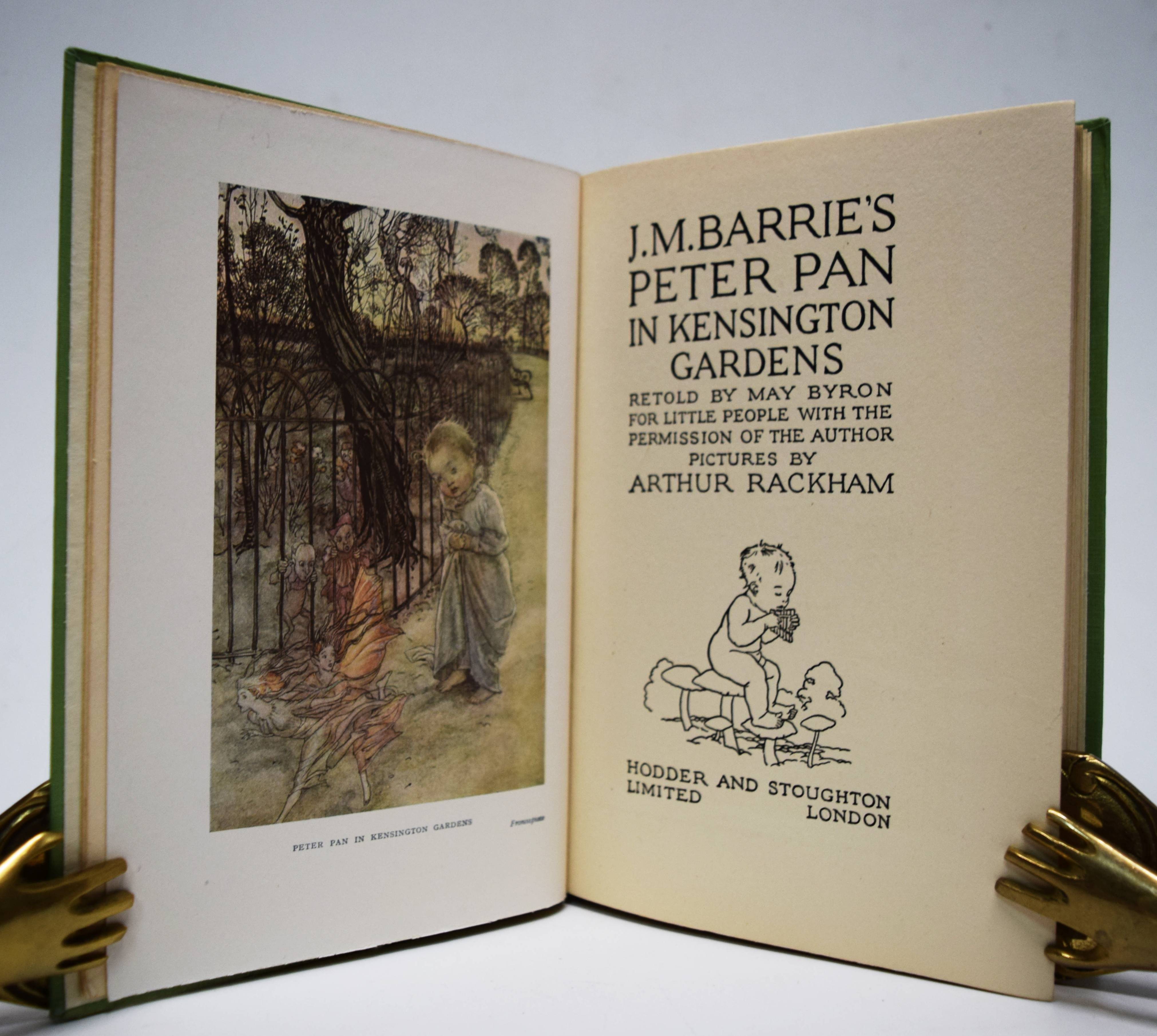 Barrie, J(ames) M(atthew). Peter Pan in Kensington Gardens. Retold by May Byron for little people with the permission of the author. Pictures by Arthur Rackham. London, Hodder and Stoughton o. J. (um 1930). 123 S. mit 6 Farbtafeln und teils ganzs. Illustrationen. Illustr. Orig.-Pappband mit farbig illustr. Schutzumschlag. LKJ I, 108; III, 23 und 114. – Spätere Ausgabe; die erste Ausgabe erschien 1906. – Schutzumschlag am Vorderdeckel mit kleinem Randausriss, gutes Exemplar.