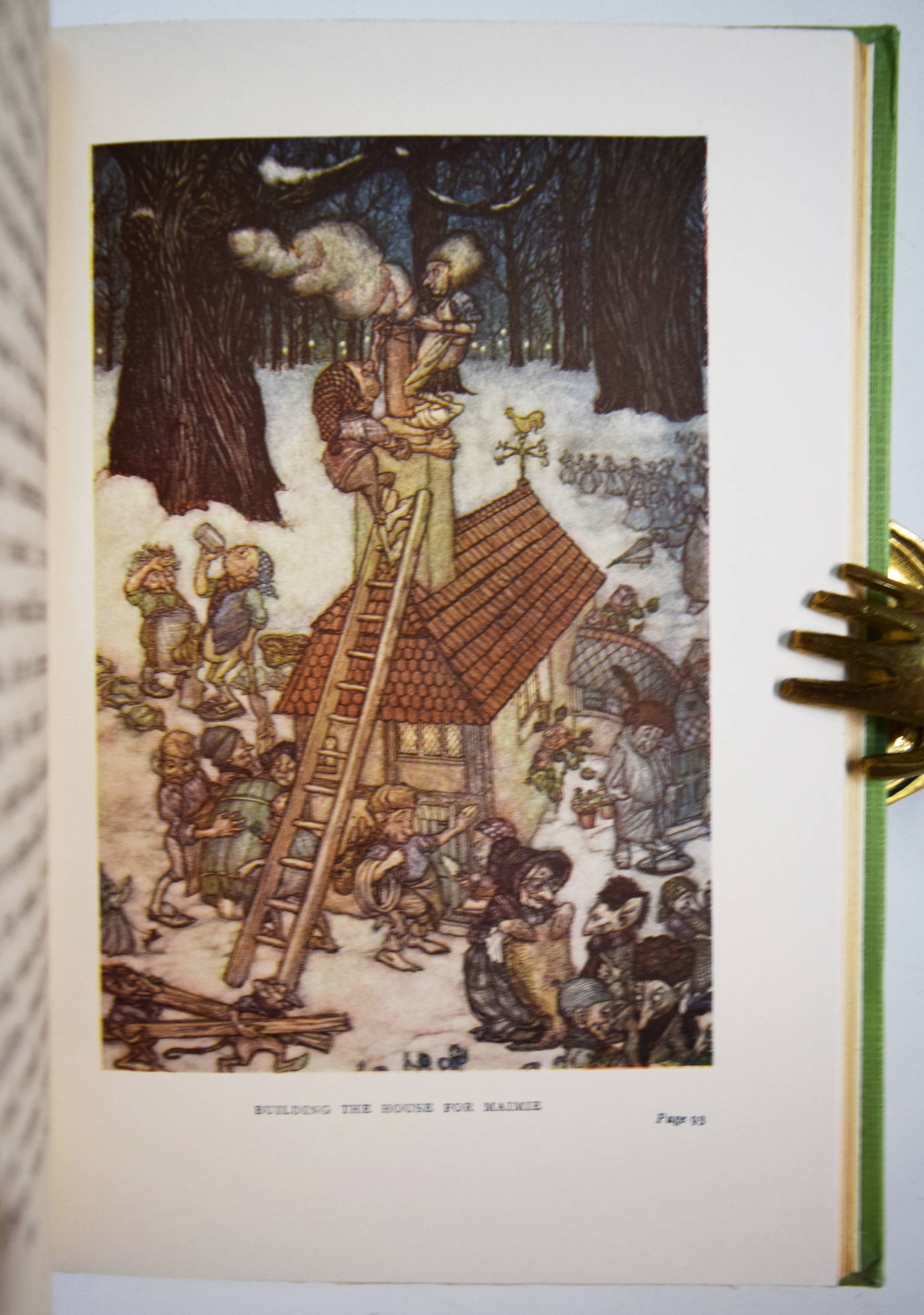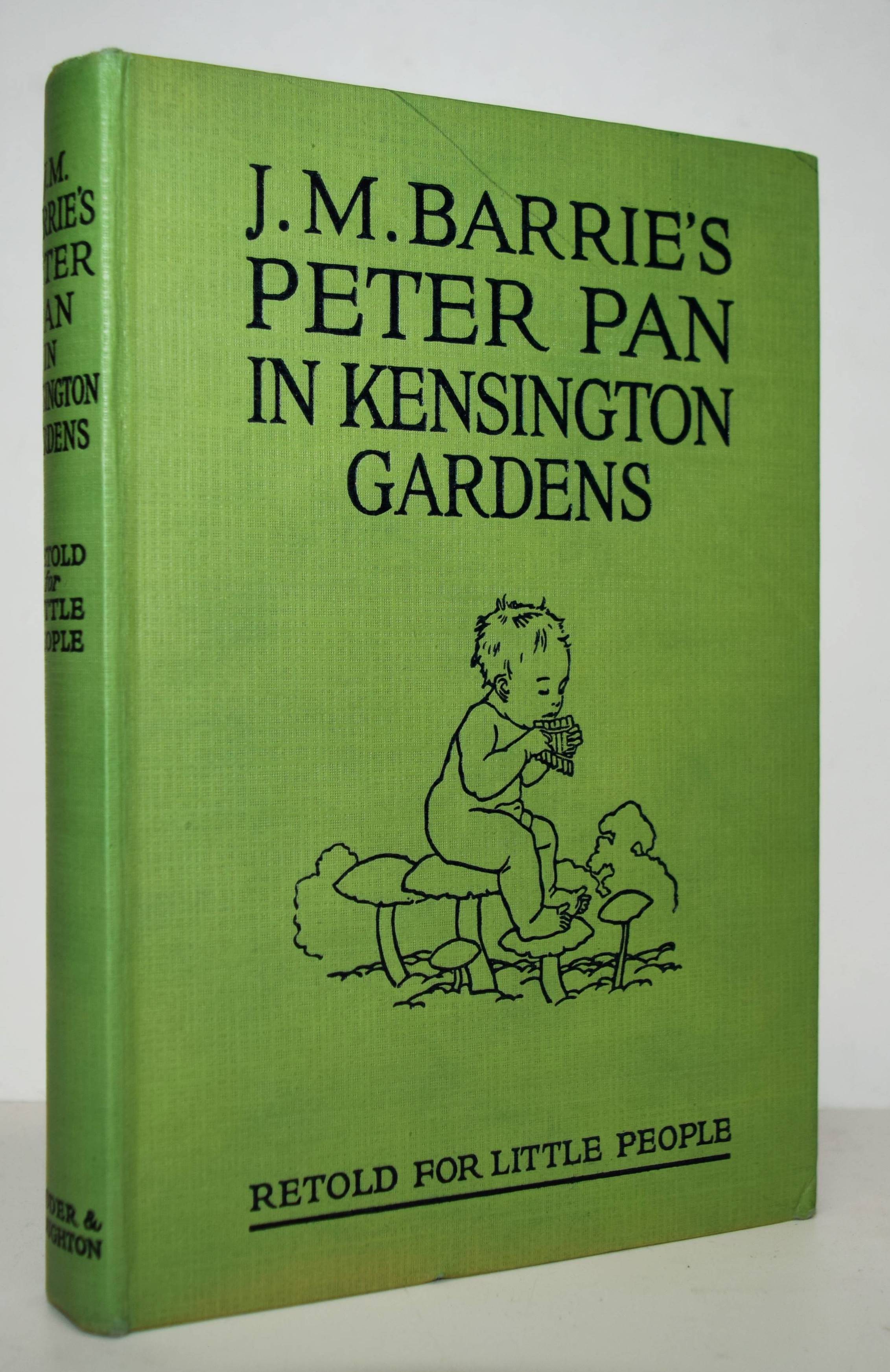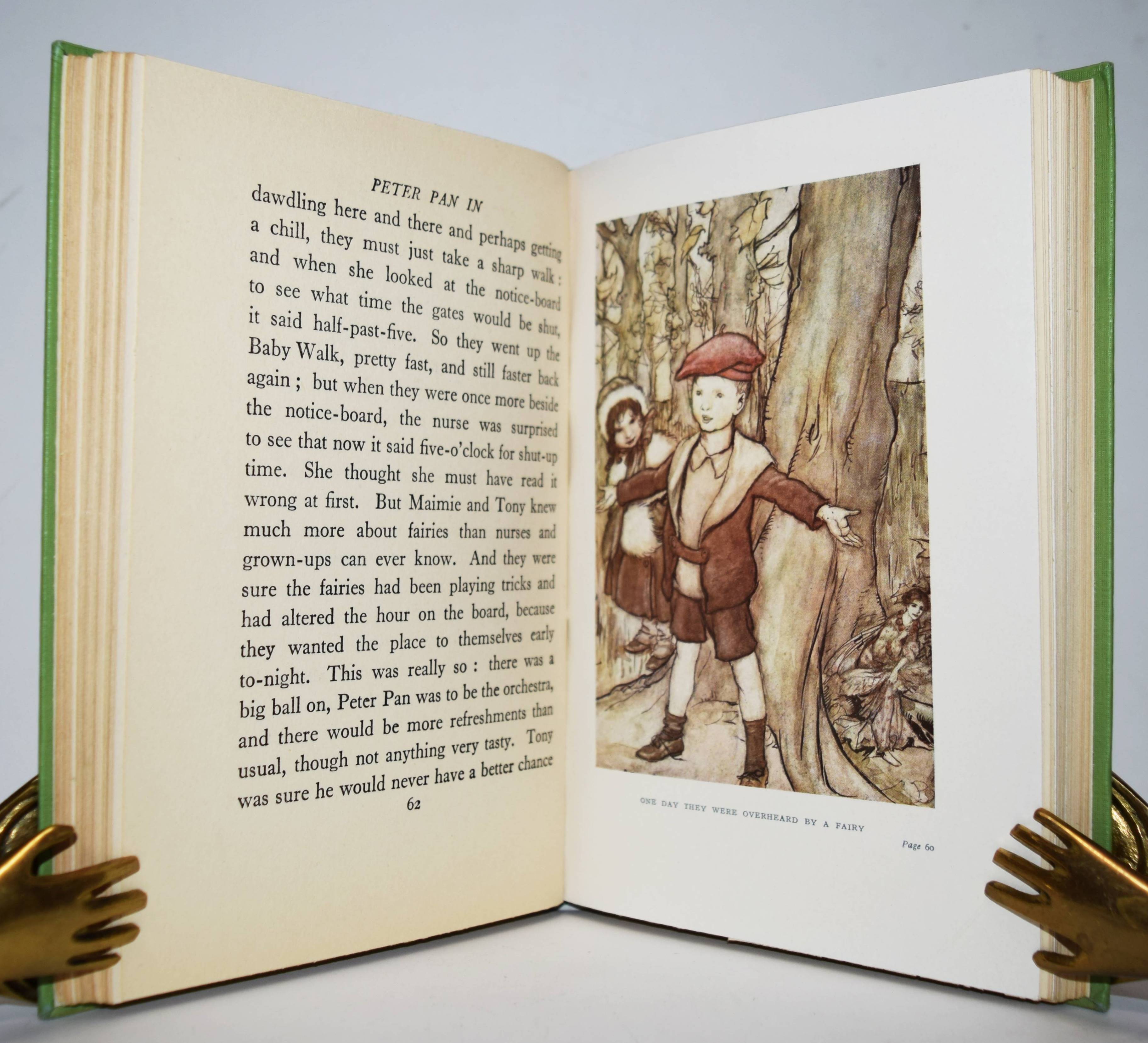 Barrie, J(ames) M(atthew). Peter Pan in Kensington Gardens. Retold by May Byron for little people with the permission of the author. Pictures by Arthur Rackham. London, Hodder and Stoughton o. J. (um 1930). 123 S. mit 6 Farbtafeln und teils ganzs. Illustrationen. Illustr. Orig.-Pappband mit farbig illustr. Schutzumschlag. LKJ I, 108; III, 23 und 114. – Spätere Ausgabe; die erste Ausgabe erschien 1906. – Schutzumschlag am Vorderdeckel mit kleinem Randausriss, gutes Exemplar.