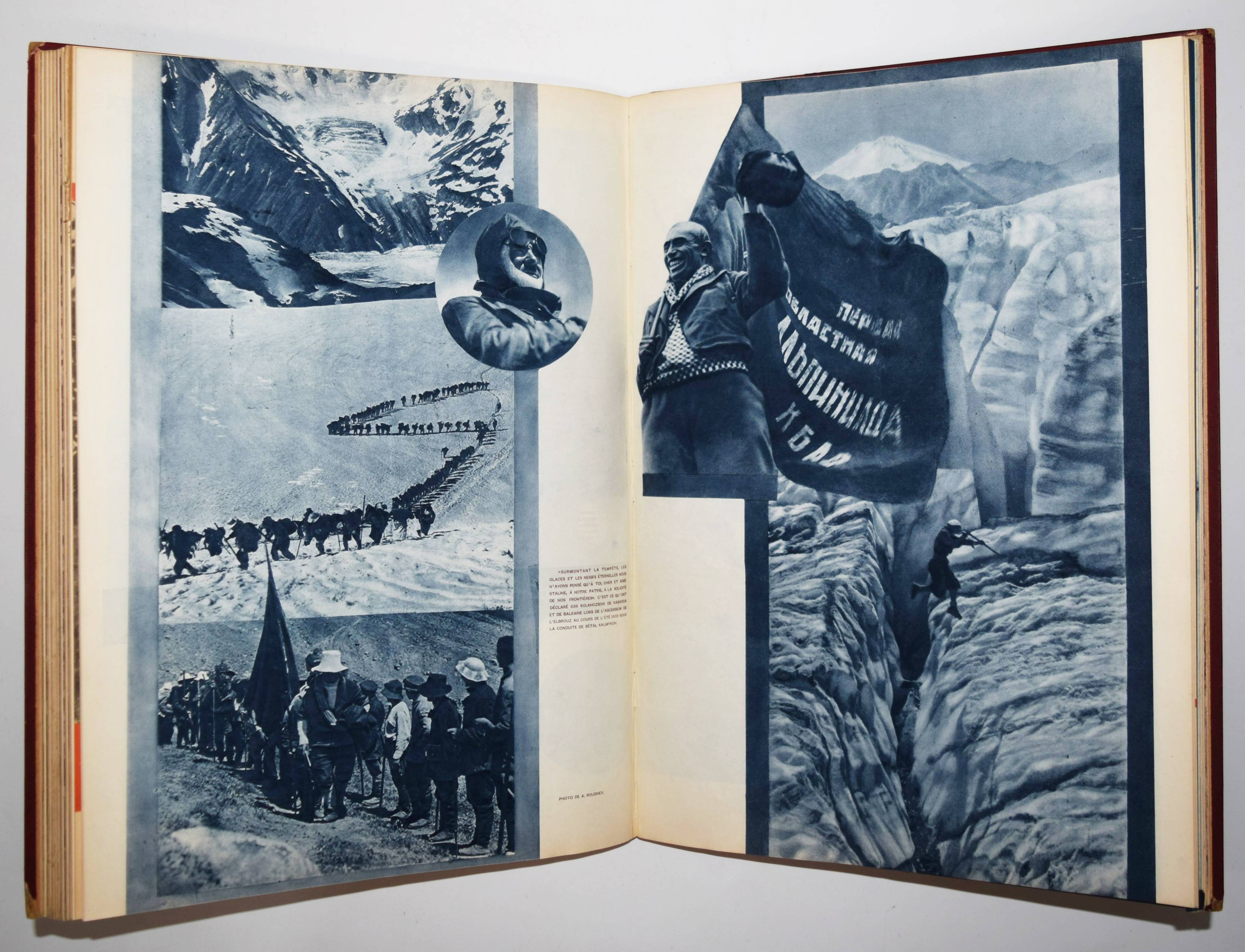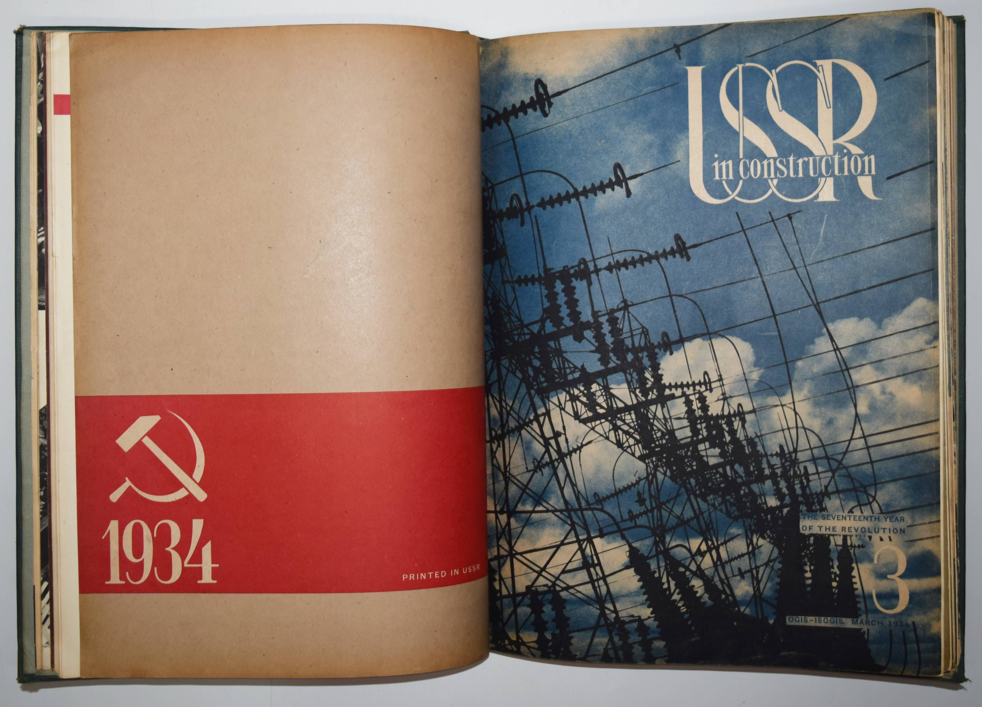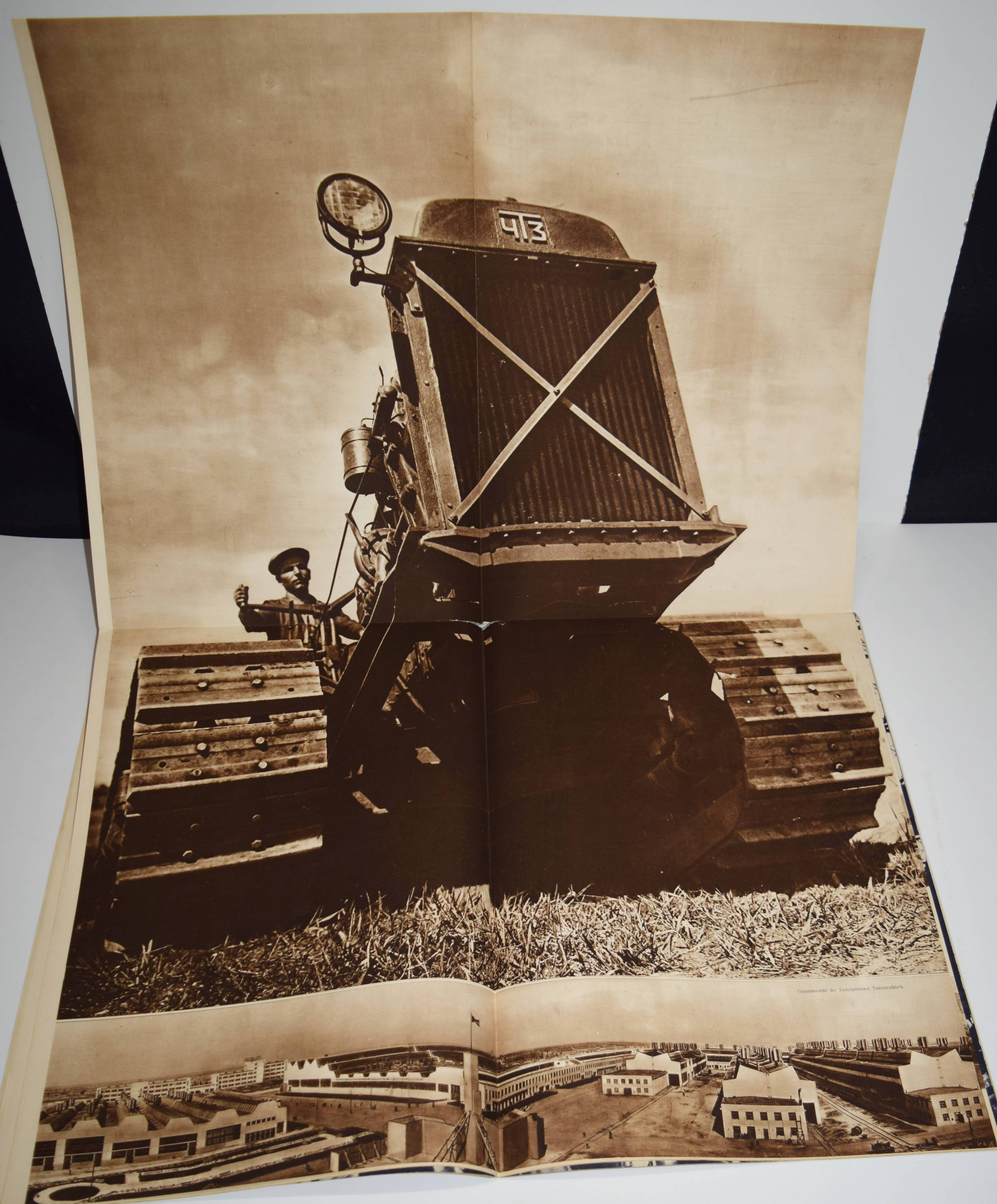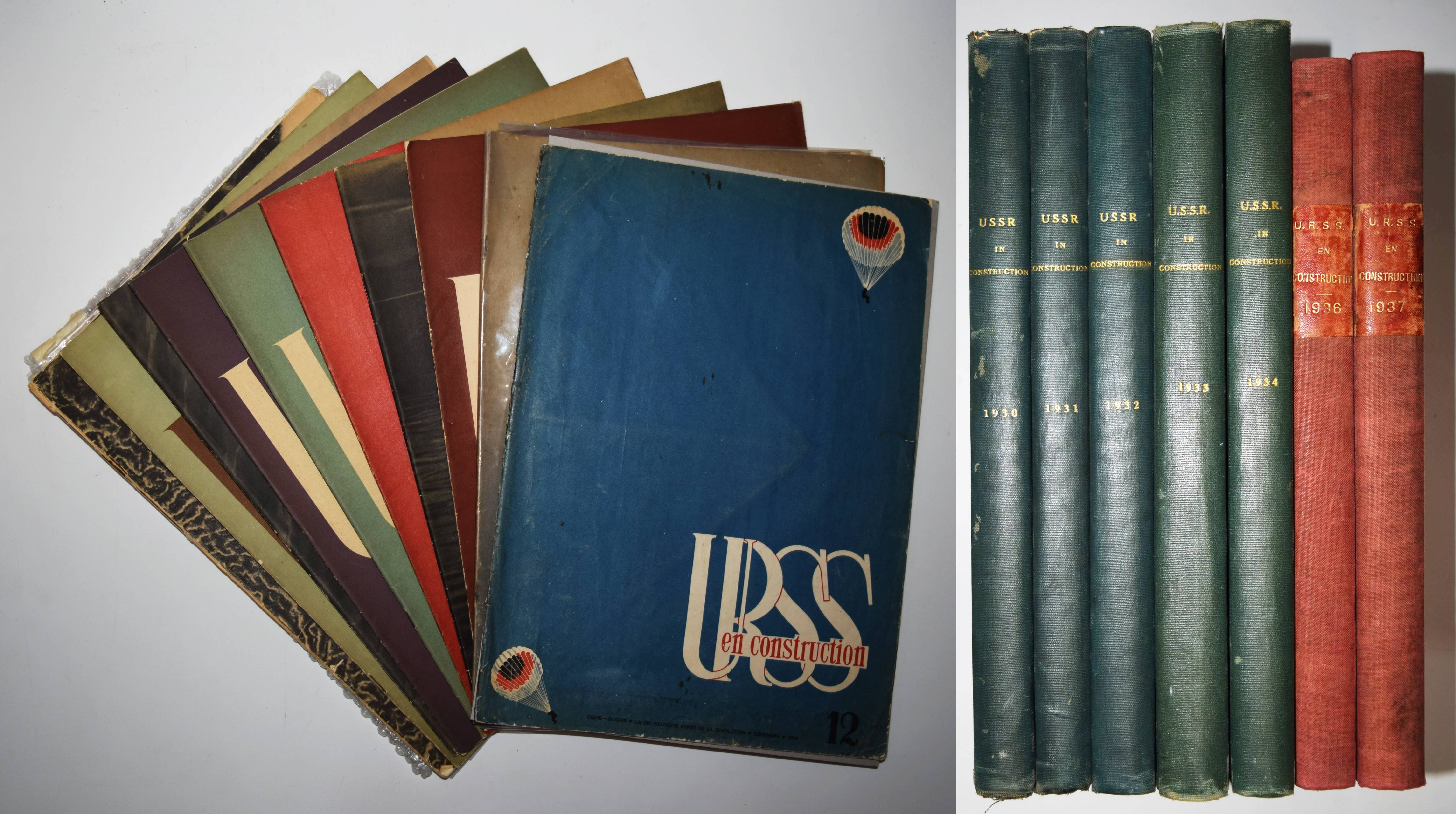 Pjatakov, G(eorgi Leonidowitsch, Editor in Chief). USSR in construction. – URSS en construction. Illustrated monthly magazine. – Revue mensuelle illustrée. – Year 1930 – 1937. – Année 1930 – 1937. 84 issues in 7 volumes and 12 issues unbound (1935). Moscow, State Publishing House of the RSFSR 1930-1937. Folio (43 x 30 cm.). With numerous illustrations and fold-out plates Contemporary linen bindings with gold-embossed spine titles (illustrated covers bound in, cover designs by El Lissitzky, Aleksandr Rodchenko and others). Hellyer 860. Karasik/Heiting 17 ff. Rowell/Wye 242 f. – The first eight volumes of the most important Soviet propaganda magazine. The volumes from 1930 to 1934 are in English and those from 1935 to 1937 are in French; the 1935 volume is available in individual issues. The magazine was published monthly from 1930 to 1949 in five languages (Russian, English, French, Spanish and German). Each issue was dedicated to a different subject, such as food and industrial production, the republic of Georgia, Soviet cinema and elections. – „In the early 1930s photo-reportage became the foundation of the magazine USSR in Construction that „was created as a publication for the popularization of large-scale construction projects by photographic means. But as the magazine grew and developed, the task of ‘popularization’ evolved into that of presenting Socialist reality with dramatic artistry.“ (L. Mezhericher, „Na putiakh k sotsialisticheskomu stiliu fotografii” [“On the way to a Socialist style of photography“], No. 2, p. 14). Well known Soviet designers and photographers worked on USSR in Construction. The industrial spirit of the magazine, expressed in compositionally sharp subjects, panoramas and dynamic shots evokes admiration even today and conveys the atmosphere of enthusiasm that carried along not just the photographers, but also the builders themselves. The creative scale of the construction engendered the photographic epic, a style of monumental artistic photography. The founders of this most successful and high-quality periodical were Gorky and Koltsov“ (Mikhail Karasik). – Binding slightly rubbed, otherwise in very good condition except for slight signs of wear and age.