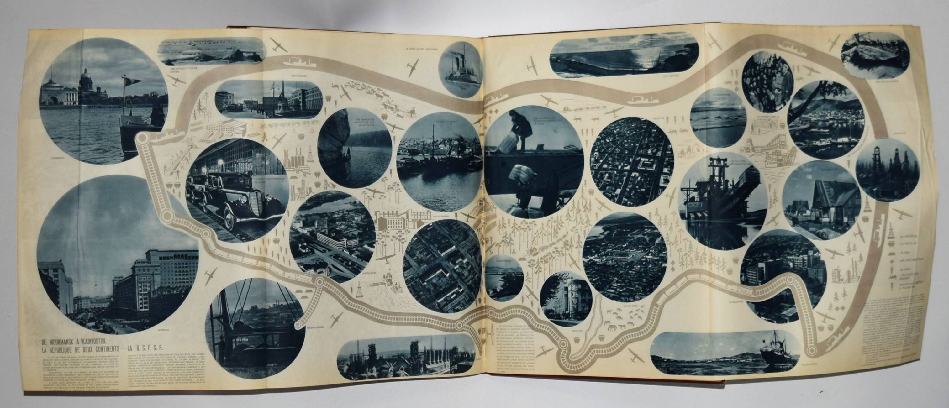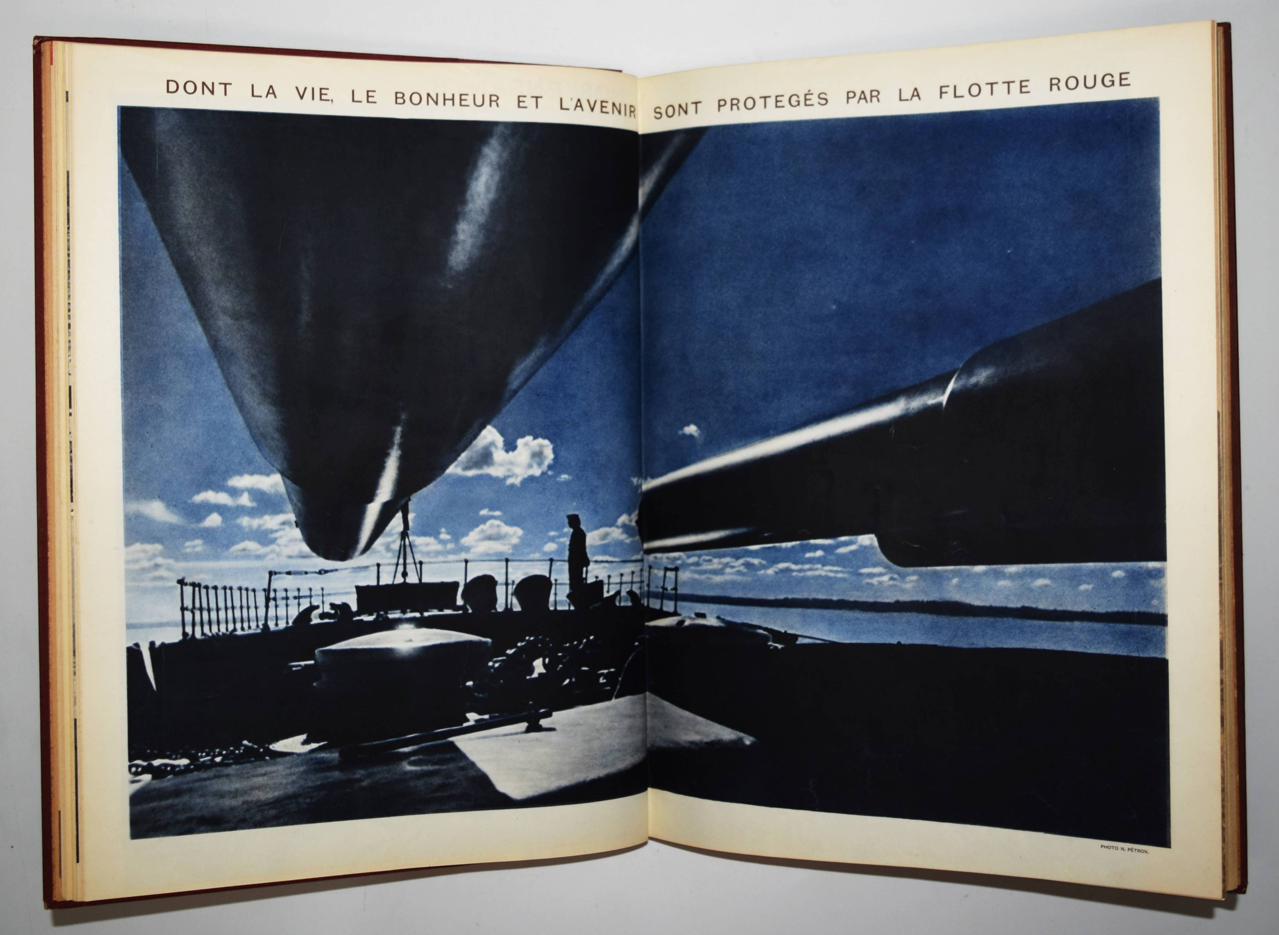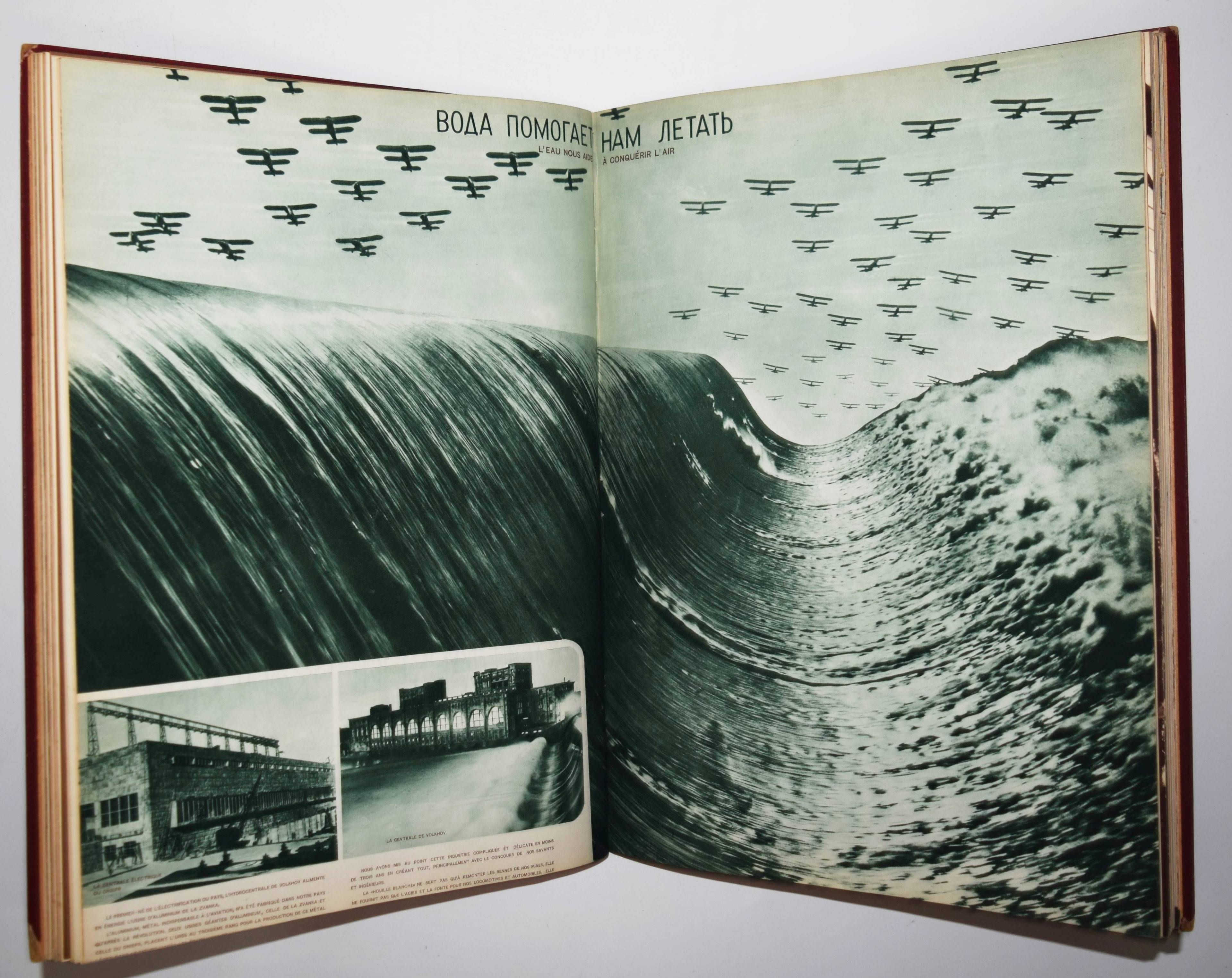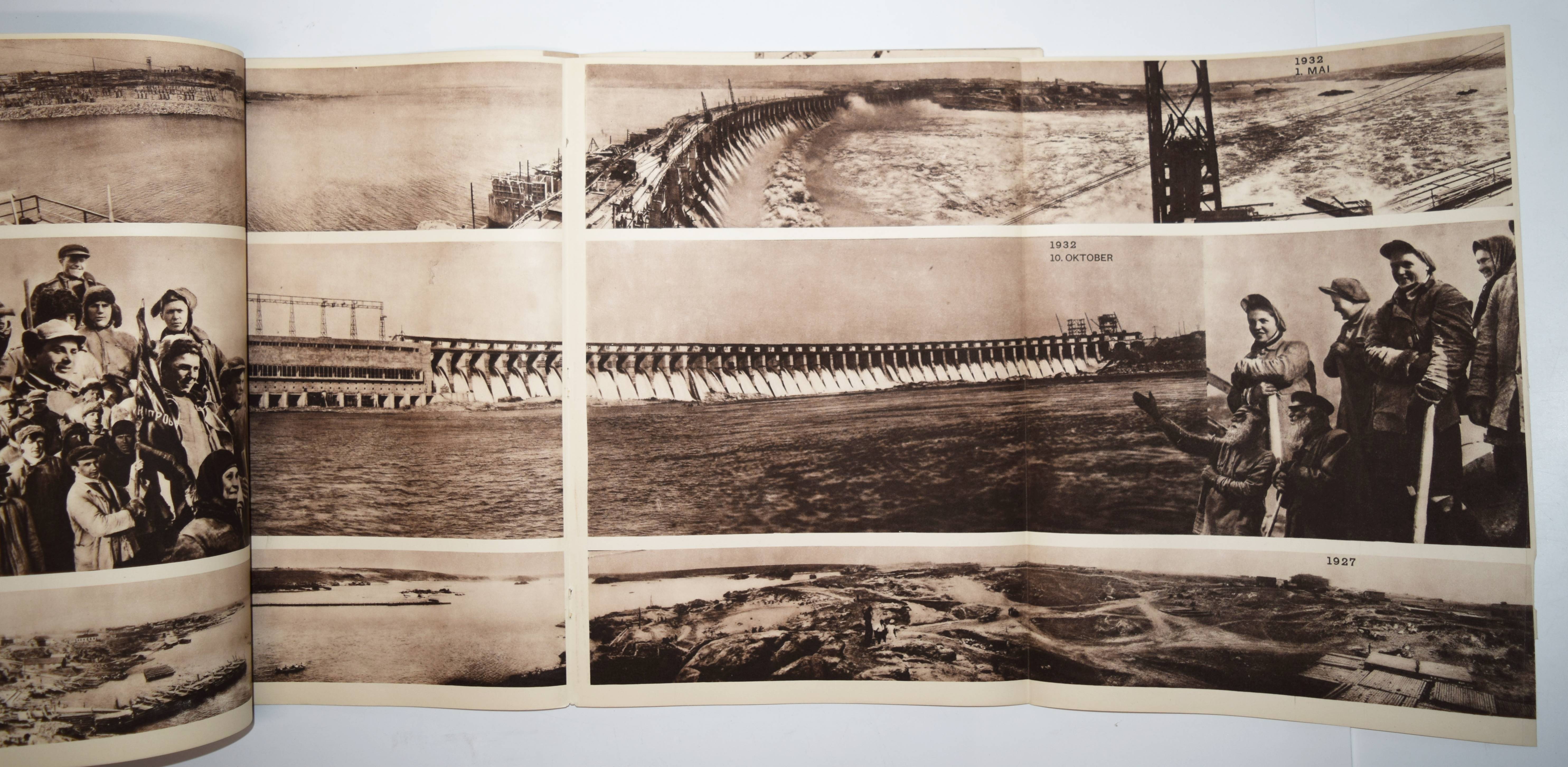 Pjatakov, G(eorgi Leonidowitsch, Editor in Chief). USSR in construction. – URSS en construction. Illustrated monthly magazine. – Revue mensuelle illustrée. – Year 1930 – 1937. – Année 1930 – 1937. 84 issues in 7 volumes and 12 issues unbound (1935). Moscow, State Publishing House of the RSFSR 1930-1937. Folio (43 x 30 cm.). With numerous illustrations and fold-out plates Contemporary linen bindings with gold-embossed spine titles (illustrated covers bound in, cover designs by El Lissitzky, Aleksandr Rodchenko and others). Hellyer 860. Karasik/Heiting 17 ff. Rowell/Wye 242 f. – The first eight volumes of the most important Soviet propaganda magazine. The volumes from 1930 to 1934 are in English and those from 1935 to 1937 are in French; the 1935 volume is available in individual issues. The magazine was published monthly from 1930 to 1949 in five languages (Russian, English, French, Spanish and German). Each issue was dedicated to a different subject, such as food and industrial production, the republic of Georgia, Soviet cinema and elections. – „In the early 1930s photo-reportage became the foundation of the magazine USSR in Construction that „was created as a publication for the popularization of large-scale construction projects by photographic means. But as the magazine grew and developed, the task of ‘popularization’ evolved into that of presenting Socialist reality with dramatic artistry.“ (L. Mezhericher, „Na putiakh k sotsialisticheskomu stiliu fotografii” [“On the way to a Socialist style of photography“], No. 2, p. 14). Well known Soviet designers and photographers worked on USSR in Construction. The industrial spirit of the magazine, expressed in compositionally sharp subjects, panoramas and dynamic shots evokes admiration even today and conveys the atmosphere of enthusiasm that carried along not just the photographers, but also the builders themselves. The creative scale of the construction engendered the photographic epic, a style of monumental artistic photography. The founders of this most successful and high-quality periodical were Gorky and Koltsov“ (Mikhail Karasik). – Binding slightly rubbed, otherwise in very good condition except for slight signs of wear and age.