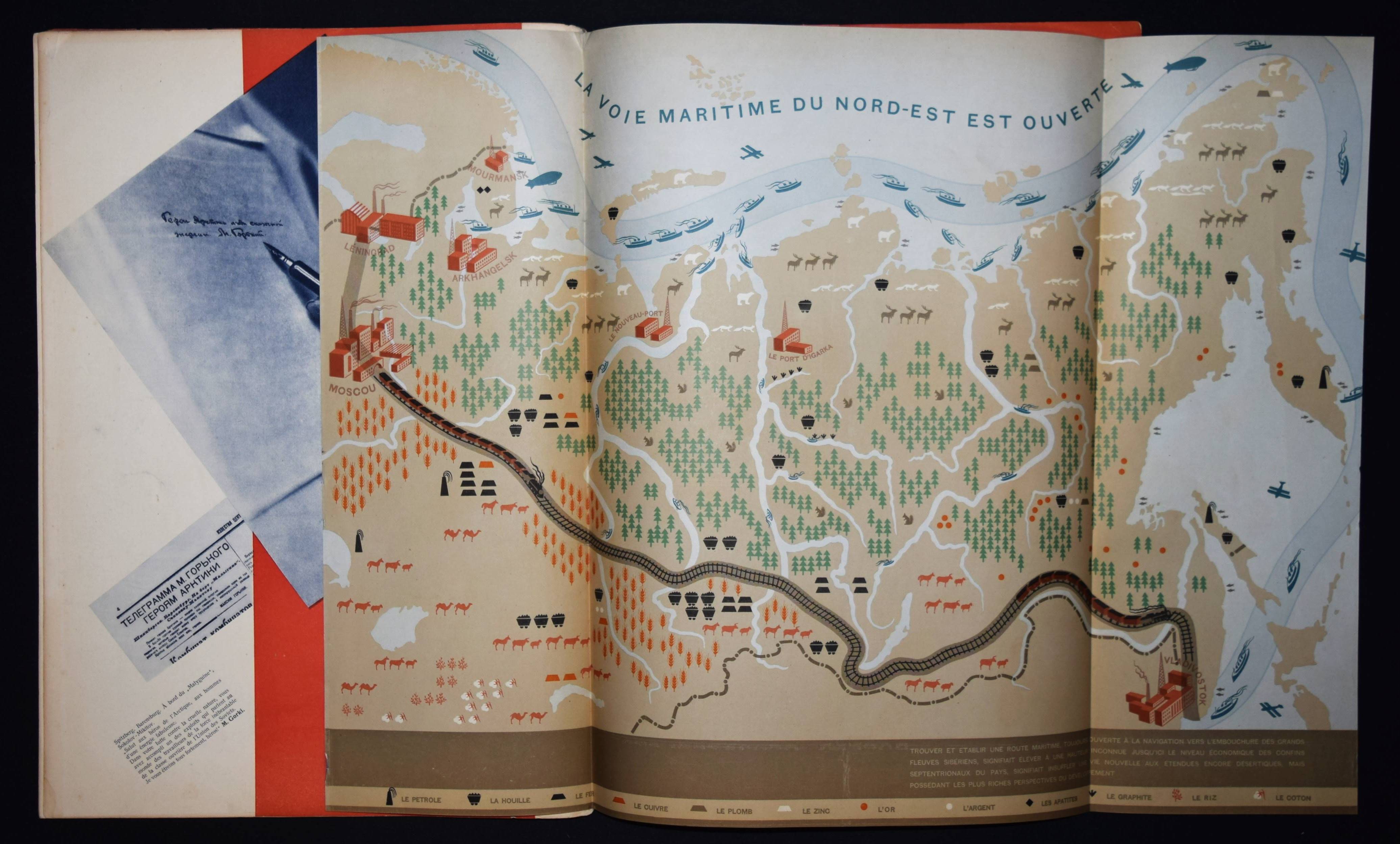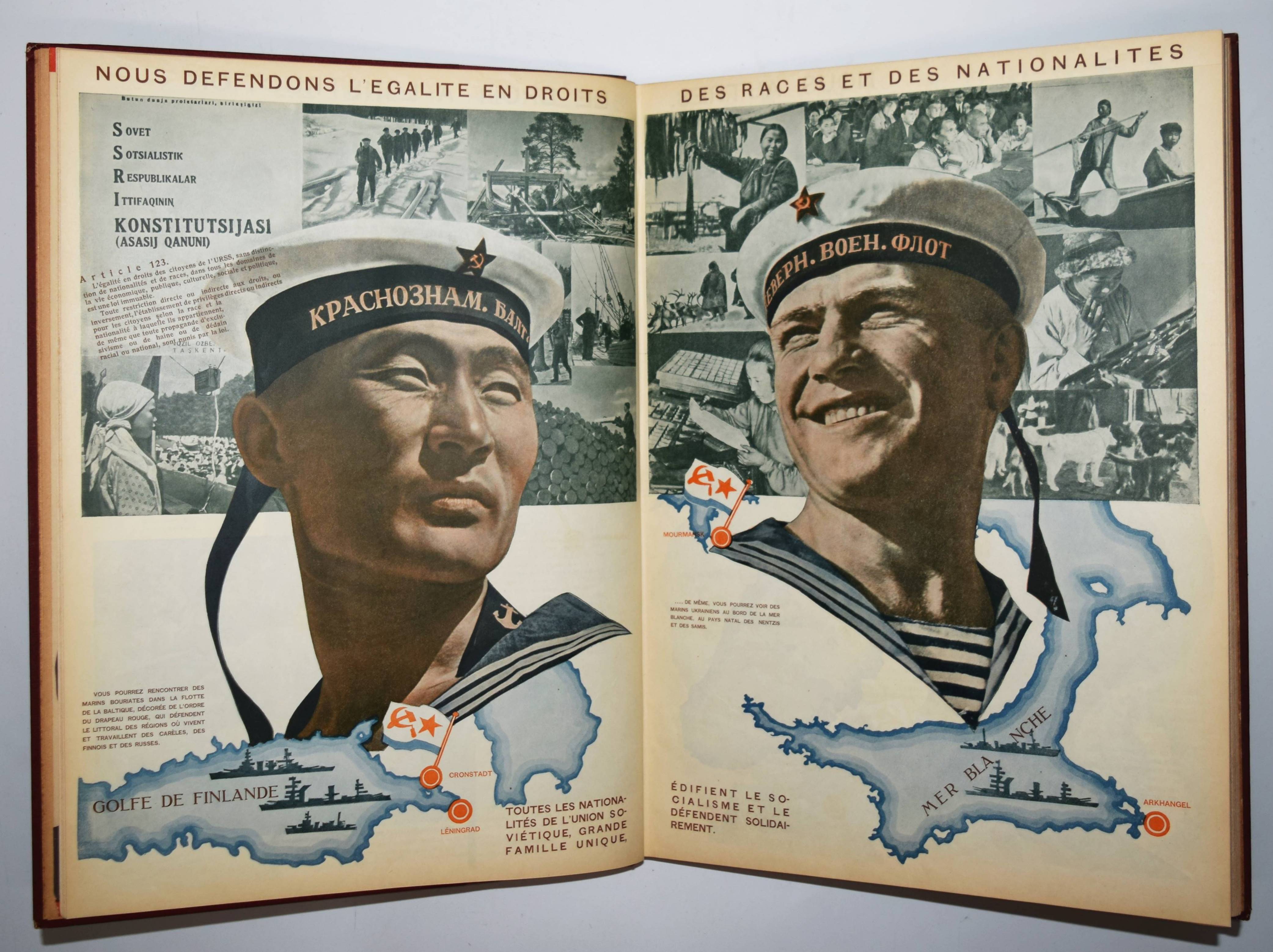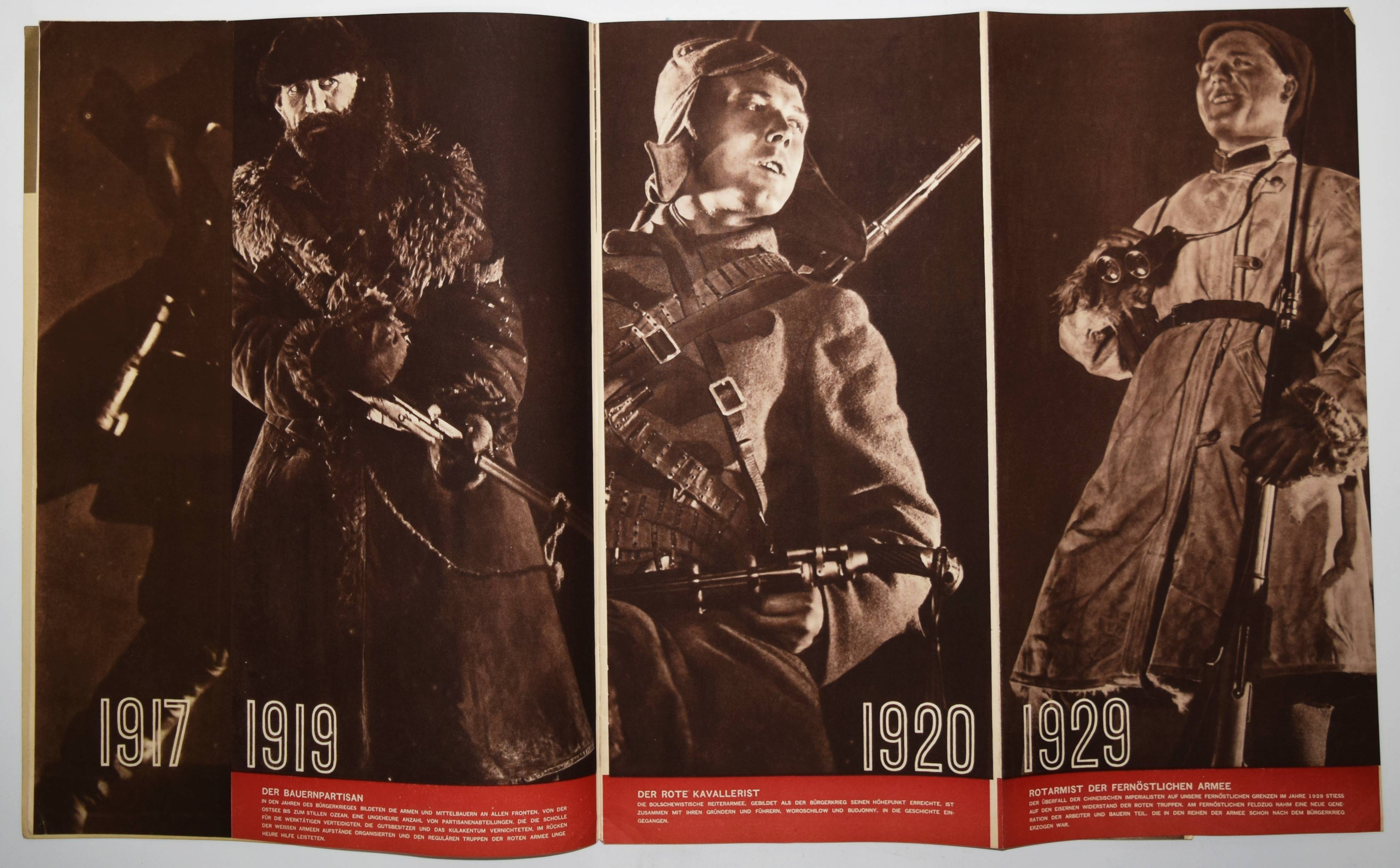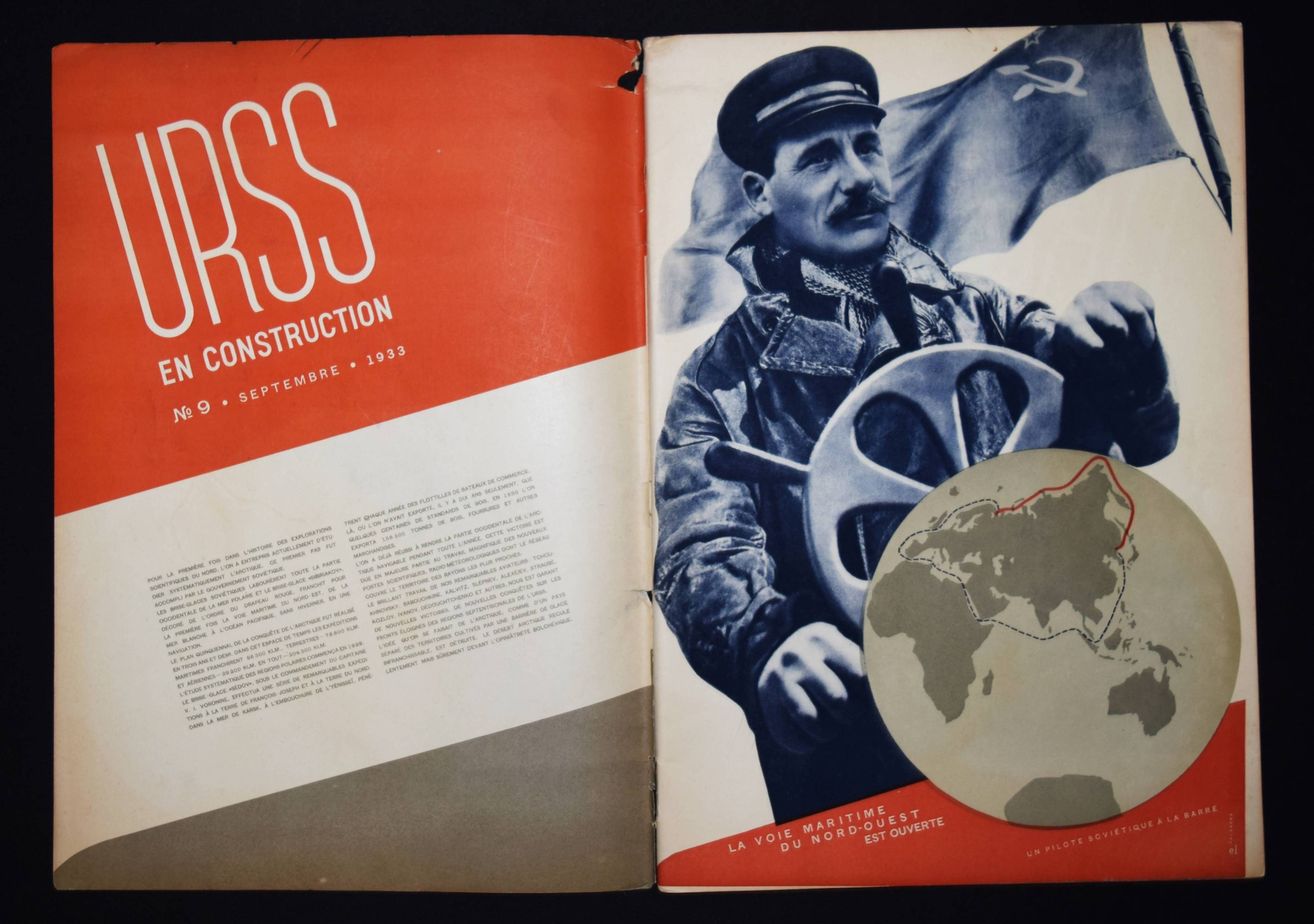 Pjatakov, G(eorgi Leonidowitsch, Editor in Chief). USSR in construction. – URSS en construction. Illustrated monthly magazine. – Revue mensuelle illustrée. – Year 1930 – 1937. – Année 1930 – 1937. 84 issues in 7 volumes and 12 issues unbound (1935). Moscow, State Publishing House of the RSFSR 1930-1937. Folio (43 x 30 cm.). With numerous illustrations and fold-out plates Contemporary linen bindings with gold-embossed spine titles (illustrated covers bound in, cover designs by El Lissitzky, Aleksandr Rodchenko and others). Hellyer 860. Karasik/Heiting 17 ff. Rowell/Wye 242 f. – The first eight volumes of the most important Soviet propaganda magazine. The volumes from 1930 to 1934 are in English and those from 1935 to 1937 are in French; the 1935 volume is available in individual issues. The magazine was published monthly from 1930 to 1949 in five languages (Russian, English, French, Spanish and German). Each issue was dedicated to a different subject, such as food and industrial production, the republic of Georgia, Soviet cinema and elections. – „In the early 1930s photo-reportage became the foundation of the magazine USSR in Construction that „was created as a publication for the popularization of large-scale construction projects by photographic means. But as the magazine grew and developed, the task of ‘popularization’ evolved into that of presenting Socialist reality with dramatic artistry.“ (L. Mezhericher, „Na putiakh k sotsialisticheskomu stiliu fotografii” [“On the way to a Socialist style of photography“], No. 2, p. 14). Well known Soviet designers and photographers worked on USSR in Construction. The industrial spirit of the magazine, expressed in compositionally sharp subjects, panoramas and dynamic shots evokes admiration even today and conveys the atmosphere of enthusiasm that carried along not just the photographers, but also the builders themselves. The creative scale of the construction engendered the photographic epic, a style of monumental artistic photography. The founders of this most successful and high-quality periodical were Gorky and Koltsov“ (Mikhail Karasik). – Binding slightly rubbed, otherwise in very good condition except for slight signs of wear and age.