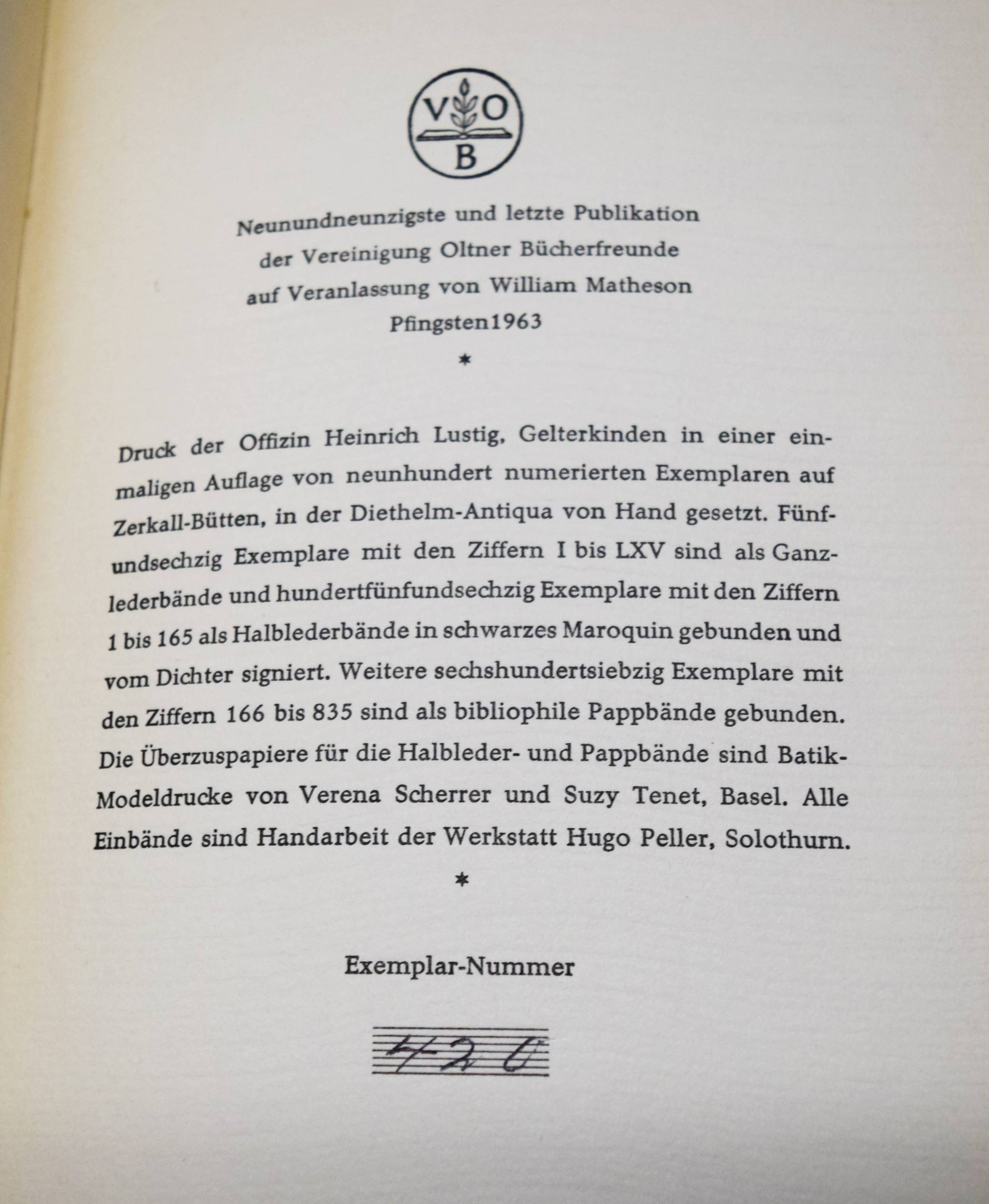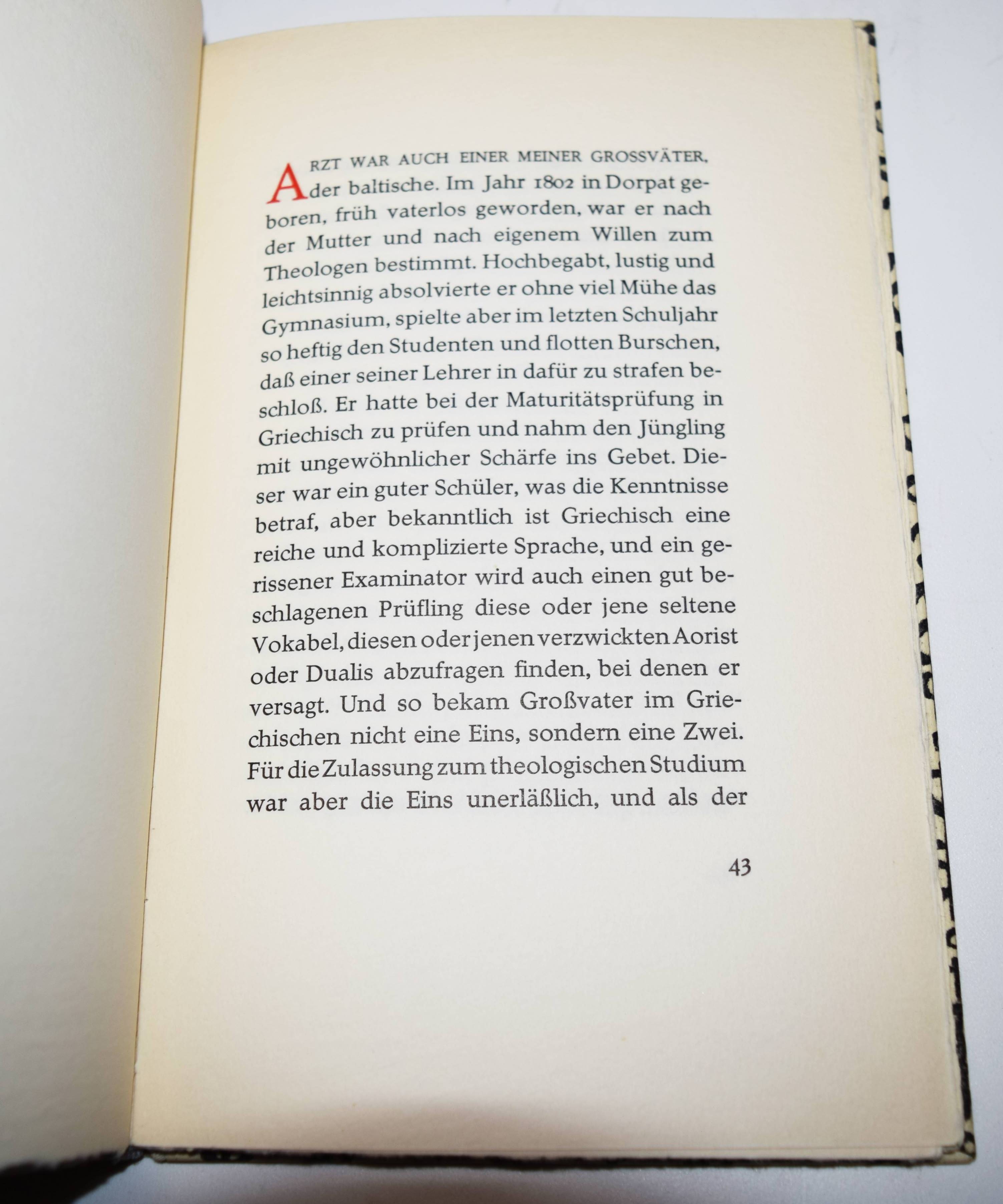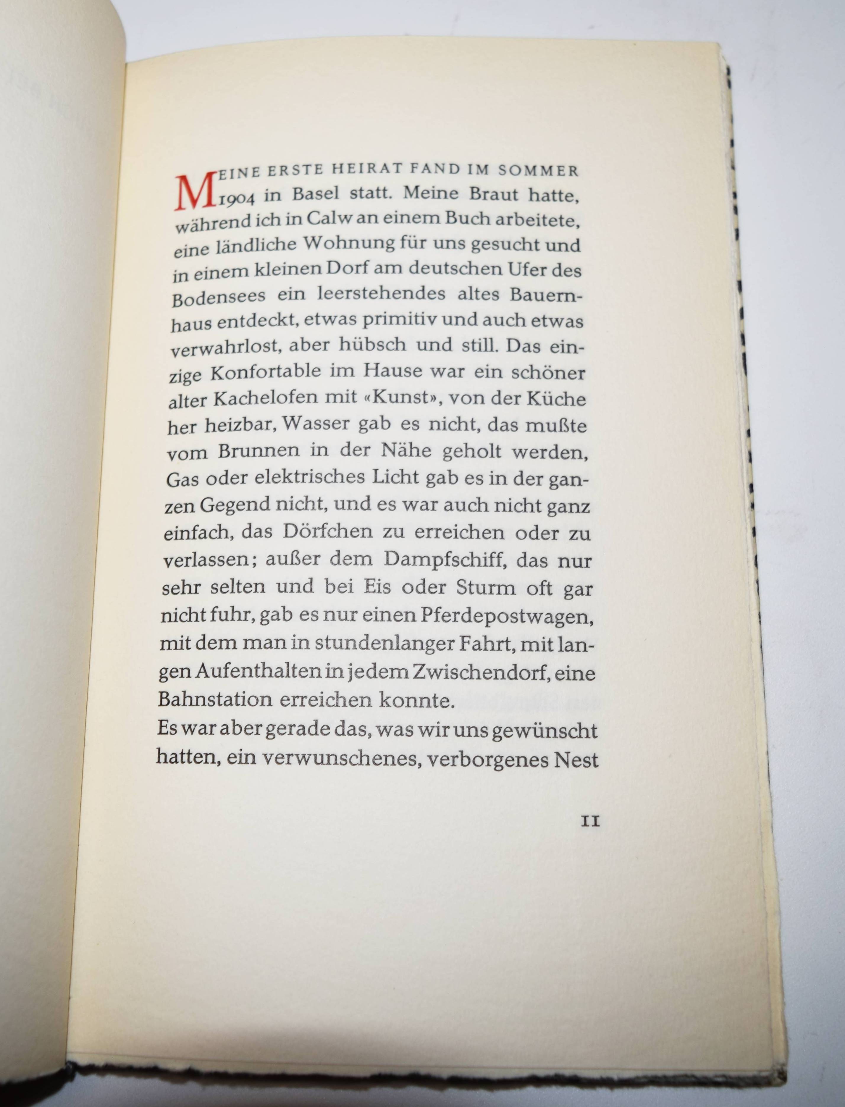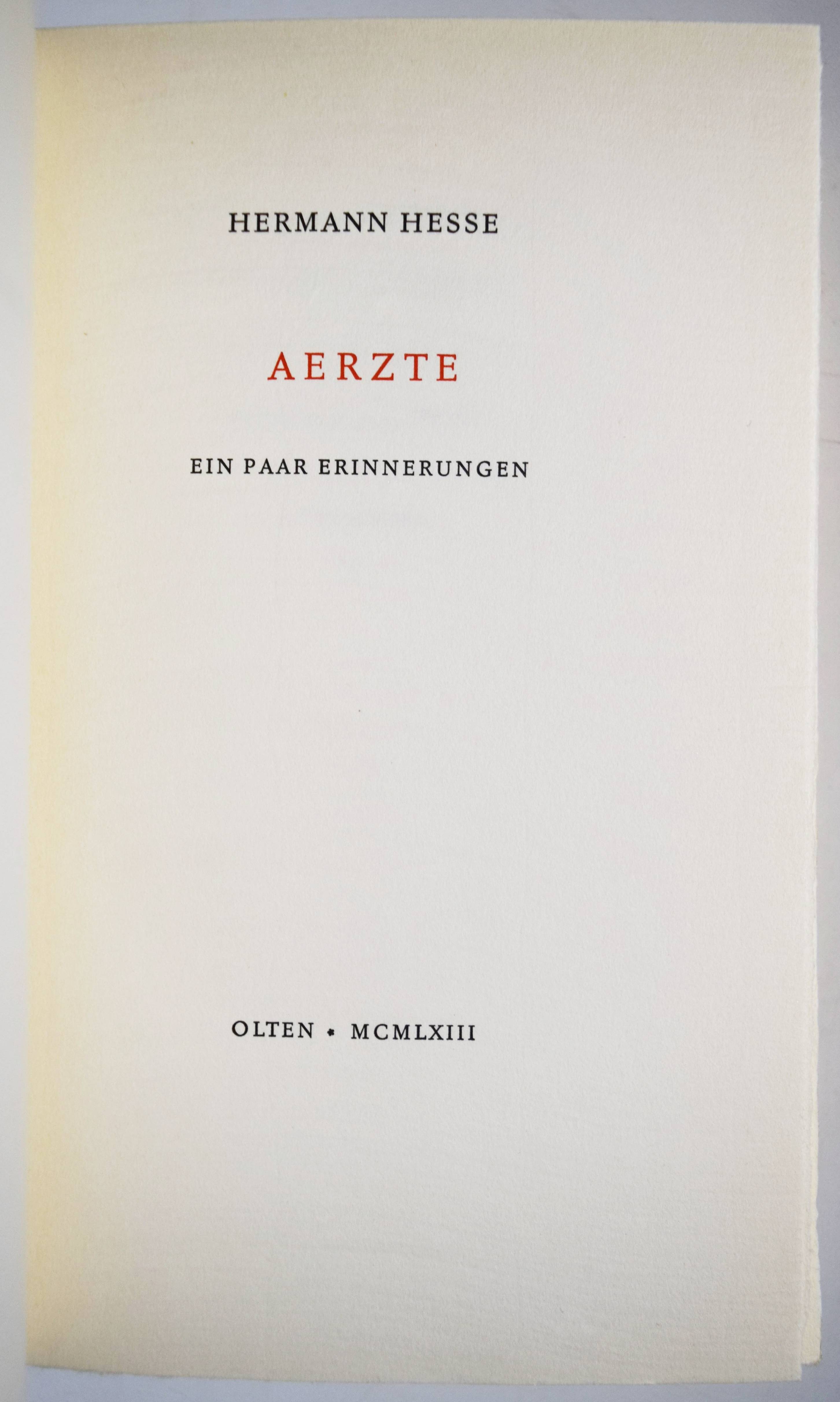 Hesse, Hermann. Ärzte. Ein paar Erinnerungen. Olten, Vereinigung Oltner Bücherfreunde 1963. 8°. 72 S., [2] Bl. Illustr. Orig.-Pappband mit Rückenschild. (Publikation der Vereinigung Oltner Bücherfreunde, Band 99). Mileck II, 139. W.-G.² 538. – Erste Ausgabe. – Eines von 670 num. Exemplaren (Gesamtauflage 900 Exemplare). – „Die Überzugspapiere für die… Pappbände sind Batik-Modeldrucke von Verena Scherrer und Suzy Tenet, Basel“. – Sehr gutes Exemplar.