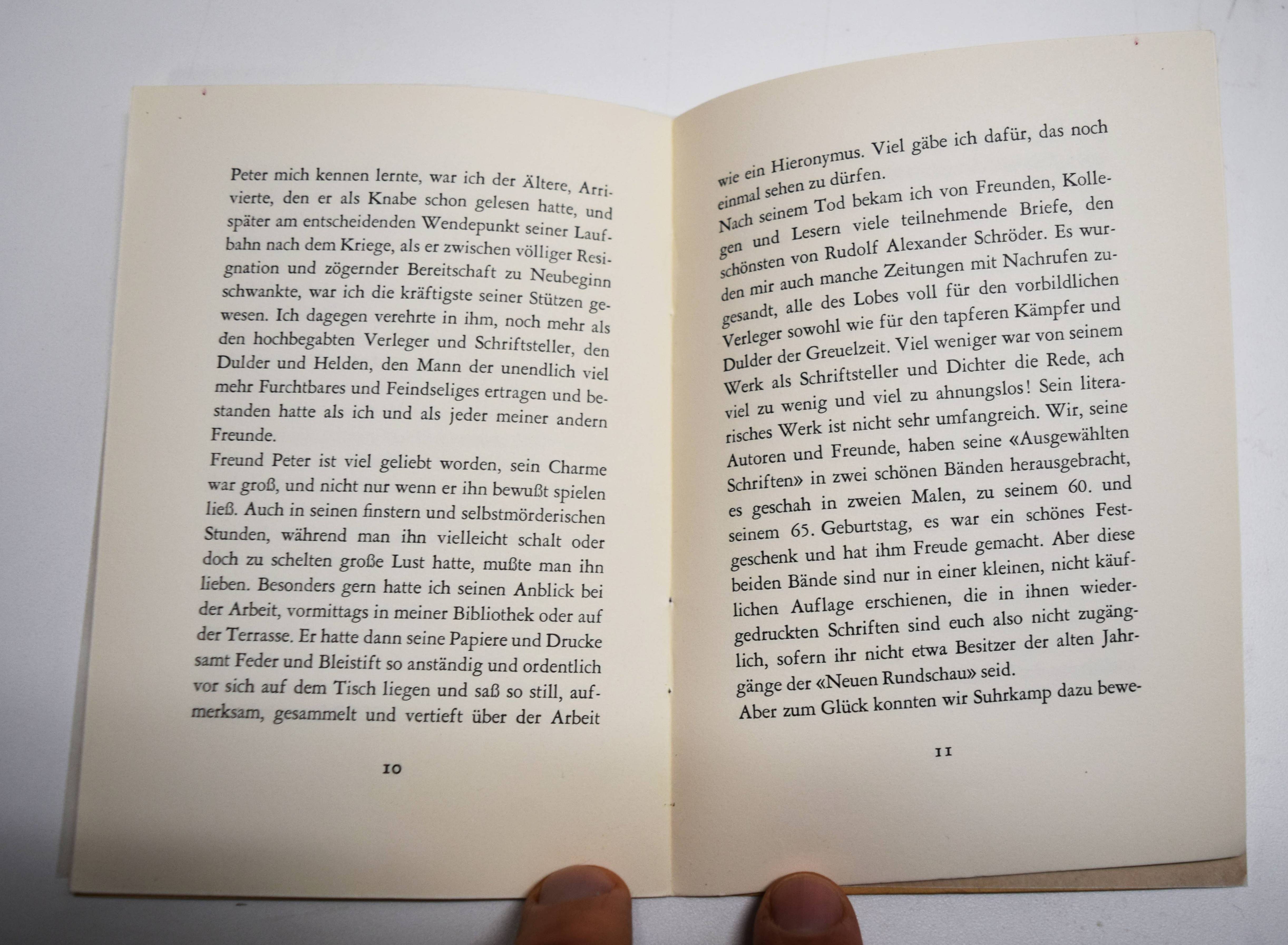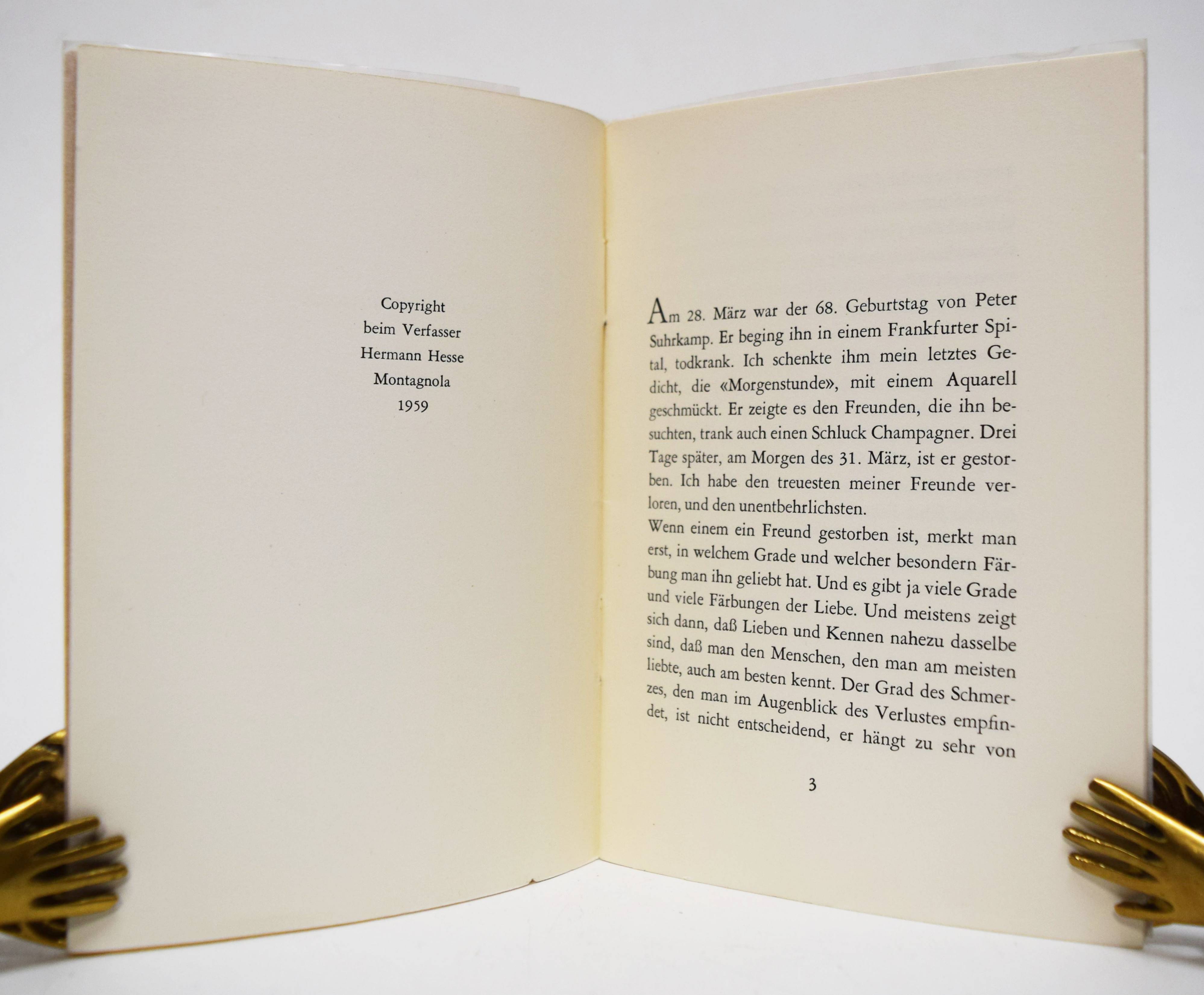 Hesse, Hermann. Freund Peter. Bericht an die Freunde. Privatdruck. Montagnola, Selbstverlag 1959. Kl.-8° (14,8 x 10,5 cm.). 14, (1) S. Orig.-Büttenpapierumschlag. Mileck III, 277. WW.-G.² 498. – Erste Ausgabe. – Hesses berühmte Denkschrift für seinen Freund und Verleger Peter Suhrkamp (1891-1959). – Sehr gutes Exemplar.