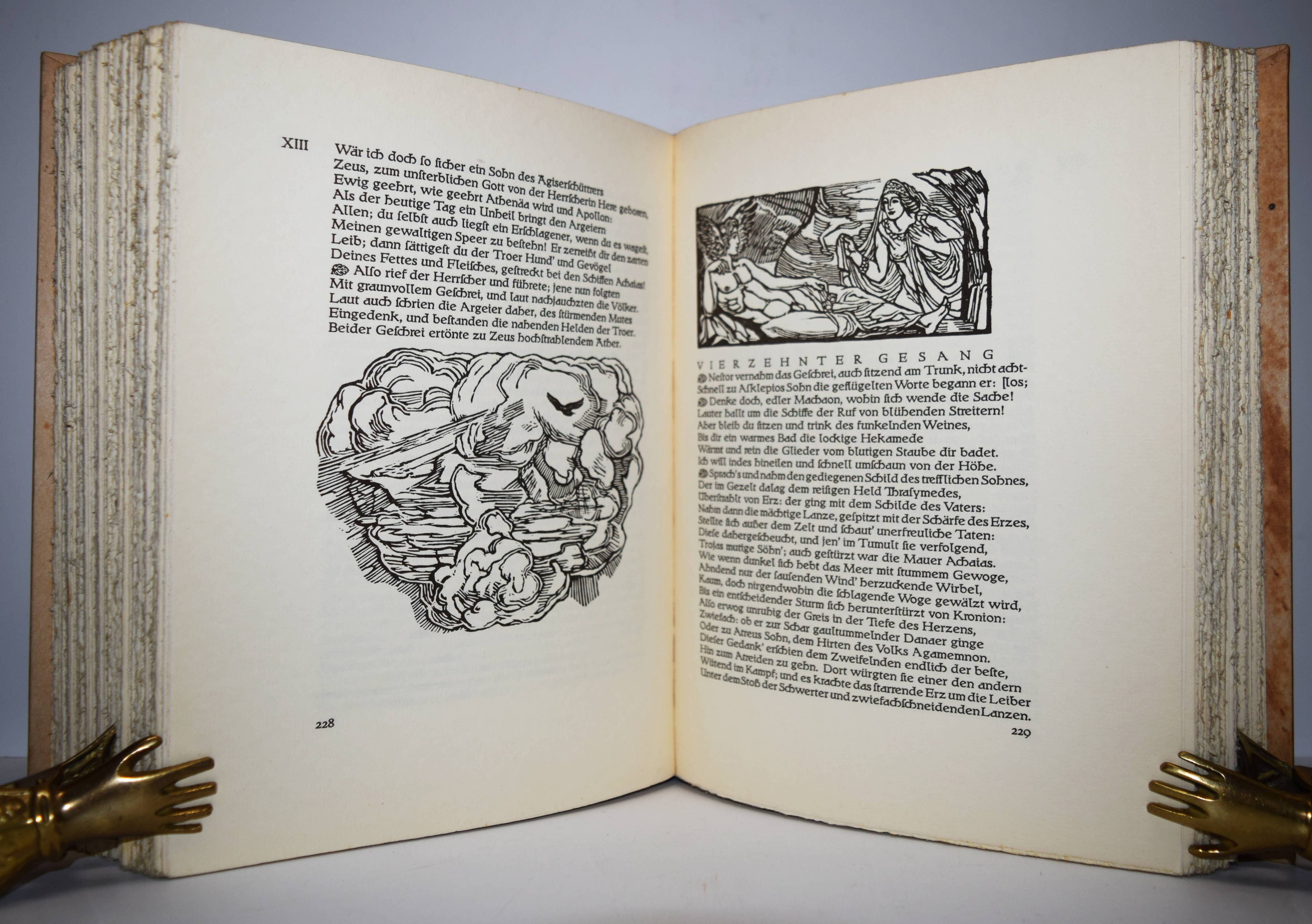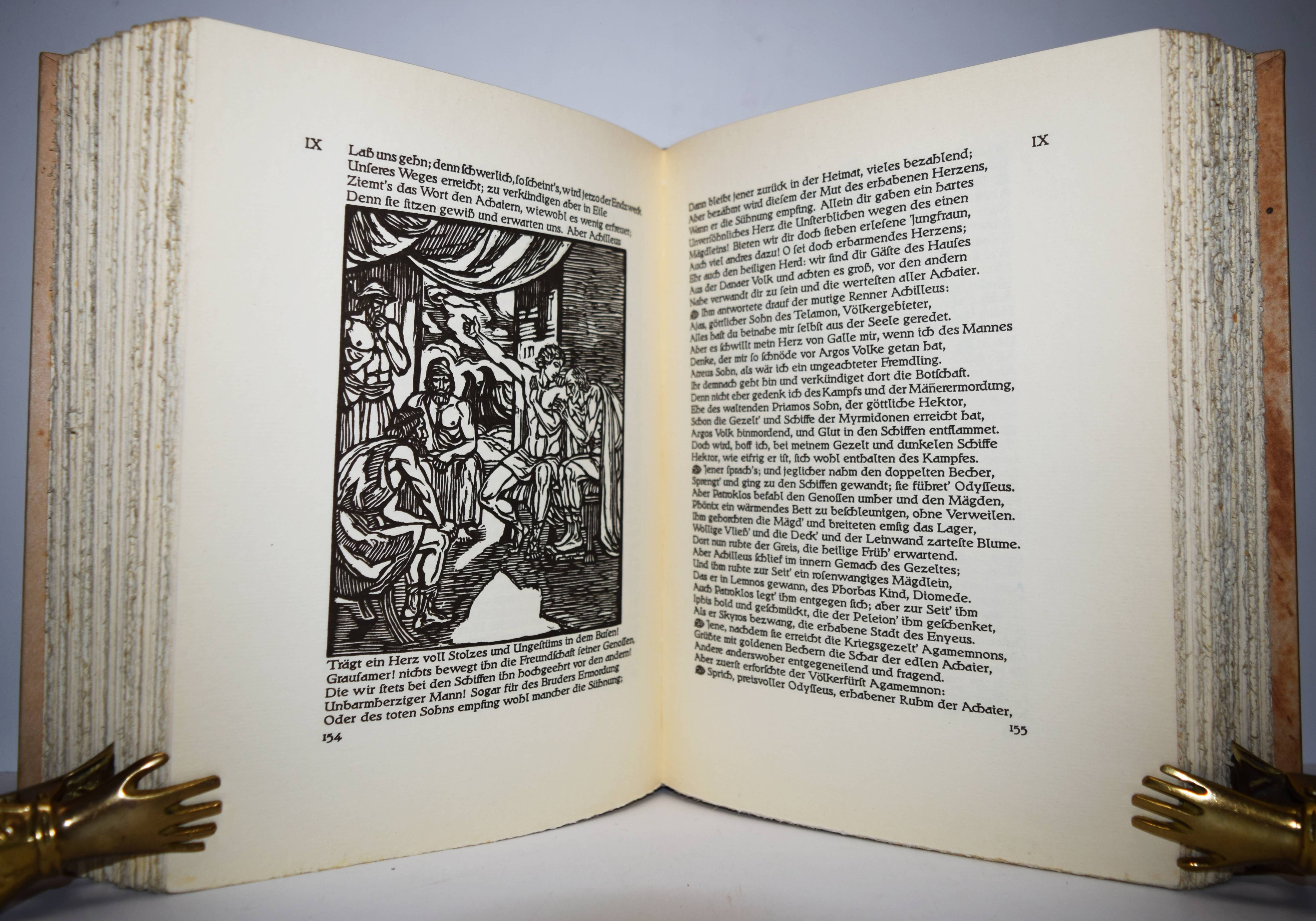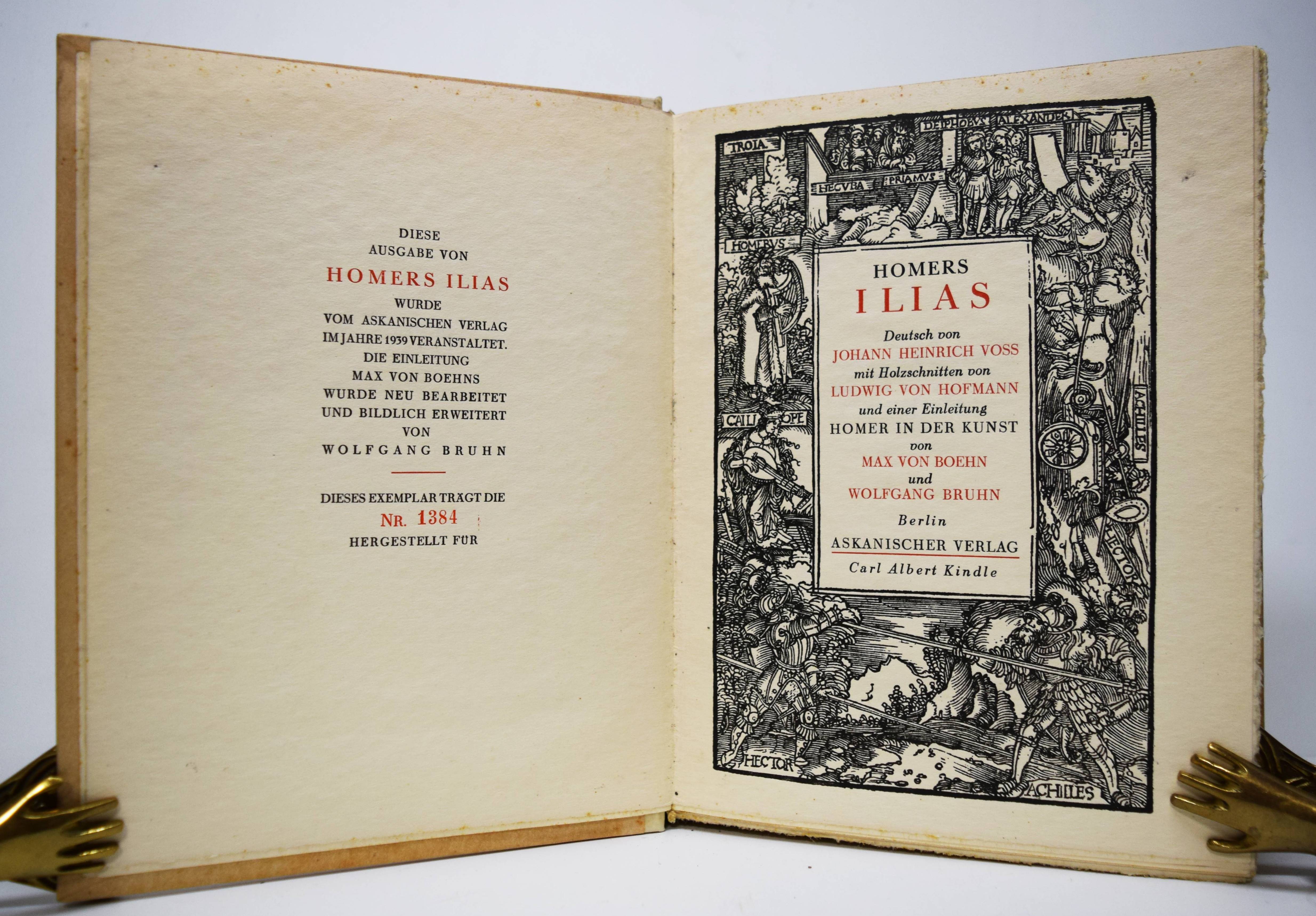 Homer. Ilias. Deutsch von Johann Heinrich Voß mit Hozschnitten von Ludwig von Hofmann und einer Einleitung „Homer in der Kunst“ von Max v. Boehn und Wolfgang Bruhn. Berlin, Askanischer Verlag Carl Albert Kindle (1939). 4°. 420 S., 4 Bl. mit zahlr. teils ganzs. und mont. Illustrationen und Textholzschnitten. Illustr. blindgepr. Orig.-Halbpergamenteinband. Sehr gutes sauberes Exemplar.